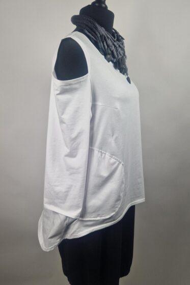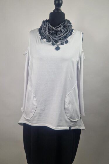 Bluzka , a może kardinanek…kolejny coś, który zakrywa łapki, nie dogrzewając za bardzo, bo to bluzka na lato uszyta z cienkiej, białej bawełny … lekko rozszerzana do dołu, krótsza z przodu, zdecydowanie dłuższa z tyłu , z rękawem 3/4, z dwoma kieszonkami, wiązana z przodu, ręcznie malowana farbami, które się nie spierają, każda bluzka ma inny niepowtarzalny rysunek – taką bluzkę będziesz mieć tylko TY !