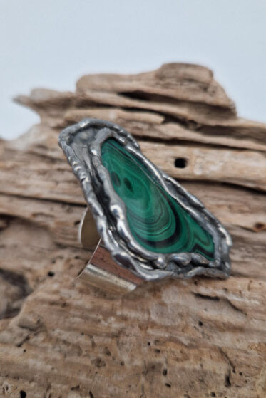 Niezwykle piękny, duży pierścionek, którego oczkiem jest naturalny AMONIT a dookoła po prostu ręcznie robiona metaloplastyka. Pierścionek ma regulowaną obrączkę, więc pasuje na każdy palec…ale możesz powiesić go na łańcuszku lub rzemieniu, jeśli nie lubisz pierścionków, a podoba Ci się forma i kamień…