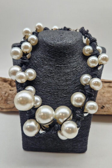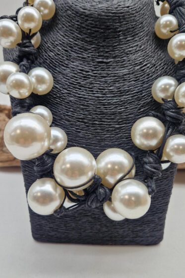 Naszyjnik wykonany z bawełnianych, ręcznie farbowanych sznurków , w odcieniach mgły nad Wenecją. W odcieniach szarości ,czerni, zachmurzonego nieba, z odcieniem różowym …, do których zostały przymocowane zabarwione na grafitowo okrągłe, różnej wielkości śliczne kulki. Naszyjnik jest lekki i świetnie pasuje do czarnych kiecek..