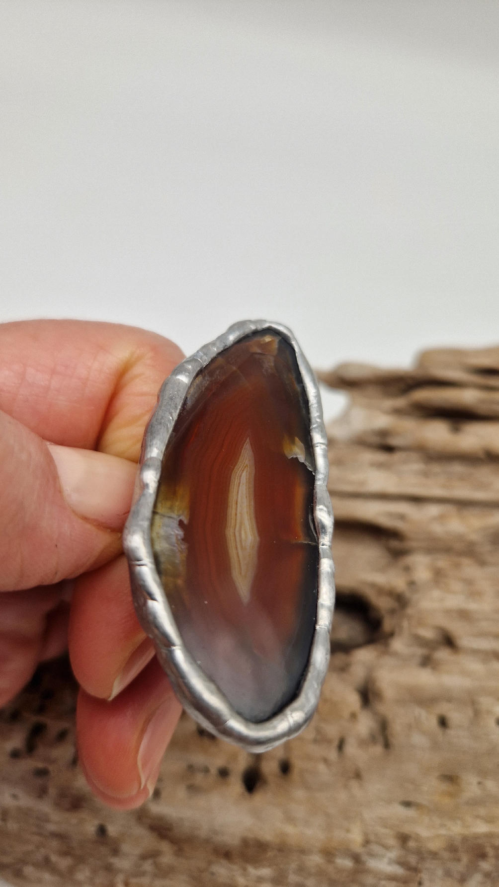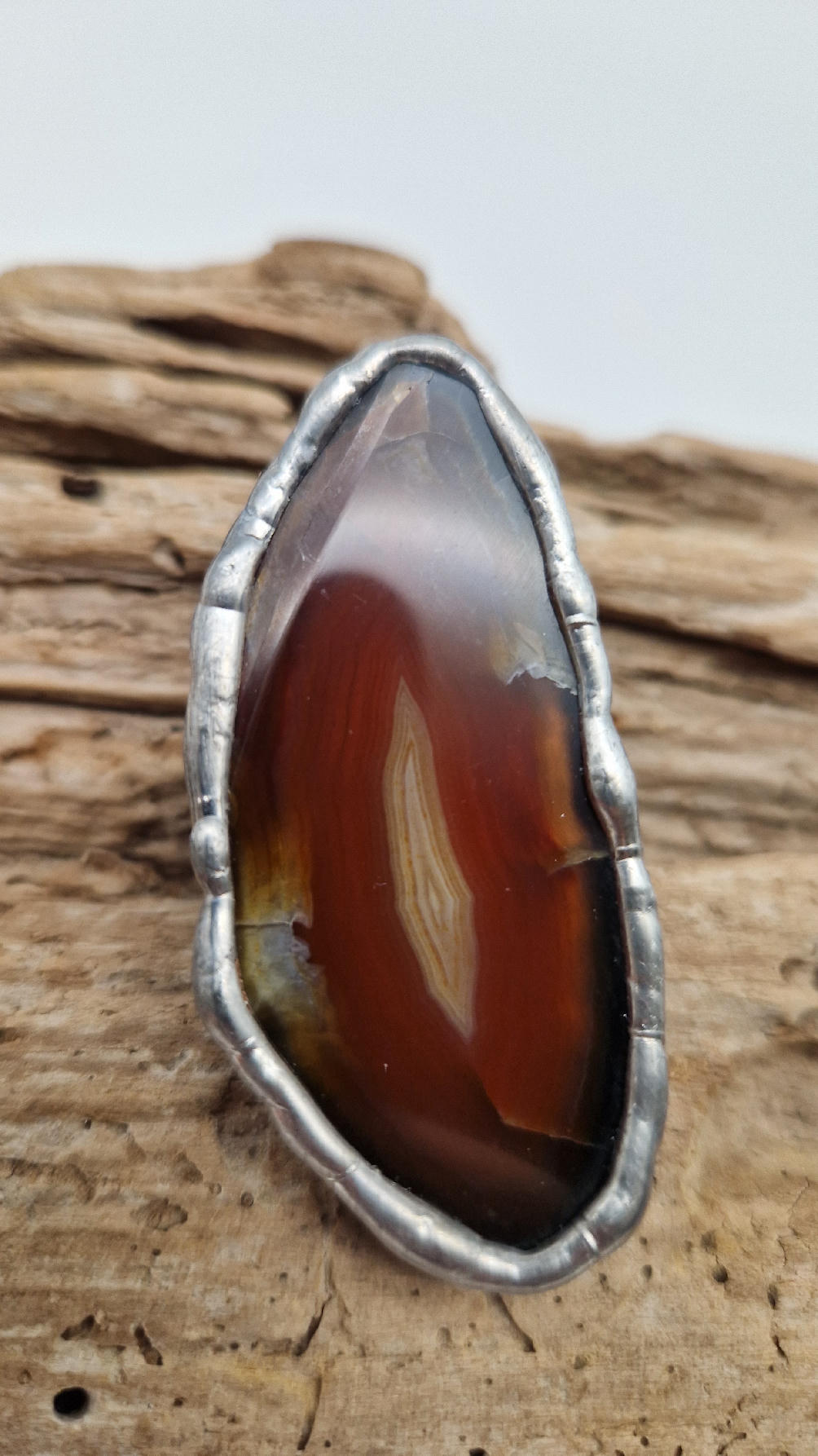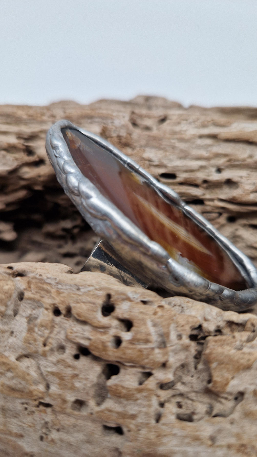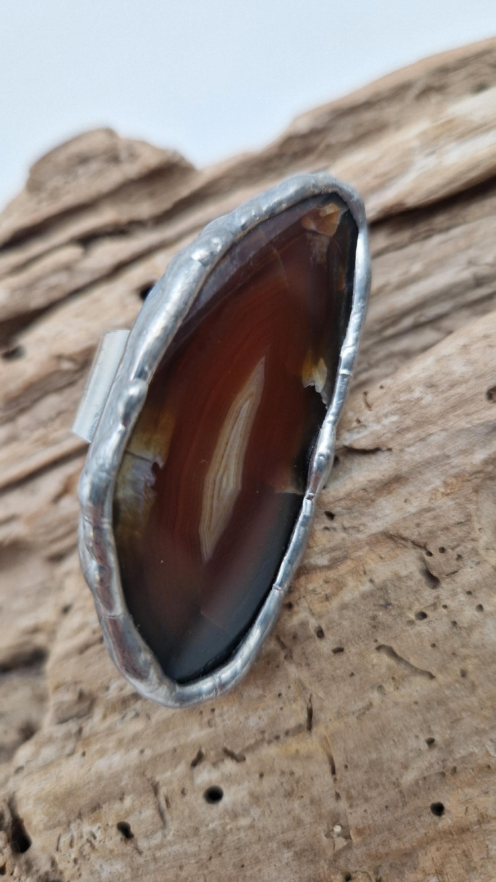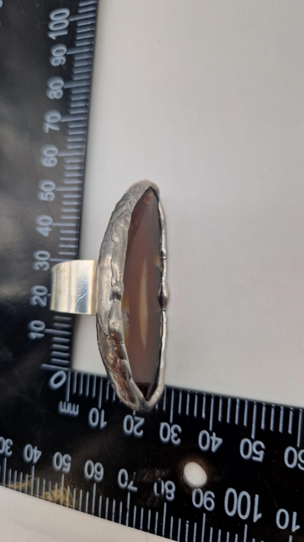 Duży ,podłużny pierścionek, z agatowym oczkiem w kolorze ciemnego miodu z czekoladą….piękny agat z urozmaiconym przekrojem, oprawiony w kutą i patynowaną miedź. Piękna metaloplastyka z pięknym kamieniem . Pierścionek ma regulowaną obrączkę, więc pasuje na każdy palec…ale możesz powiesić go na łańcuszku lub rzemieniu, jeśli nie lubisz pierścionków, a podoba Ci się forma i kamień…