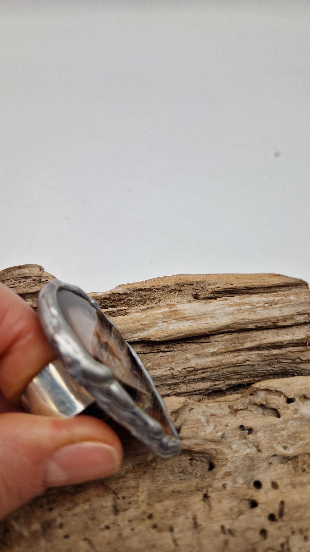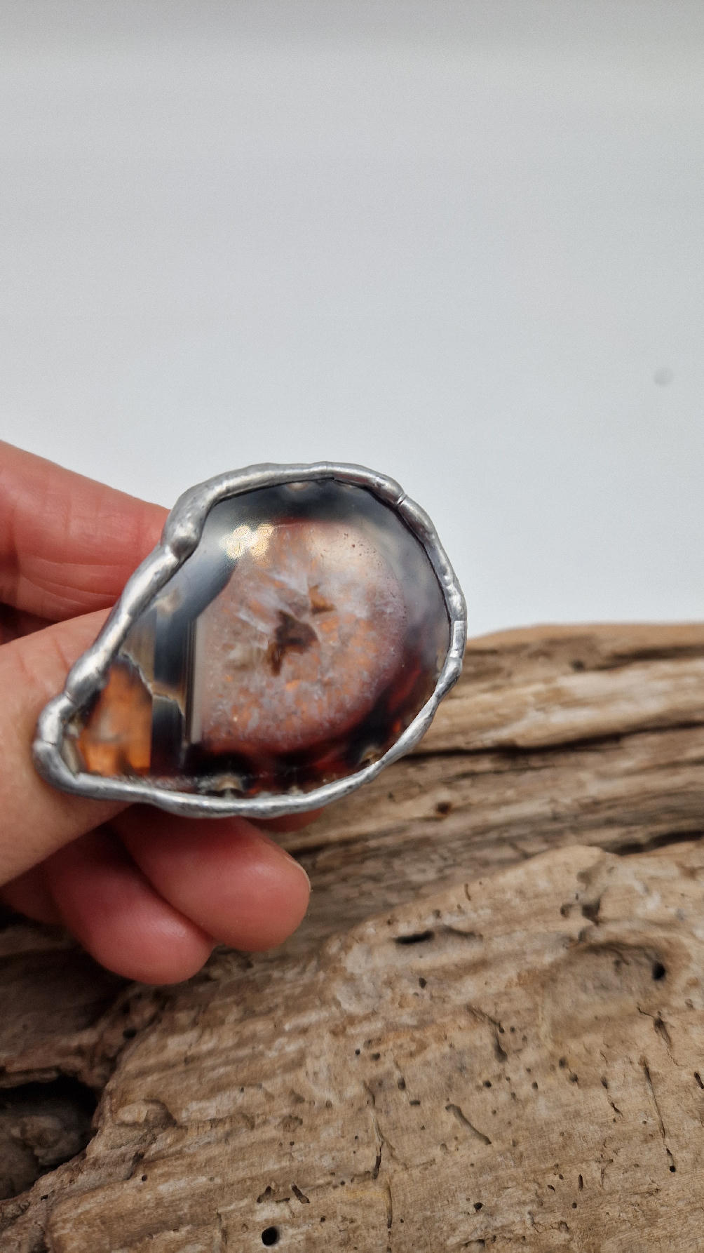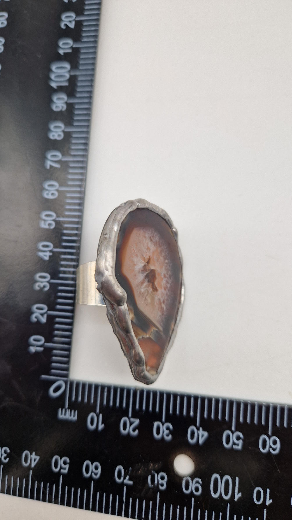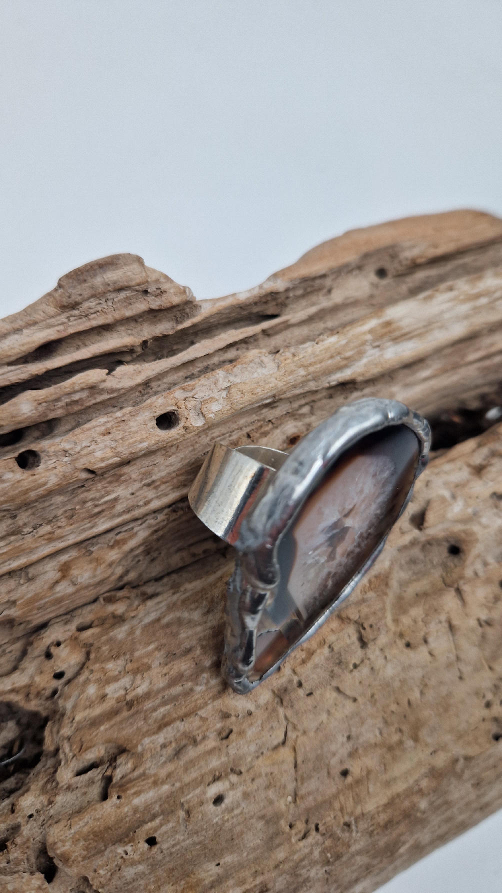Niezwykle piękny, duży pierścionek, którego oczkiem jest piękny agat w bursztynowym kolorze z jasnym środkiem, jakby wyspą na jeziorze, agat oprawiony w kutą i patynowaną miedź. Piękna metaloplastyka z pięknym kamieniem . Pierścionek ma regulowaną obrączkę, więc pasuje na każdy palec…ale możesz powiesić go na łańcuszku lub rzemieniu, jeśli nie lubisz pierścionków, a podoba Ci się forma i kamień…
