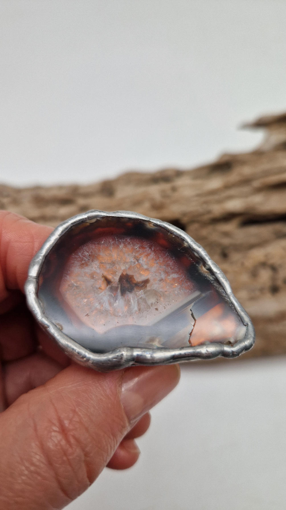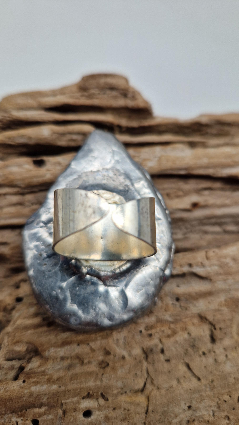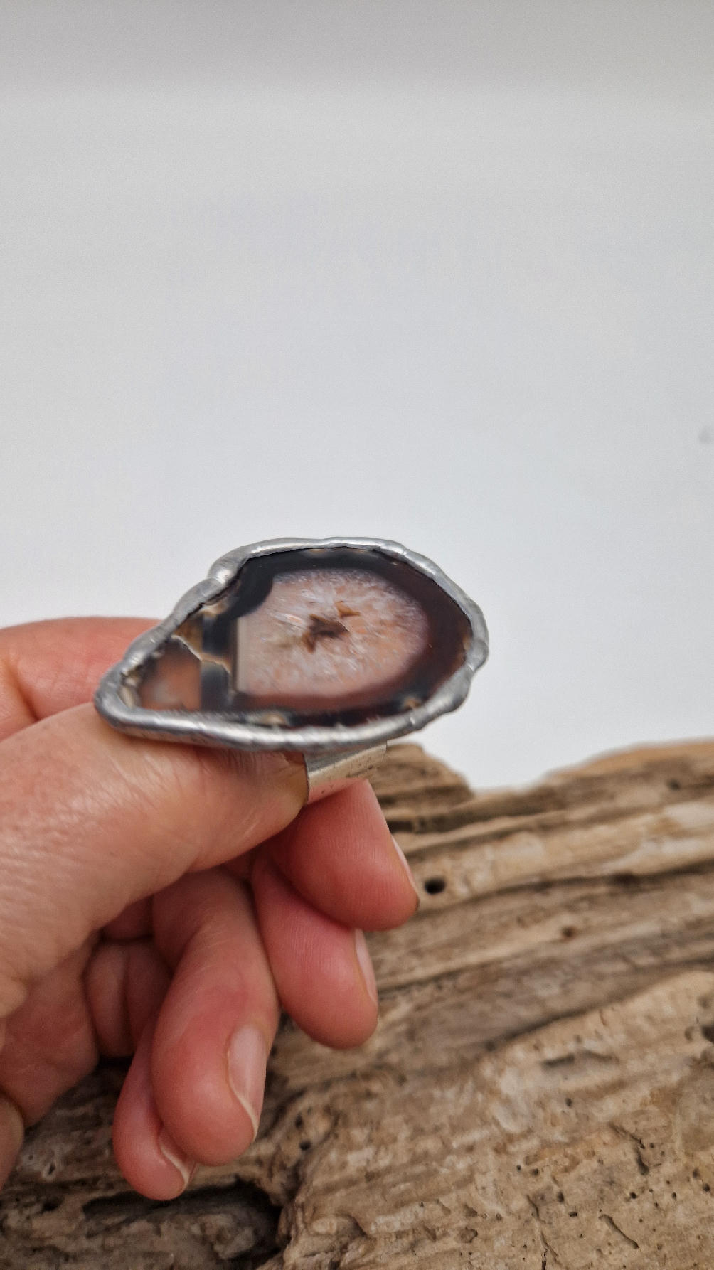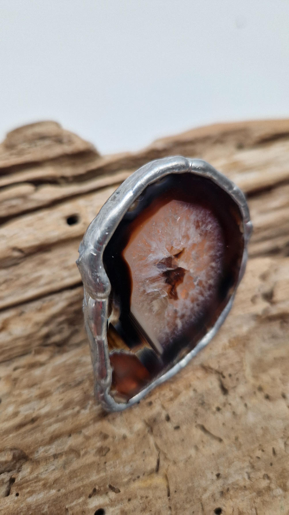 Niezwykle piękny, duży pierścionek, którego oczkiem jest piękny agat w bursztynowym kolorze z jasnym środkiem, jakby wyspą na jeziorze, agat oprawiony w kutą i patynowaną miedź. Piękna metaloplastyka z pięknym kamieniem . Pierścionek ma regulowaną obrączkę, więc pasuje na każdy palec…ale możesz powiesić go na łańcuszku lub rzemieniu, jeśli nie lubisz pierścionków, a podoba Ci się forma i kamień…