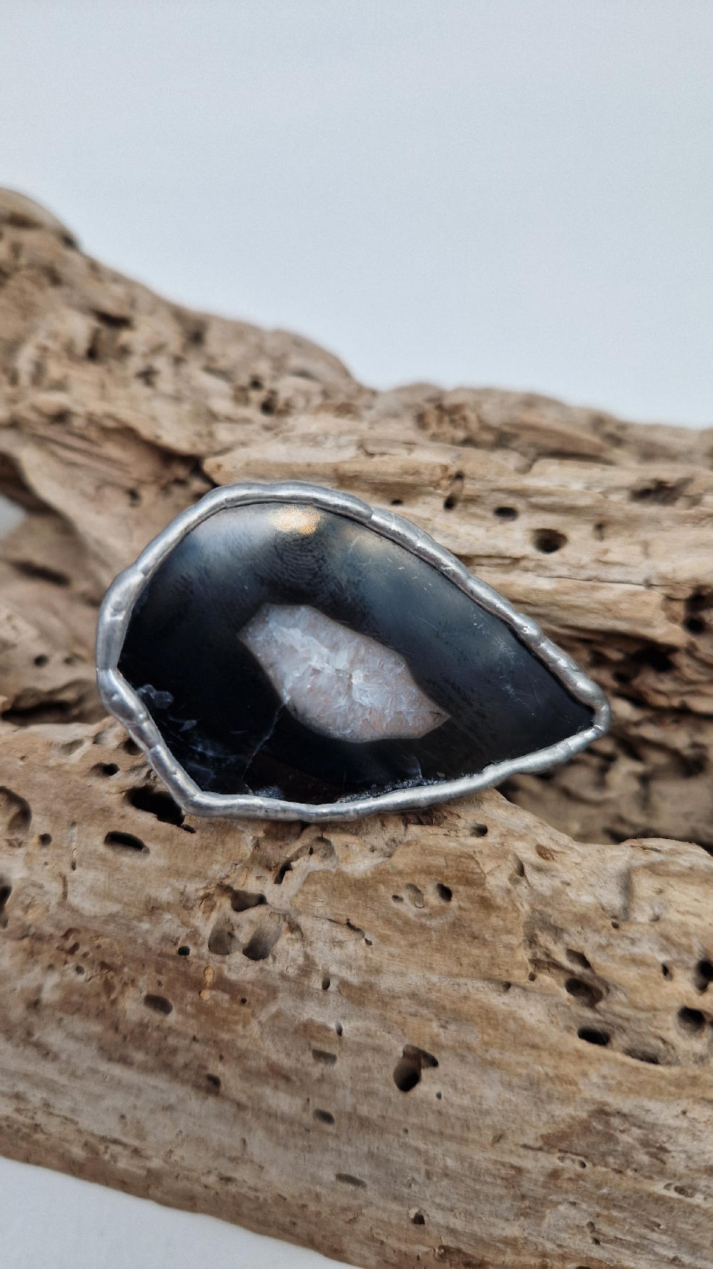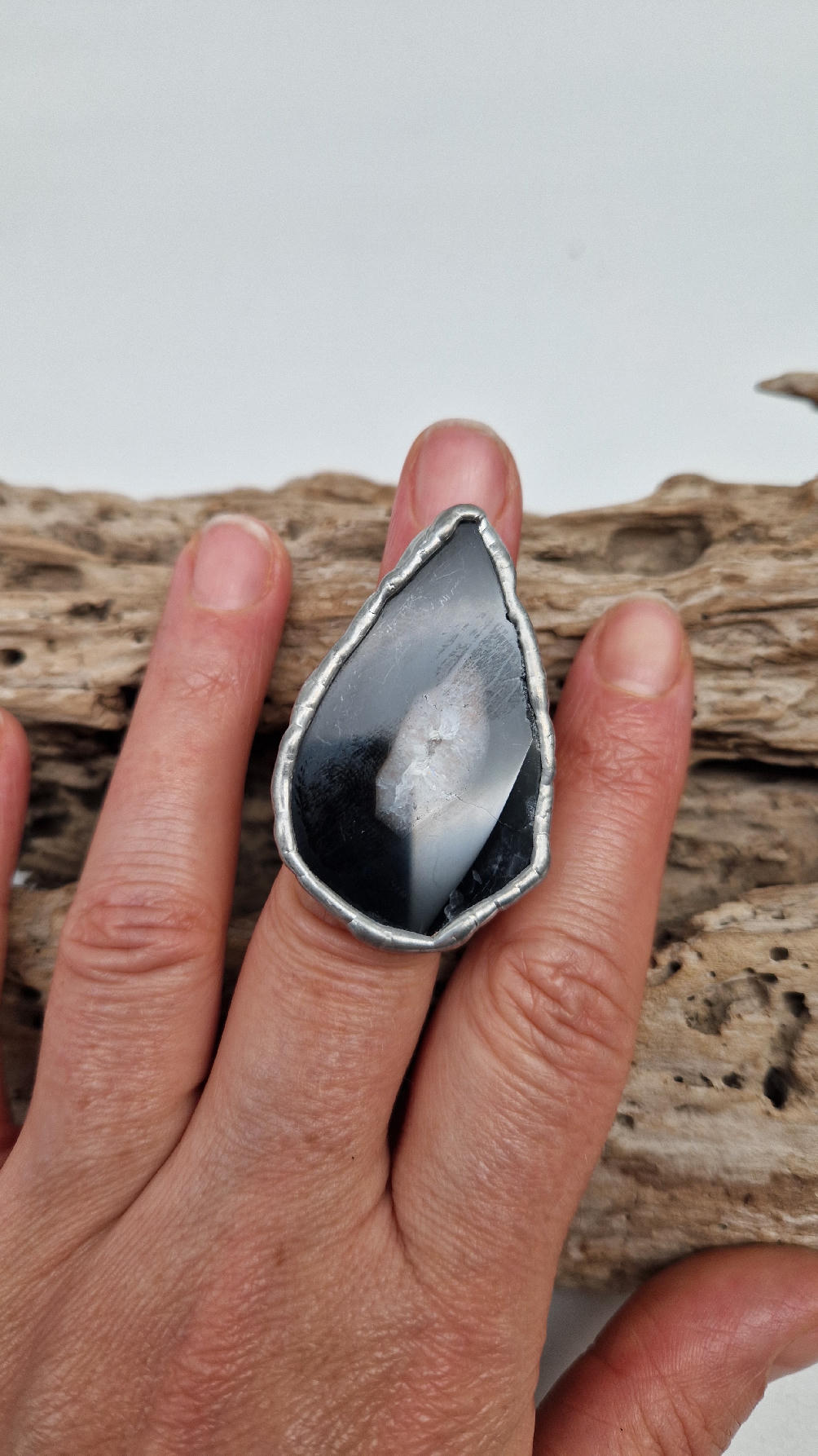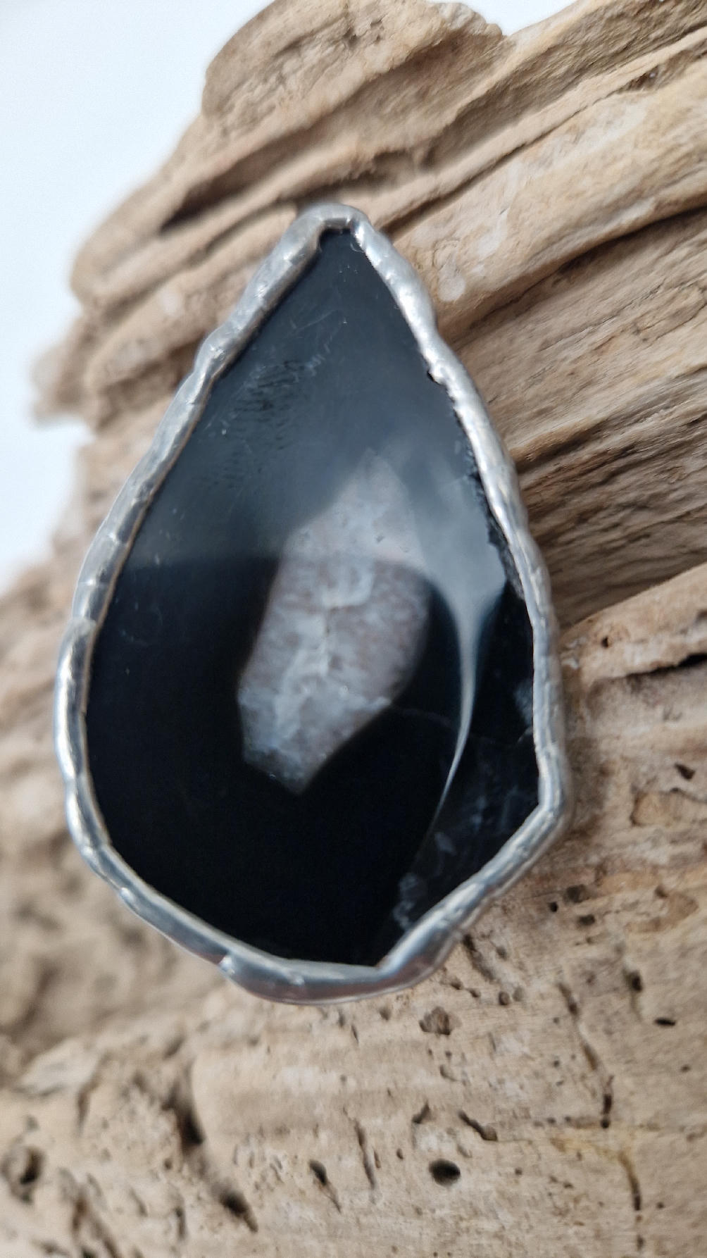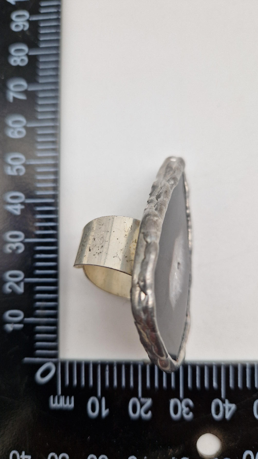 Niezwykle piękny, duży i długi pierścionek, którego oczkiem jest piękny czarny agat z białym ,,oczkiem” w środku, oprawiony w kutą i patynowaną miedź. Piękna metaloplastyka z pięknym kamieniem . Pierścionek ma regulowaną obrączkę, więc pasuje na każdy palec…ale możesz powiesić go na łańcuszku lub rzemieniu, jeśli nie lubisz pierścionków, a podoba Ci się forma i kamień…