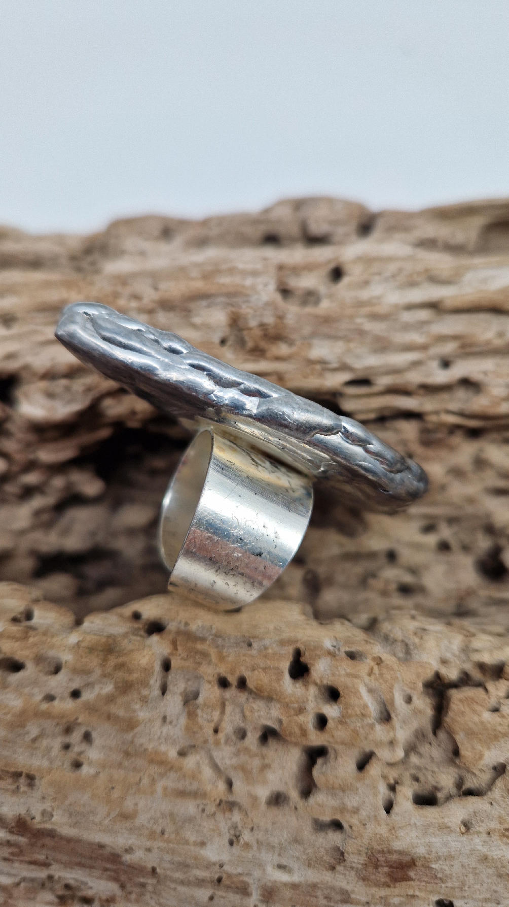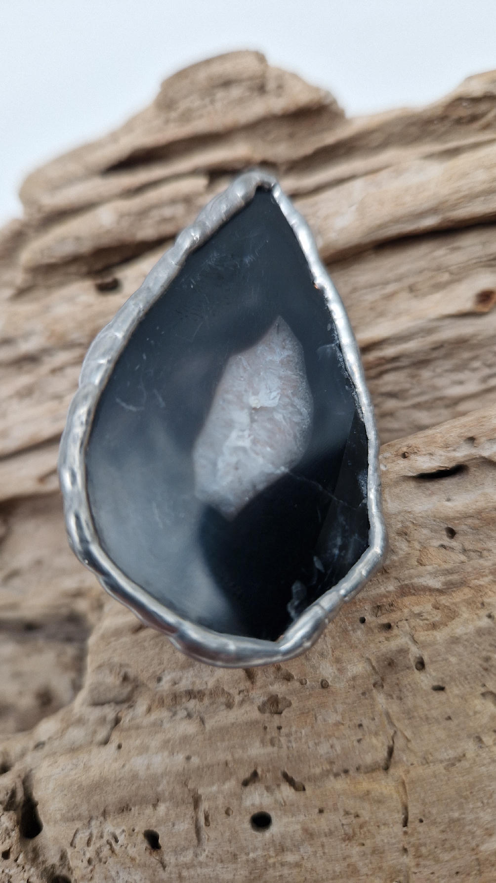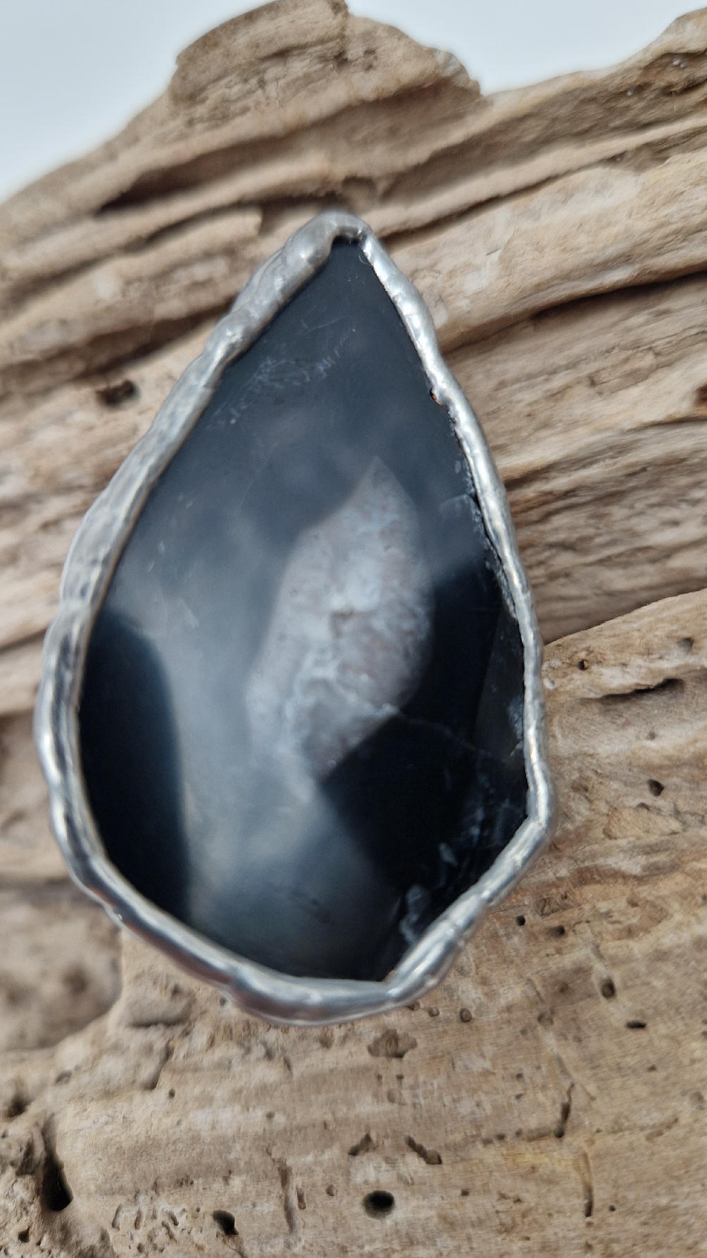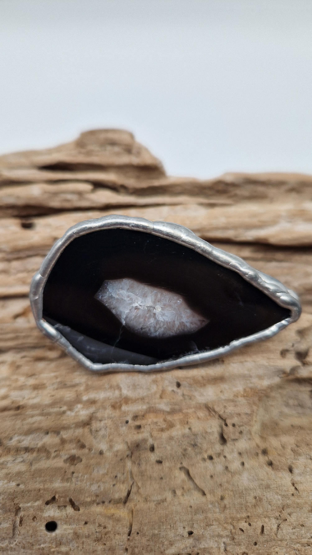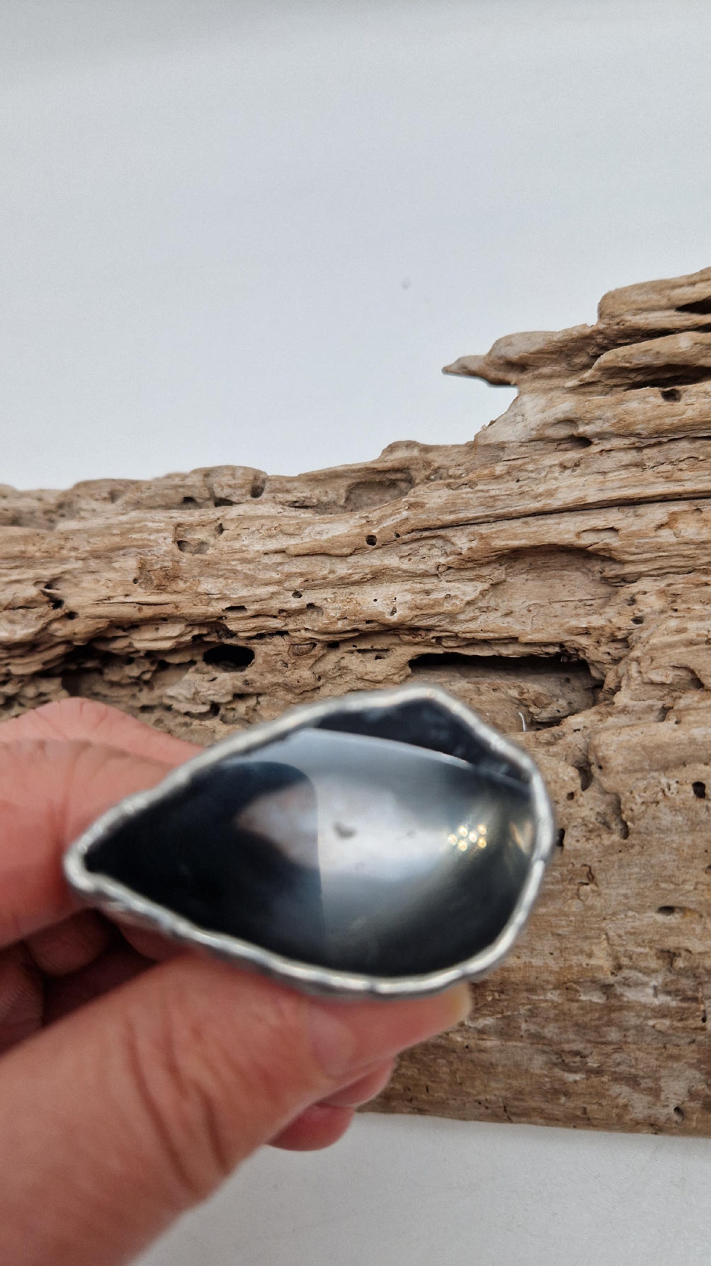 Niezwykle piękny, duży i długi pierścionek, którego oczkiem jest piękny czarny agat z białym ,,oczkiem” w środku, oprawiony w kutą i patynowaną miedź. Piękna metaloplastyka z pięknym kamieniem . Pierścionek ma regulowaną obrączkę, więc pasuje na każdy palec…ale możesz powiesić go na łańcuszku lub rzemieniu, jeśli nie lubisz pierścionków, a podoba Ci się forma i kamień…