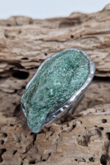 Niezwykle piękny, duży pierścionek, którego oczkiem jest naturalny AMONIT a dookoła po prostu ręcznie robiona metaloplastyka. Pierścionek ma regulowaną obrączkę, więc pasuje na każdy palec…ale możesz powiesić go na łańcuszku lub rzemieniu, jeśli nie lubisz pierścionków, a podoba Ci się forma i kamień…