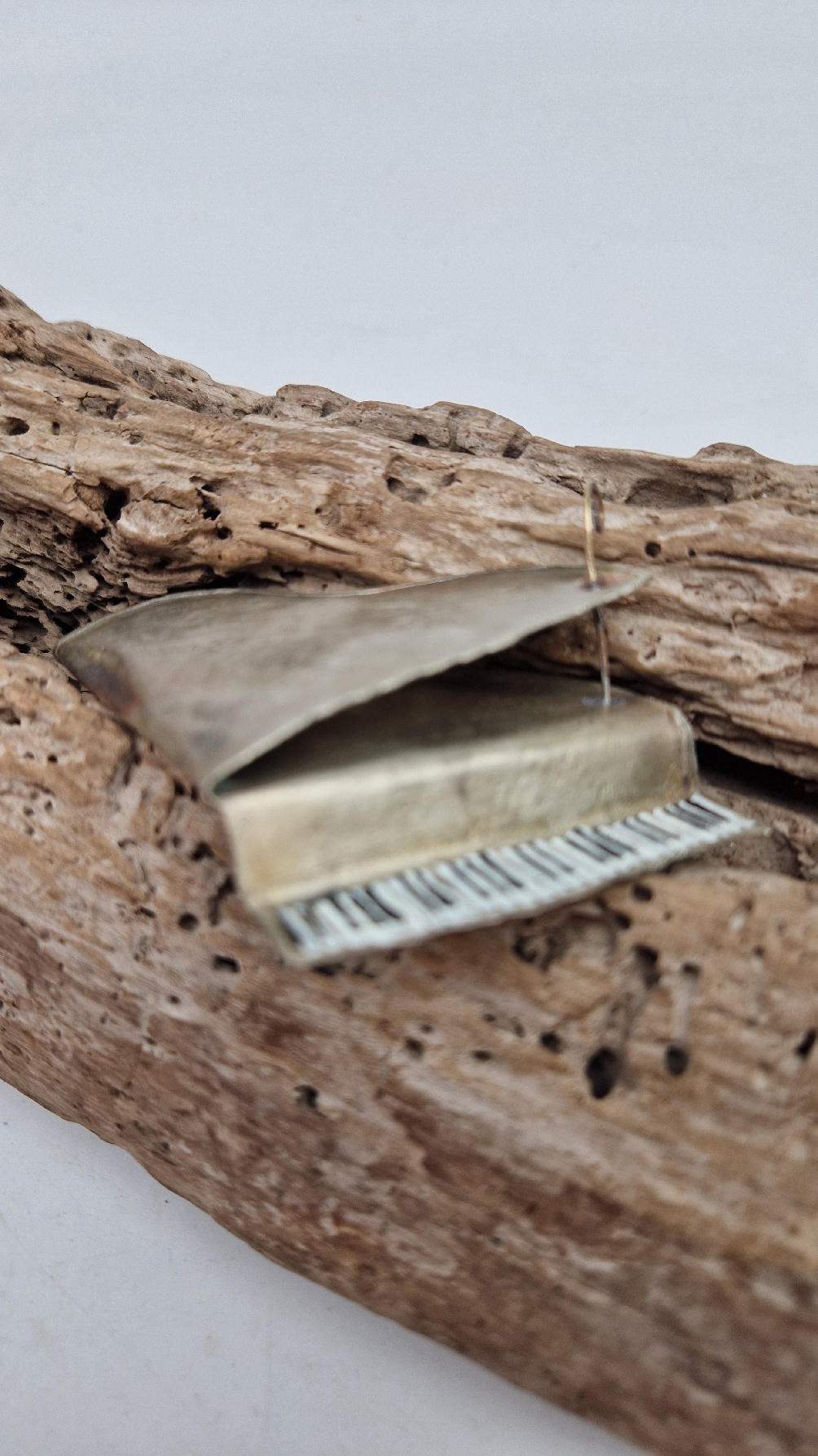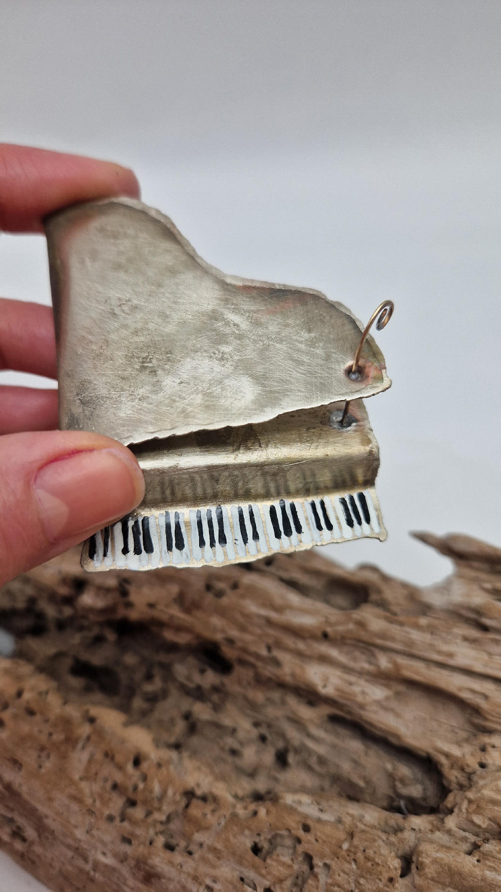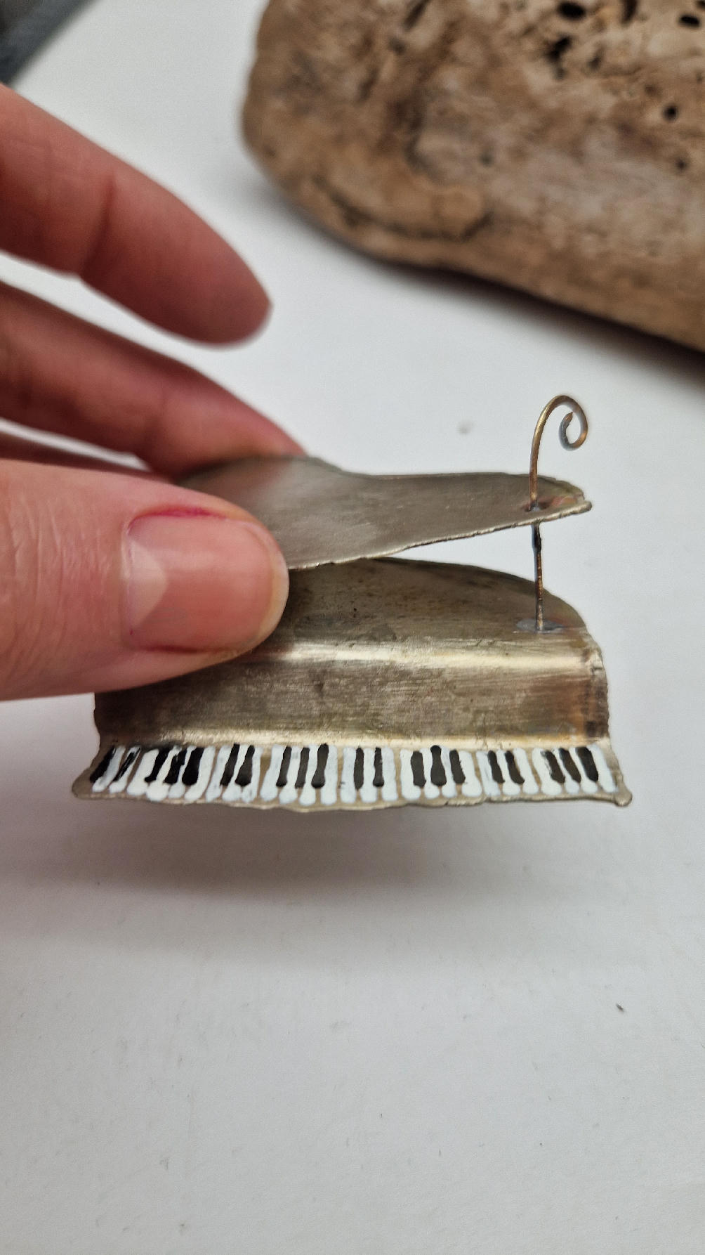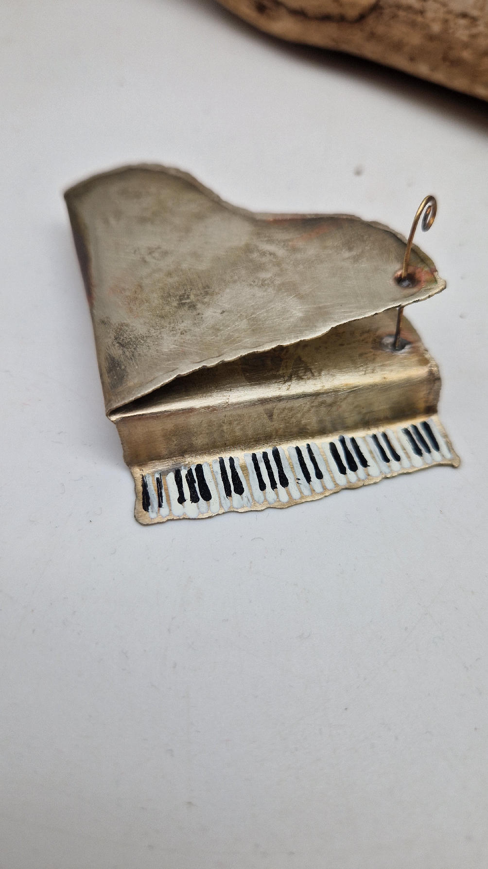 Ręcznie wykonana z alpaki, mosiądzu i subtelnie wzbogacona ociupiną farby, broszka Fortepian jest prawdziwym arcydziełem. Każdy detal, każdy klawisz został starannie odwzorowany, oddając hołd temu klasycznemu instrumentowi.