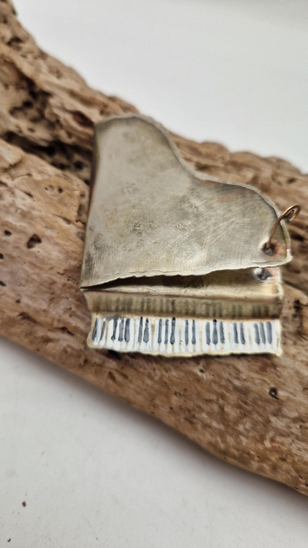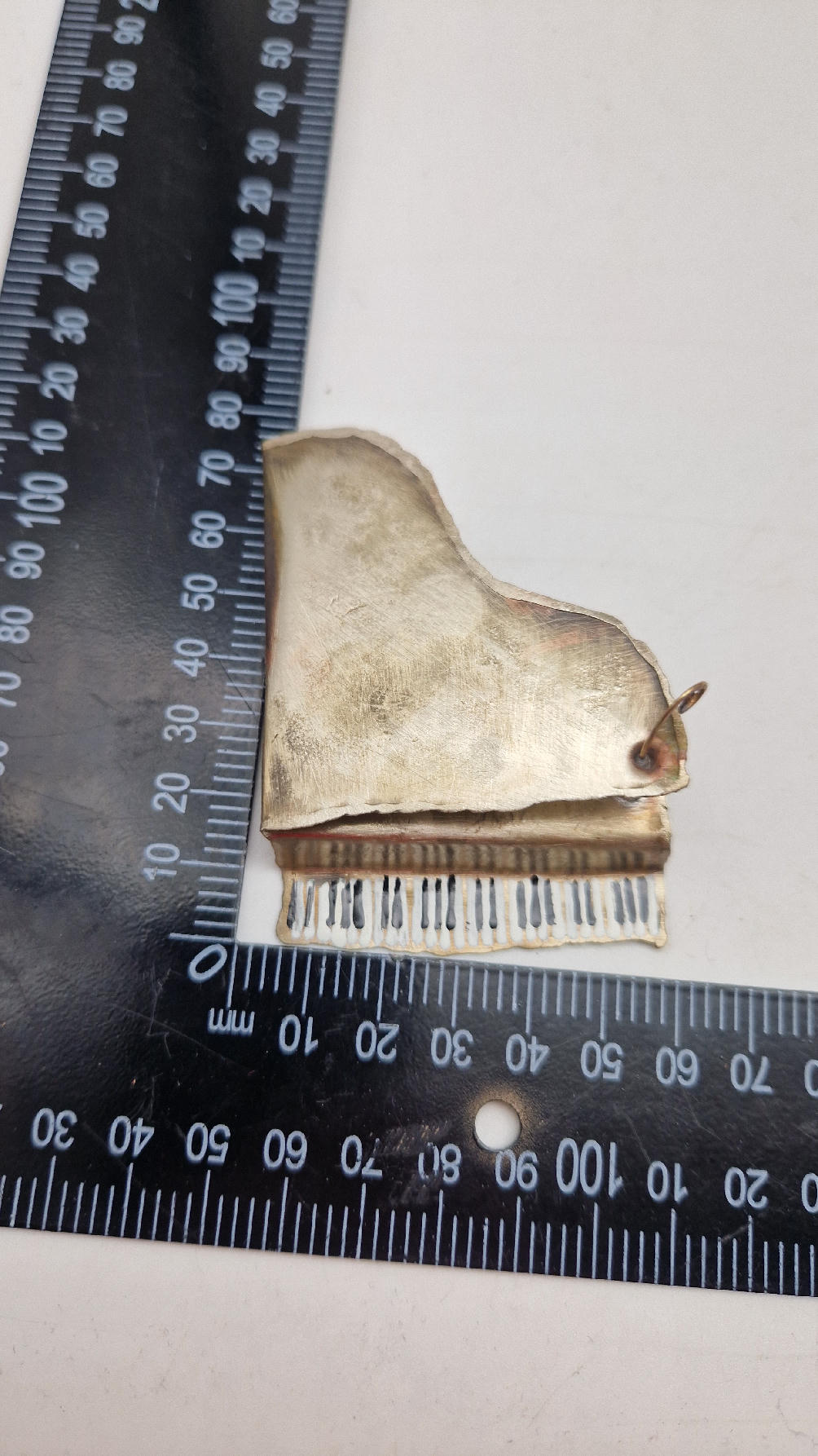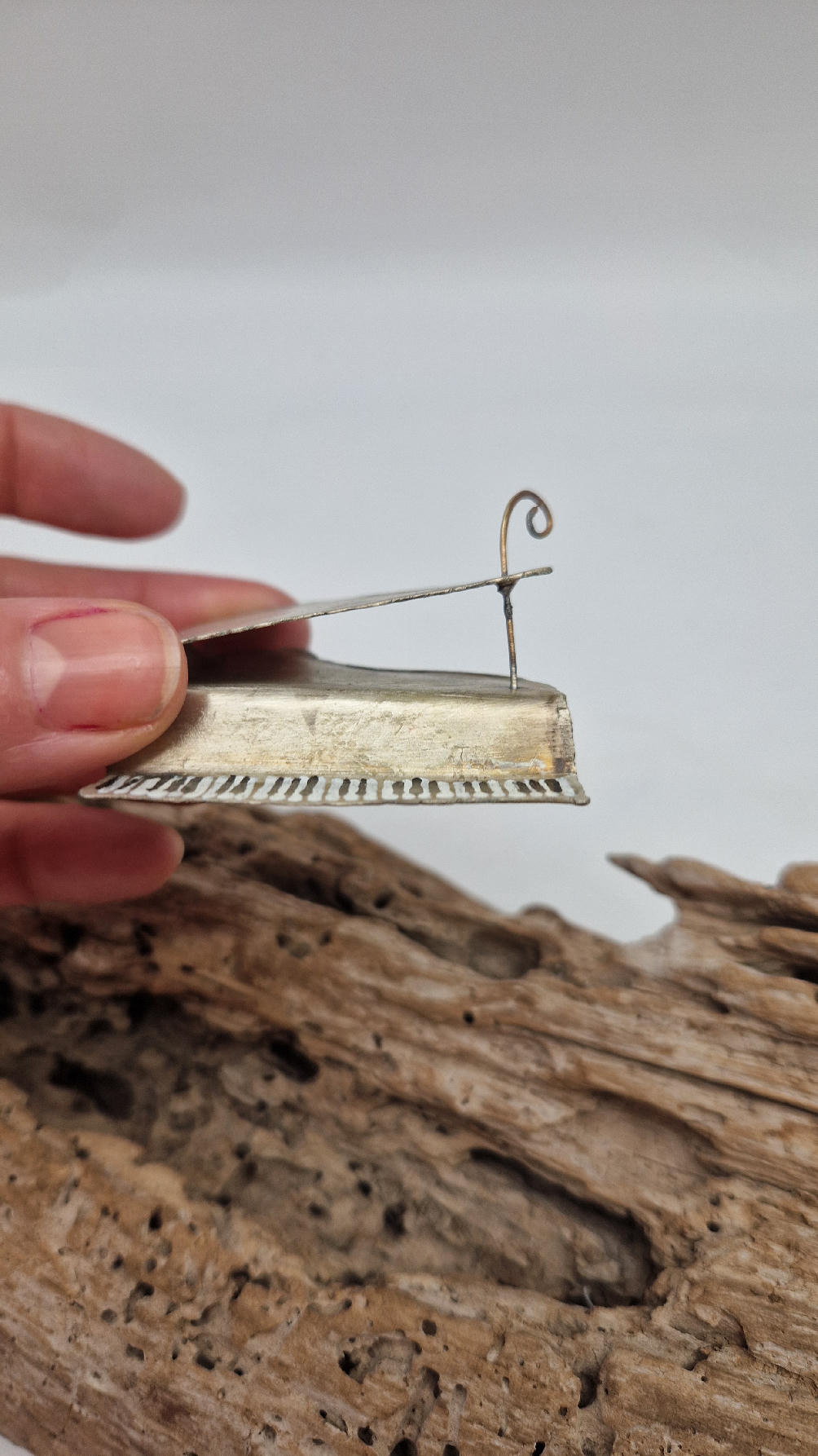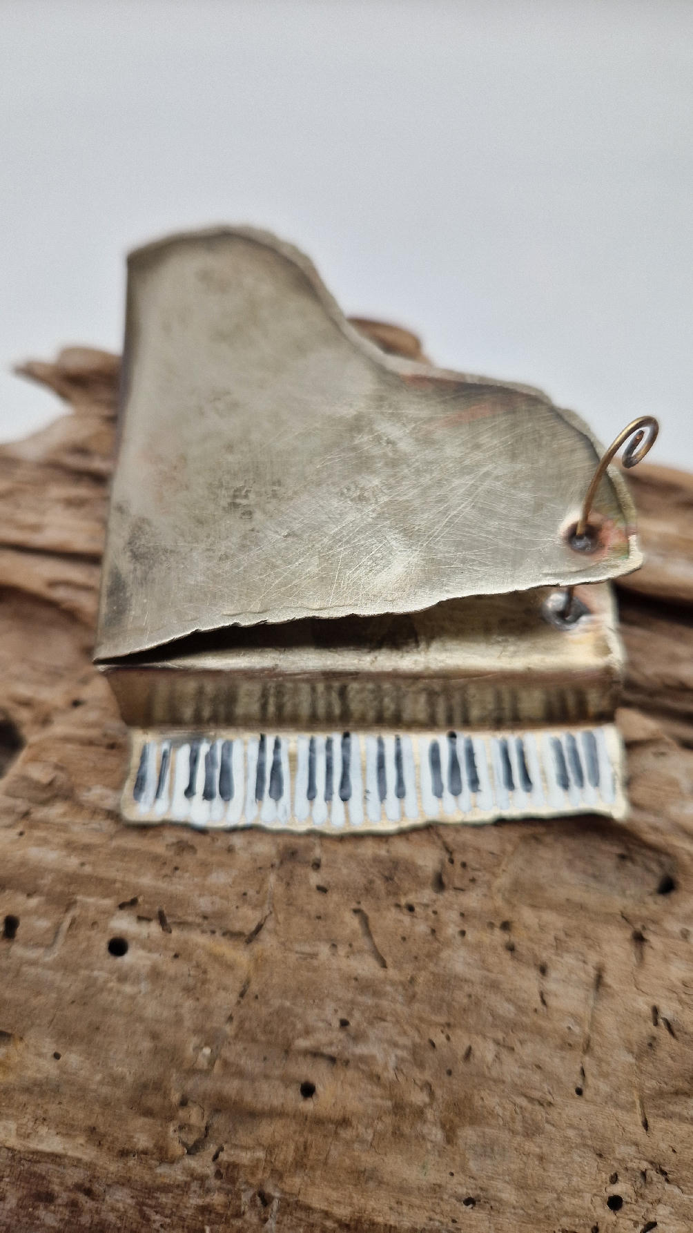 Ręcznie wykonana z alpaki, mosiądzu i subtelnie wzbogacona ociupiną farby, broszka Fortepian jest prawdziwym arcydziełem. Każdy detal, każdy klawisz został starannie odwzorowany, oddając hołd temu klasycznemu instrumentowi.