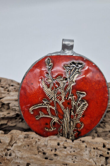 Biżuteria autorska – Wisior powstał na bazie muszli oprawionej w patynowaną i posrebrzaną alpakę.