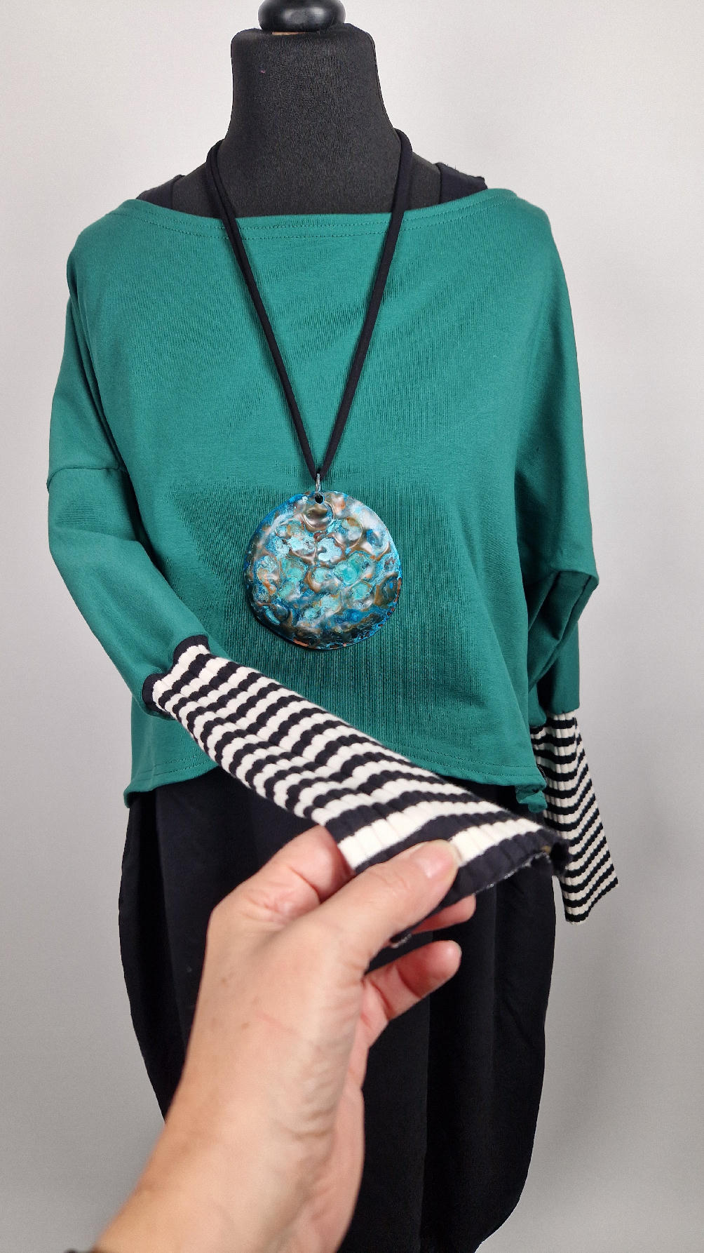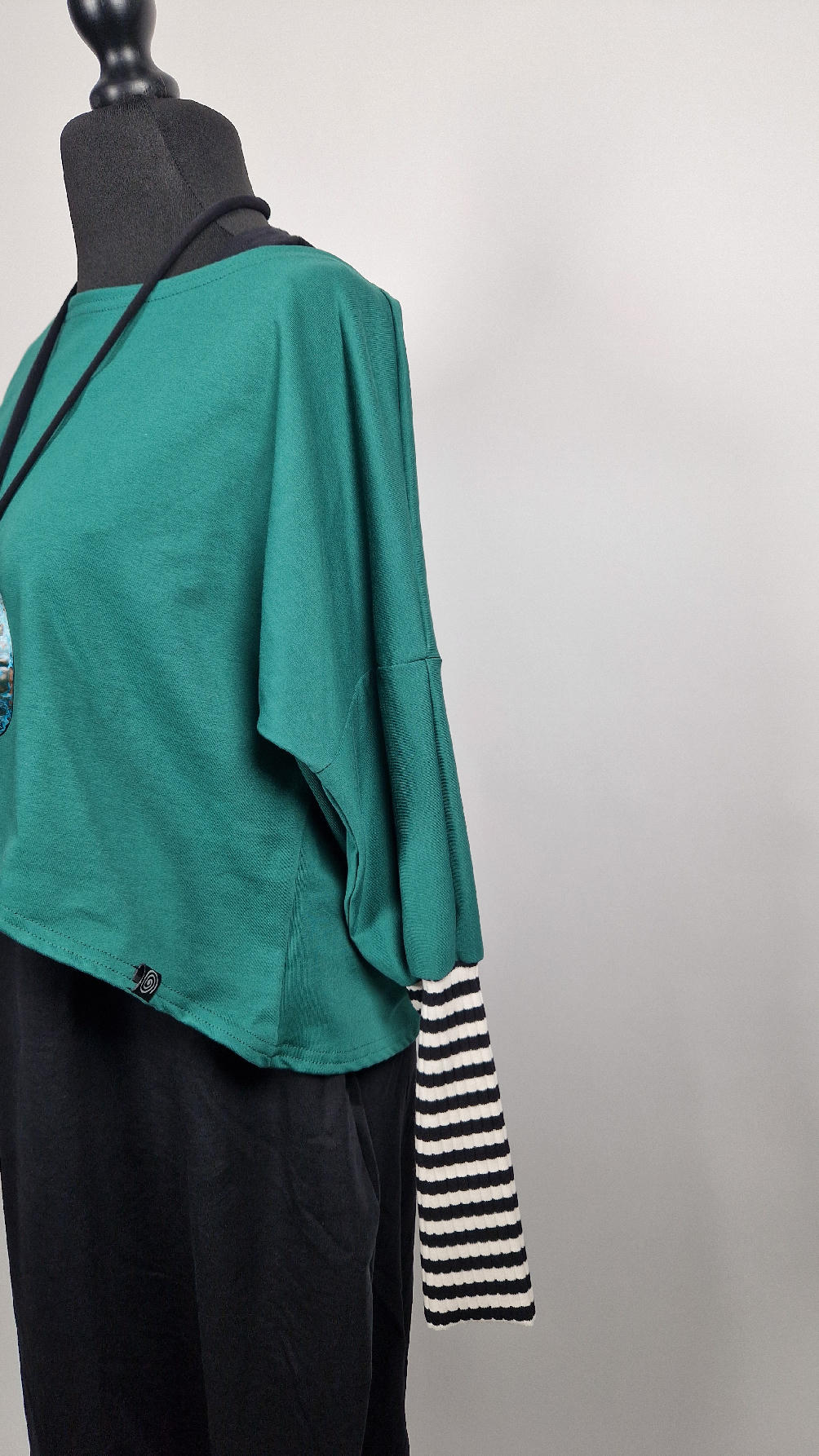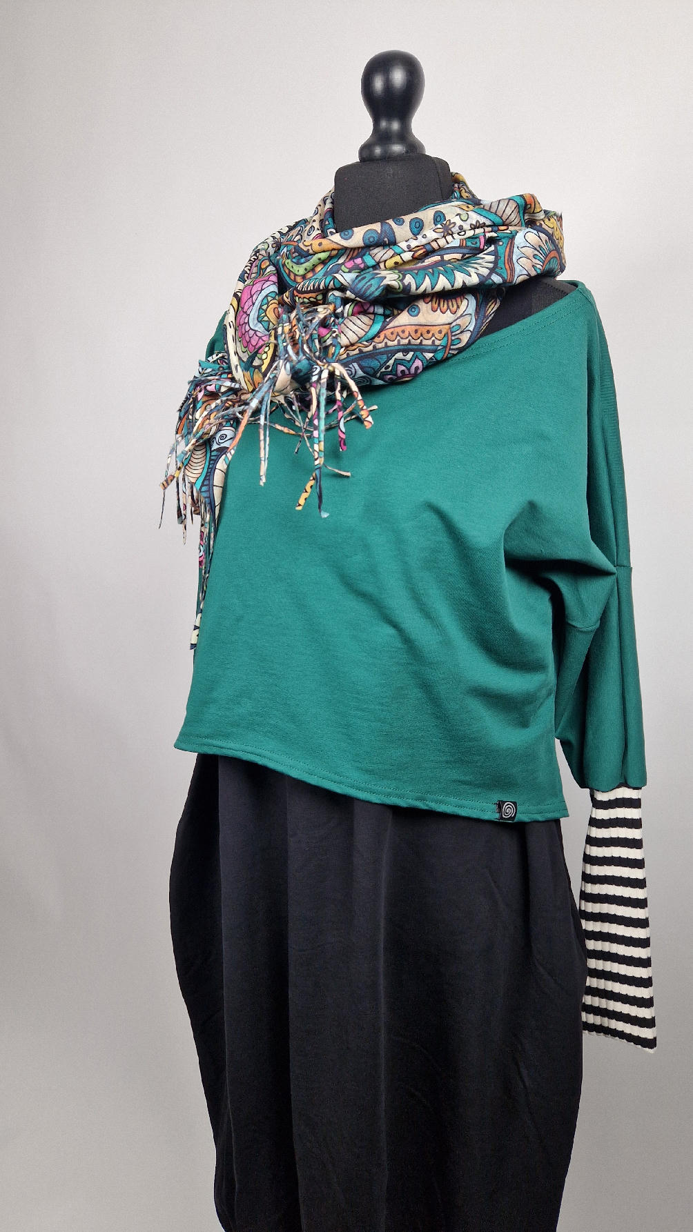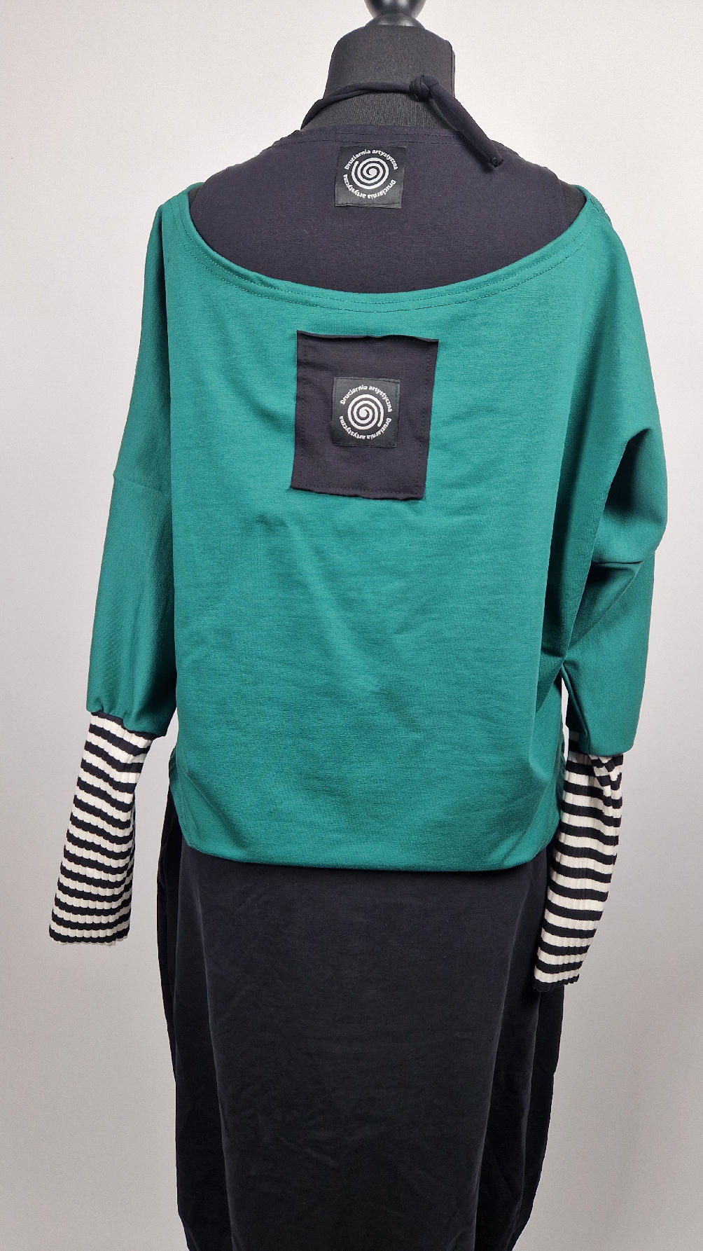Krótka, megazielona, taka ,,luzacka”, luźna w biuście bluzka typu NIETOPERZ, ale taki niewielki….bluzka uszyta z zielonej wysokiej jakości bawełny z pętelką, z długalaśnymi , elastycznymi mankietami w paski… prosta, bez kieszeni – tak specjalnie, żeby nic nie odstawało ale z dużym dekoltem typu ,,łódka”, który możesz opuścić na jedno ramię, lub nosić symetrycznie…