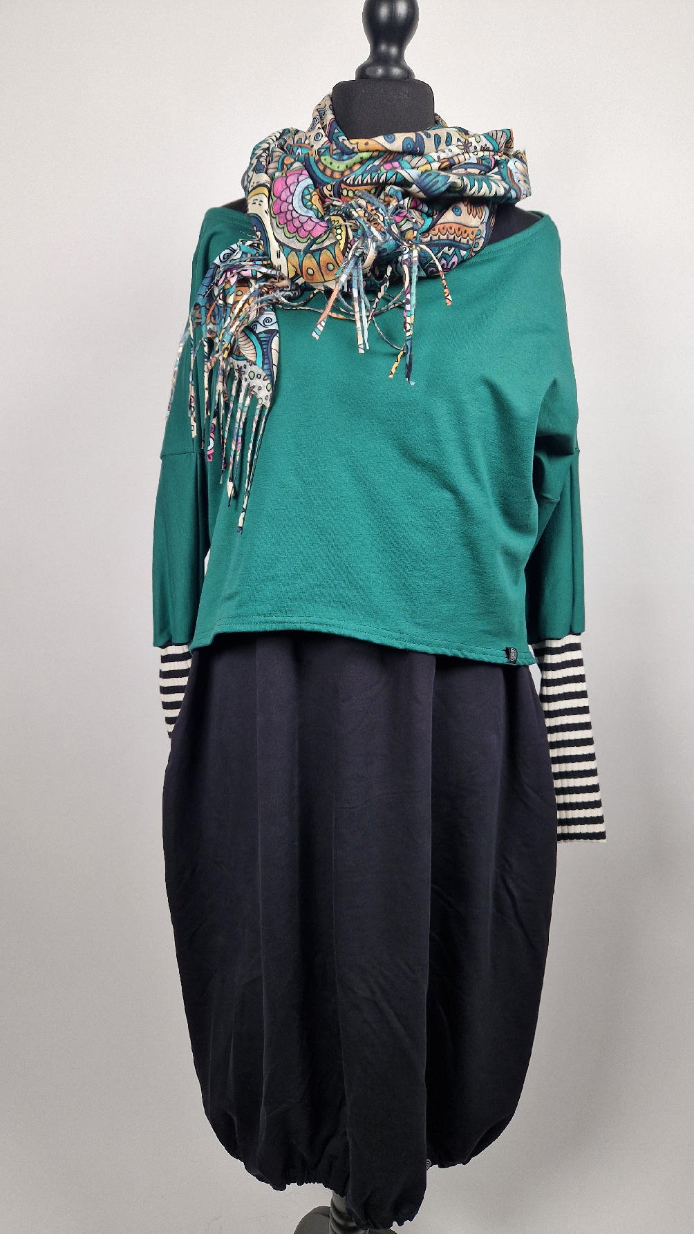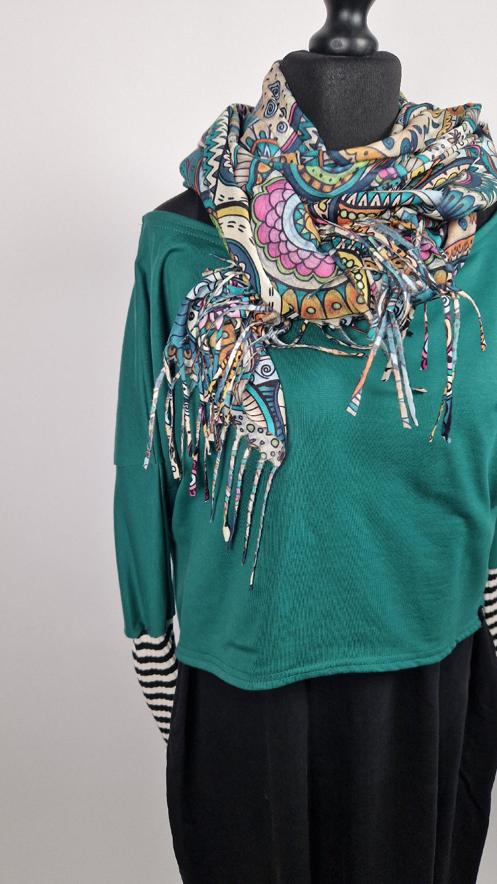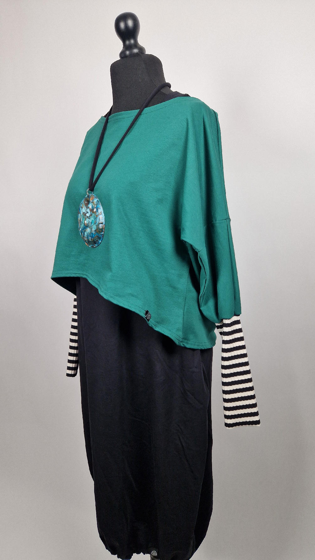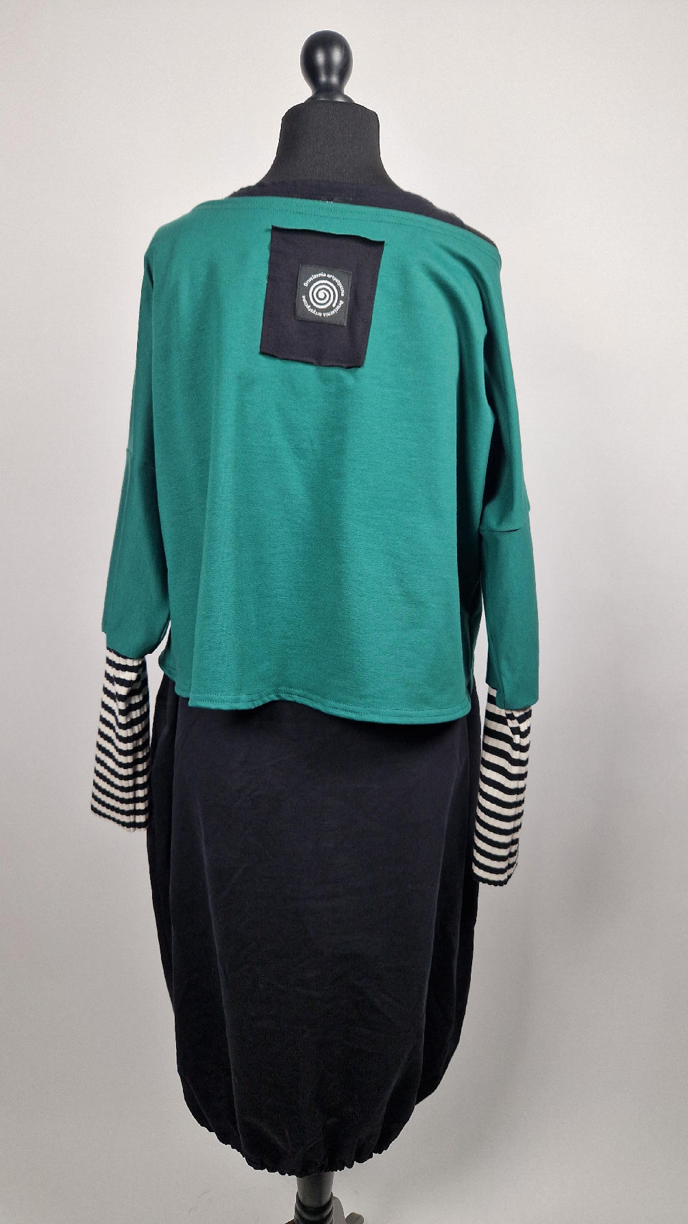 Krótka, megazielona, taka ,,luzacka”, luźna w biuście bluzka typu NIETOPERZ, ale taki niewielki….bluzka uszyta z zielonej wysokiej jakości bawełny z pętelką, z długalaśnymi , elastycznymi mankietami w paski… prosta, bez kieszeni – tak specjalnie, żeby nic nie odstawało ale z dużym dekoltem typu ,,łódka”, który możesz opuścić na jedno ramię, lub nosić symetrycznie…