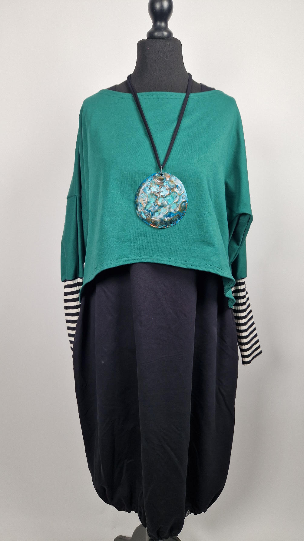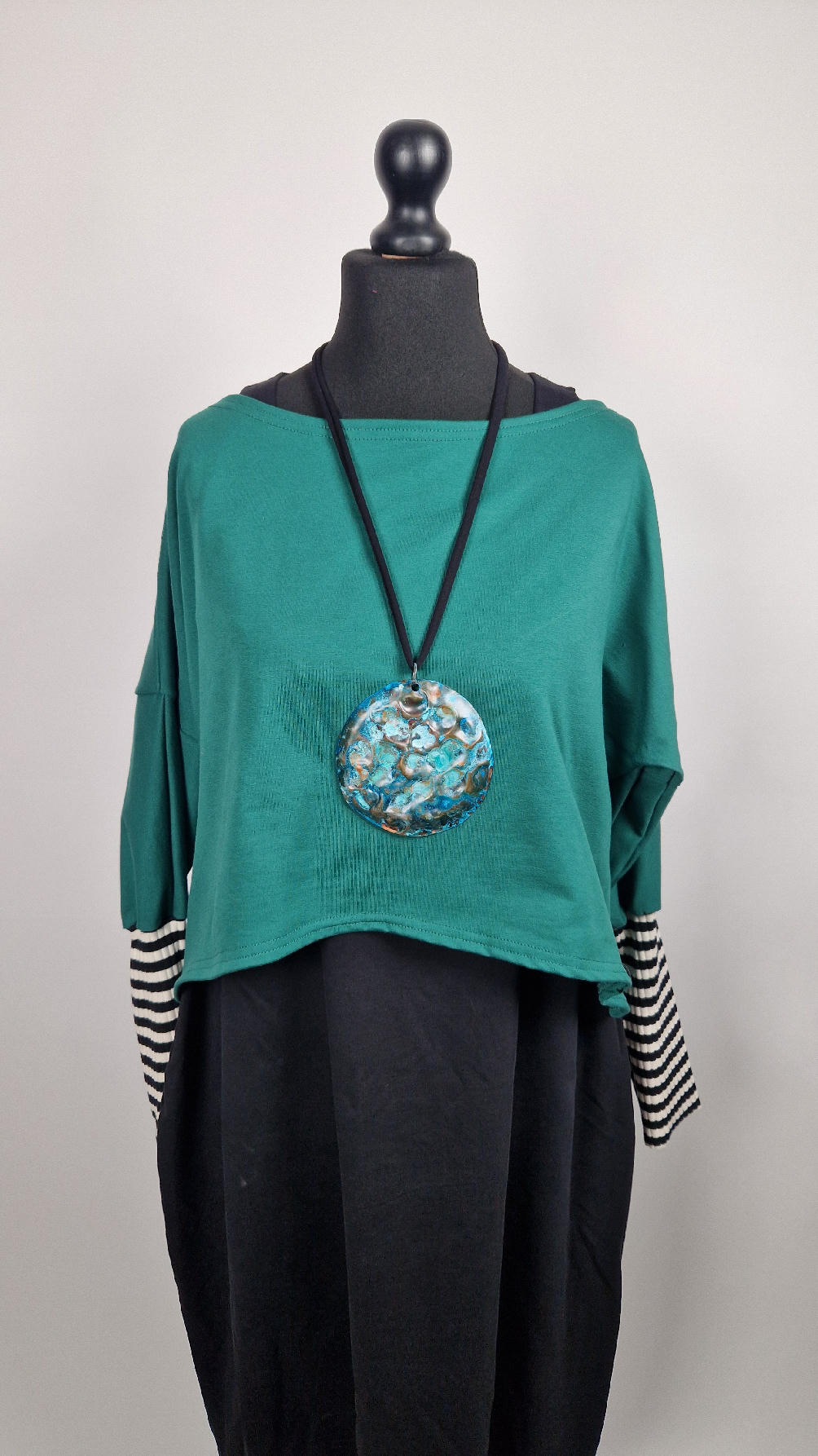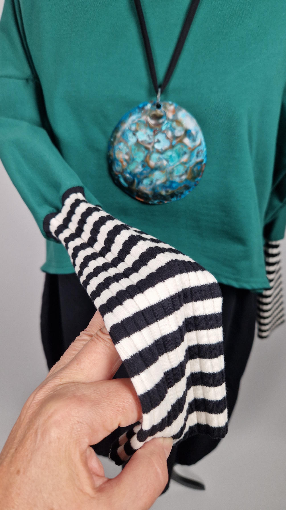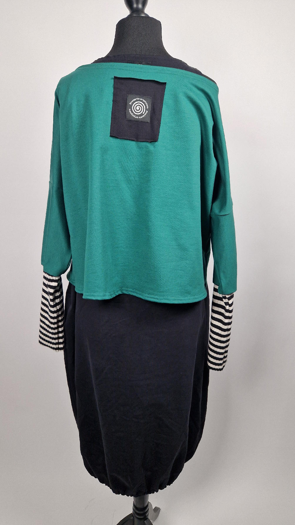 Krótka, megazielona, taka ,,luzacka”, luźna w biuście bluzka typu NIETOPERZ, ale taki niewielki….bluzka uszyta z zielonej wysokiej jakości bawełny z pętelką, z długalaśnymi , elastycznymi mankietami w paski… prosta, bez kieszeni – tak specjalnie, żeby nic nie odstawało ale z dużym dekoltem typu ,,łódka”, który możesz opuścić na jedno ramię, lub nosić symetrycznie…