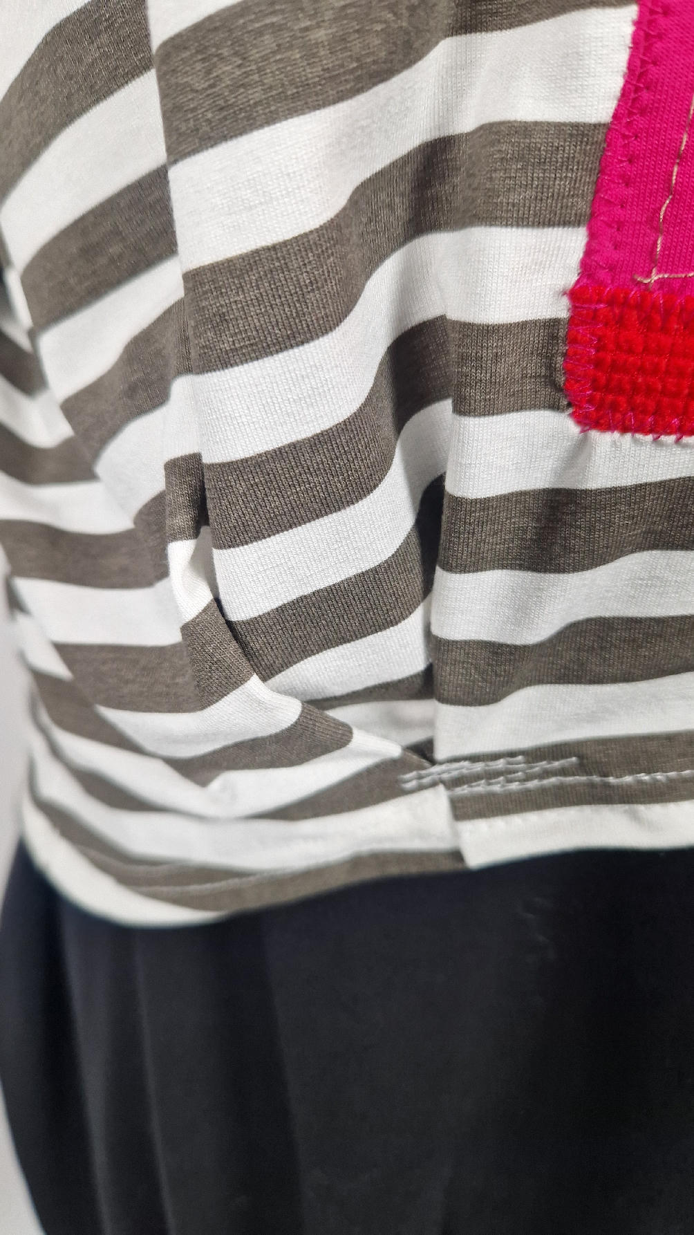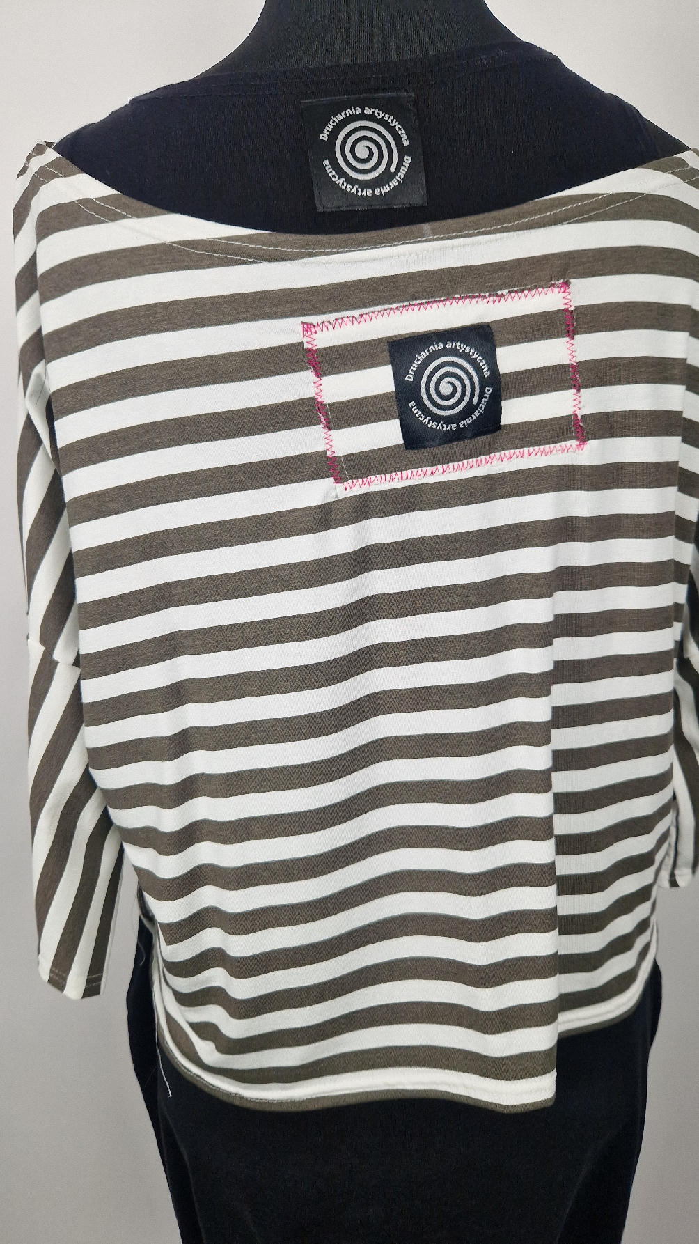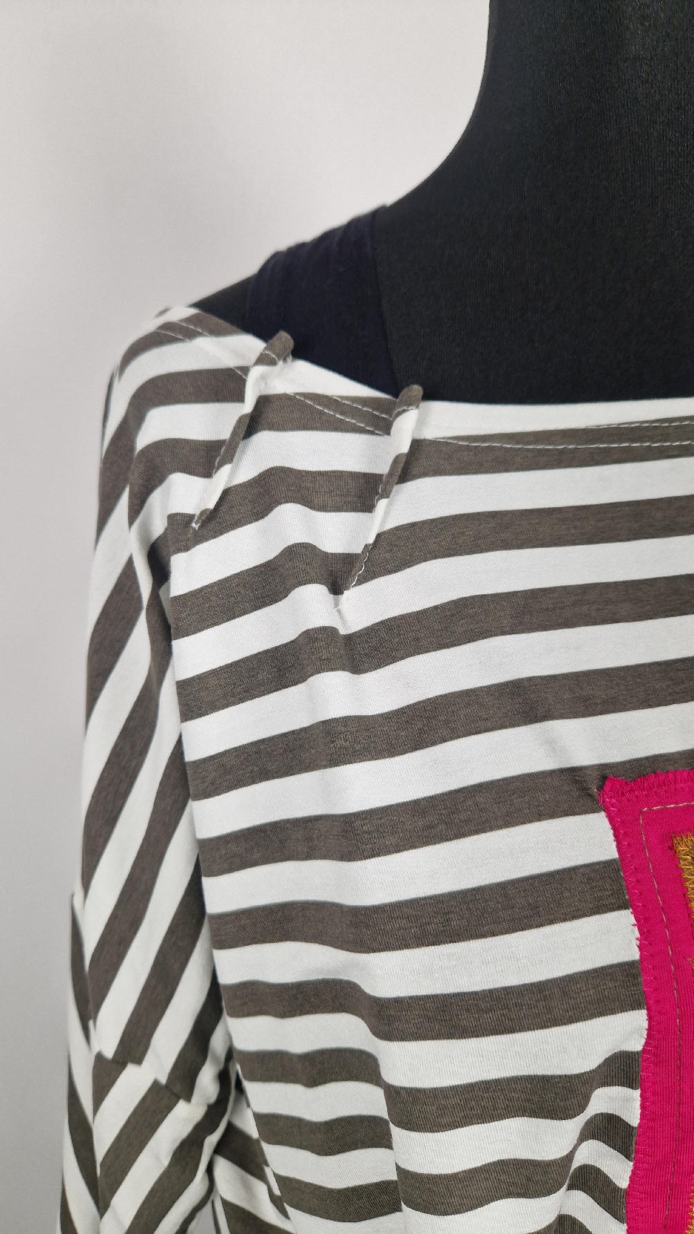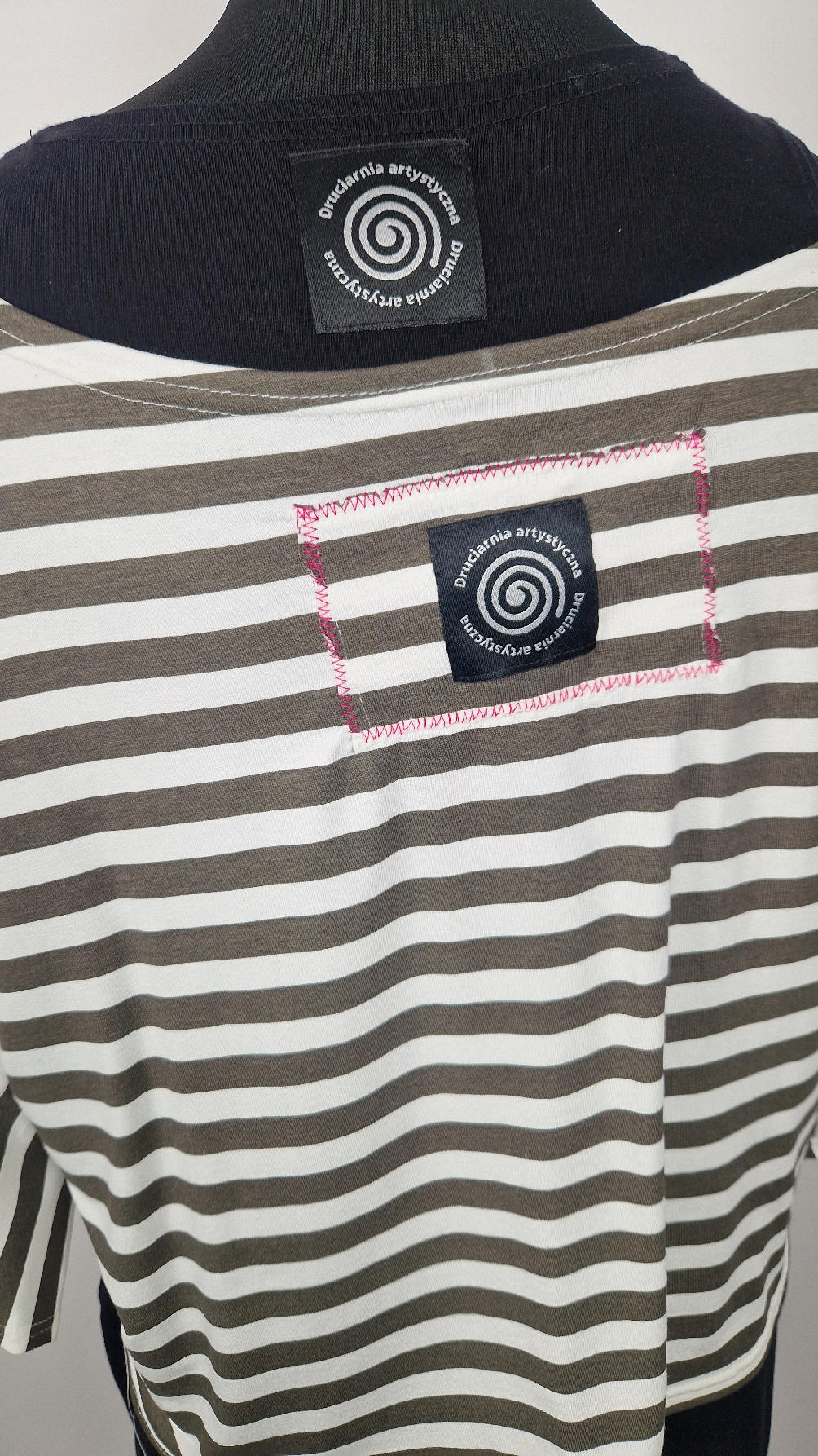 Krótka, lekka, miękka ….taka ,,luzacka”, jedyna i niepowtarzalna bluzka w paski z megakolorową aplikacja z kwiatami…luźna w biuście bluzka typu NIETOPERZ, ale taki niewielki….bluzka uszyta z wysokiej jakości bawełny typu jersey, z rękawem 3/4 … prosta, bez kieszeni – tak specjalnie, żeby nic nie odstawało ale z dużym dekoltem typu ,,łódka”, na tym dekolcie zrobiłam dwie zaszewki, tak dla bajeru i żeby lepiej się trzymała… na dole też jest z boku zaszewka…dekolt możesz opuścić na jedno ramię, lub nosić symetrycznie…świetnie pasuje do niej naszyjnik LA PERLA BIANCA
