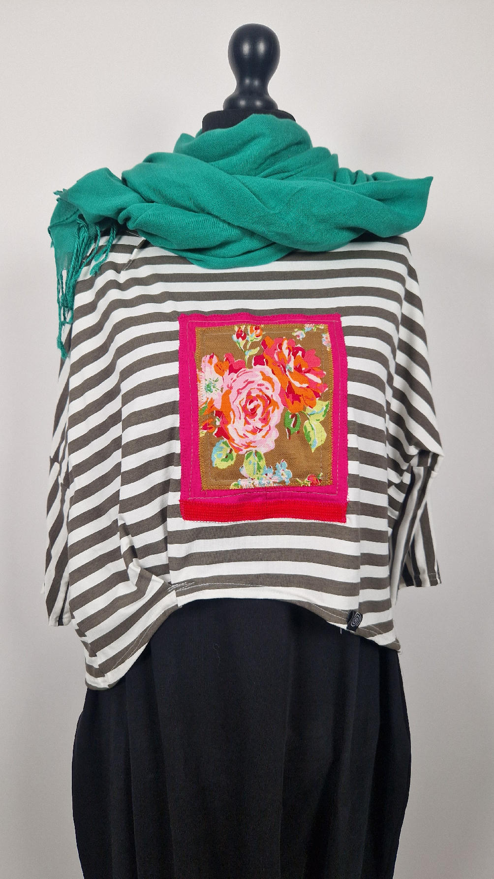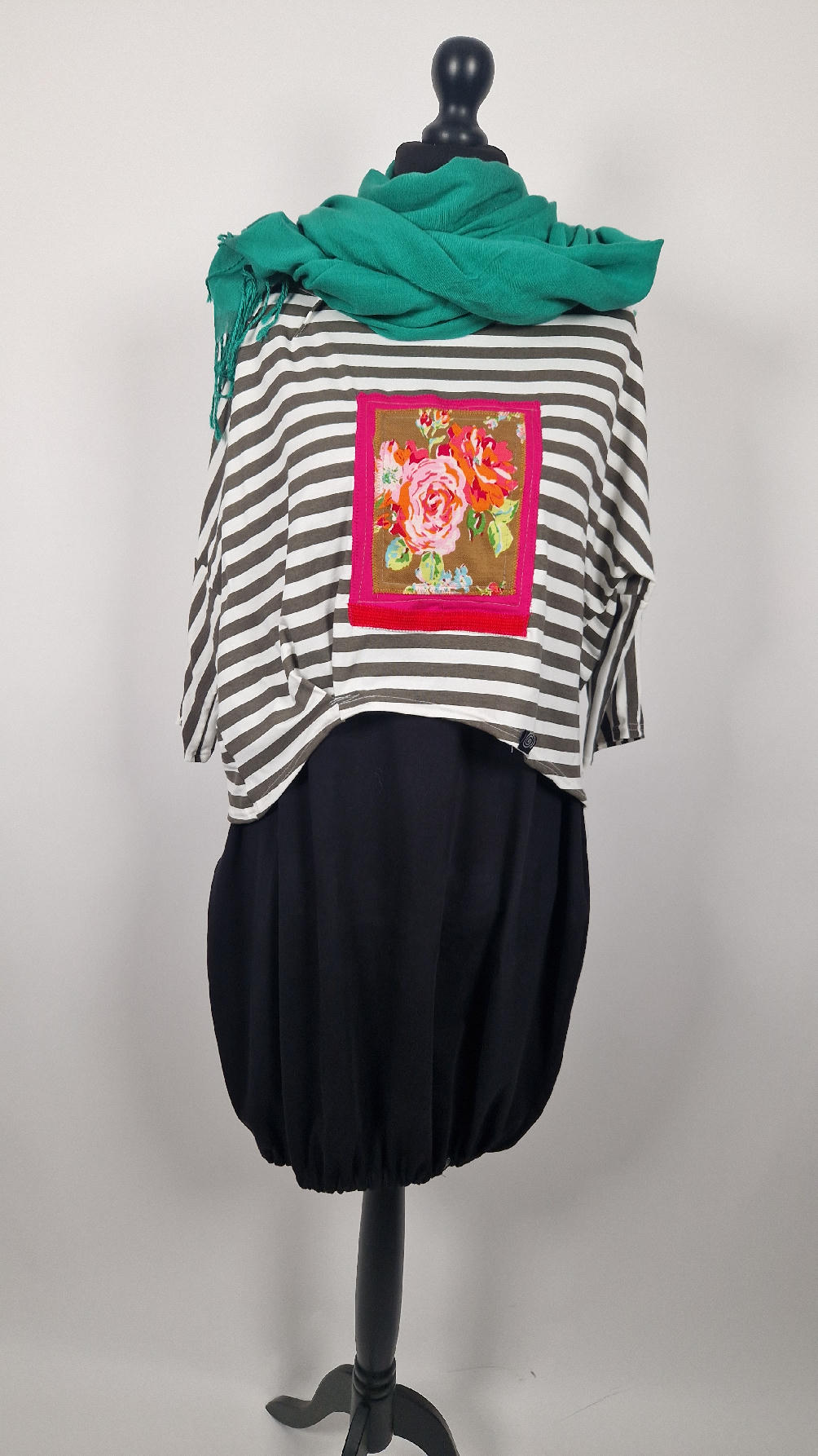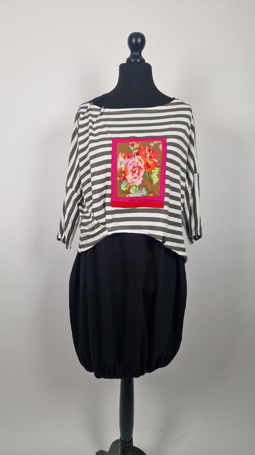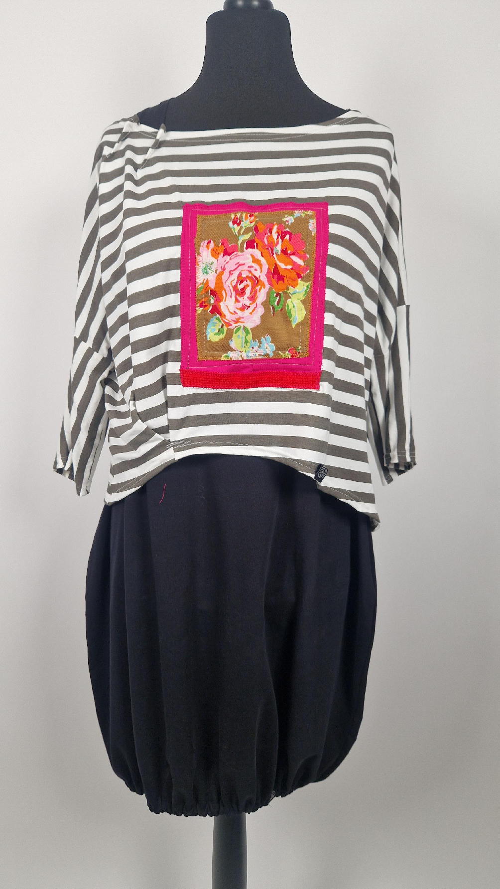 Krótka, lekka, miękka ….taka ,,luzacka”, jedyna i niepowtarzalna bluzka w paski z megakolorową aplikacja z kwiatami…luźna w biuście bluzka typu NIETOPERZ, ale taki niewielki….bluzka uszyta z wysokiej jakości bawełny typu jersey, z rękawem 3/4 … prosta, bez kieszeni – tak specjalnie, żeby nic nie odstawało ale z dużym dekoltem typu ,,łódka”, na tym dekolcie zrobiłam dwie zaszewki, tak dla bajeru i żeby lepiej się trzymała… na dole też jest z boku zaszewka…dekolt możesz opuścić na jedno ramię, lub nosić symetrycznie…świetnie pasuje do niej naszyjnik LA PERLA BIANCA