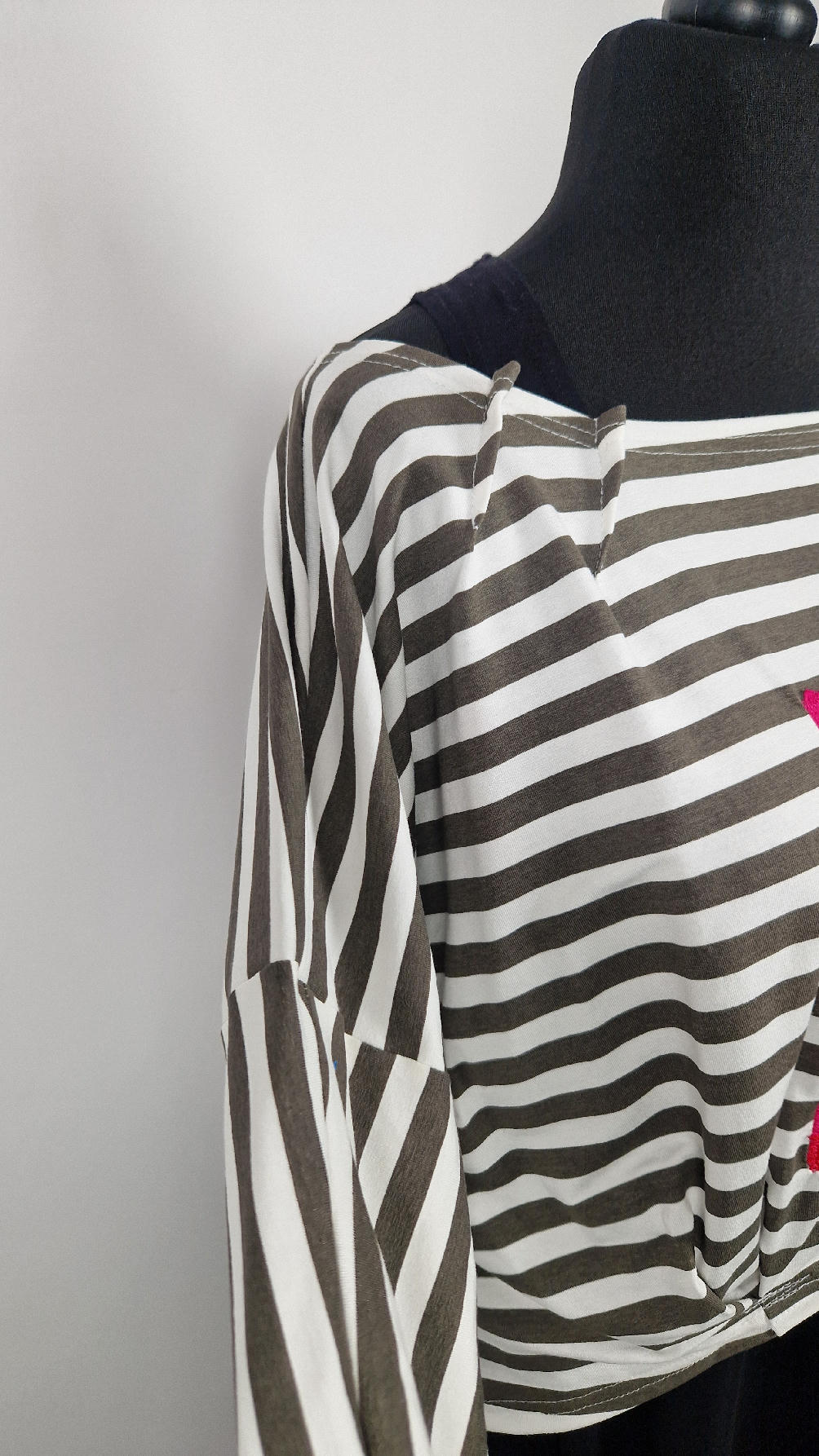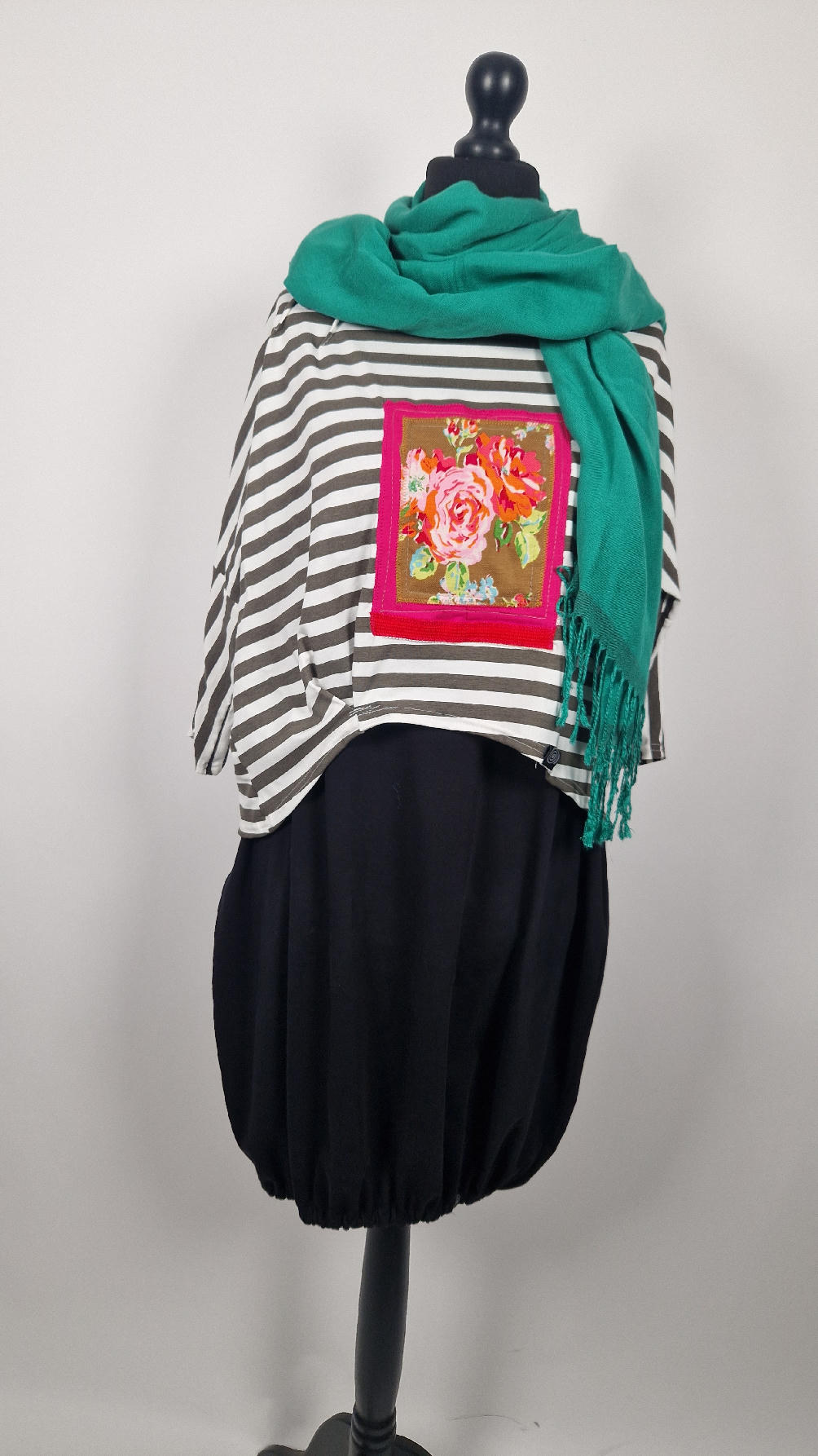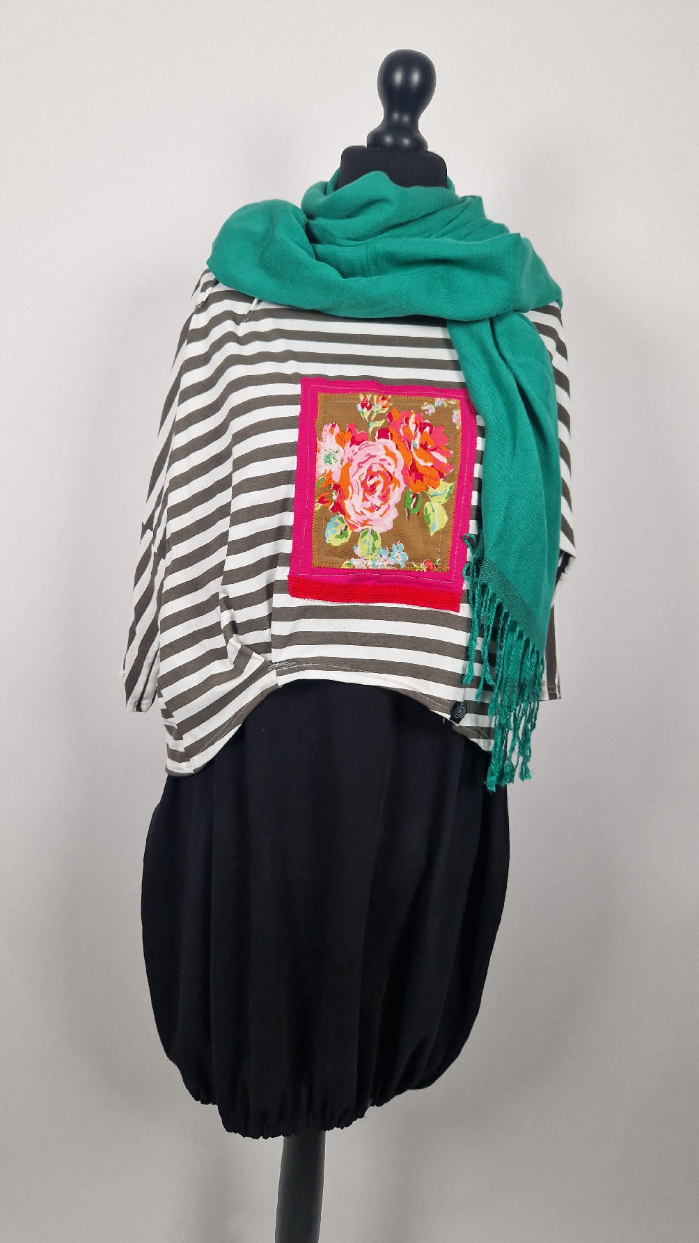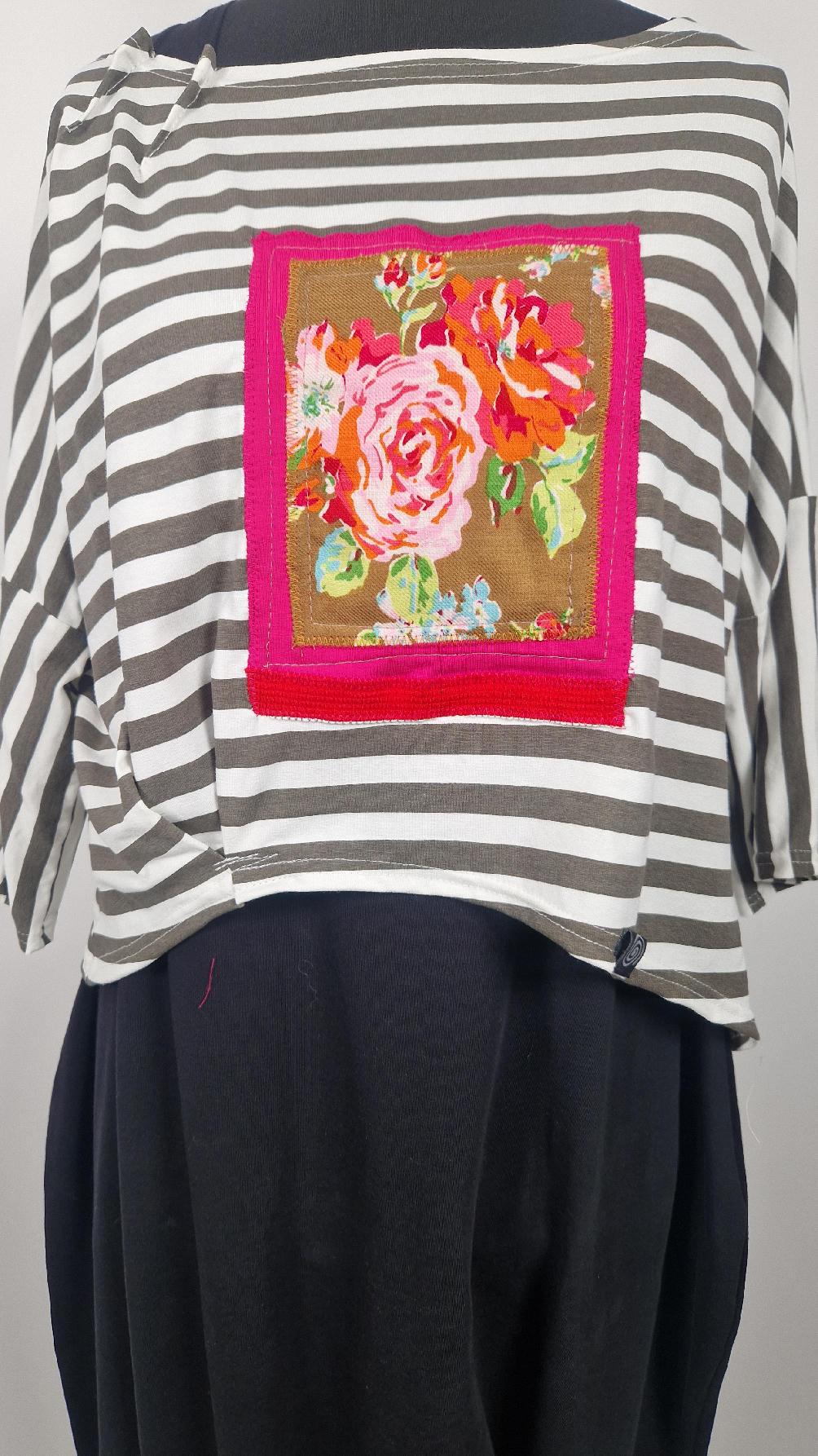 Krótka, lekka, miękka ….taka ,,luzacka”, jedyna i niepowtarzalna bluzka w paski z megakolorową aplikacja z kwiatami…luźna w biuście bluzka typu NIETOPERZ, ale taki niewielki….bluzka uszyta z wysokiej jakości bawełny typu jersey, z rękawem 3/4 … prosta, bez kieszeni – tak specjalnie, żeby nic nie odstawało ale z dużym dekoltem typu ,,łódka”, na tym dekolcie zrobiłam dwie zaszewki, tak dla bajeru i żeby lepiej się trzymała… na dole też jest z boku zaszewka…dekolt możesz opuścić na jedno ramię, lub nosić symetrycznie…świetnie pasuje do niej naszyjnik LA PERLA BIANCA