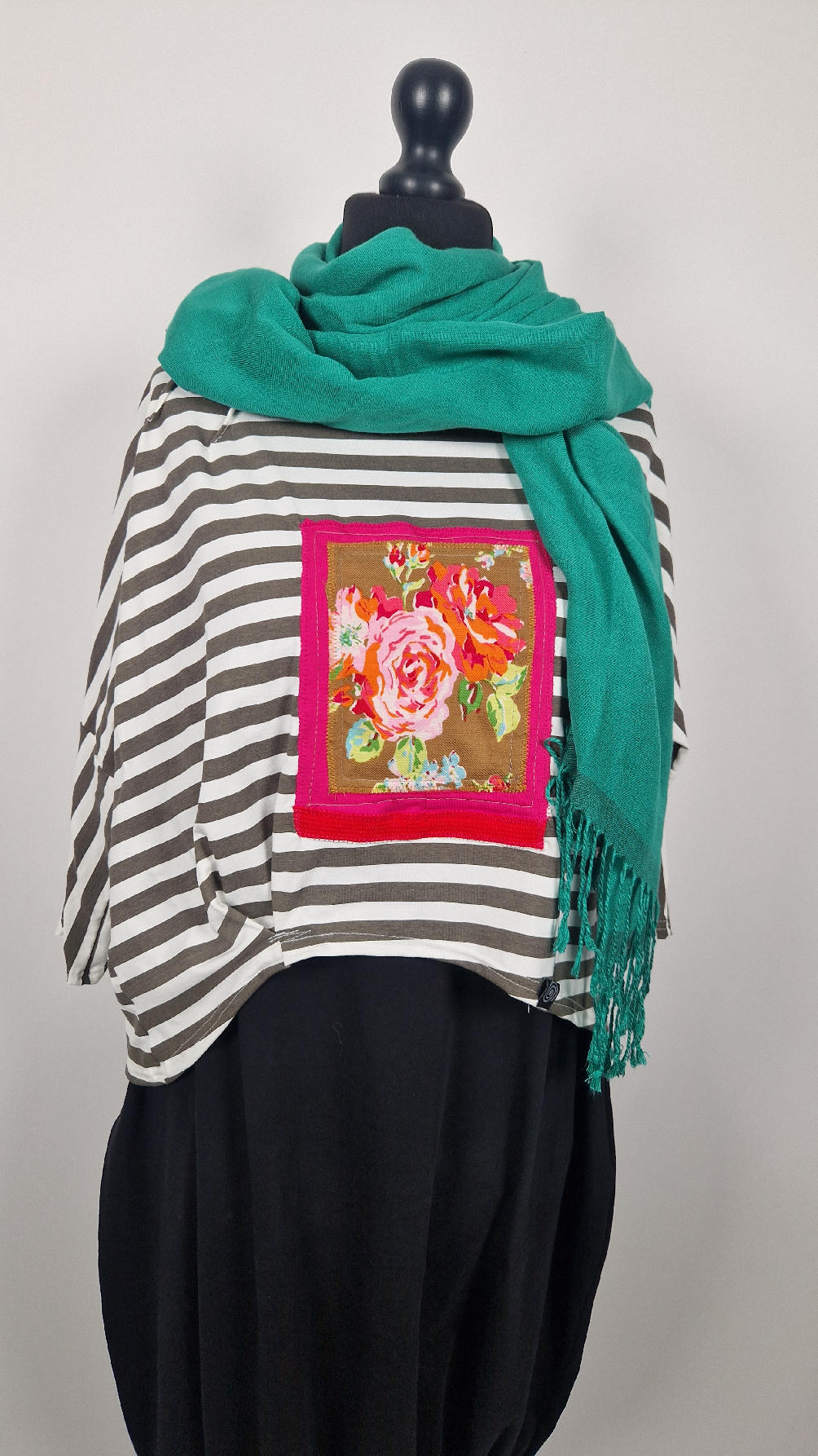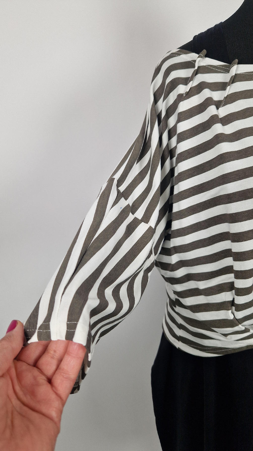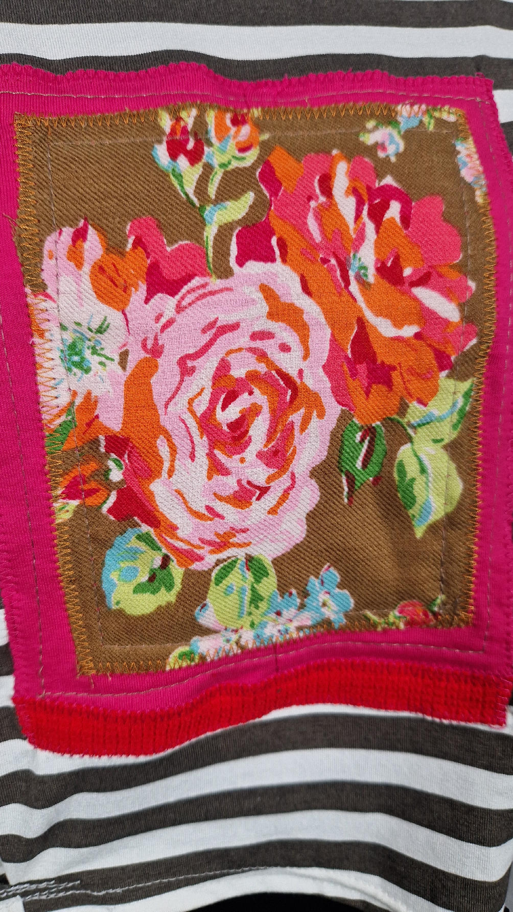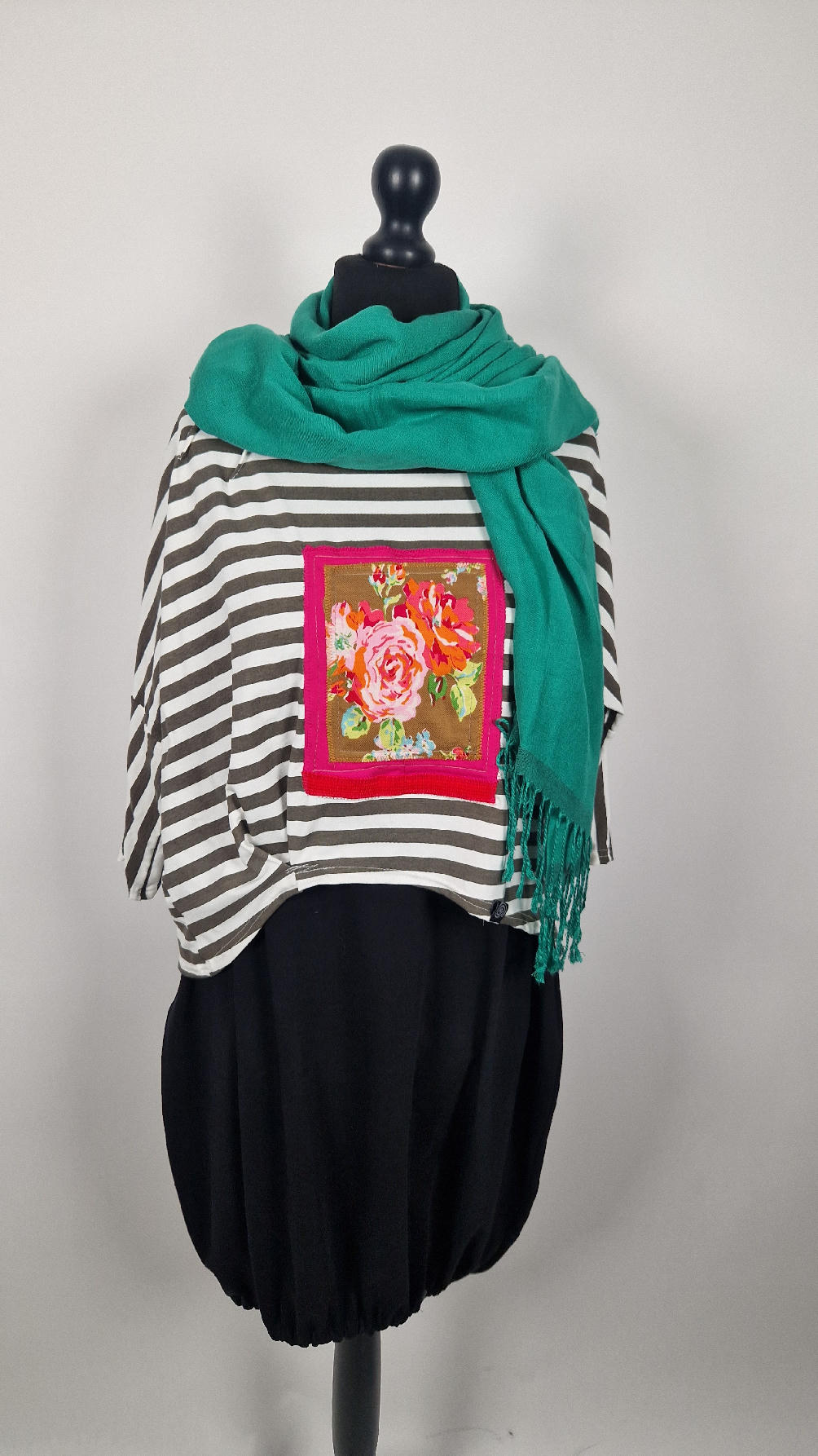 Krótka, lekka, miękka ….taka ,,luzacka”, jedyna i niepowtarzalna bluzka w paski z megakolorową aplikacja z kwiatami…luźna w biuście bluzka typu NIETOPERZ, ale taki niewielki….bluzka uszyta z wysokiej jakości bawełny typu jersey, z rękawem 3/4 … prosta, bez kieszeni – tak specjalnie, żeby nic nie odstawało ale z dużym dekoltem typu ,,łódka”, na tym dekolcie zrobiłam dwie zaszewki, tak dla bajeru i żeby lepiej się trzymała… na dole też jest z boku zaszewka…dekolt możesz opuścić na jedno ramię, lub nosić symetrycznie…świetnie pasuje do niej naszyjnik LA PERLA BIANCA