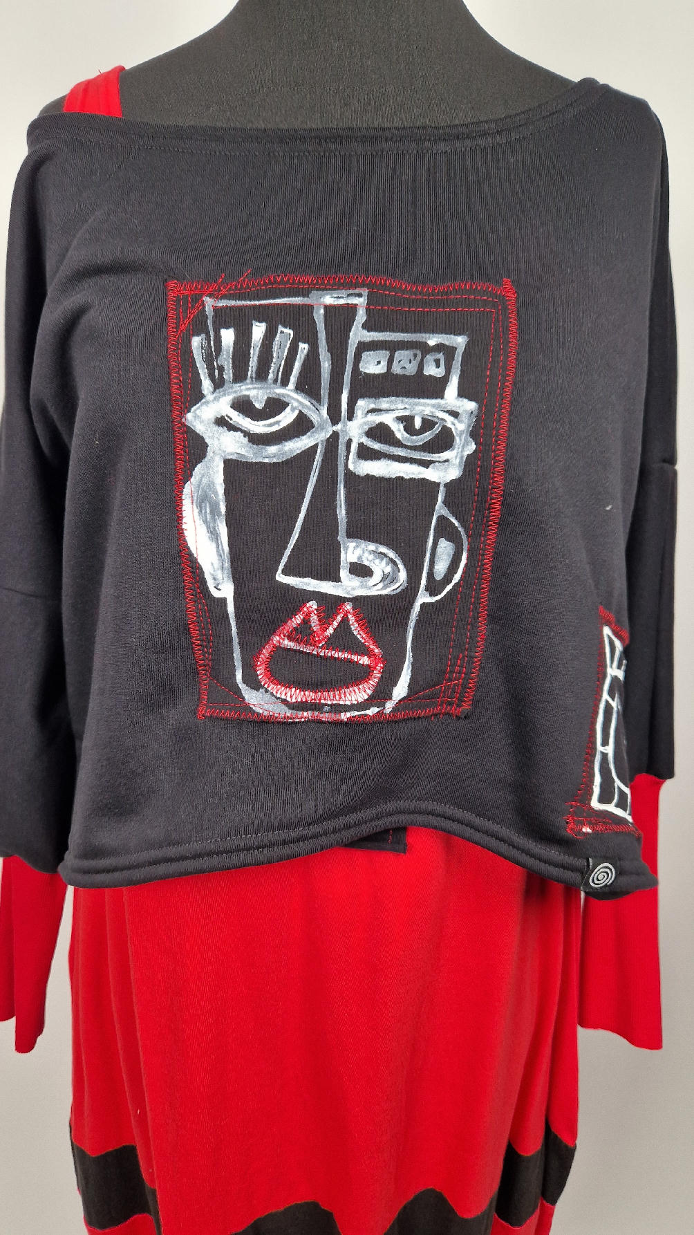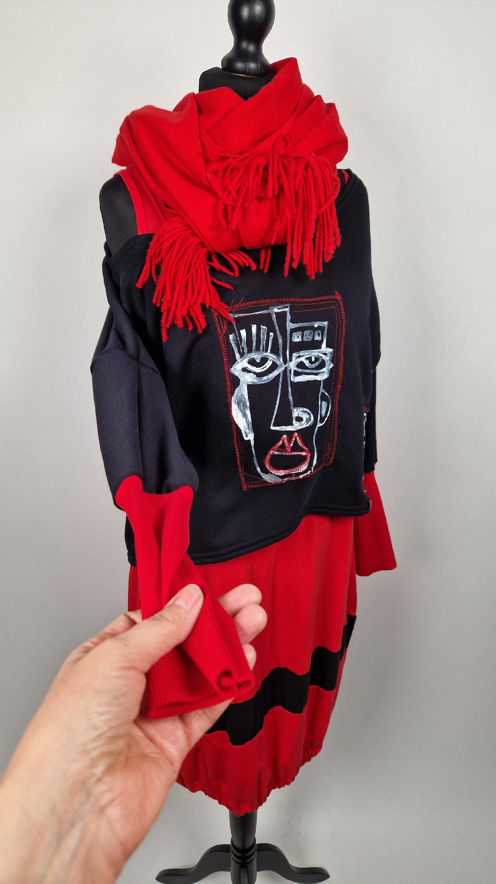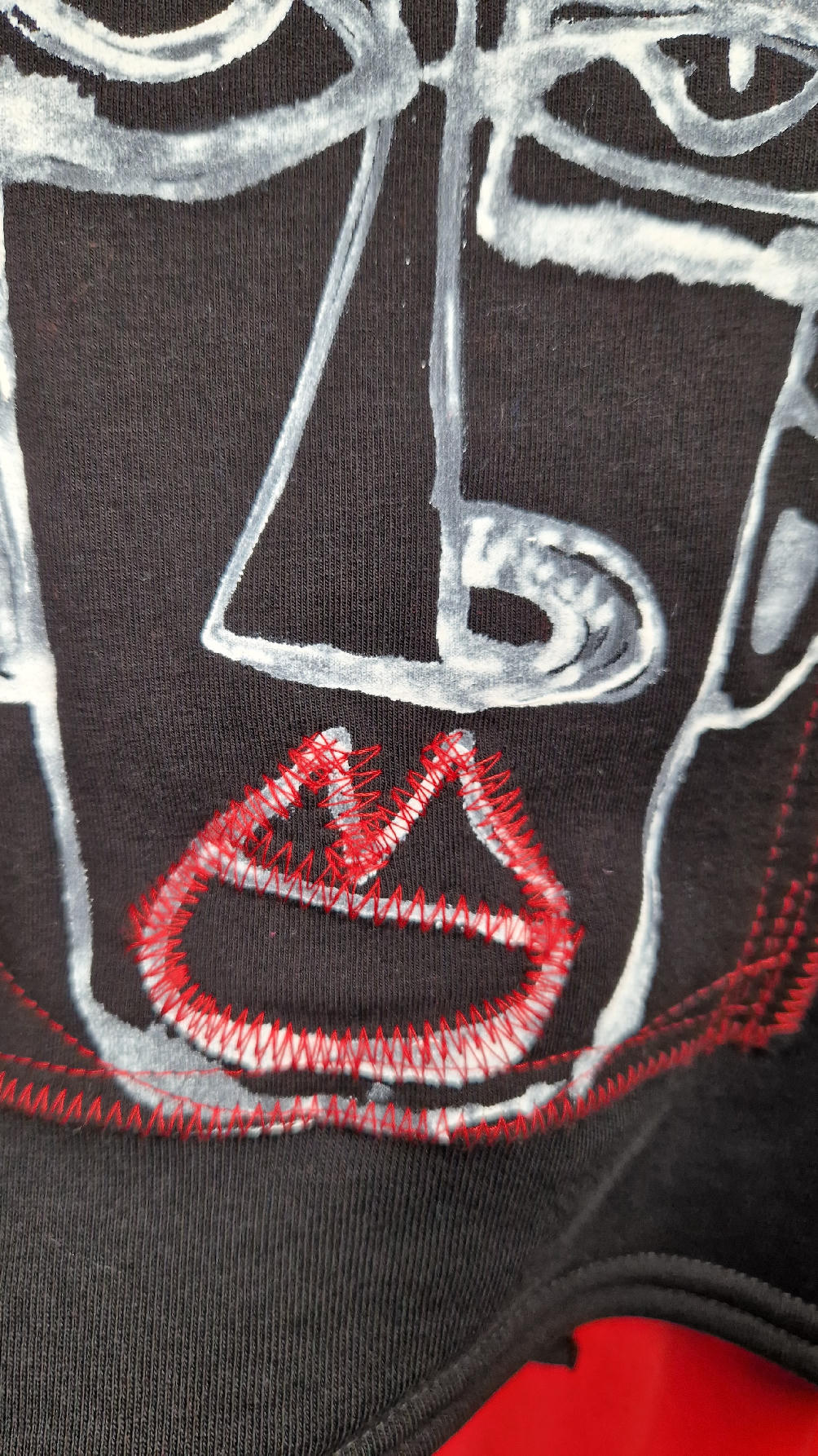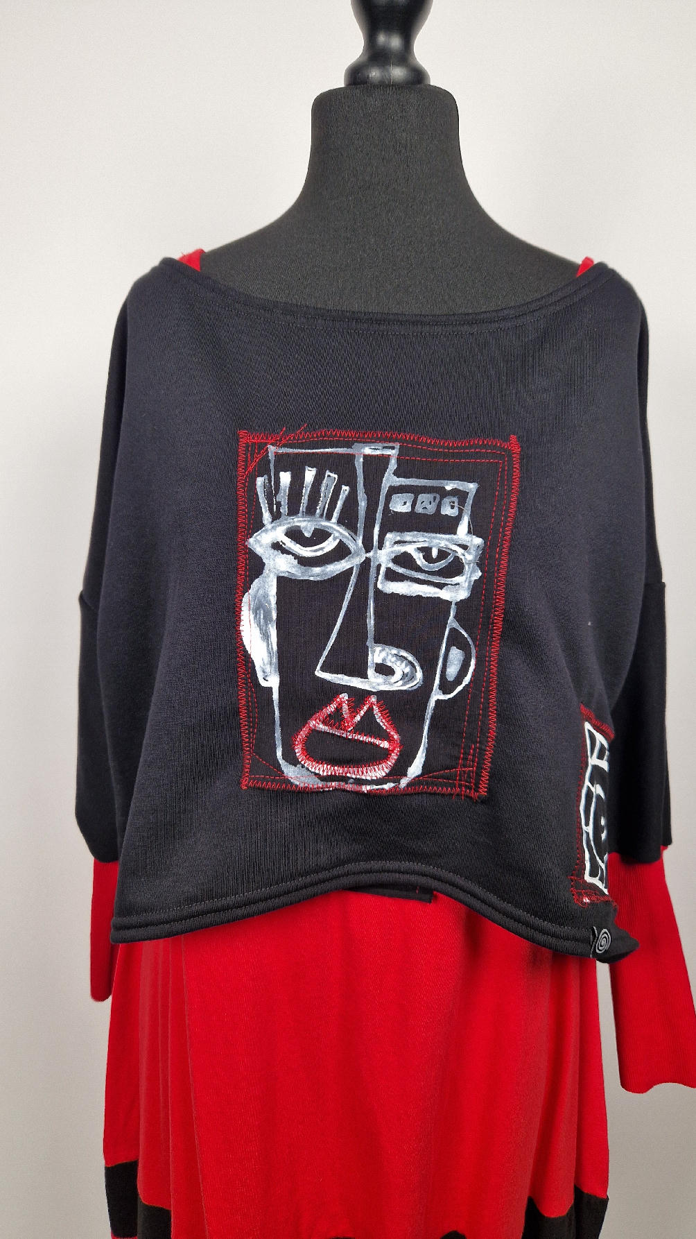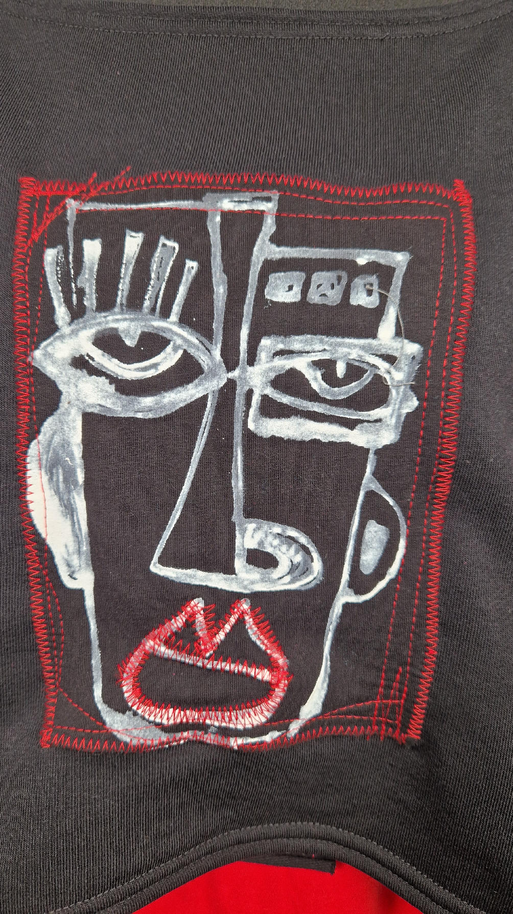 Krótka, ręcznie malowana  i poprzeszywana kontrastową nitką, czarna, luźna w biuście bluzka typu NIETOPERZ, ale taki niewielki….bluzka uszyta z wysokiej jakości bawełny z pętelką,  z długalaśnymi , elastycznymi , czerwonymi mankietami … prosta, bez kieszeni – tak specjalnie, żeby nic nie odstawało  ale z dużym dekoltem  typu ,,łódka”,  który możesz opuścić na jedno ramię, lub nosić symetrycznie…Każdy,,portret”  jest namalowany ręcznie  przeze mnie, na  czarnej bawełnie , następnie przyszyty do bluzki