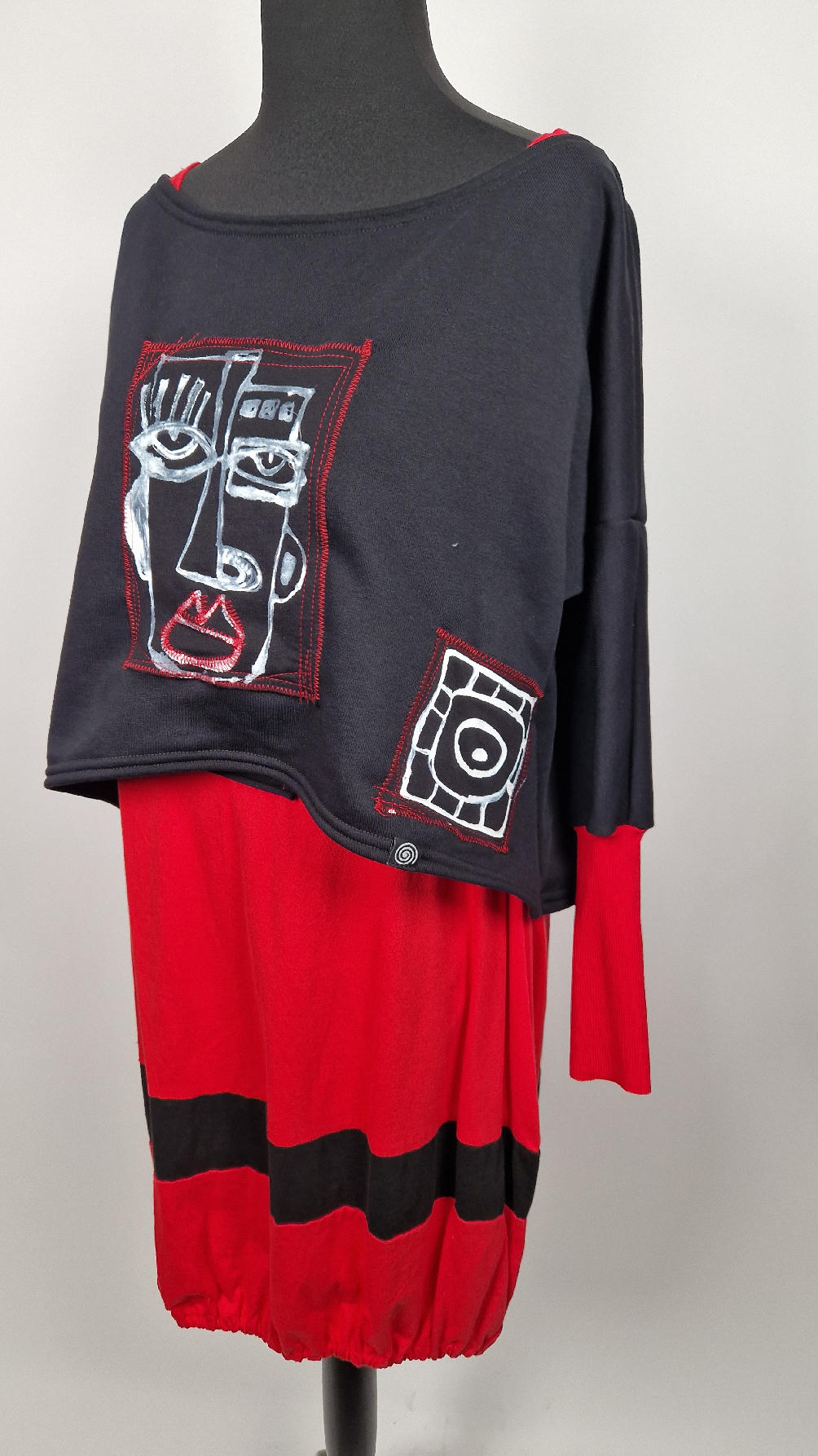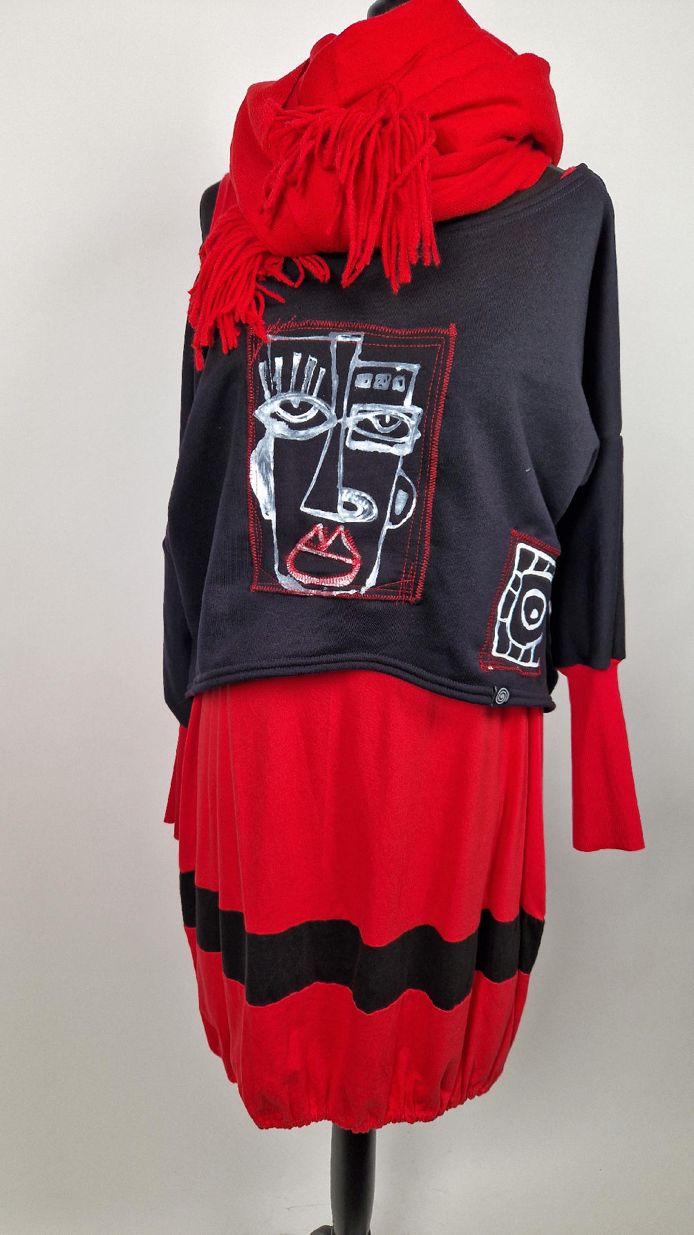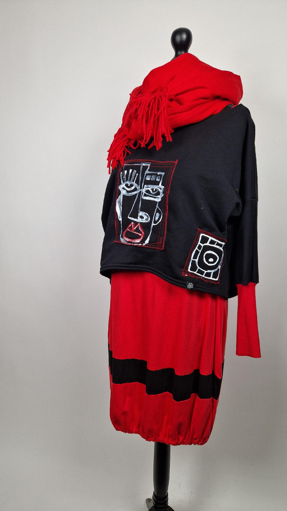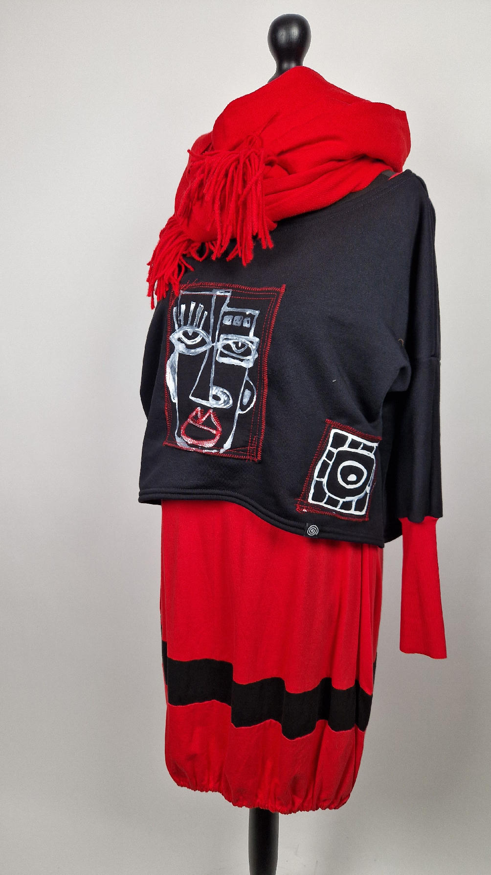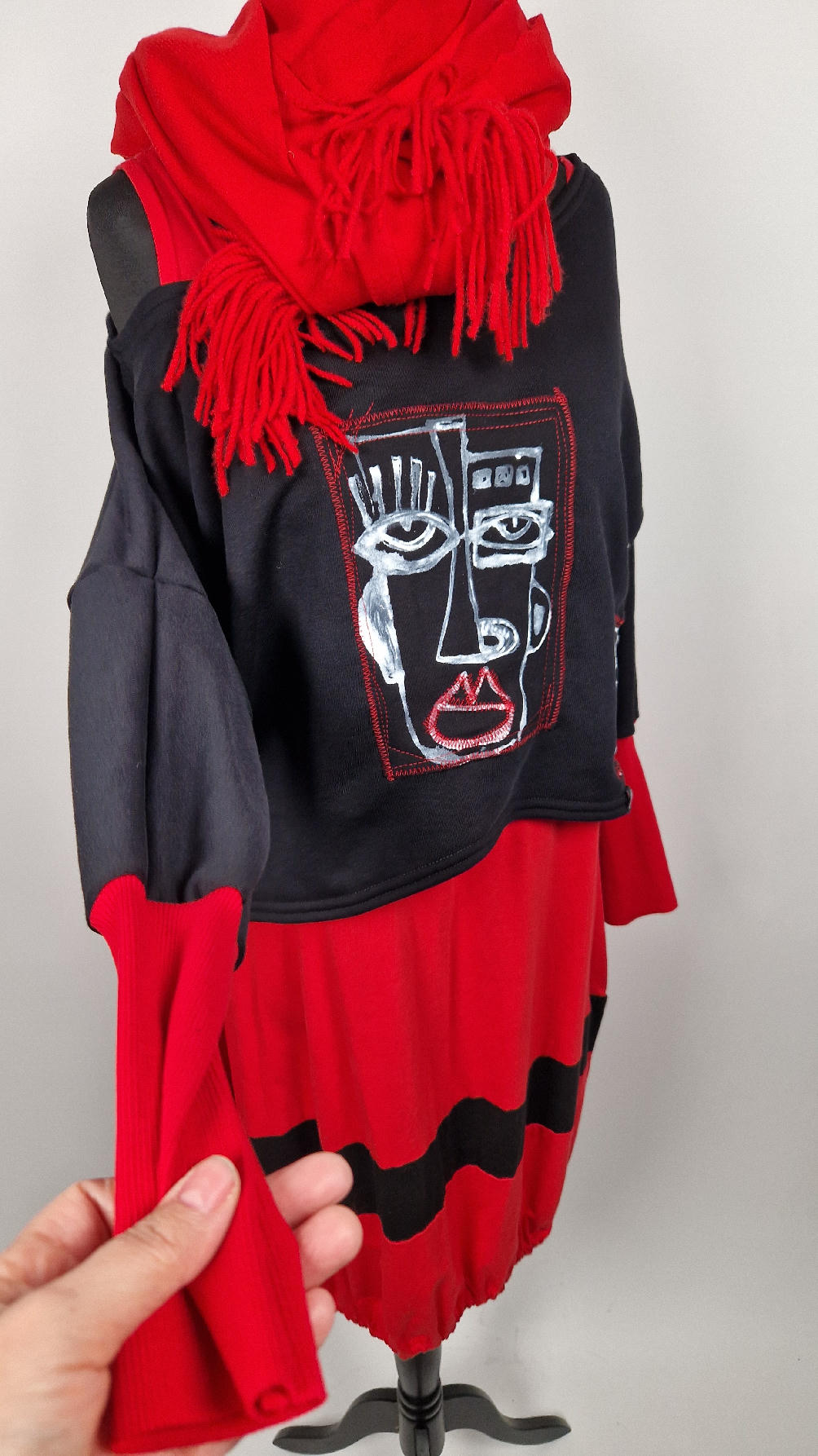 Krótka, ręcznie malowana  i poprzeszywana kontrastową nitką, czarna, luźna w biuście bluzka typu NIETOPERZ, ale taki niewielki….bluzka uszyta z wysokiej jakości bawełny z pętelką,  z długalaśnymi , elastycznymi , czerwonymi mankietami … prosta, bez kieszeni – tak specjalnie, żeby nic nie odstawało  ale z dużym dekoltem  typu ,,łódka”,  który możesz opuścić na jedno ramię, lub nosić symetrycznie…Każdy,,portret”  jest namalowany ręcznie  przeze mnie, na  czarnej bawełnie , następnie przyszyty do bluzki