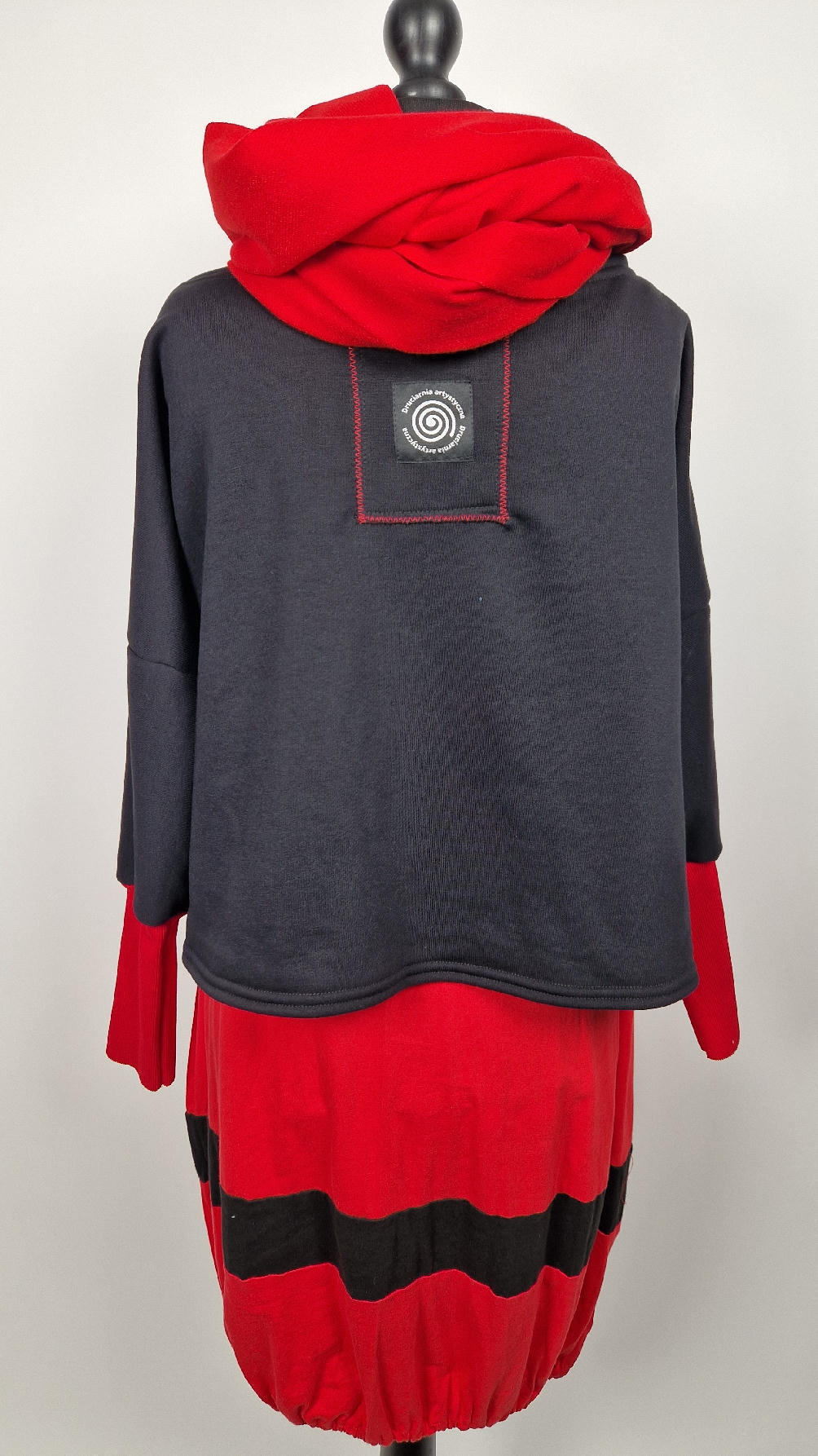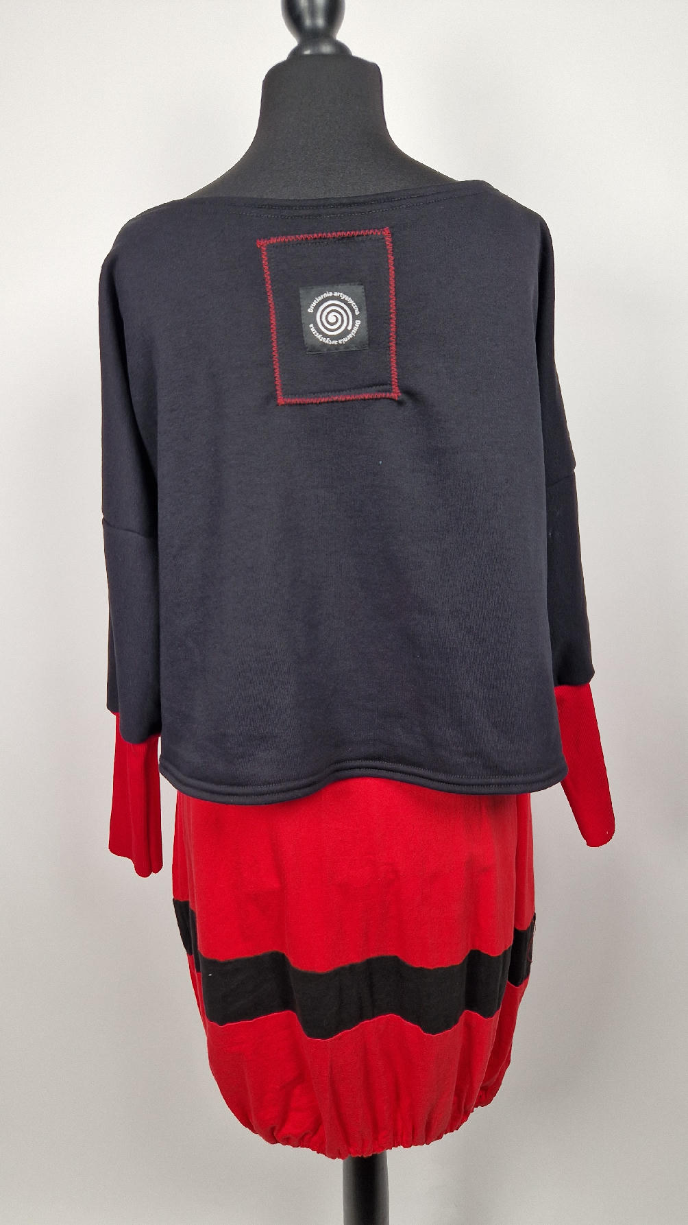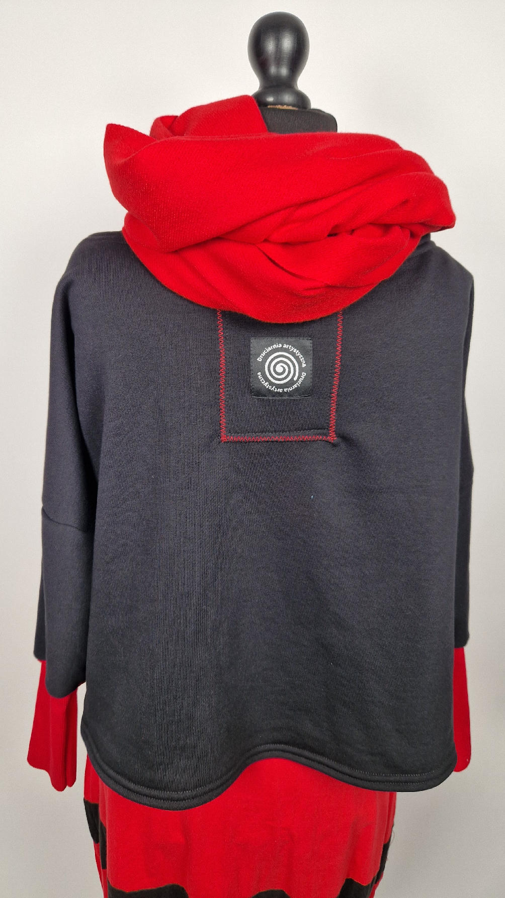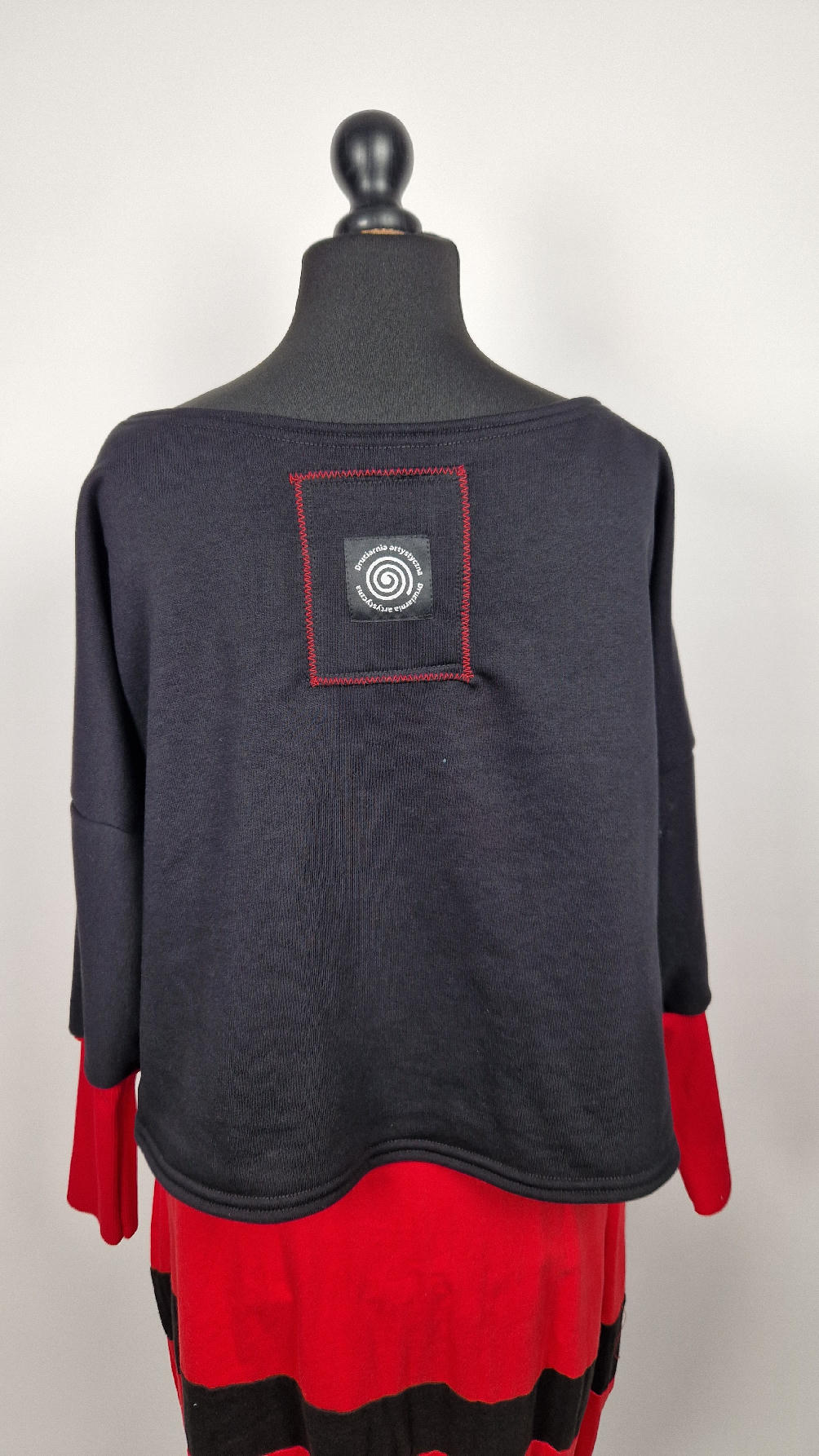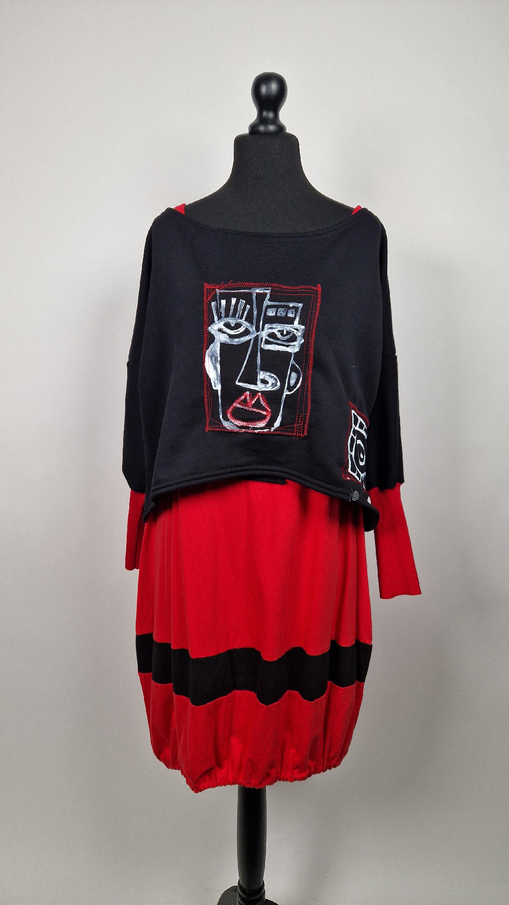 Krótka, ręcznie malowana  i poprzeszywana kontrastową nitką, czarna, luźna w biuście bluzka typu NIETOPERZ, ale taki niewielki….bluzka uszyta z wysokiej jakości bawełny z pętelką,  z długalaśnymi , elastycznymi , czerwonymi mankietami … prosta, bez kieszeni – tak specjalnie, żeby nic nie odstawało  ale z dużym dekoltem  typu ,,łódka”,  który możesz opuścić na jedno ramię, lub nosić symetrycznie…Każdy,,portret”  jest namalowany ręcznie  przeze mnie, na  czarnej bawełnie , następnie przyszyty do bluzki