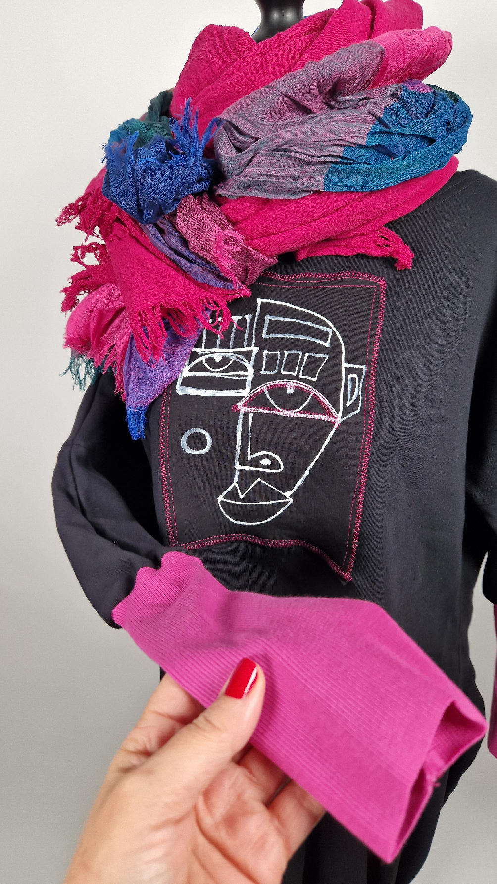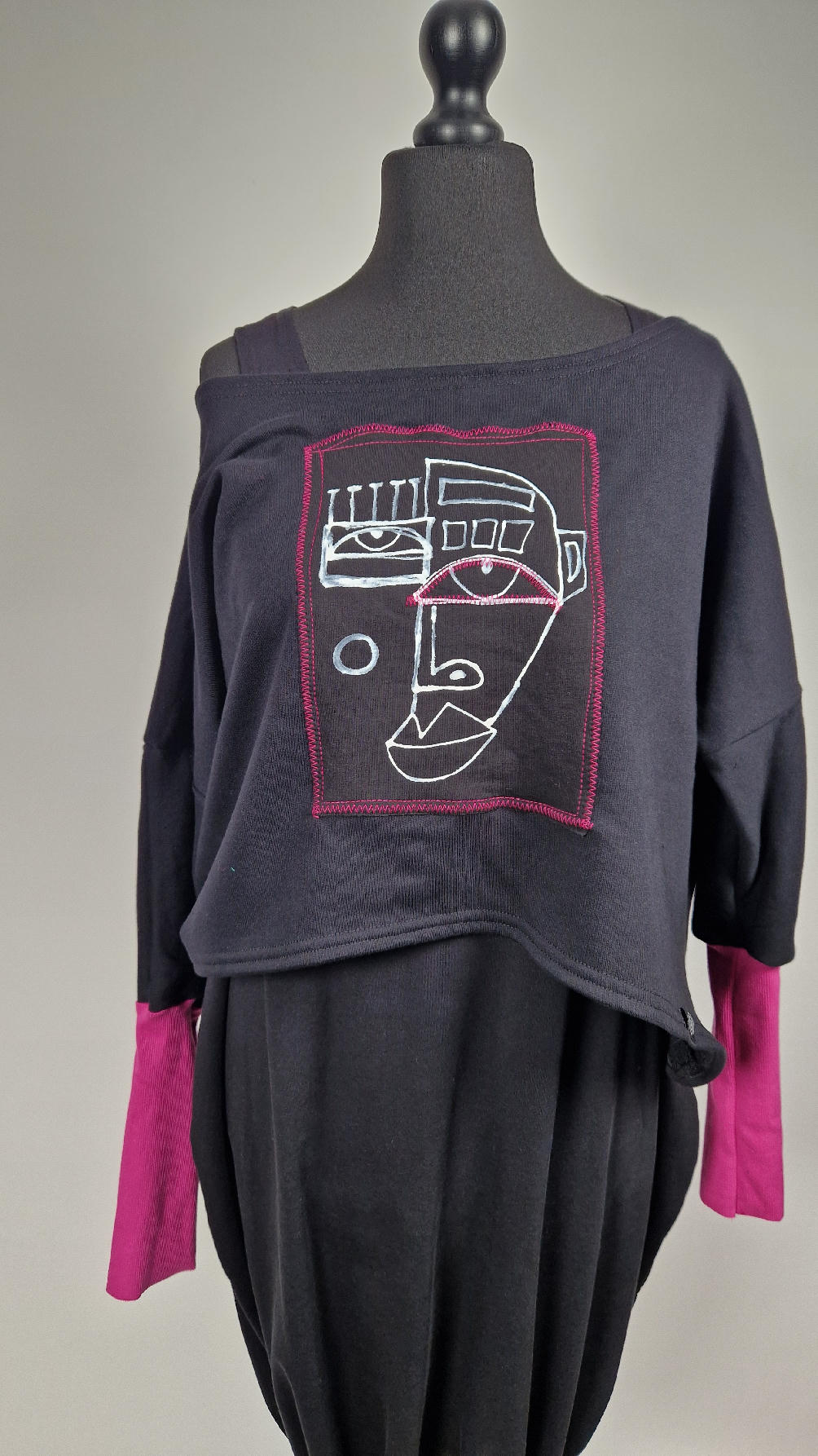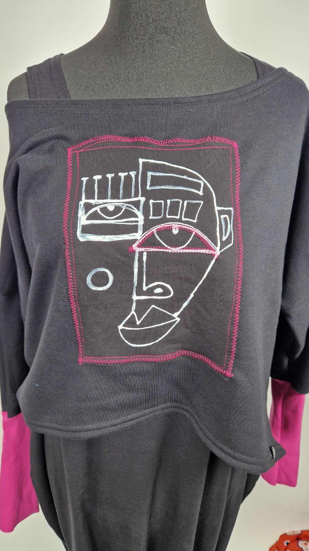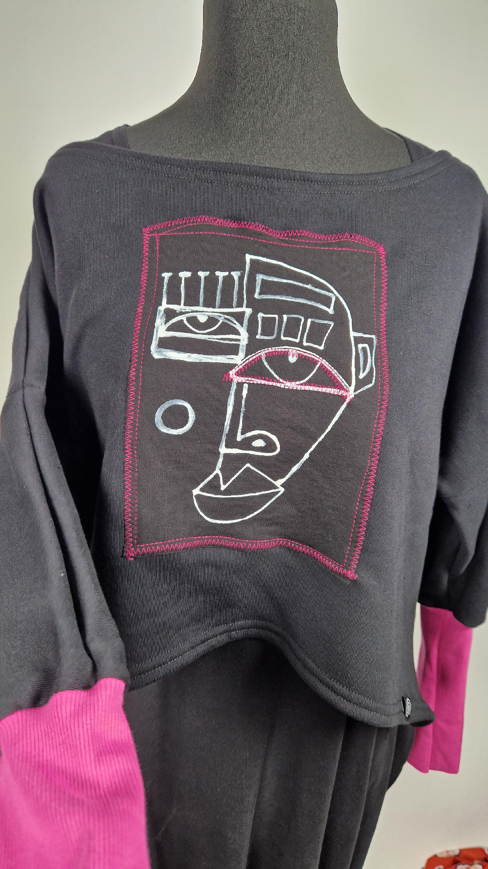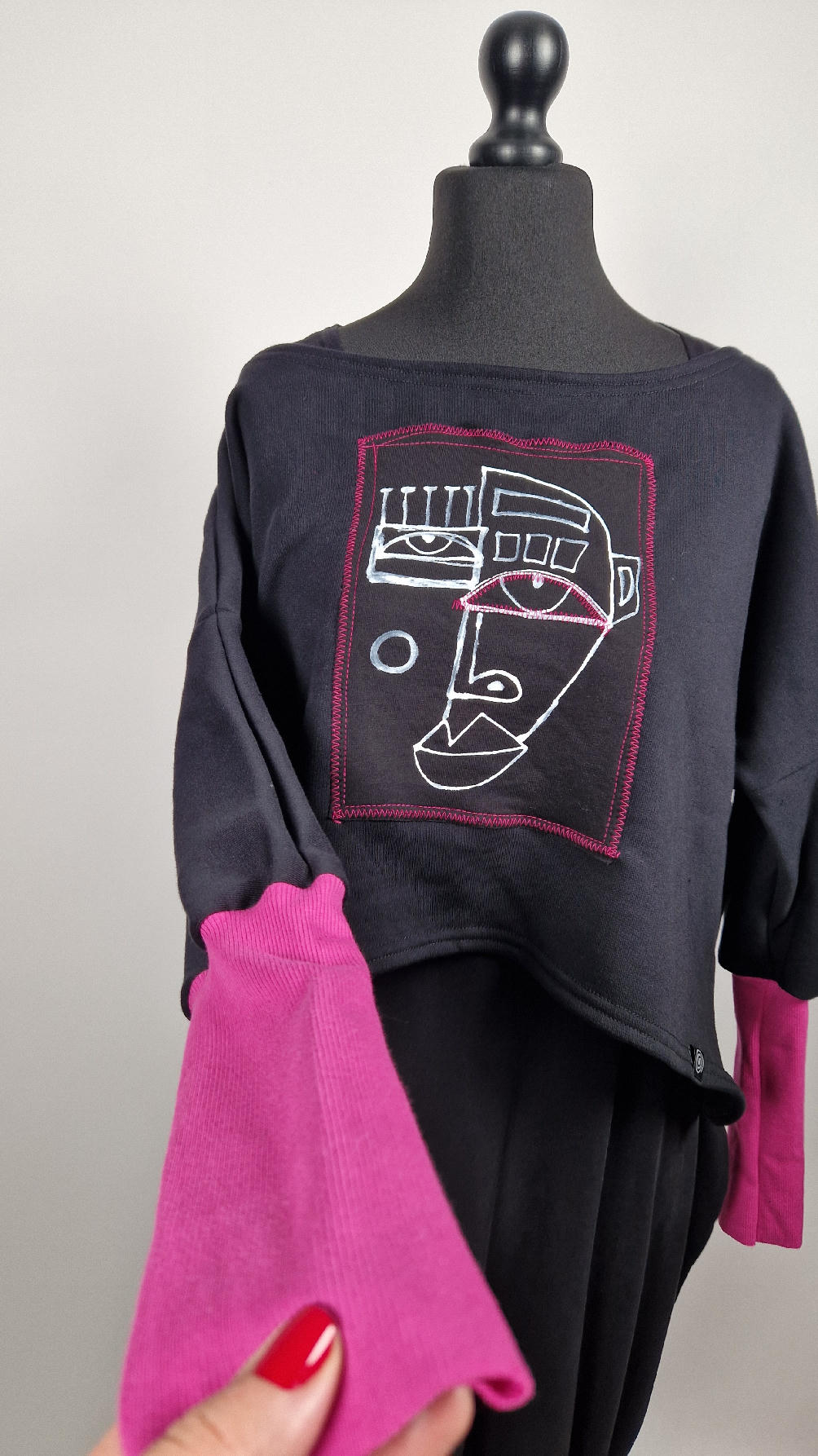 Krótka, ręcznie malowana i poprzeszywana kontrastową nitką, czarna, luźna w biuście bluzka typu NIETOPERZ, ale taki niewielki….bluzka uszyta z wysokiej jakości bawełny z pętelką, z długalaśnymi , elastycznymi , różowymi mankietami … prosta, bez kieszeni – tak specjalnie, żeby nic nie odstawało ale z dużym dekoltem typu ,,łódka”, który możesz opuścić na jedno ramię, lub nosić symetrycznie…Każdy,,portret” jest namalowany ręcznie przeze mnie, na czarnej bawełnie , następnie przyszyty do bluzki