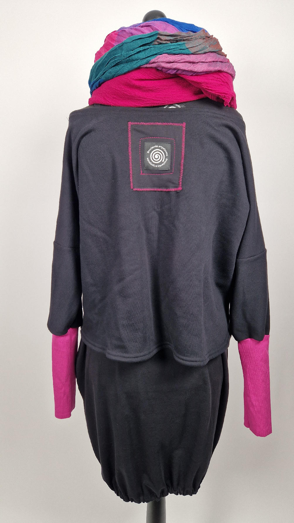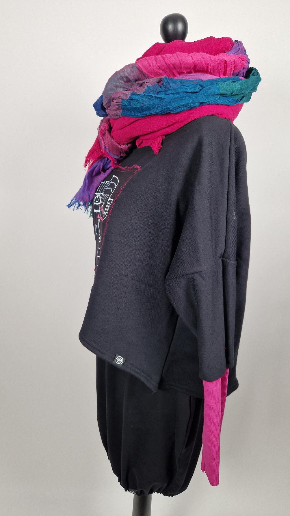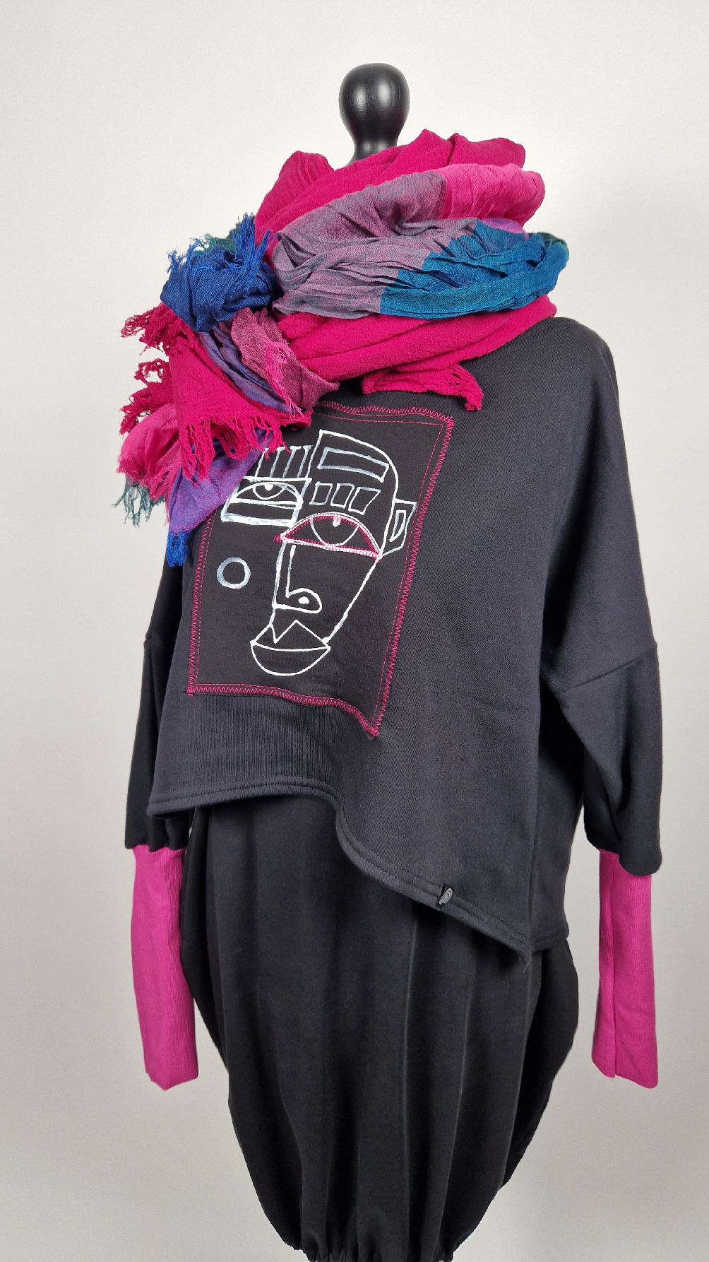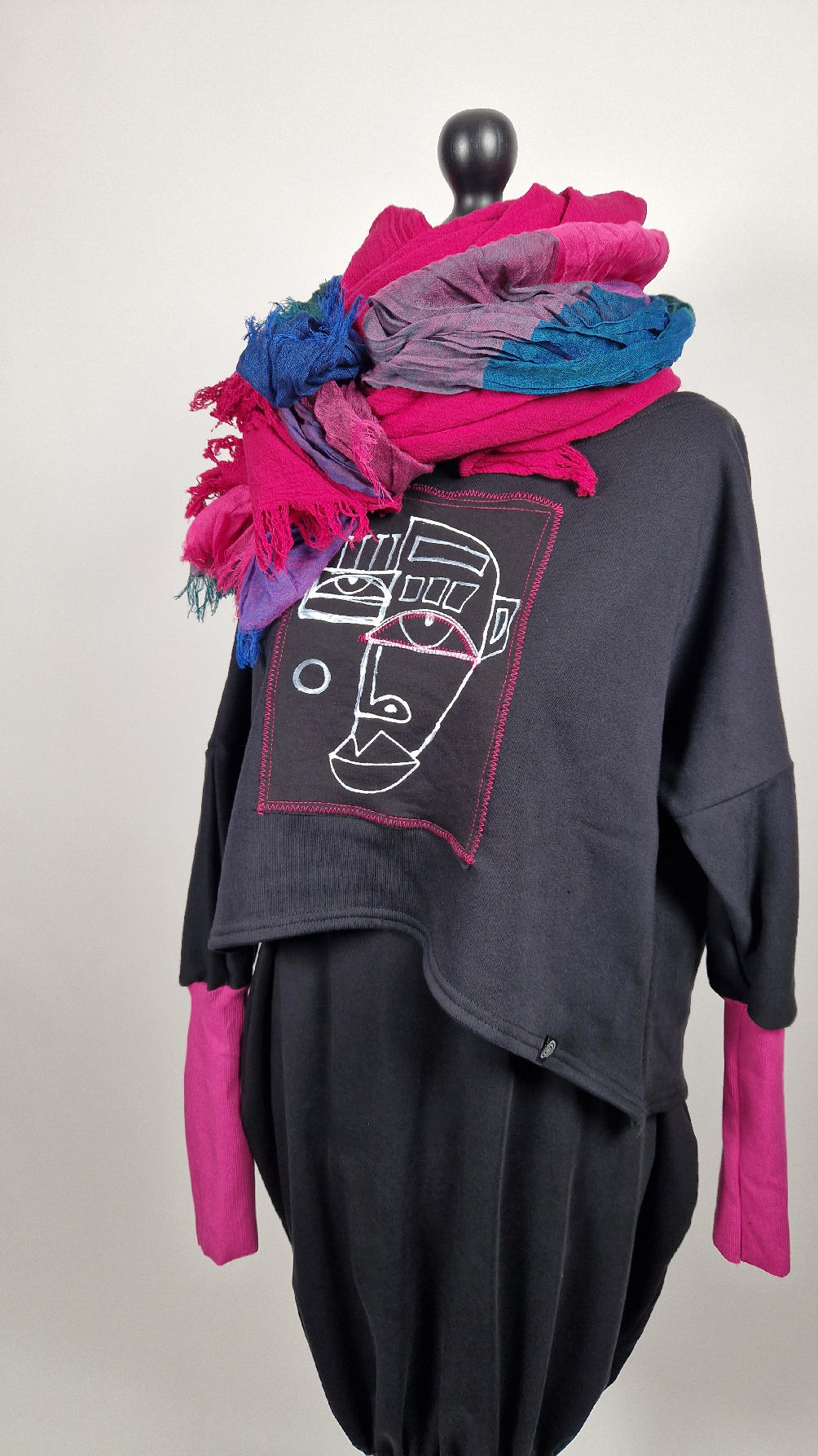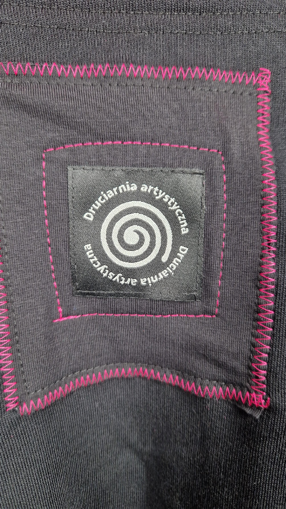 Krótka, ręcznie malowana i poprzeszywana kontrastową nitką, czarna, luźna w biuście bluzka typu NIETOPERZ, ale taki niewielki….bluzka uszyta z wysokiej jakości bawełny z pętelką, z długalaśnymi , elastycznymi , różowymi mankietami … prosta, bez kieszeni – tak specjalnie, żeby nic nie odstawało ale z dużym dekoltem typu ,,łódka”, który możesz opuścić na jedno ramię, lub nosić symetrycznie…Każdy,,portret” jest namalowany ręcznie przeze mnie, na czarnej bawełnie , następnie przyszyty do bluzki