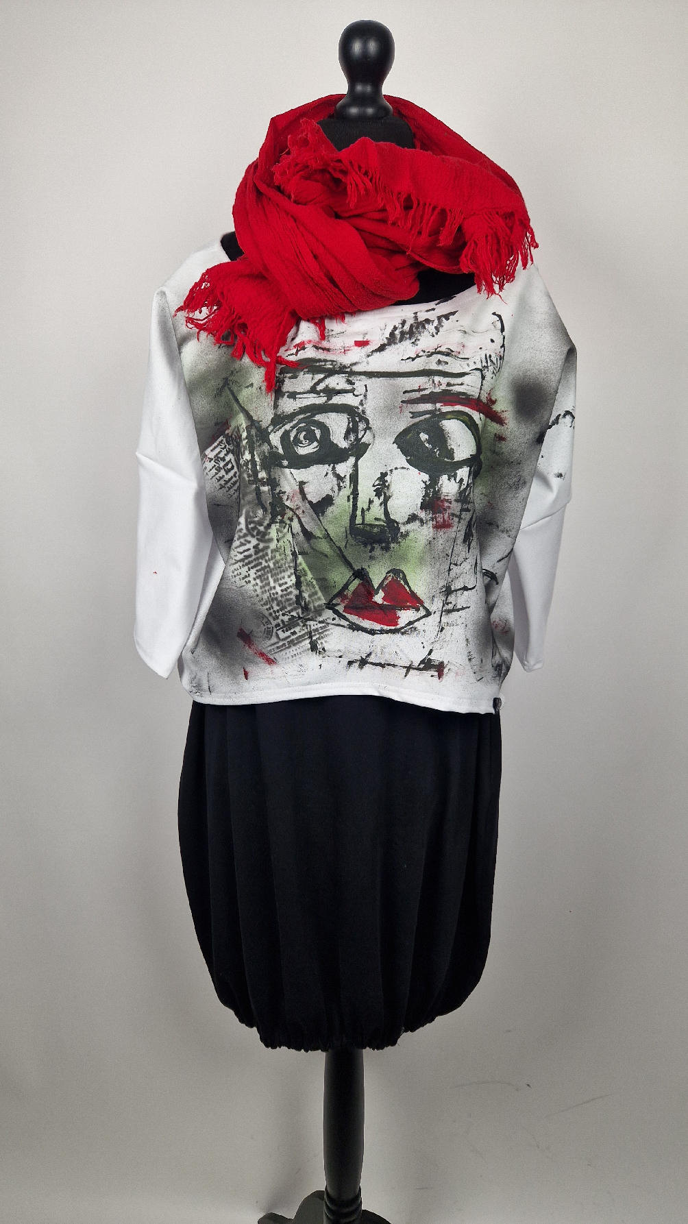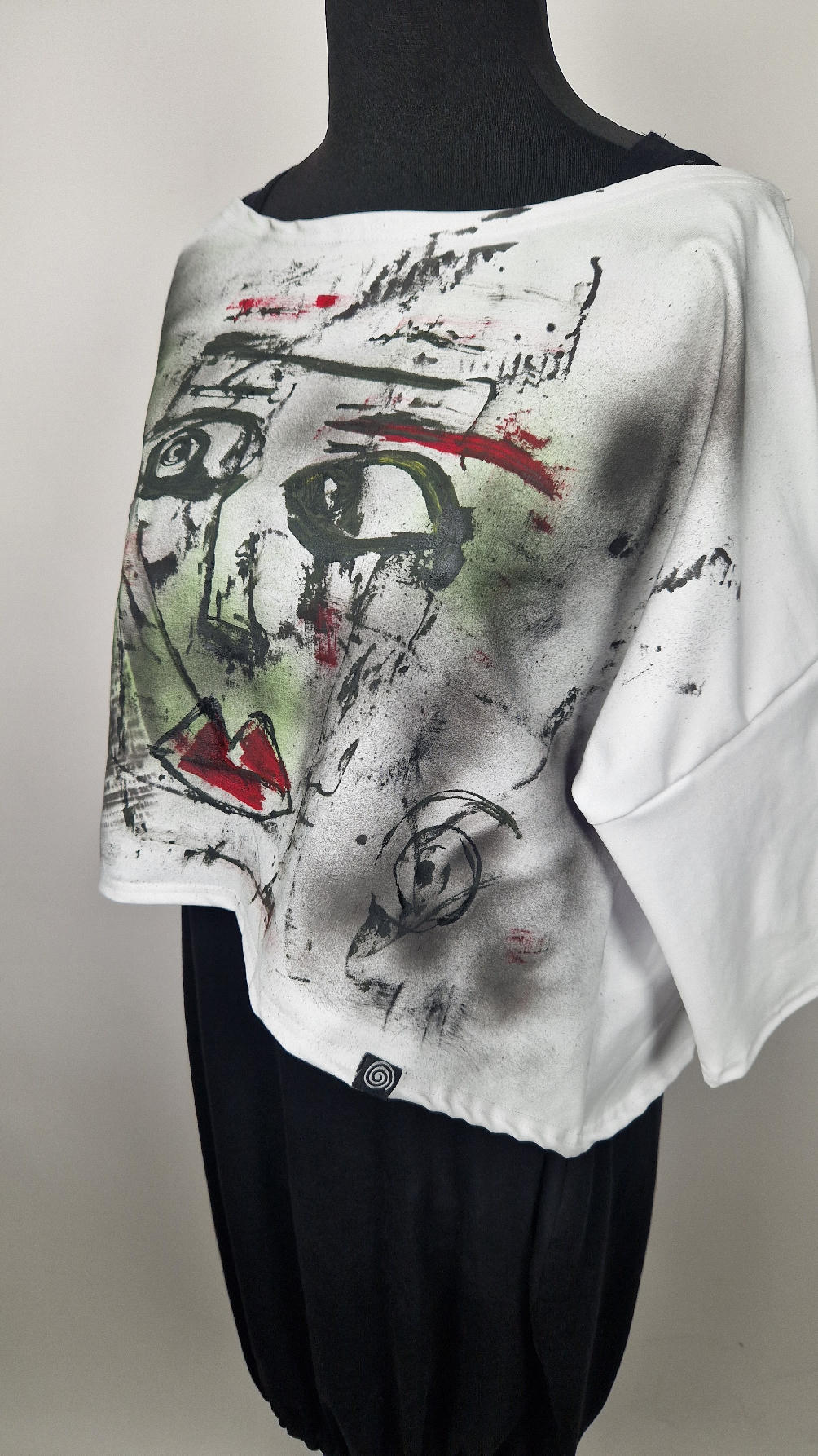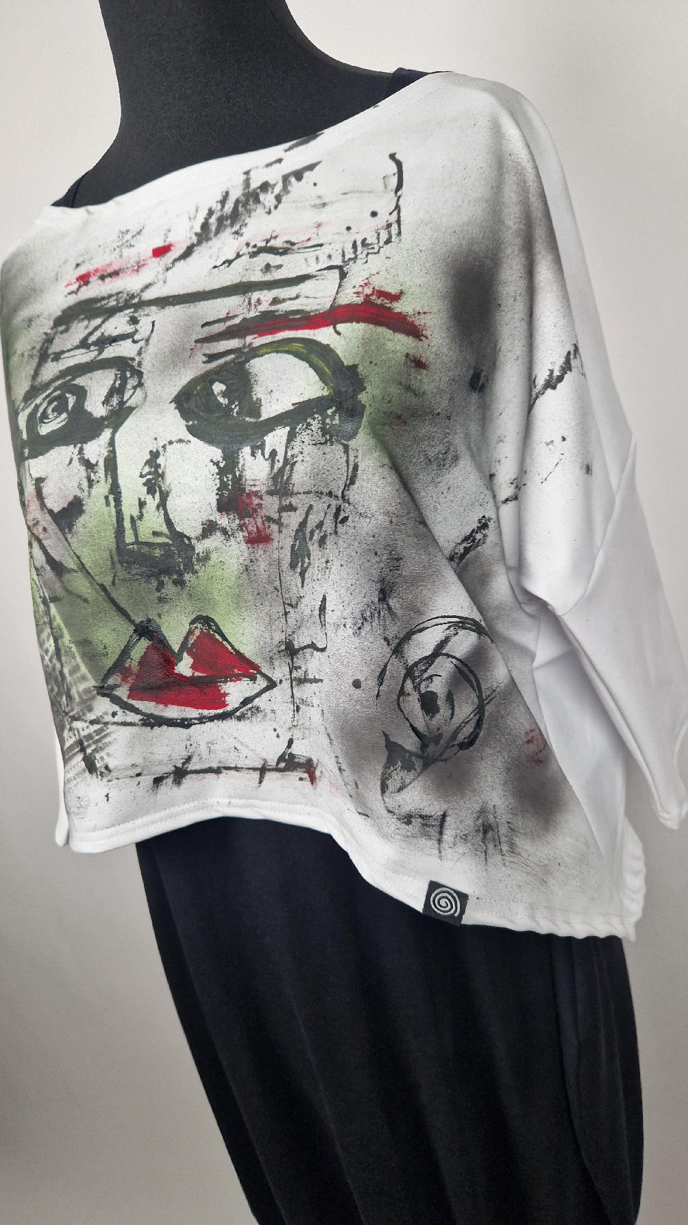 Bluzka uszyta z białej, miękkiej wysokiej jakości bawełny z pętelką… lekko rozszerzana do dołu, krótsza z przodu, ciut dłuższa z tyłu , z rękawem 3/4, ręcznie malowana farbami, które się nie spierają , taką bluzkę będziesz mieć tylko TY !