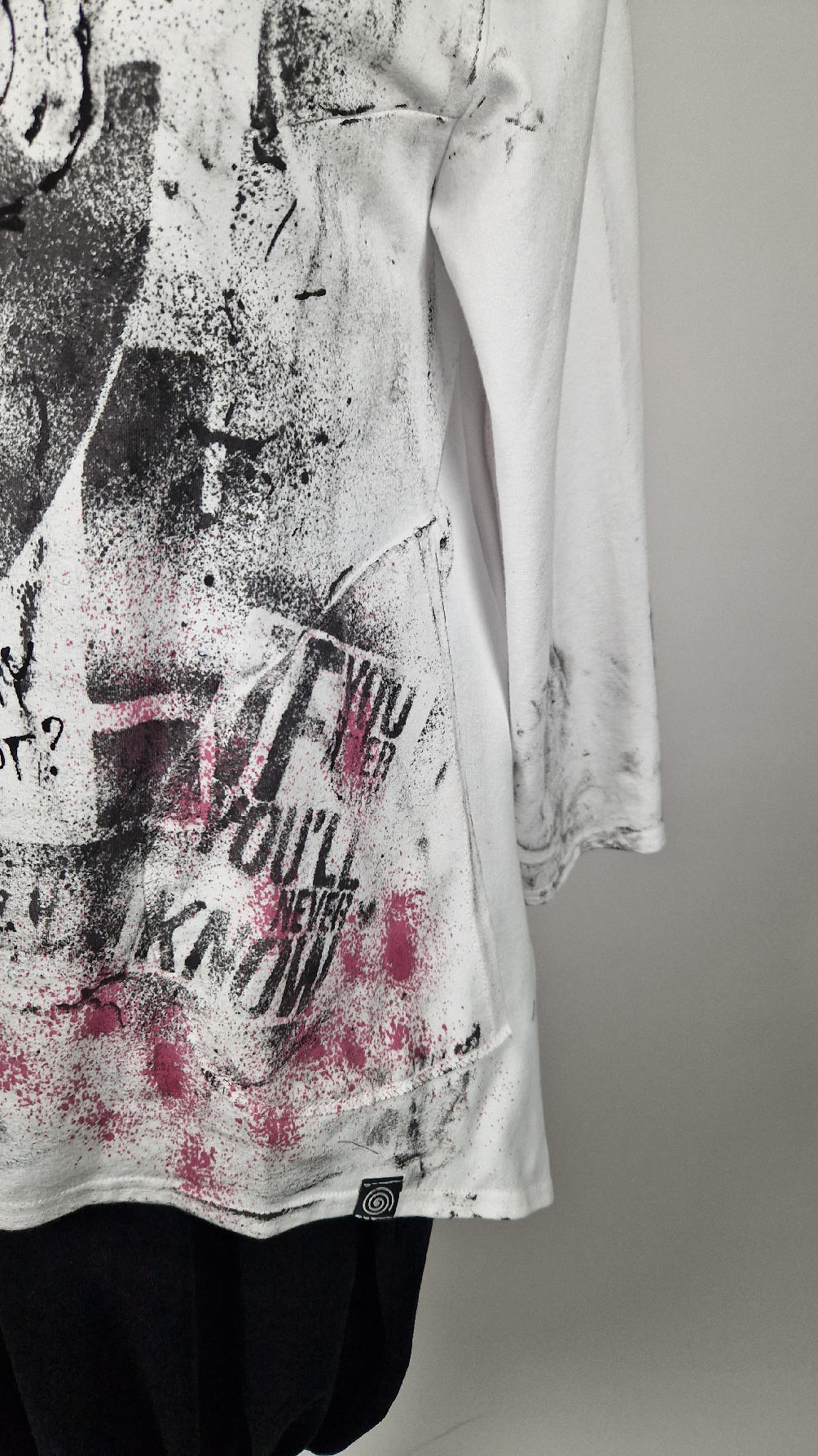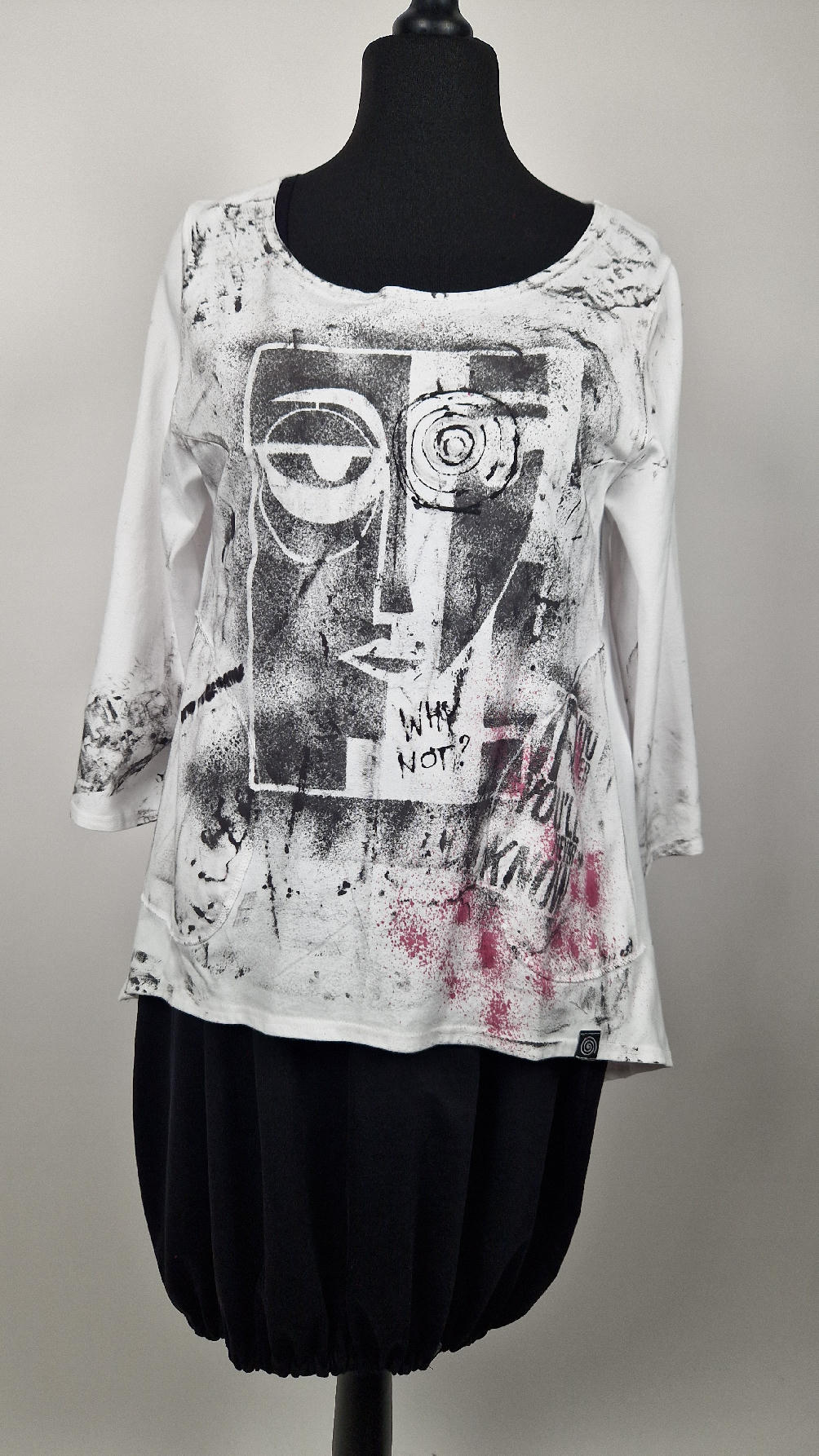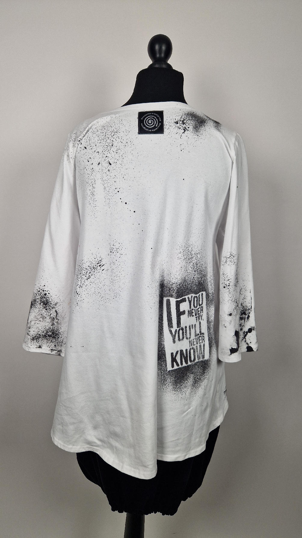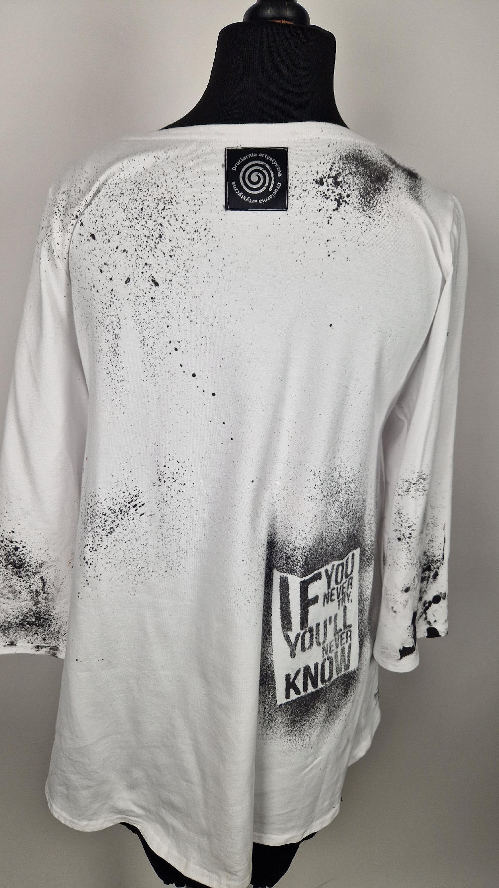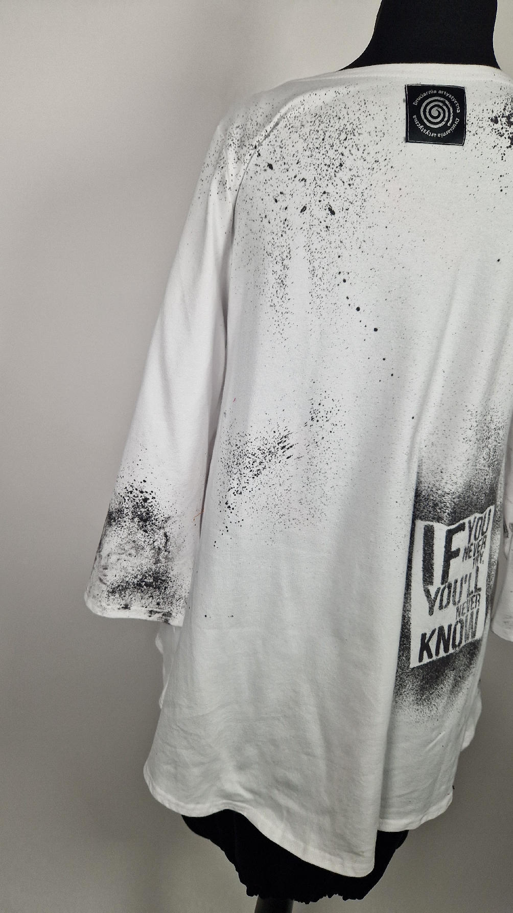 Bluzka uszyta z białej, miękkiej cienkiej, wysokiej jakości bawełny … lekko rozszerzana do dołu, krótsza z przodu, zdecydowanie dłuższa z tyłu , z rękawem 3/4, ręcznie malowana farbami, które się nie spierają , z dużymi kieszeniami taką bluzkę będziesz mieć tylko TY !
