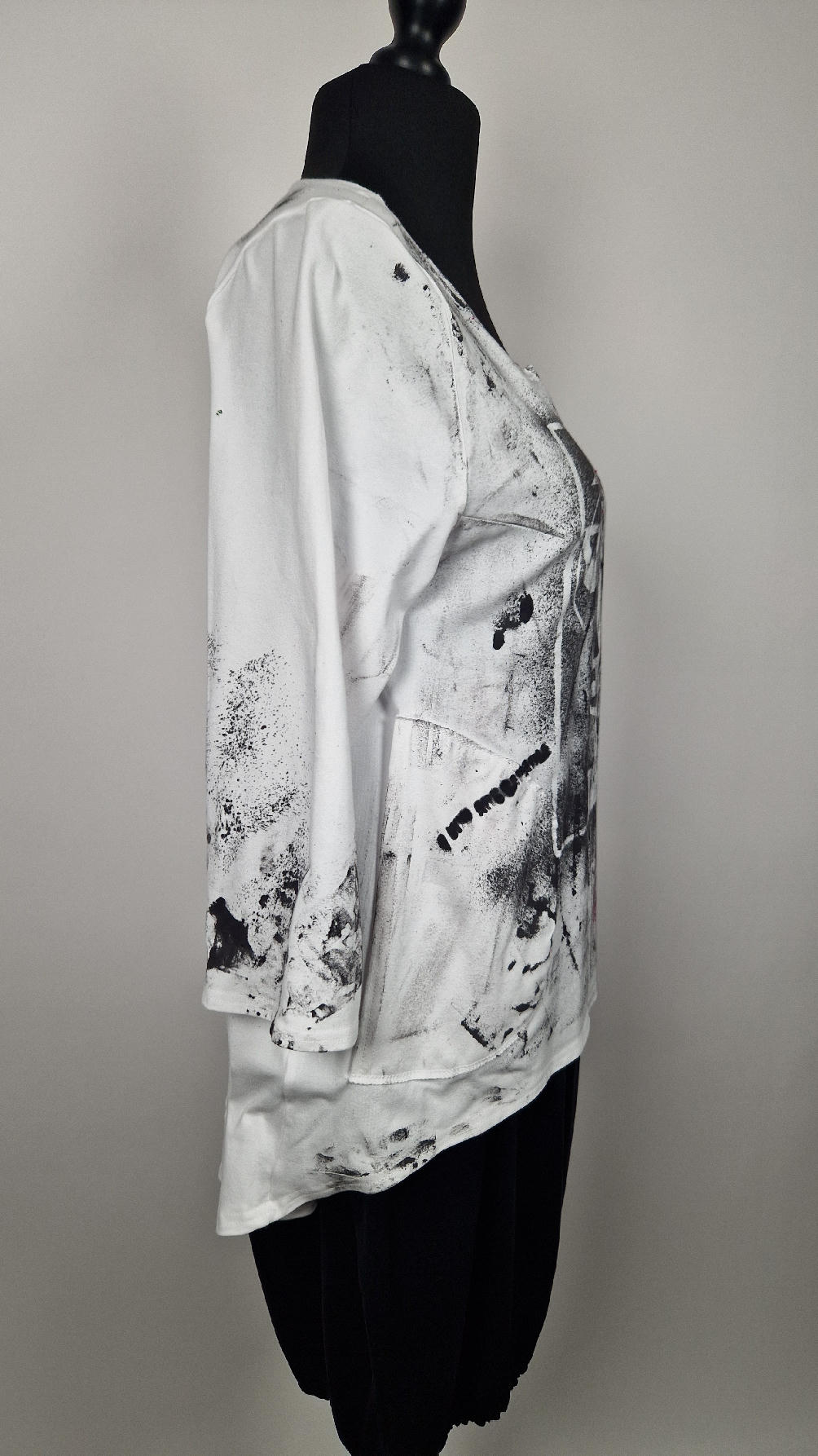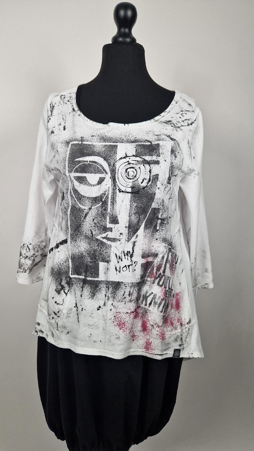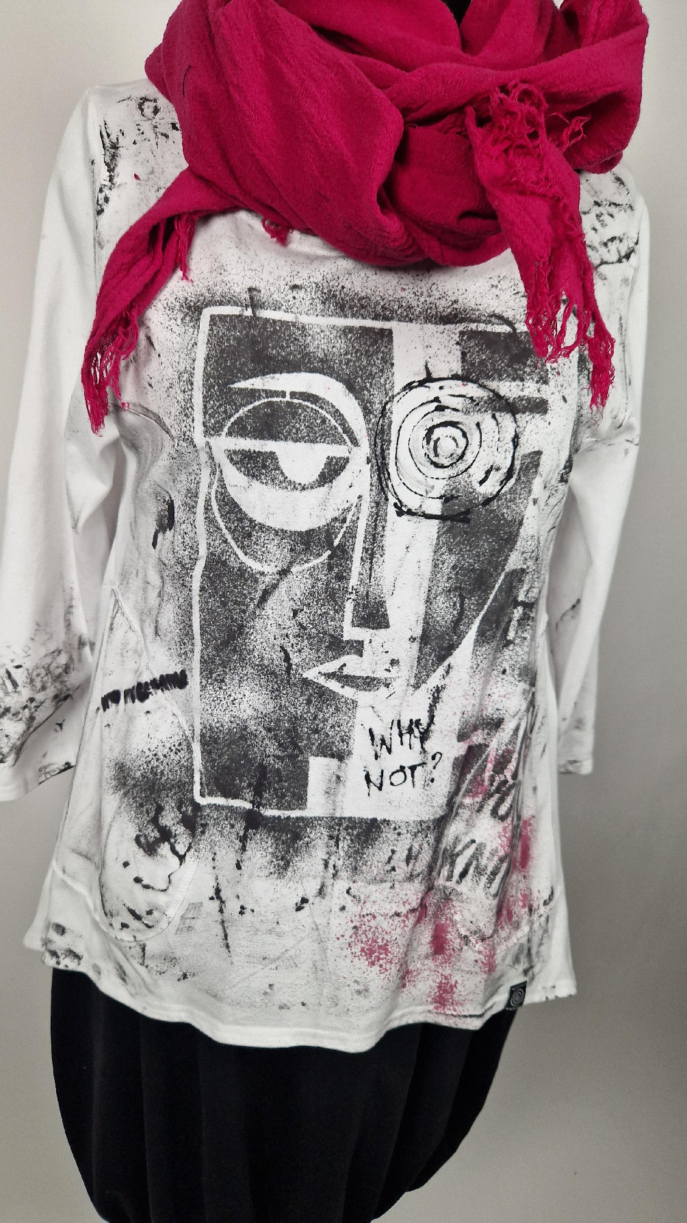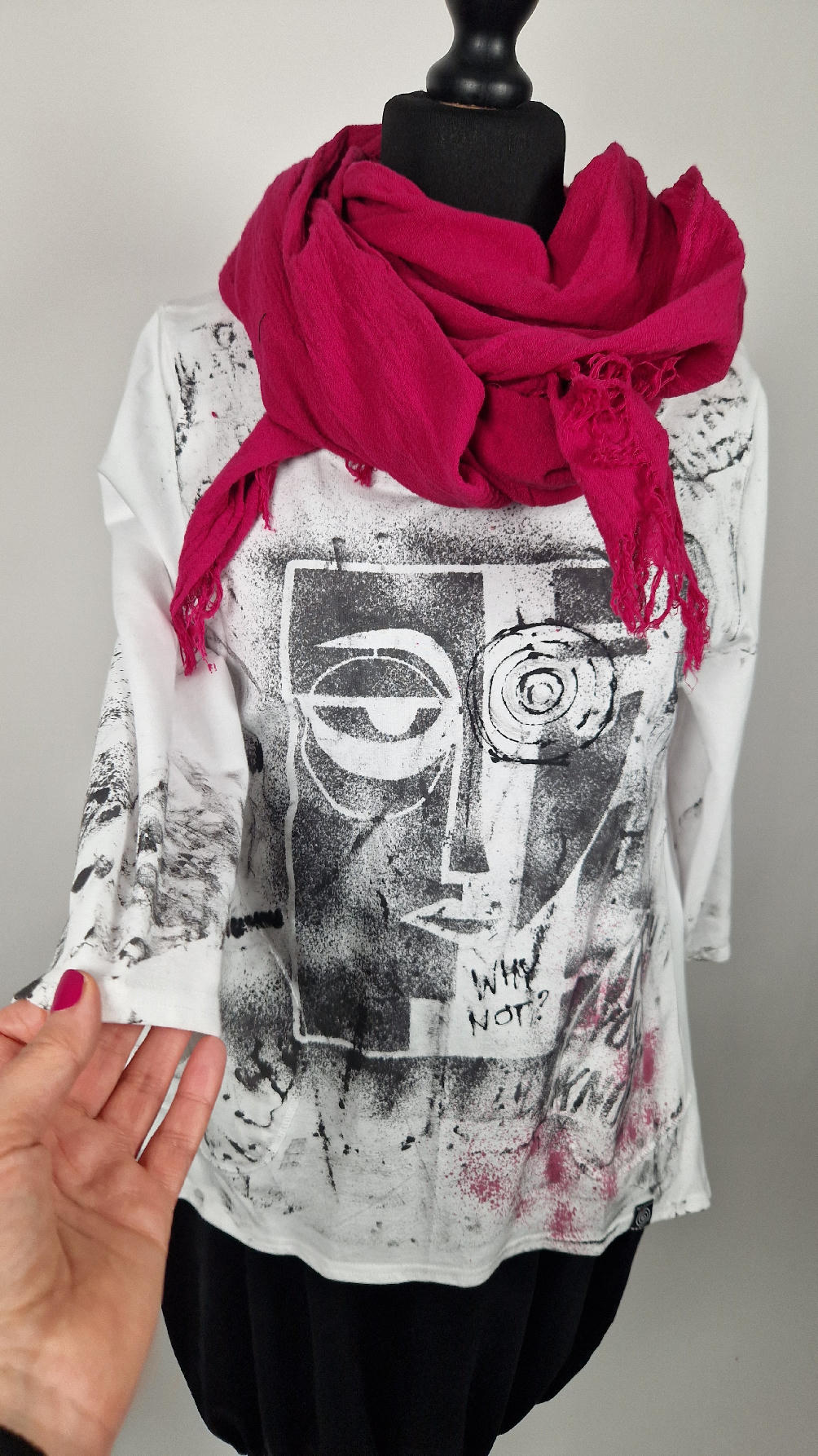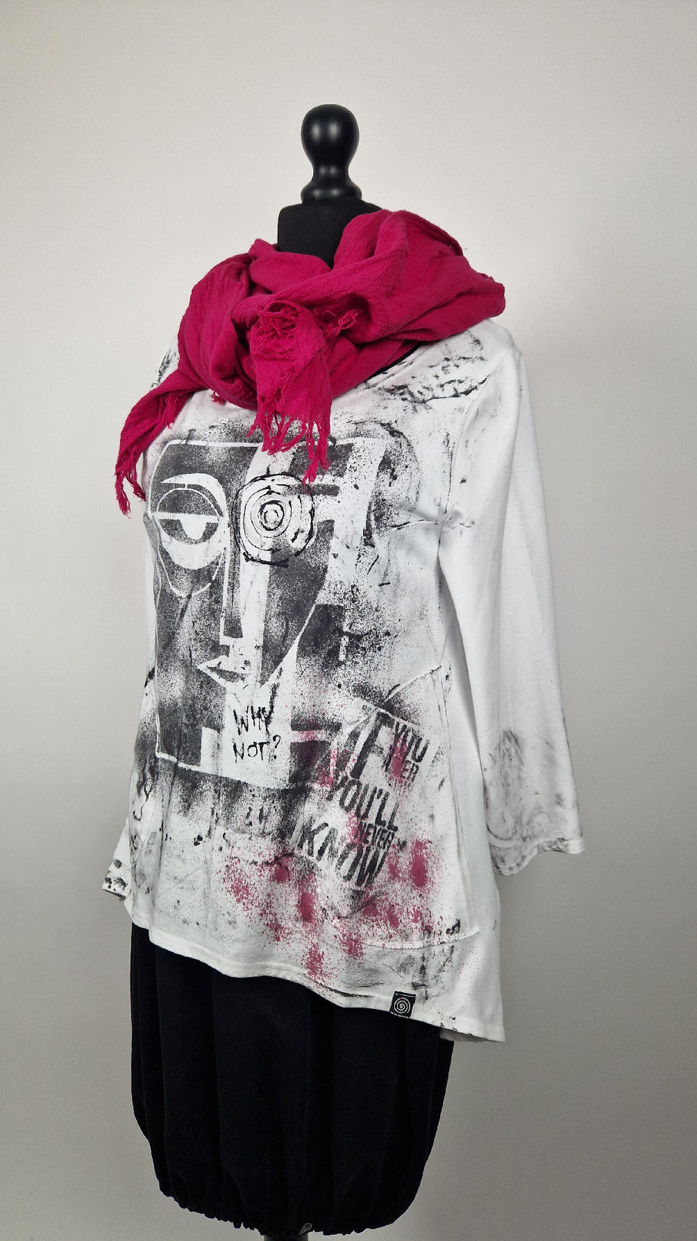 Bluzka uszyta z białej, miękkiej cienkiej, wysokiej jakości bawełny … lekko rozszerzana do dołu, krótsza z przodu, zdecydowanie dłuższa z tyłu , z rękawem 3/4, ręcznie malowana farbami, które się nie spierają , z dużymi kieszeniami taką bluzkę będziesz mieć tylko TY !