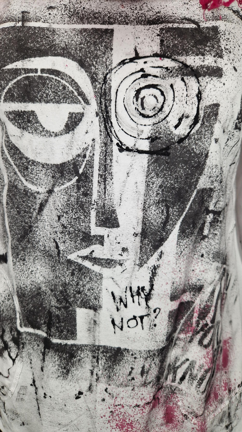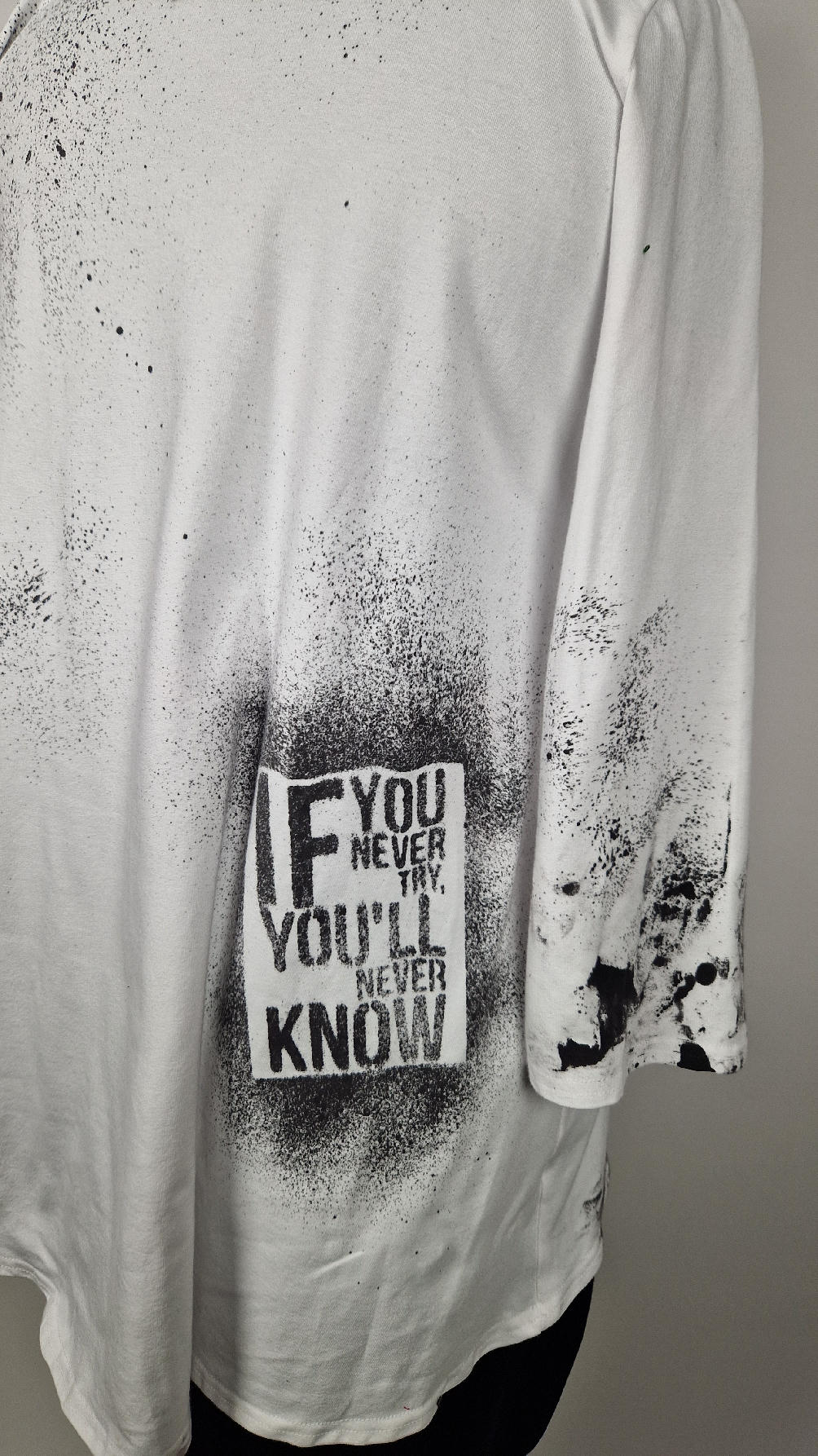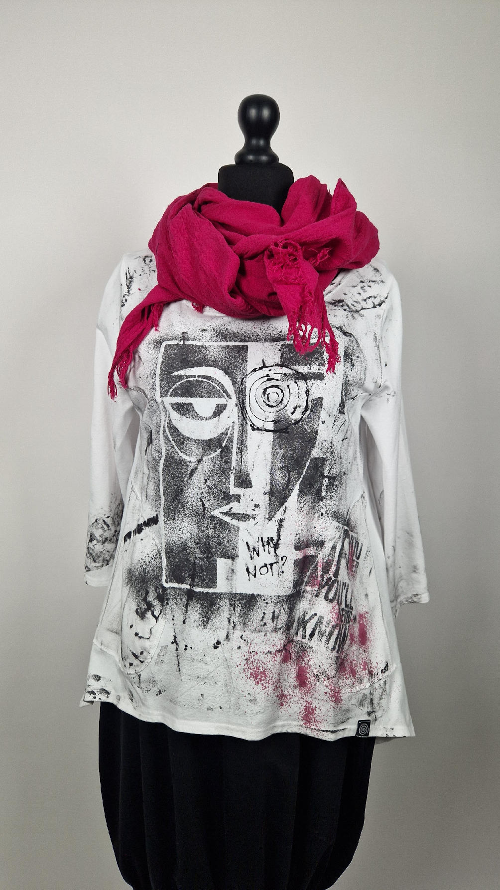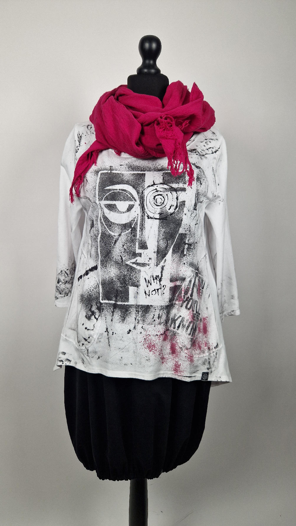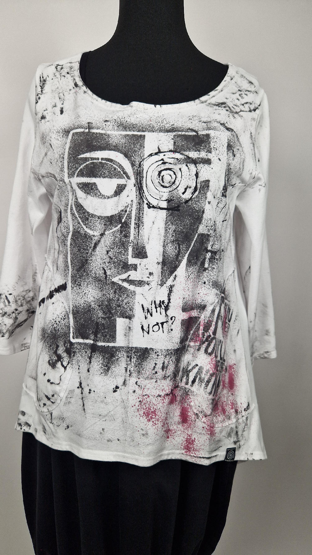 Bluzka uszyta z białej, miękkiej cienkiej, wysokiej jakości bawełny … lekko rozszerzana do dołu, krótsza z przodu, zdecydowanie dłuższa z tyłu , z rękawem 3/4, ręcznie malowana farbami, które się nie spierają , z dużymi kieszeniami taką bluzkę będziesz mieć tylko TY !