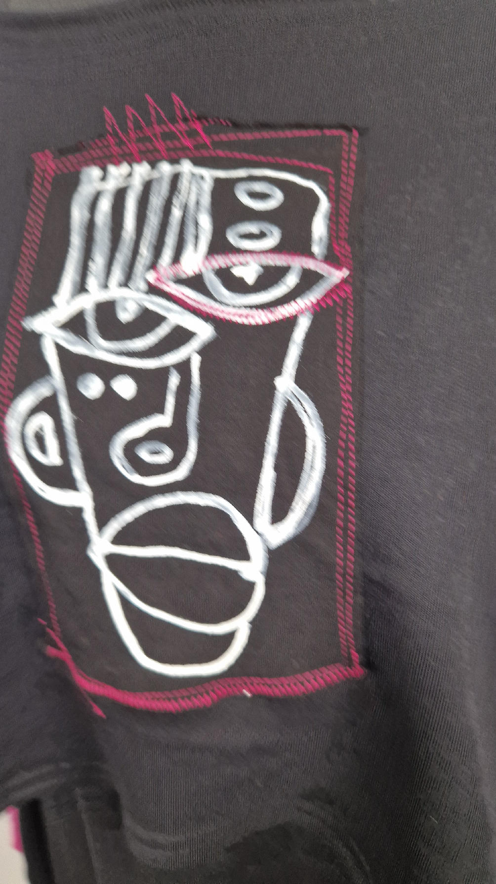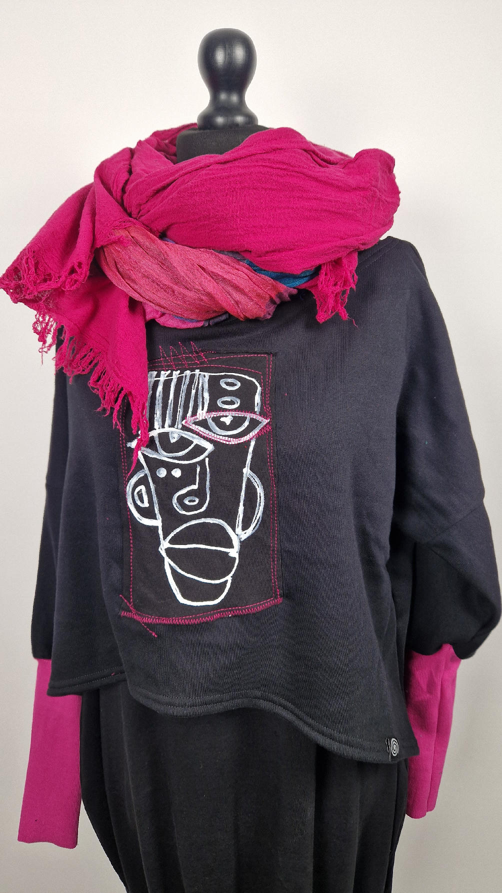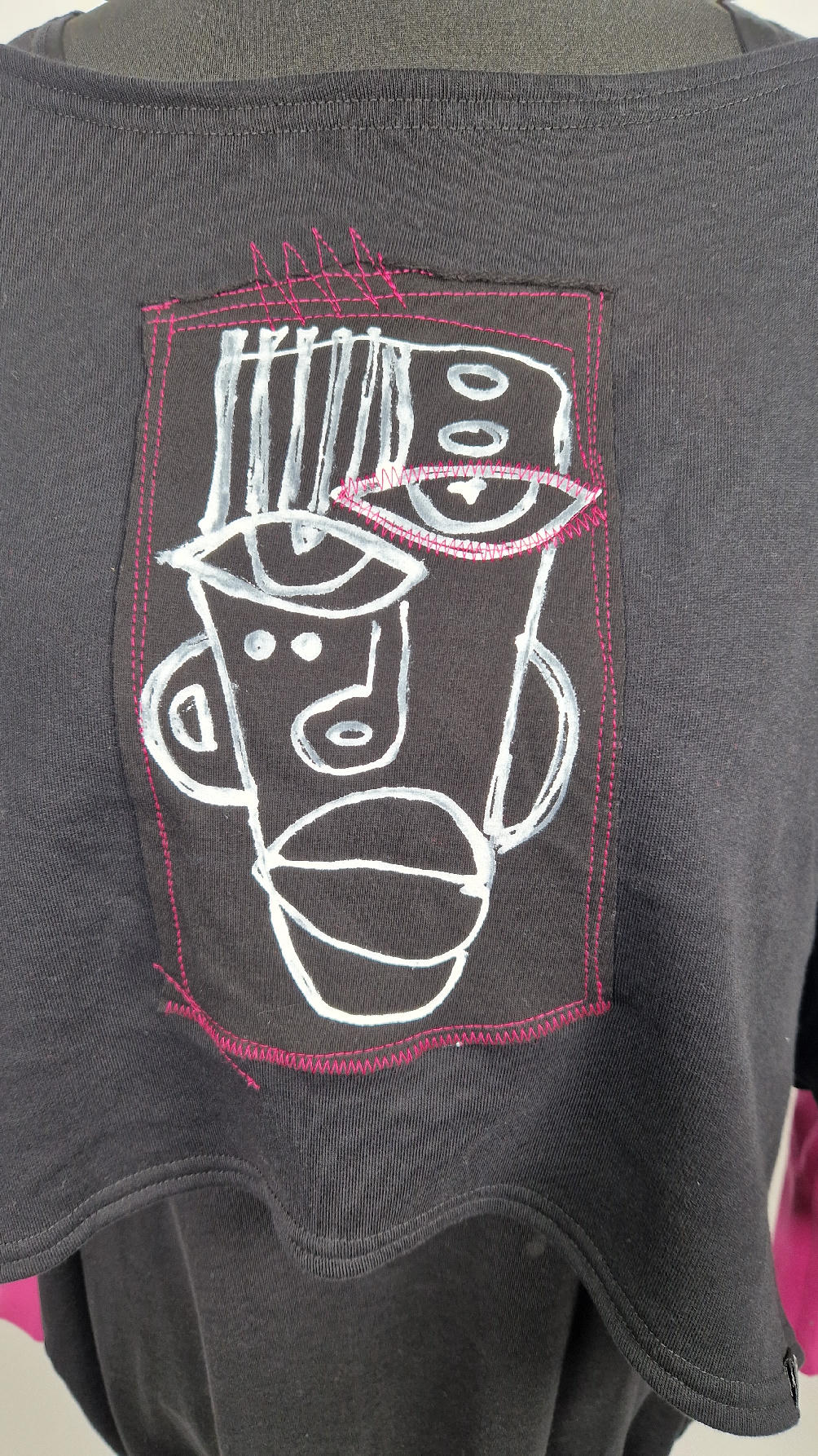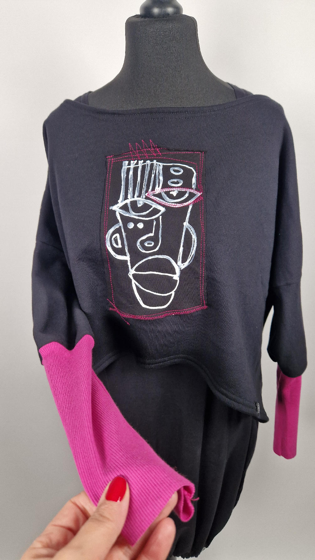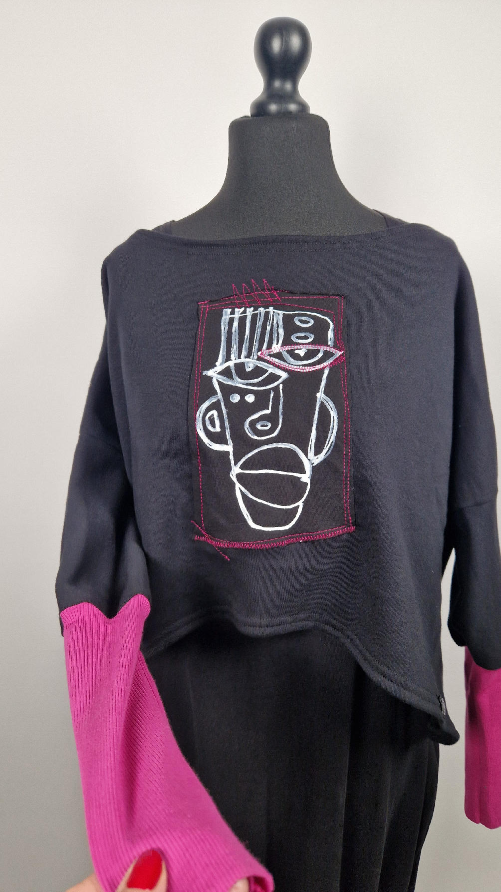 Krótka, ręcznie malowana  i poprzeszywana kontrastową nitką, czarna, luźna w biuście bluzka typu NIETOPERZ, ale taki niewielki….bluzka uszyta z wysokiej jakości bawełny z pętelką,  z długalaśnymi , elastycznymi , różowymi mankietami … prosta, bez kieszeni – tak specjalnie, żeby nic nie odstawało  ale z dużym dekoltem  typu ,,łódka”,  który możesz opuścić na jedno ramię, lub nosić symetrycznie…Każdy,,portret”  jest namalowany ręcznie  przeze mnie, na  czarnej bawełnie , następnie przyszyty do bluzki