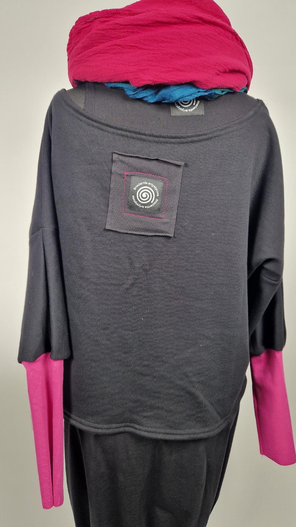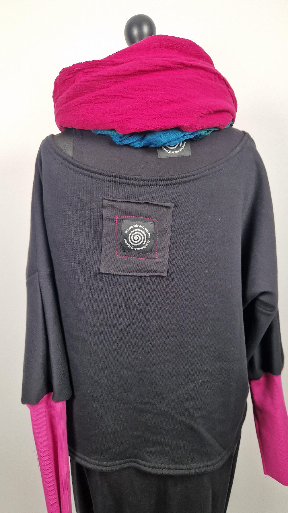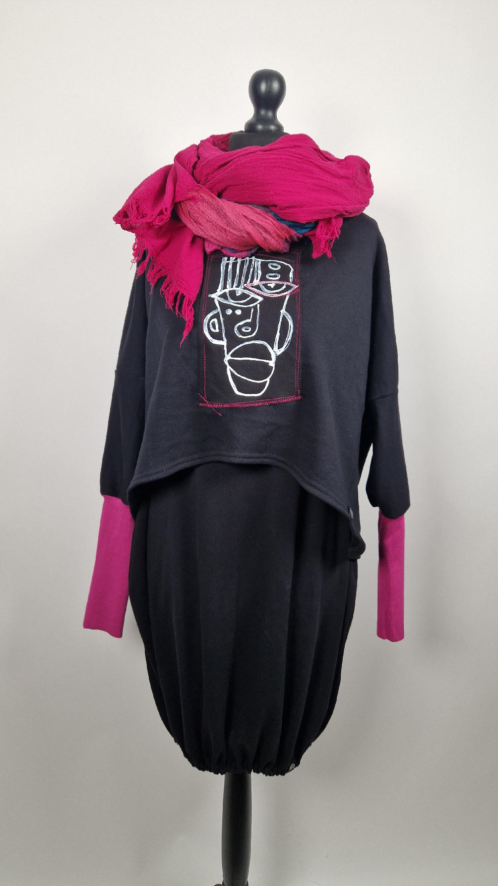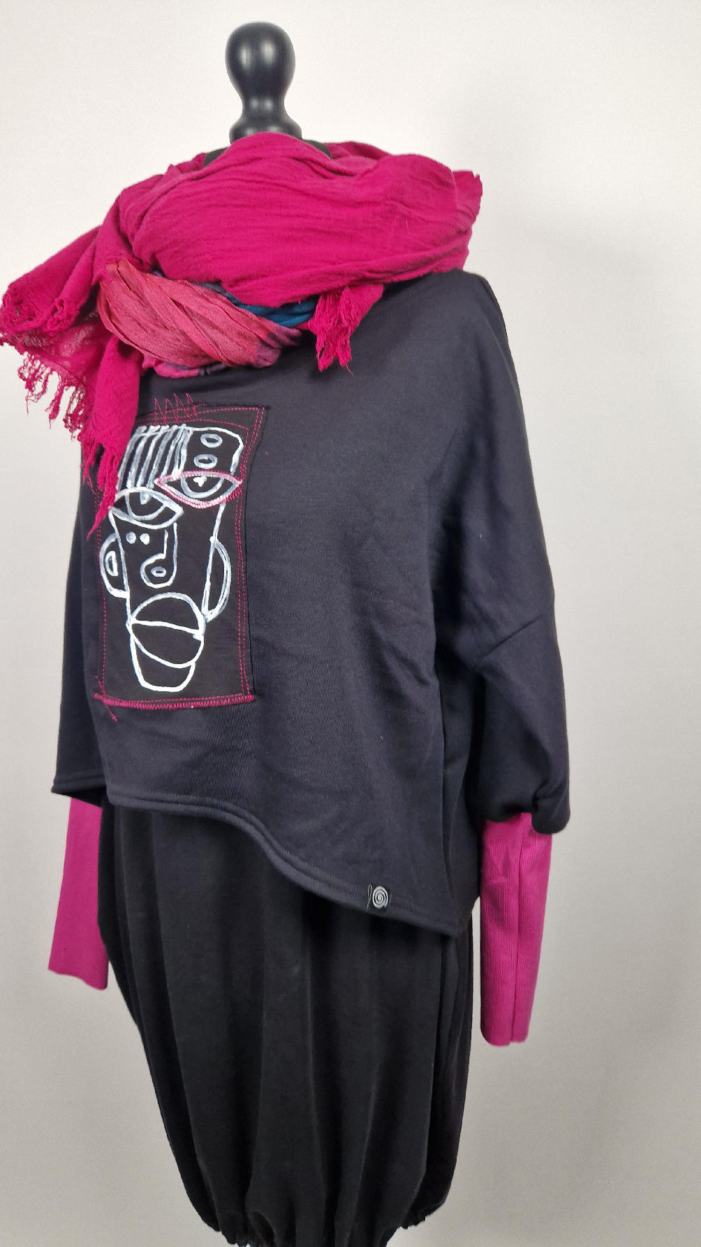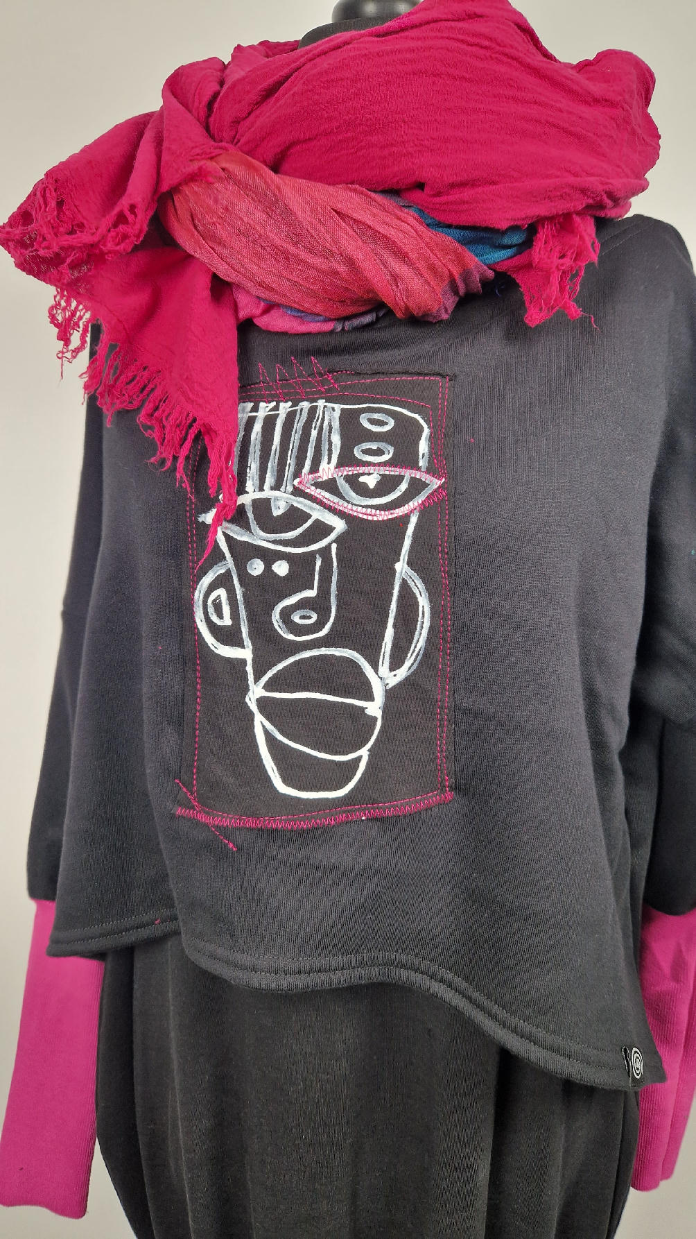 Krótka, ręcznie malowana  i poprzeszywana kontrastową nitką, czarna, luźna w biuście bluzka typu NIETOPERZ, ale taki niewielki….bluzka uszyta z wysokiej jakości bawełny z pętelką,  z długalaśnymi , elastycznymi , różowymi mankietami … prosta, bez kieszeni – tak specjalnie, żeby nic nie odstawało  ale z dużym dekoltem  typu ,,łódka”,  który możesz opuścić na jedno ramię, lub nosić symetrycznie…Każdy,,portret”  jest namalowany ręcznie  przeze mnie, na  czarnej bawełnie , następnie przyszyty do bluzki