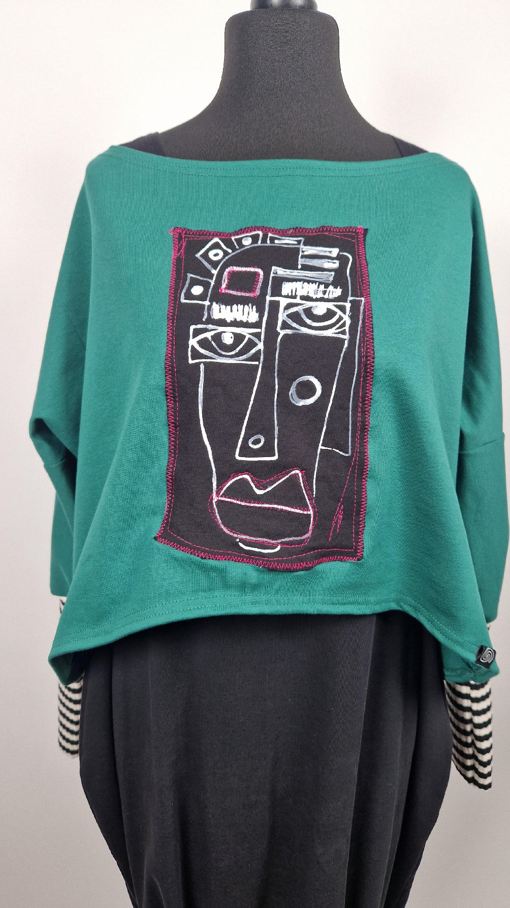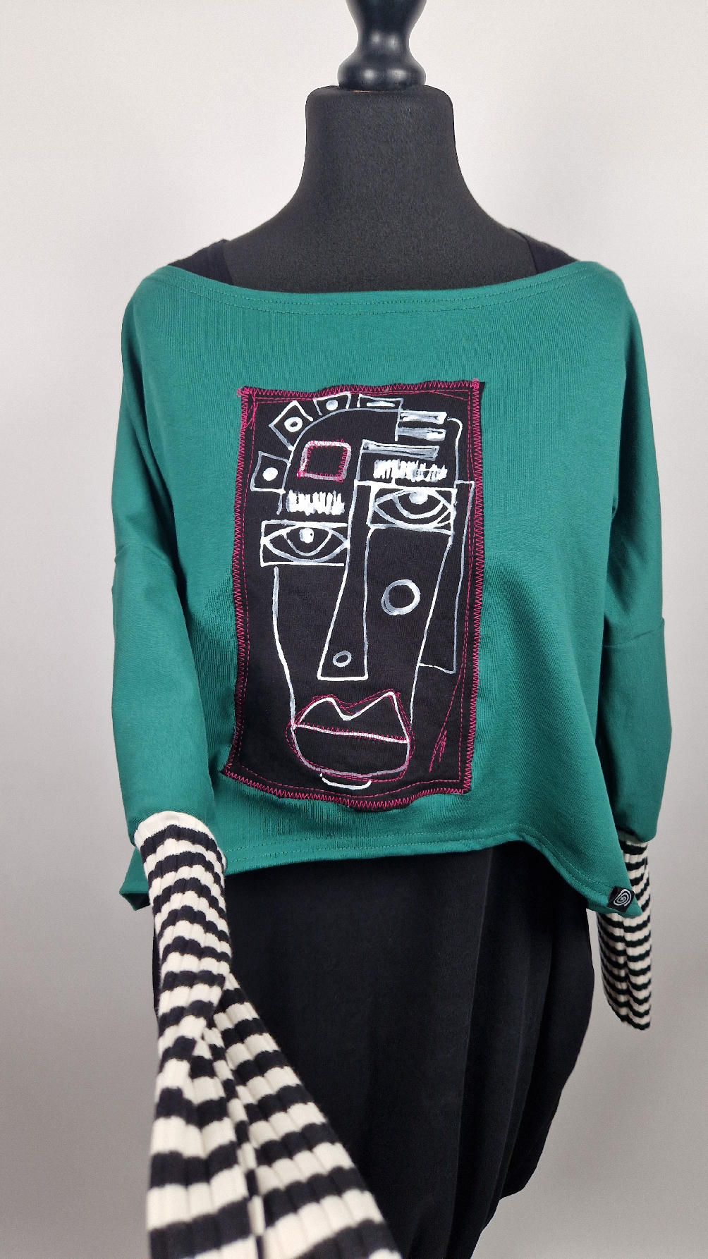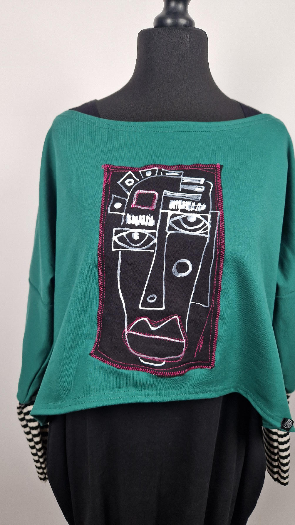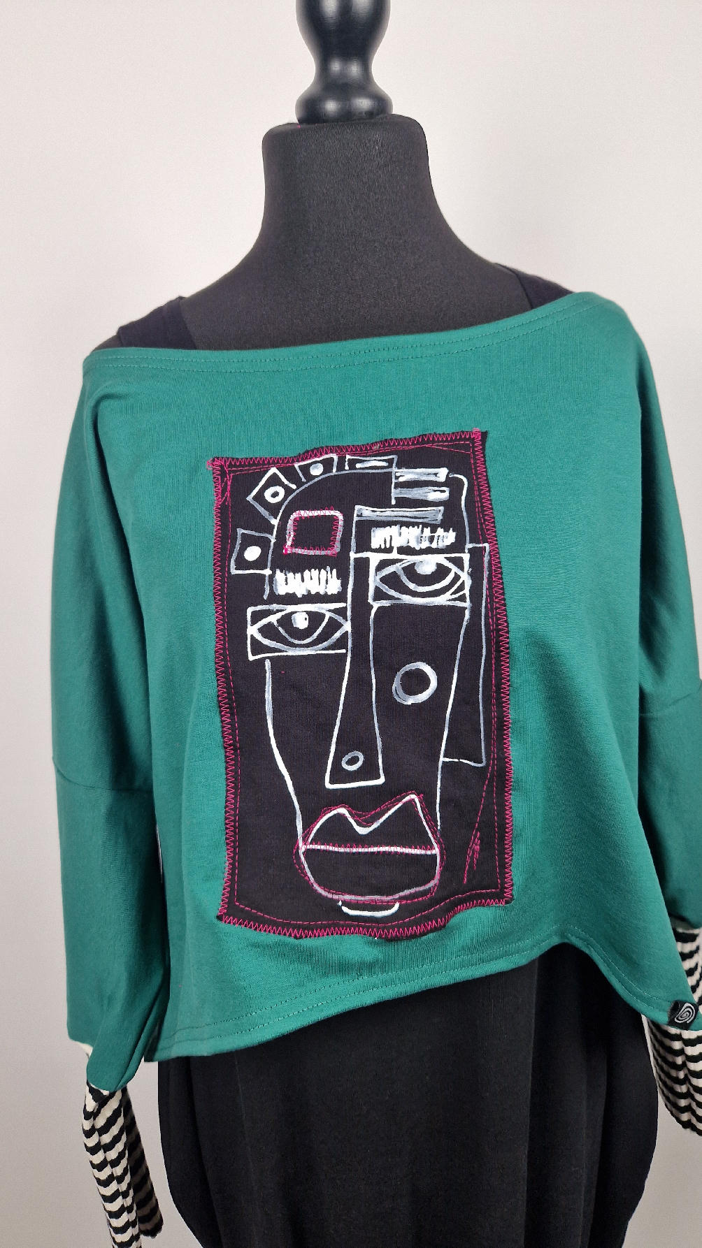 Krótka, ręcznie malowana i poprzeszywana kontrastową nitką, ciemno-zielona luźna w biuście bluzka typu NIETOPERZ, ale taki niewielki….bluzka uszyta z wysokiej jakości bawełny z pętelką, z długalaśnymi , elastycznymi , mankietami w paski… prosta, bez kieszeni – tak specjalnie, żeby nic nie odstawało ale z dużym dekoltem typu ,,łódka”, który możesz opuścić na jedno ramię, lub nosić symetrycznie…Każdy,,portret” jest namalowany ręcznie przeze mnie, na czarnej bawełnie , następnie przyszyty do bluzki