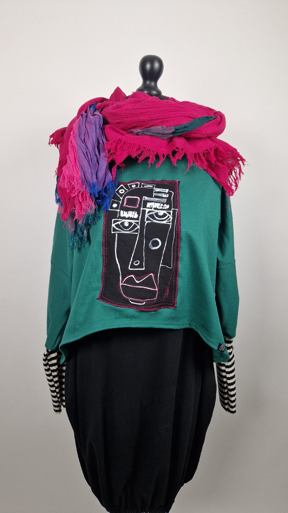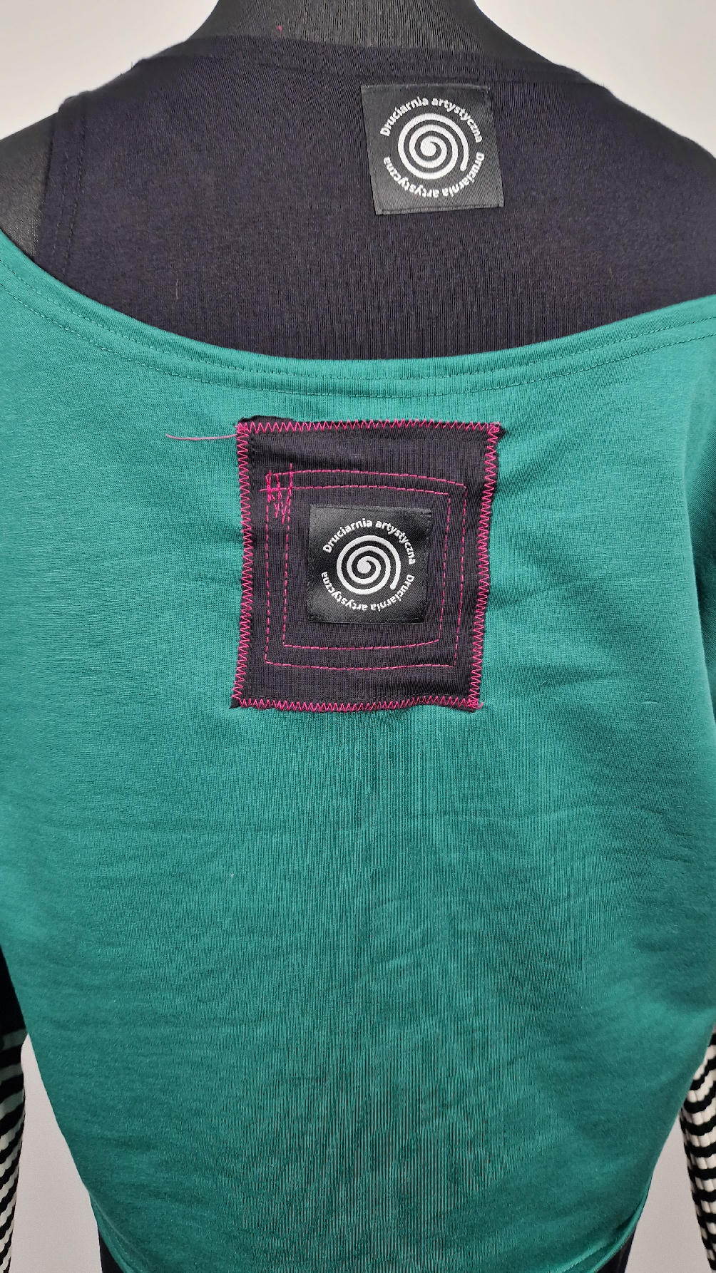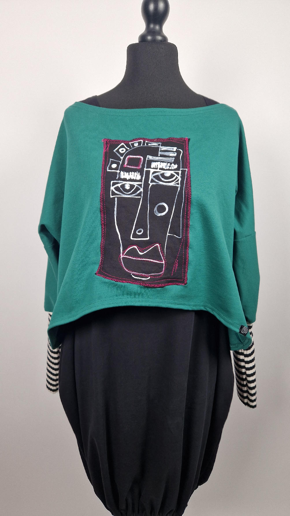 Krótka, ręcznie malowana i poprzeszywana kontrastową nitką, ciemno-zielona luźna w biuście bluzka typu NIETOPERZ, ale taki niewielki….bluzka uszyta z wysokiej jakości bawełny z pętelką, z długalaśnymi , elastycznymi , mankietami w paski… prosta, bez kieszeni – tak specjalnie, żeby nic nie odstawało ale z dużym dekoltem typu ,,łódka”, który możesz opuścić na jedno ramię, lub nosić symetrycznie…Każdy,,portret” jest namalowany ręcznie przeze mnie, na czarnej bawełnie , następnie przyszyty do bluzki