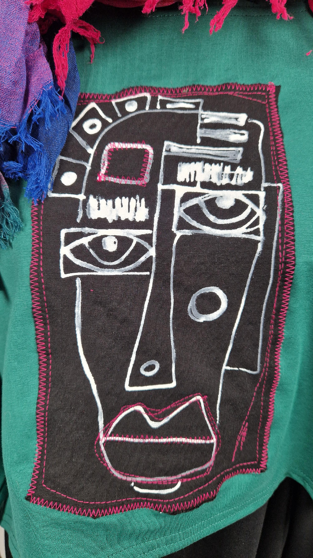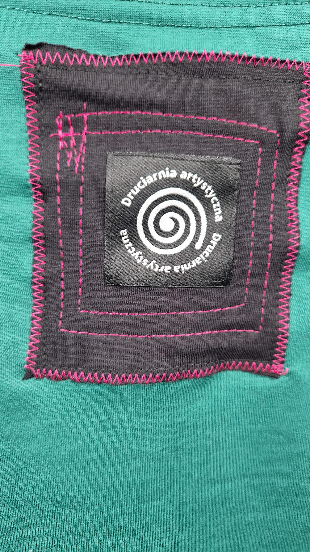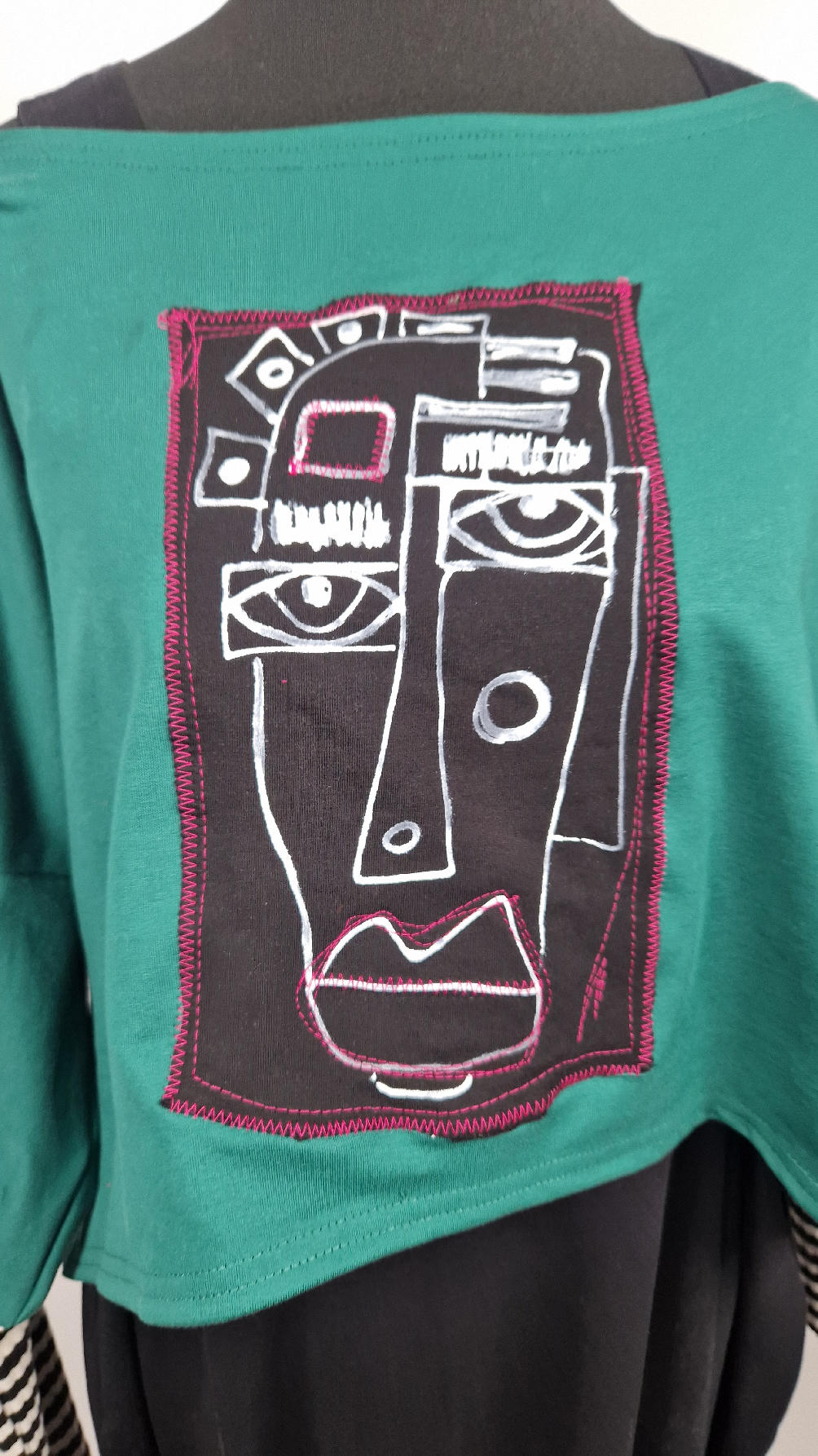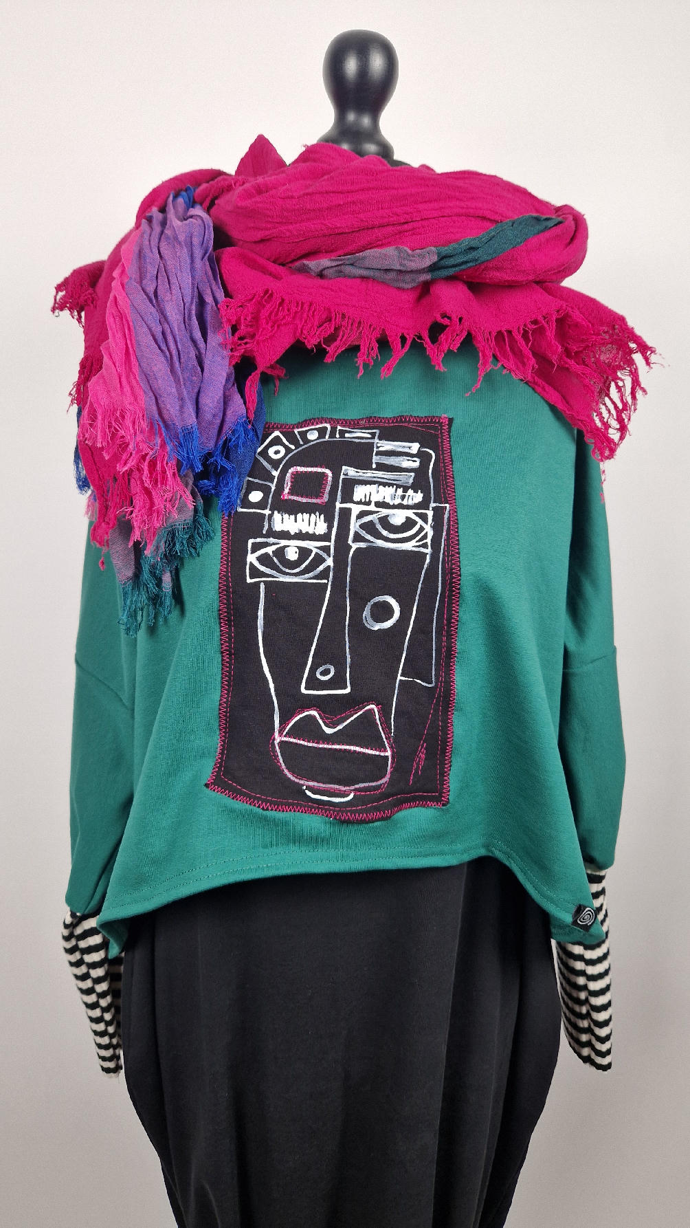 Krótka, ręcznie malowana i poprzeszywana kontrastową nitką, ciemno-zielona luźna w biuście bluzka typu NIETOPERZ, ale taki niewielki….bluzka uszyta z wysokiej jakości bawełny z pętelką, z długalaśnymi , elastycznymi , mankietami w paski… prosta, bez kieszeni – tak specjalnie, żeby nic nie odstawało ale z dużym dekoltem typu ,,łódka”, który możesz opuścić na jedno ramię, lub nosić symetrycznie…Każdy,,portret” jest namalowany ręcznie przeze mnie, na czarnej bawełnie , następnie przyszyty do bluzki
