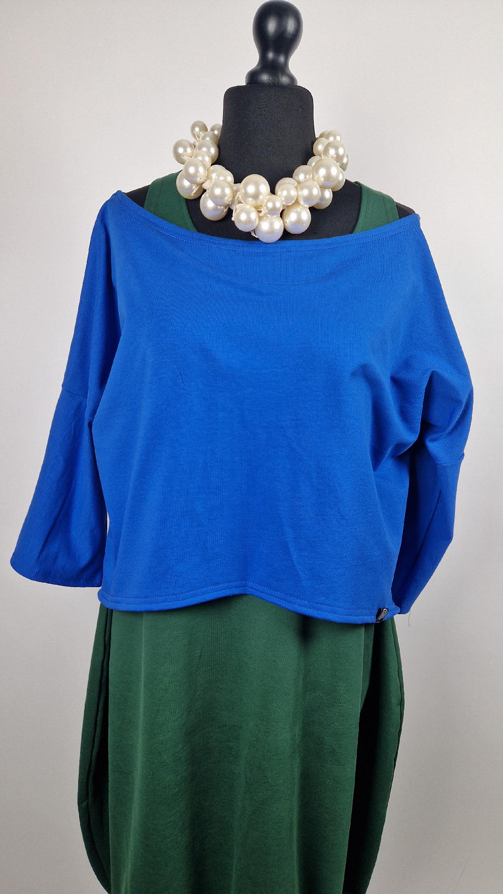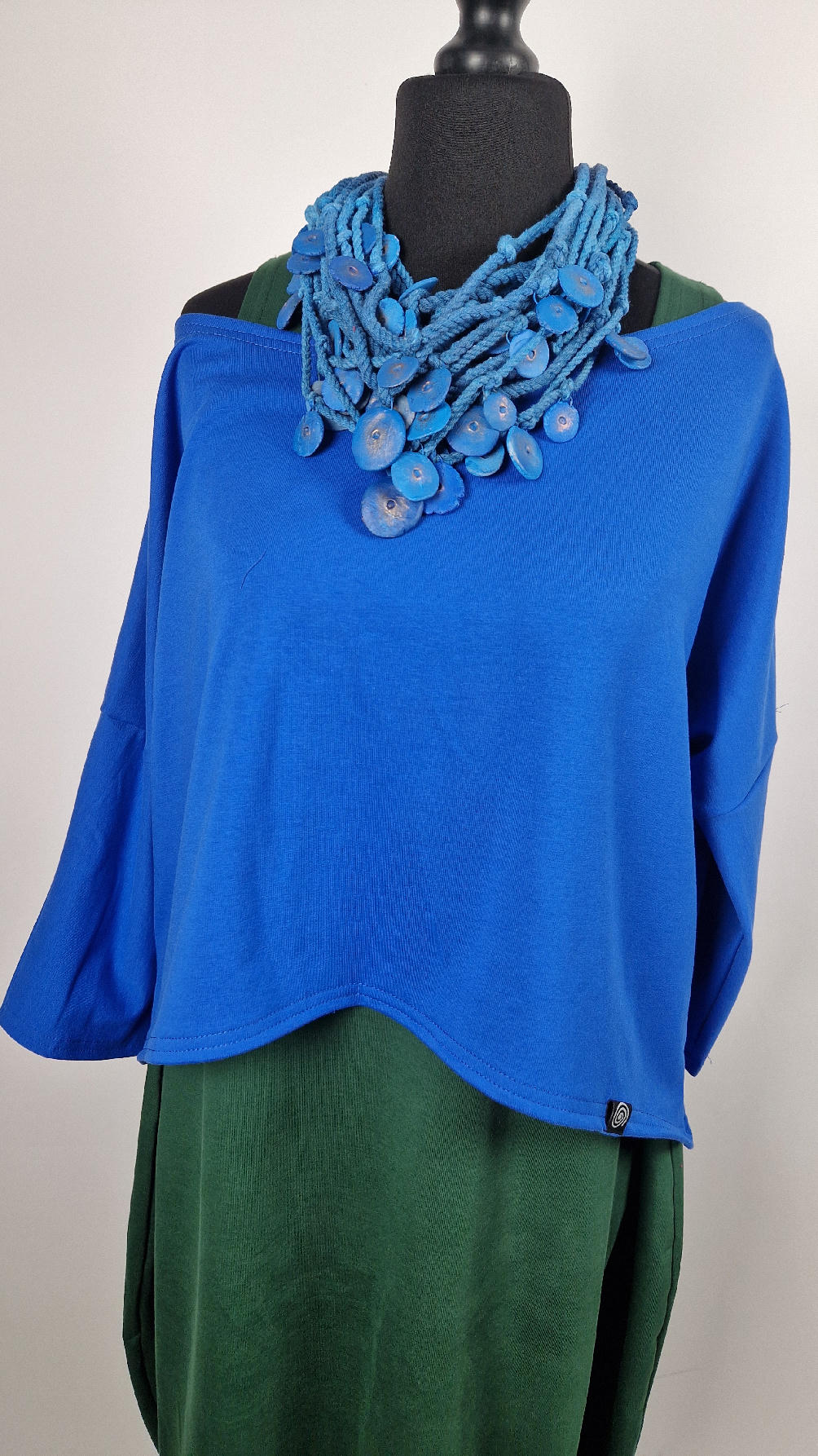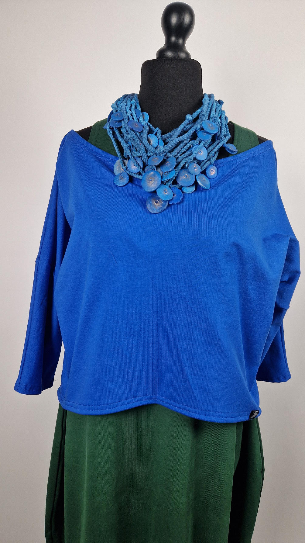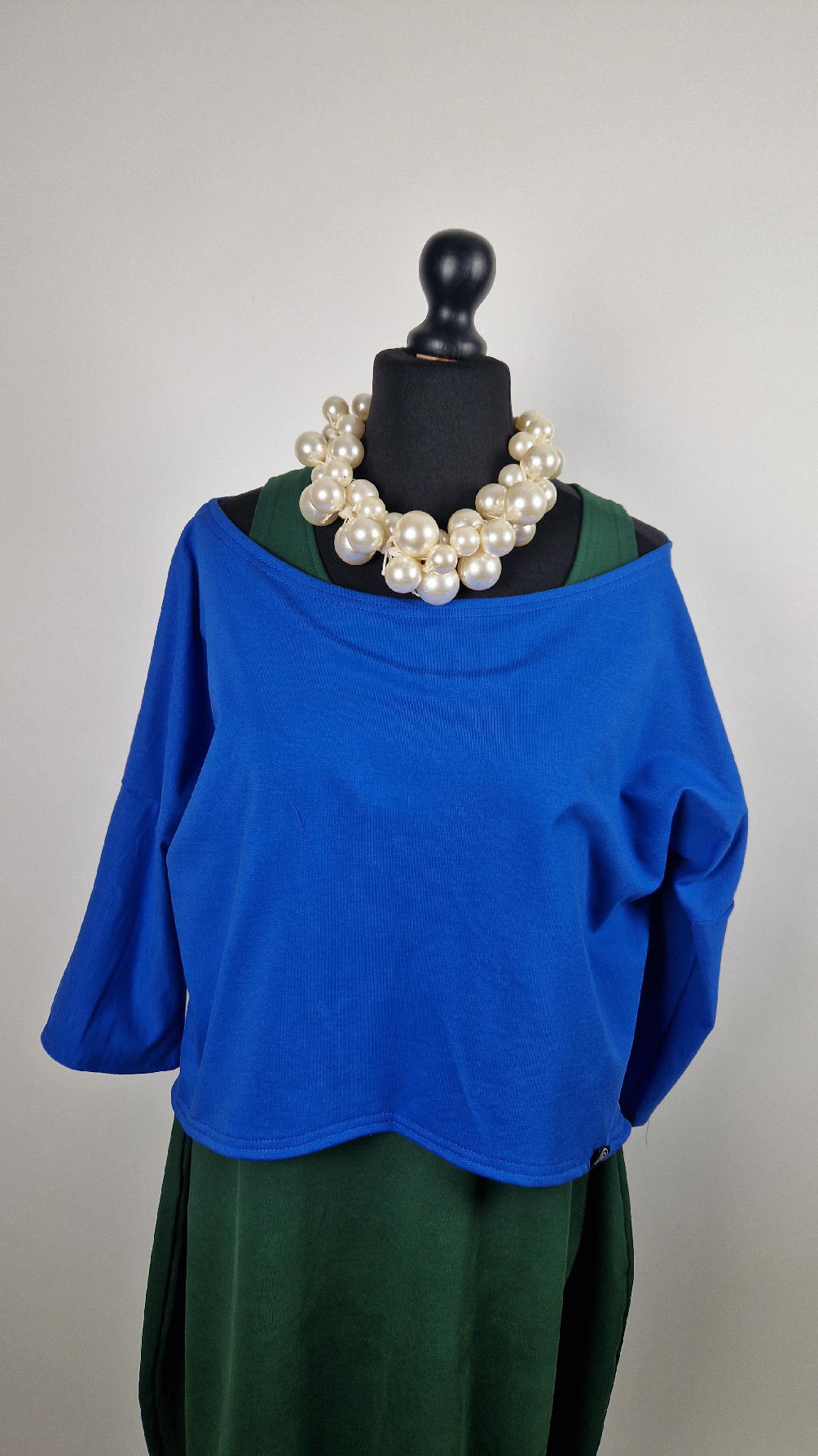 Krótka, mega nasycona kobaltowa bluzka Laila- taka ,,luzacka”, luźna w biuście bluzka typu NIETOPERZ, ale taki niewielki….bluzka uszyta z wysokiej jakości bawełny z pętelką, z rękawami 3/4… prosta, bez kieszeni – tak specjalnie, żeby nic nie odstawało ale z dużym dekoltem typu ,,łódka”, który możesz opuścić na jedno ramię, lub nosić symetrycznie… idealna do biżuterii- dużych naszyjników i wisiorów, świetnie komponuje się z sukienką Zuzą :)