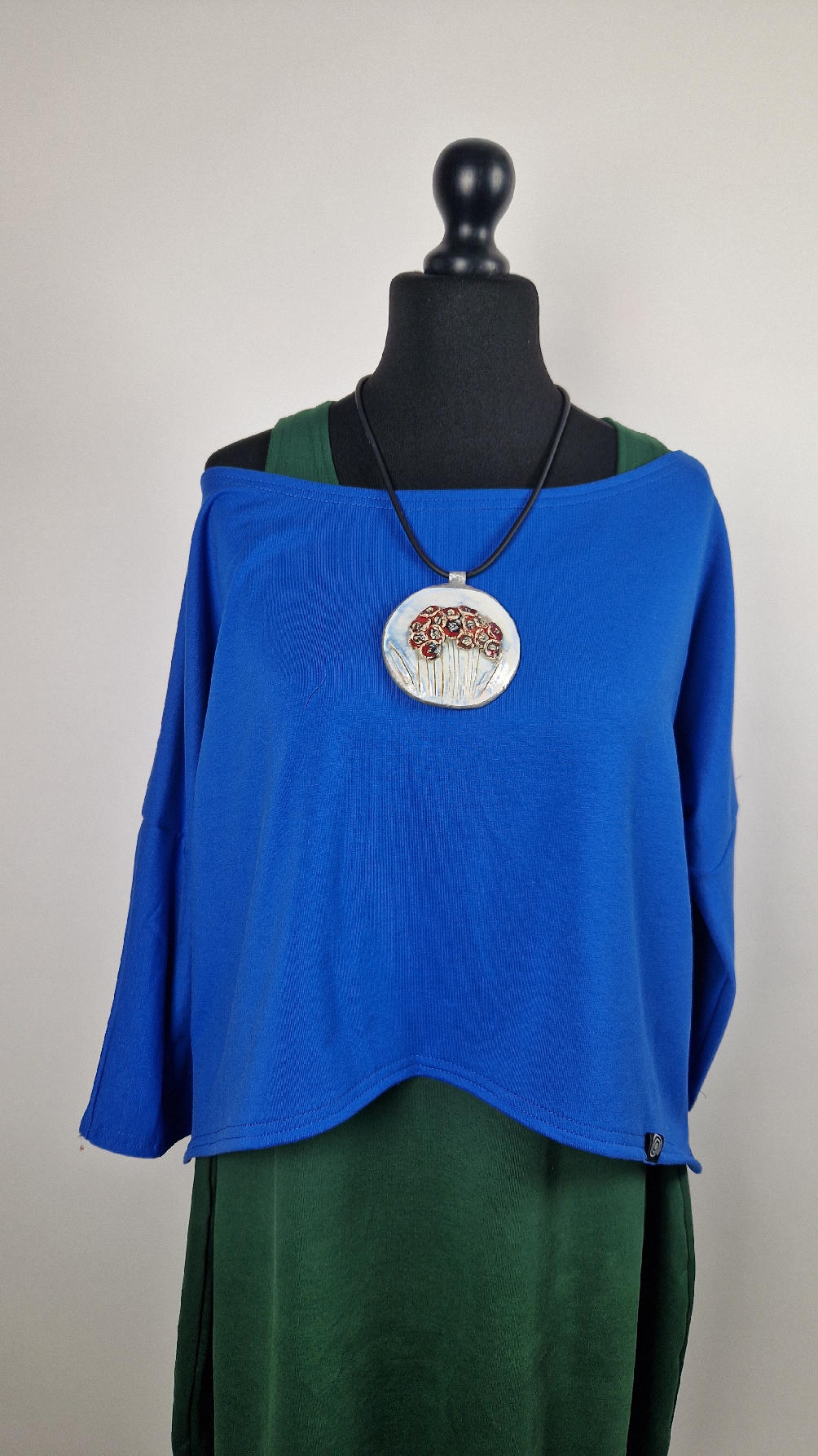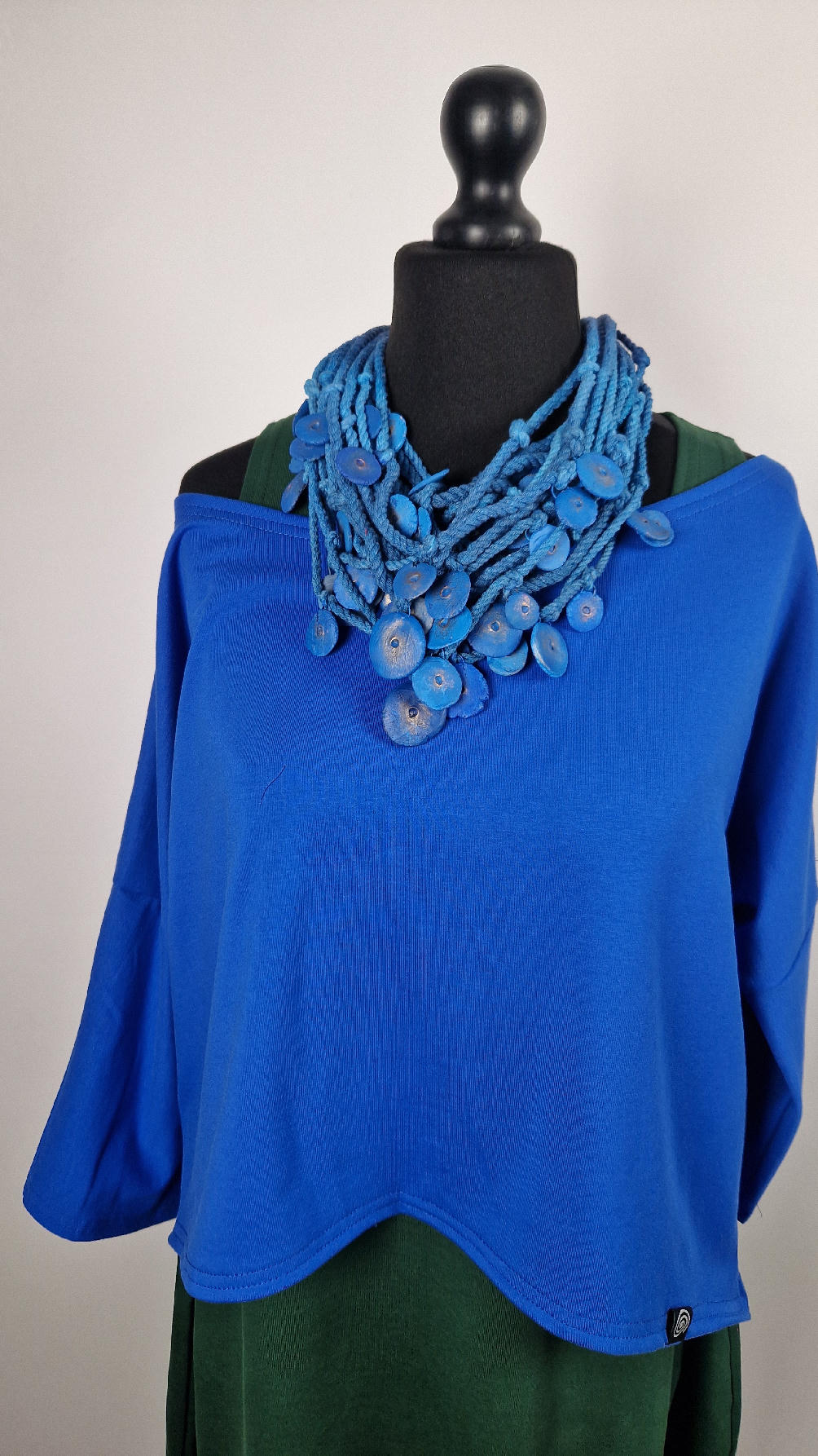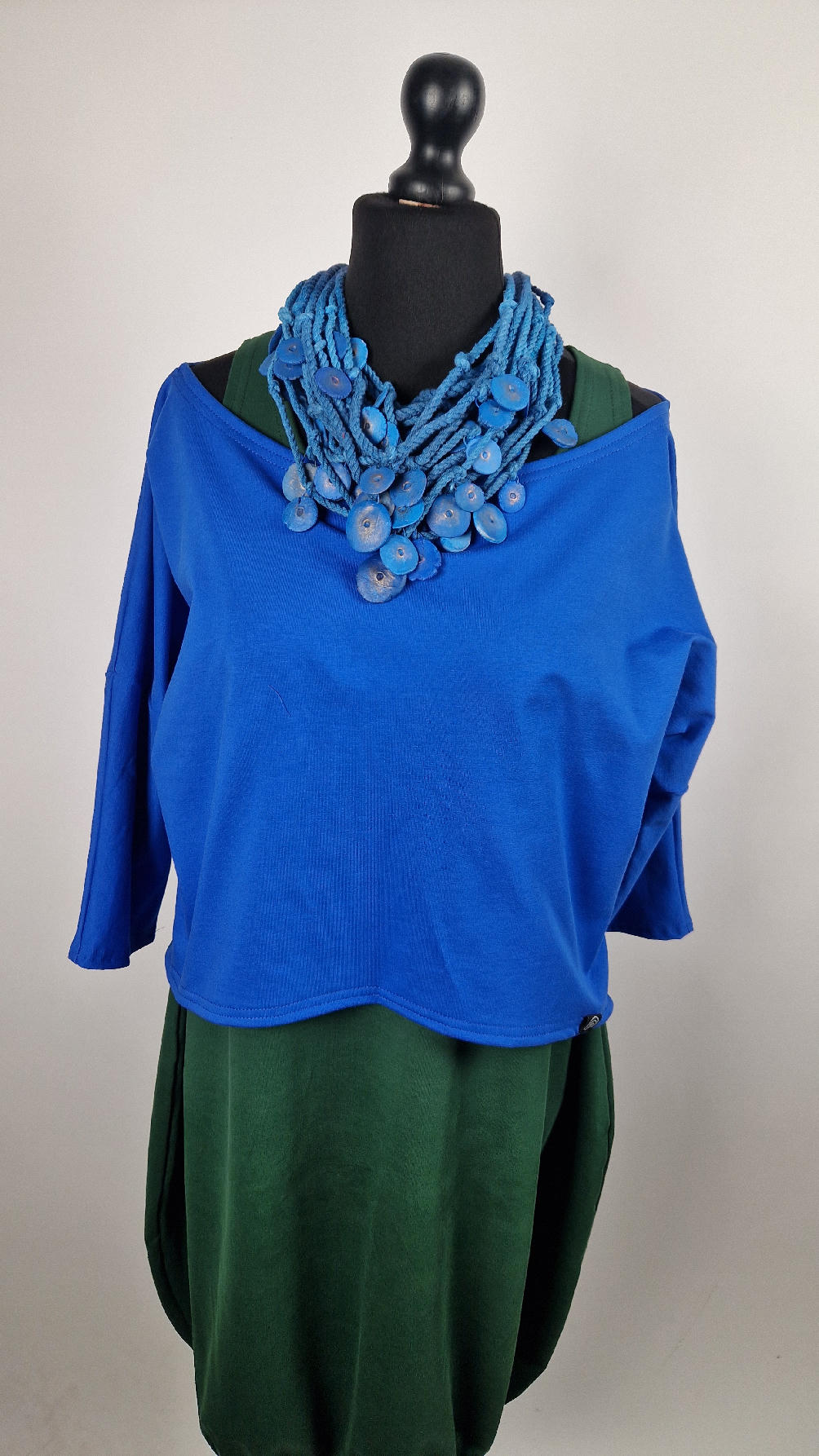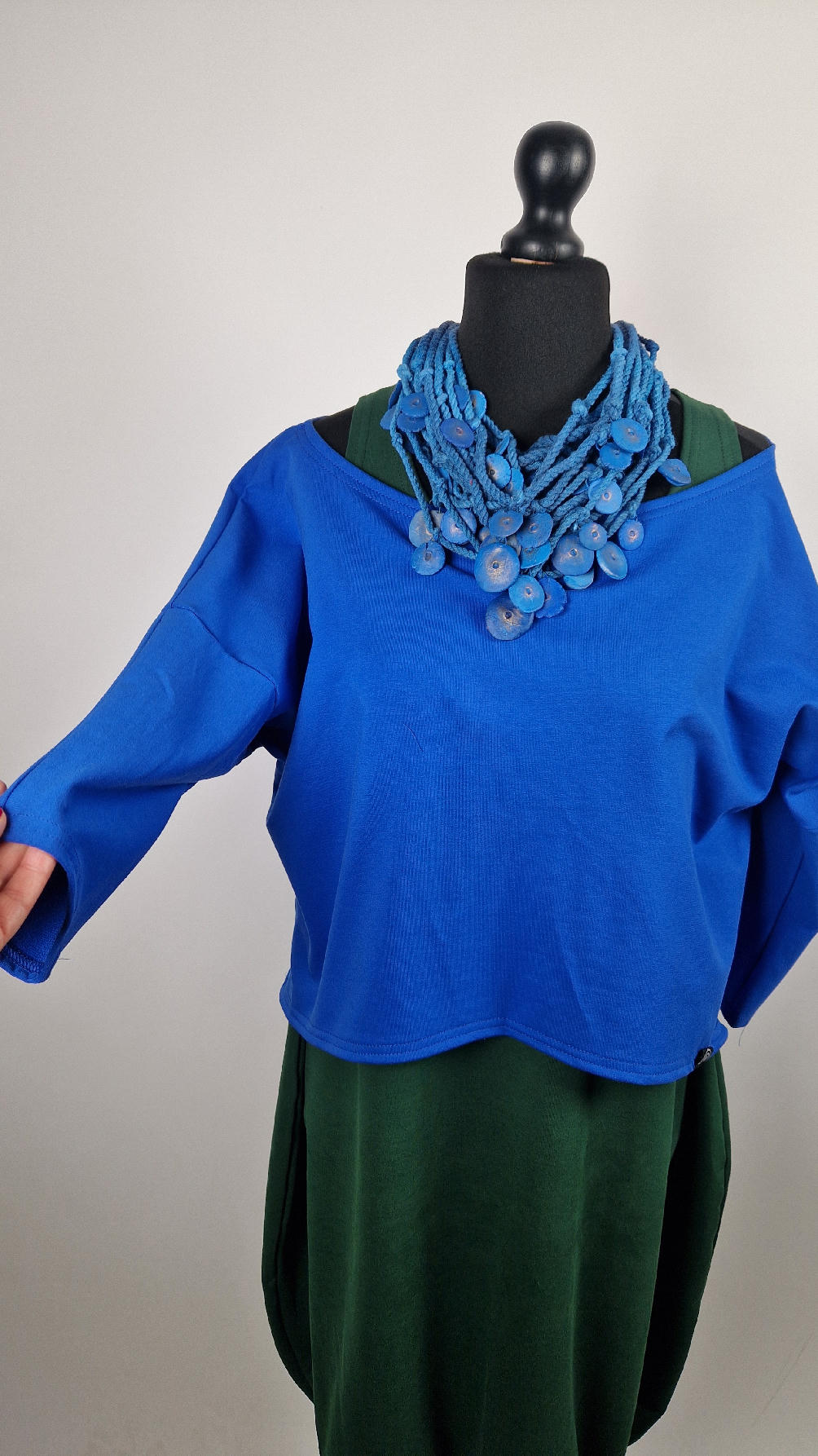Krótka, mega nasycona kobaltowa bluzka Laila- taka ,,luzacka”, luźna w biuście bluzka typu NIETOPERZ, ale taki niewielki….bluzka uszyta z wysokiej jakości bawełny z pętelką, z rękawami 3/4… prosta, bez kieszeni – tak specjalnie, żeby nic nie odstawało ale z dużym dekoltem typu ,,łódka”, który możesz opuścić na jedno ramię, lub nosić symetrycznie… idealna do biżuterii- dużych naszyjników i wisiorów, świetnie komponuje się z sukienką Zuzą :)