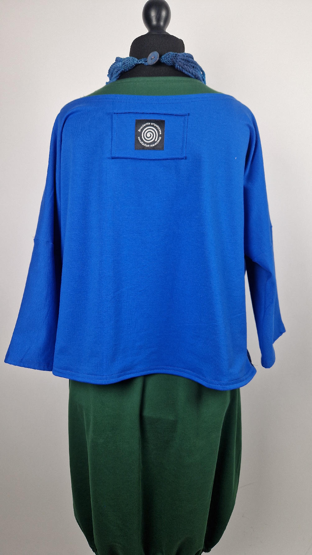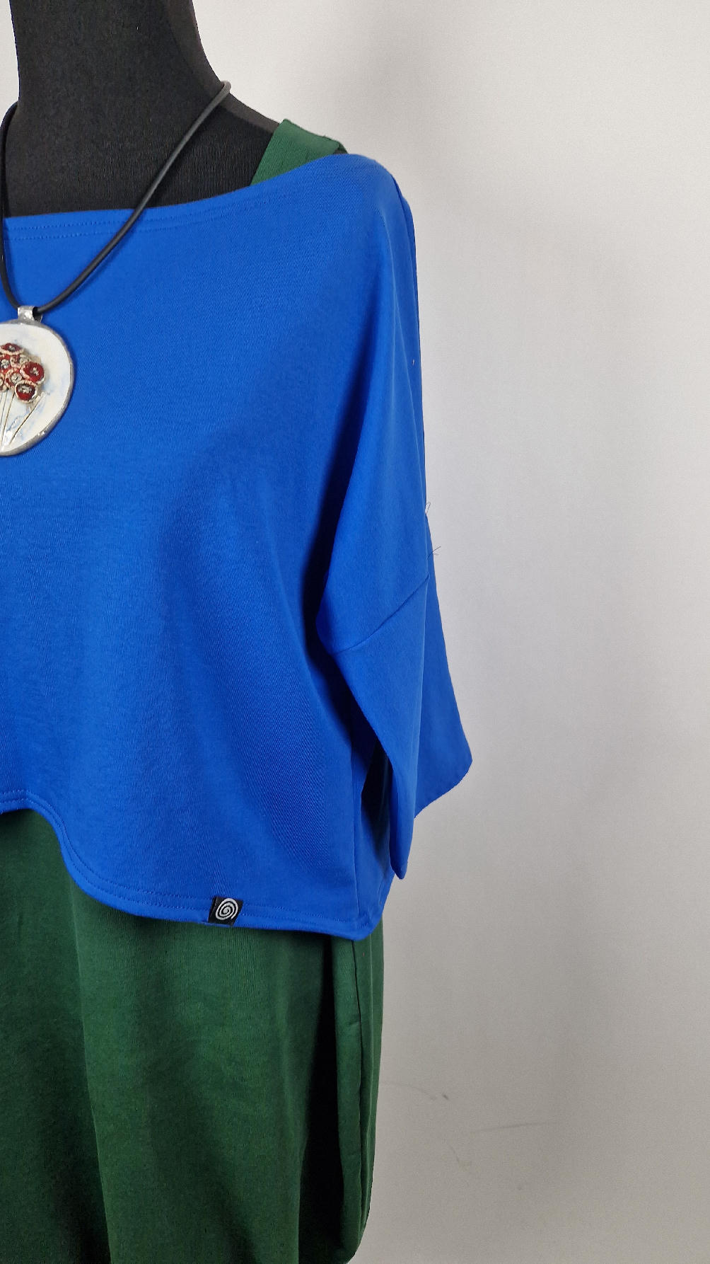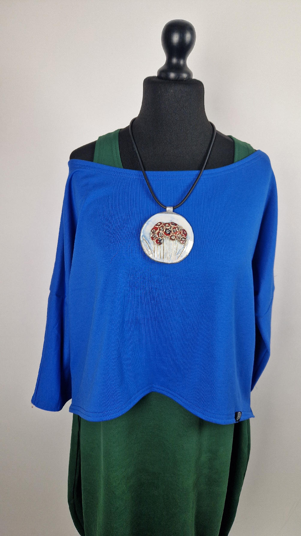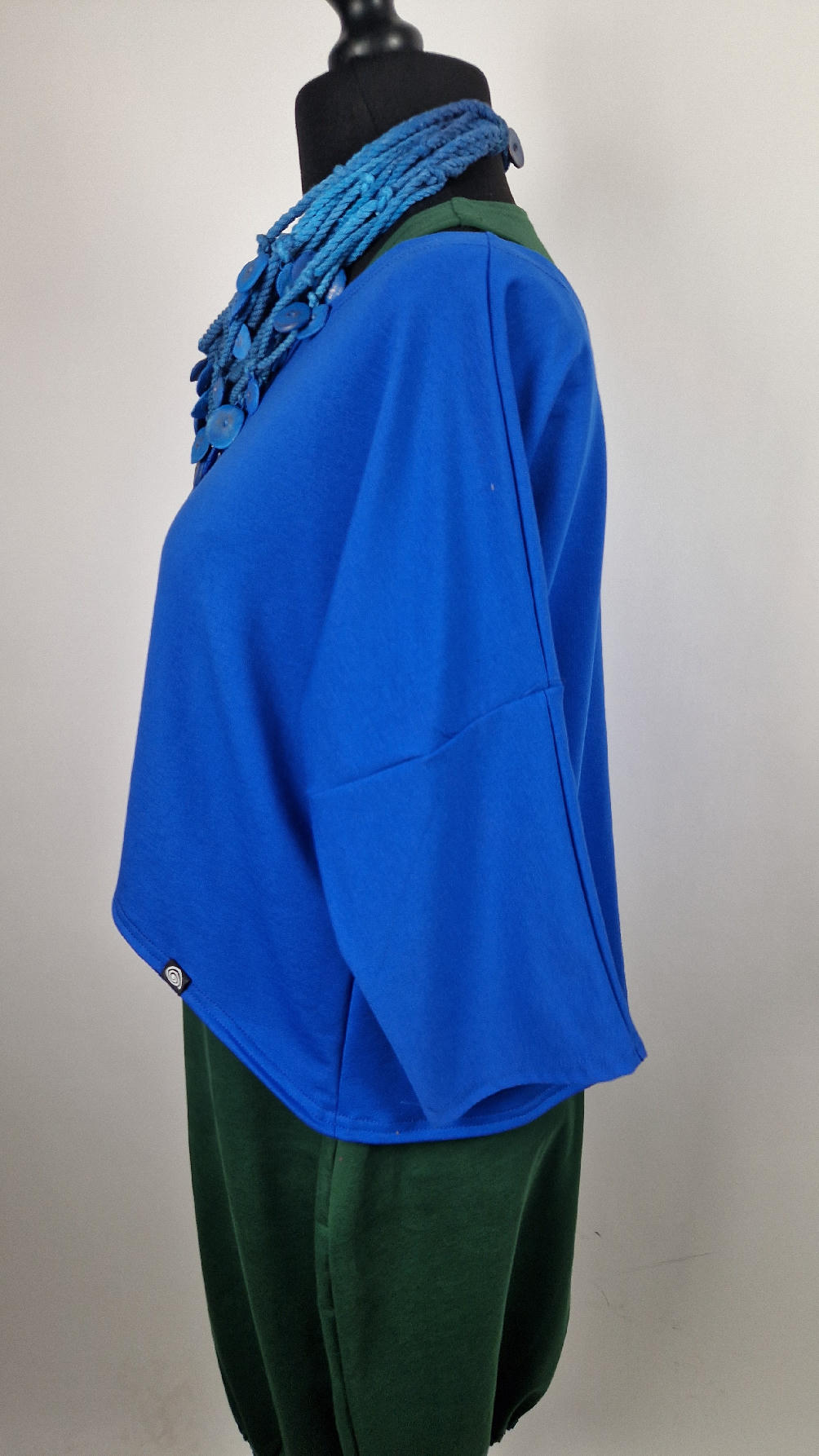 Krótka, mega nasycona kobaltowa bluzka Laila- taka ,,luzacka”, luźna w biuście bluzka typu NIETOPERZ, ale taki niewielki….bluzka uszyta z wysokiej jakości bawełny z pętelką, z rękawami 3/4… prosta, bez kieszeni – tak specjalnie, żeby nic nie odstawało ale z dużym dekoltem typu ,,łódka”, który możesz opuścić na jedno ramię, lub nosić symetrycznie… idealna do biżuterii- dużych naszyjników i wisiorów, świetnie komponuje się z sukienką Zuzą :)