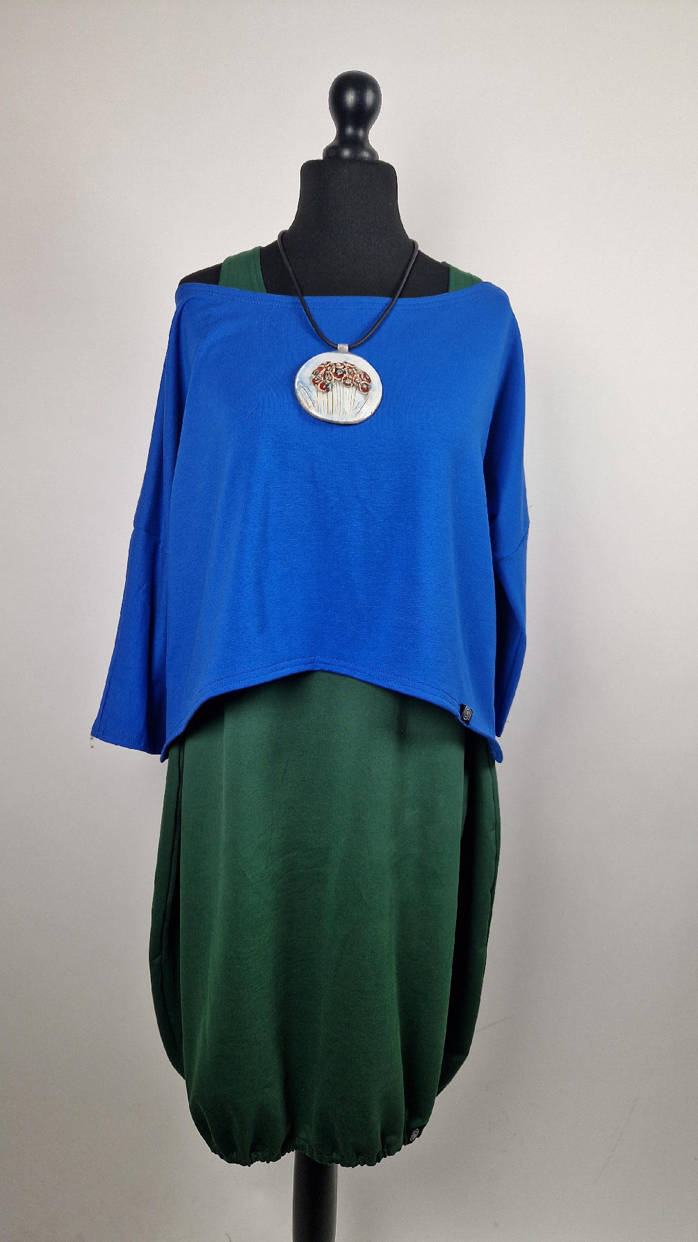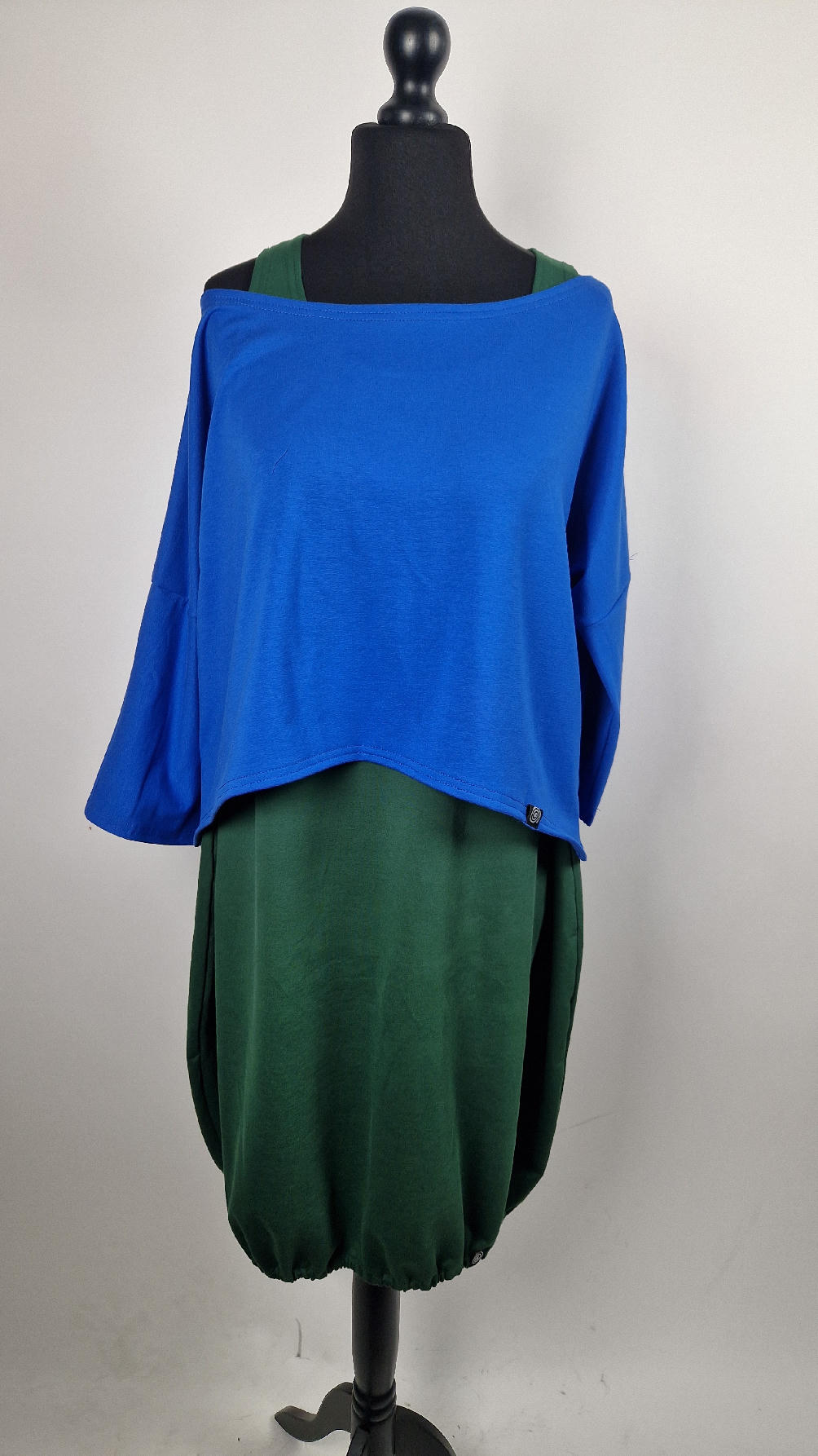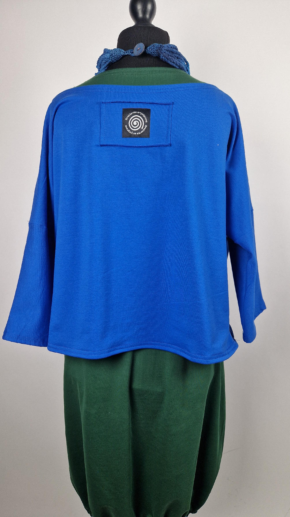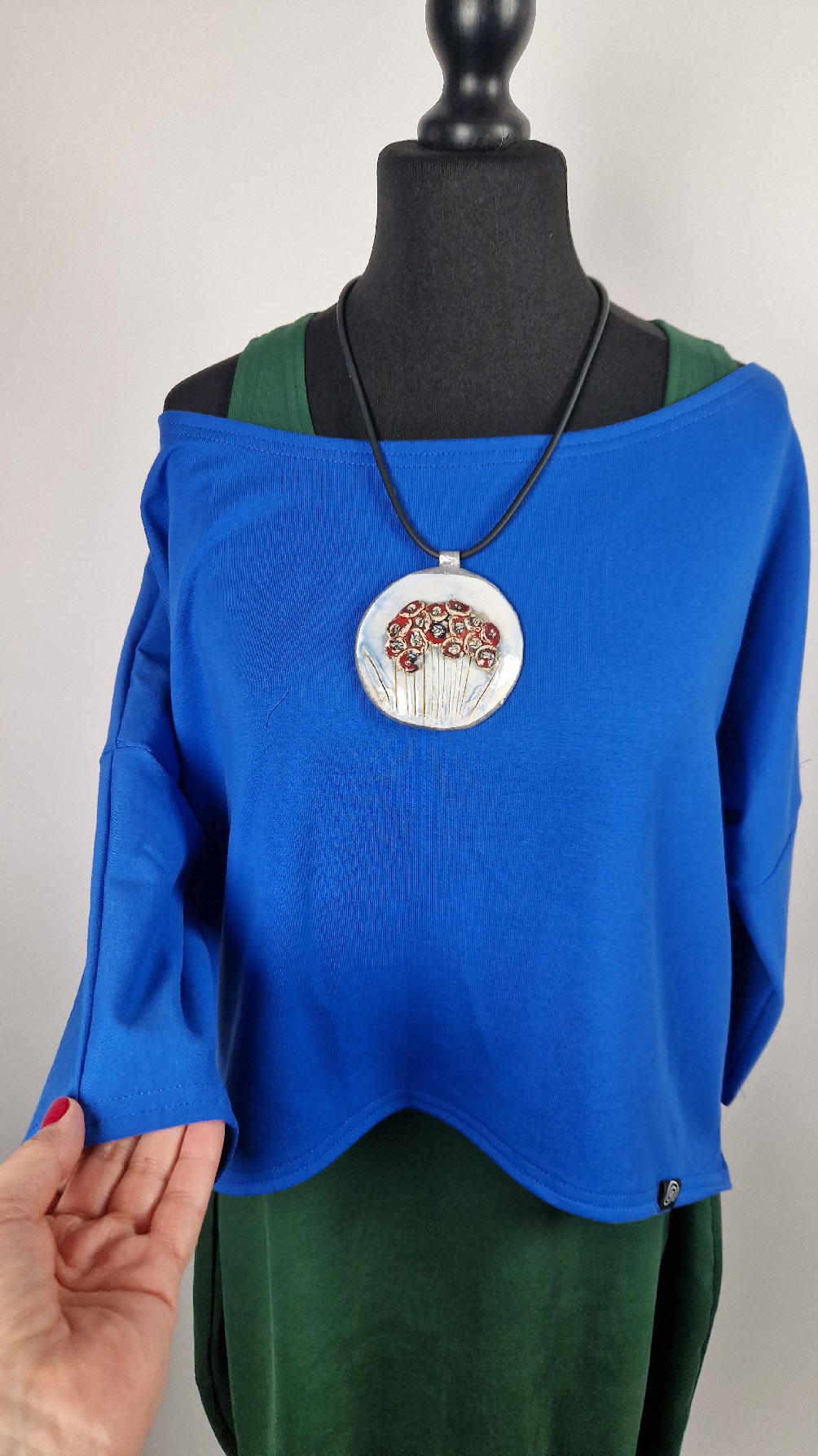 Krótka, mega nasycona kobaltowa bluzka Laila- taka ,,luzacka”, luźna w biuście bluzka typu NIETOPERZ, ale taki niewielki….bluzka uszyta z wysokiej jakości bawełny z pętelką, z rękawami 3/4… prosta, bez kieszeni – tak specjalnie, żeby nic nie odstawało ale z dużym dekoltem typu ,,łódka”, który możesz opuścić na jedno ramię, lub nosić symetrycznie… idealna do biżuterii- dużych naszyjników i wisiorów, świetnie komponuje się z sukienką Zuzą :)