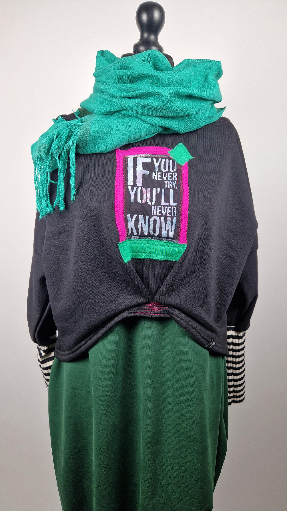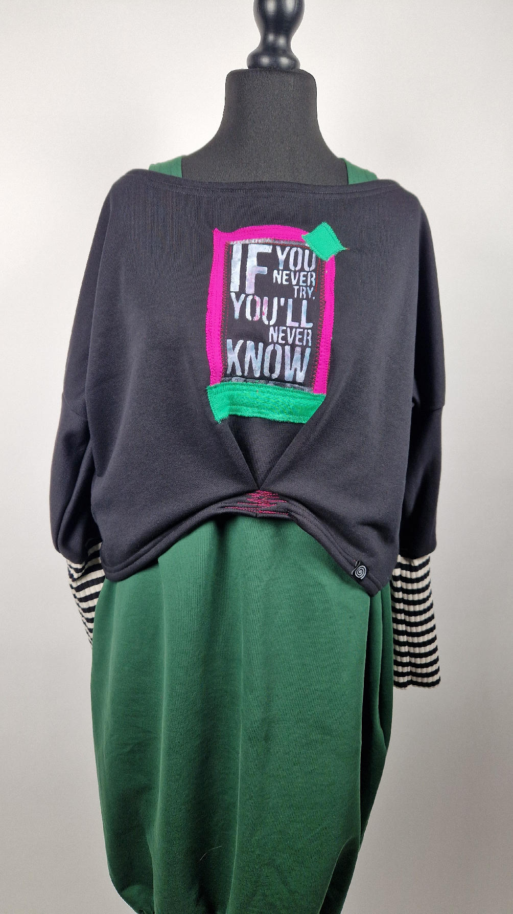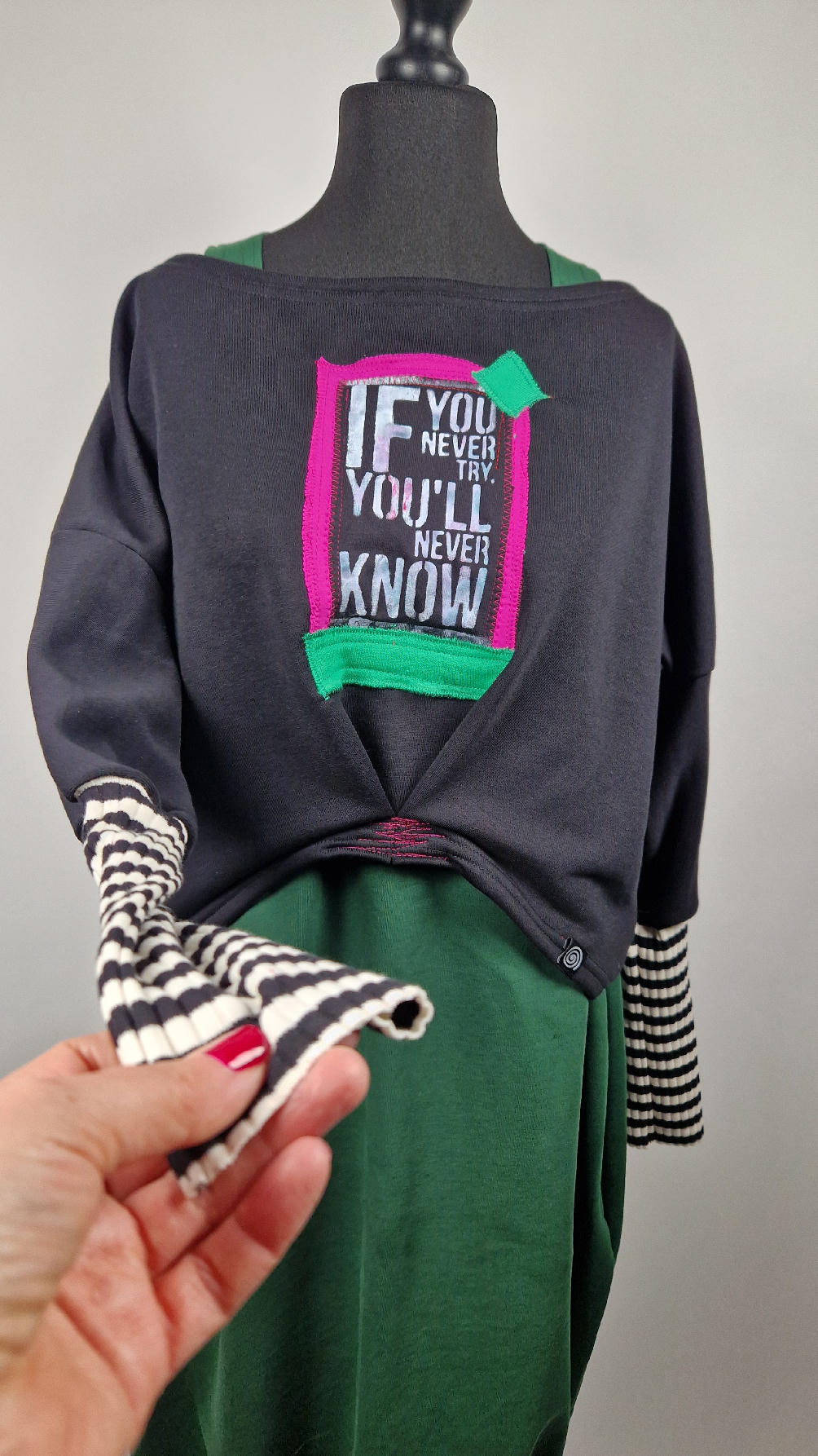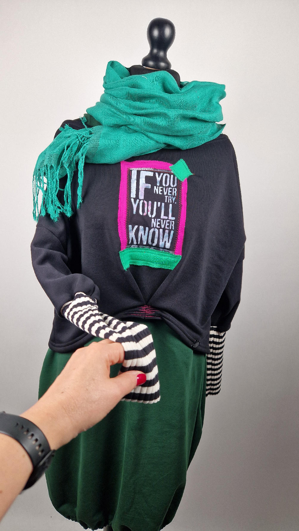 Krótka czarna, ale przecież kolorowa bluzka z inspirująca aplikacją z madżentą i zielenią … z kontrastowymi biało- czarnymi mankietami., na prawdę ładnie to wyszło:) Luźna w biuście bluzka typu NIETOPERZ, ale taki niewielki….bluzka uszyta z wysokiej jakości bawełny z pętelką, z długalaśnymi elastycznymi mankietami … , lekko zebrana na dole, żeby układała się bardziej… prosta, bez kieszeni – tak specjalnie, żeby nic nie odstawało ale z dużym dekoltem typu ,,łódka”, który możesz opuścić na jedno ramię, lub nosić symetrycznie…