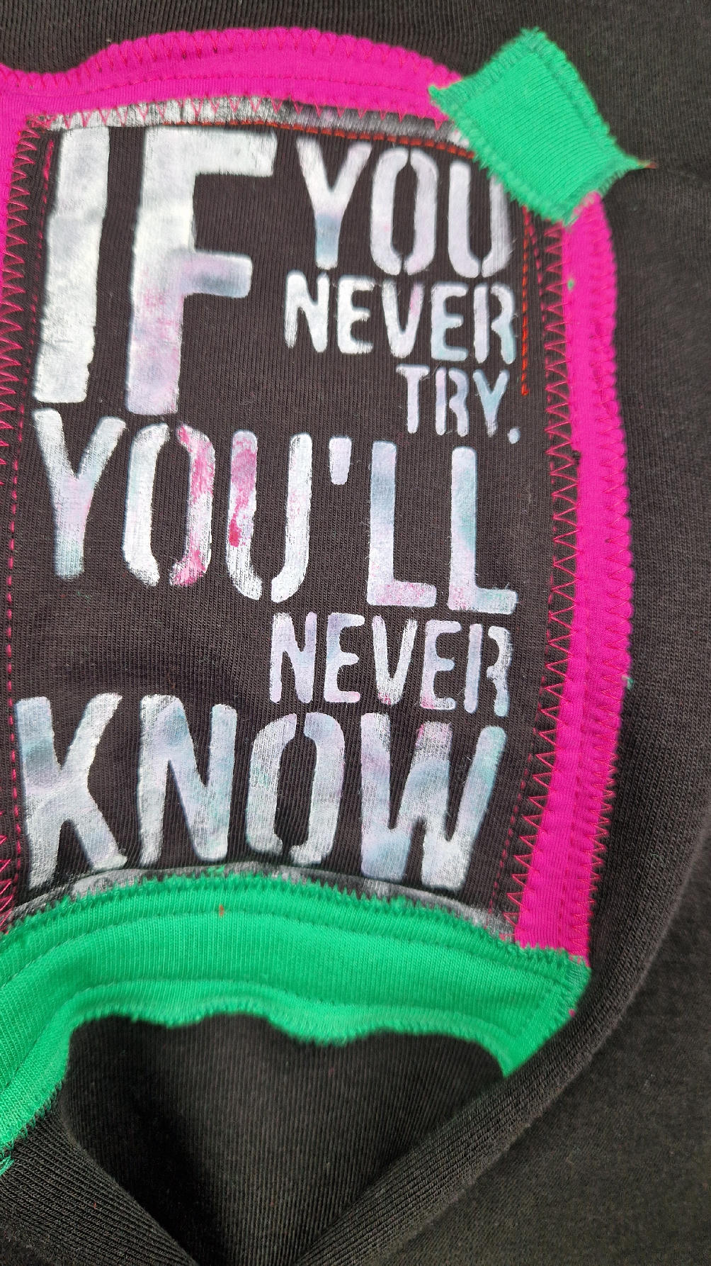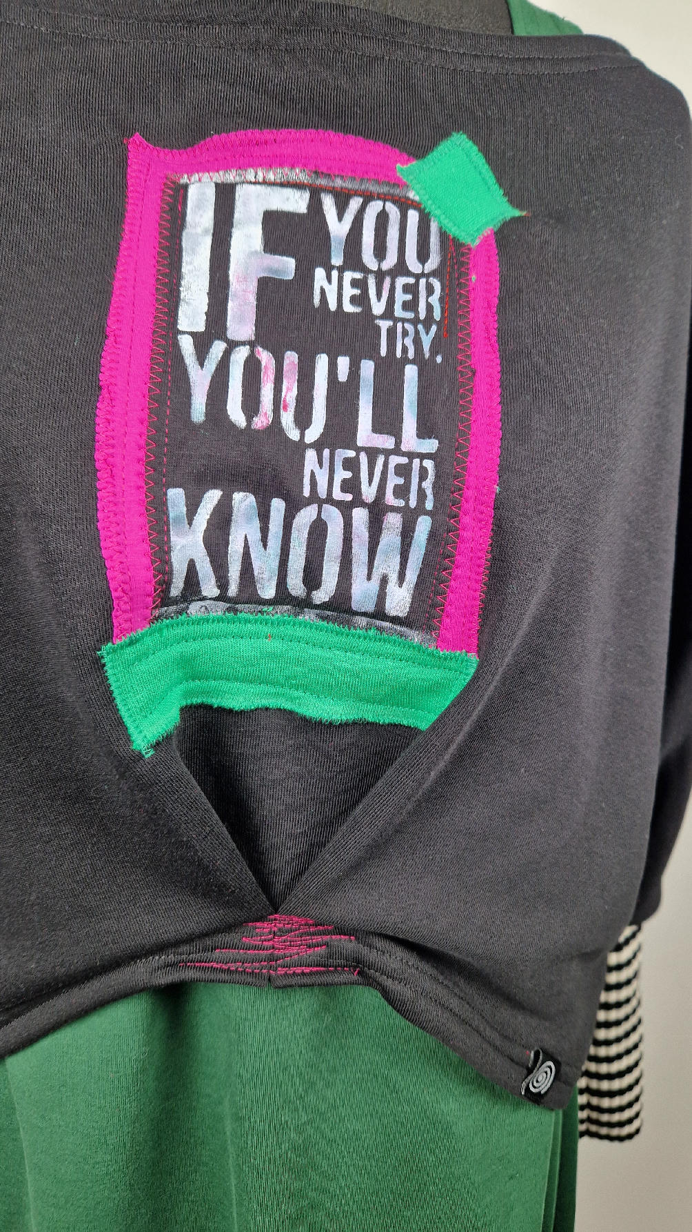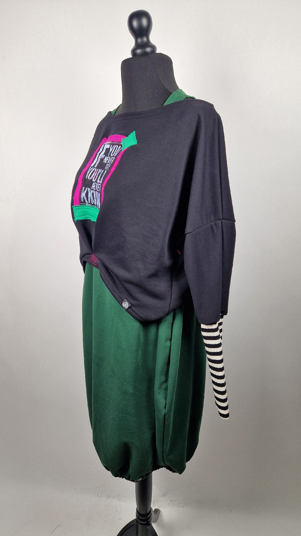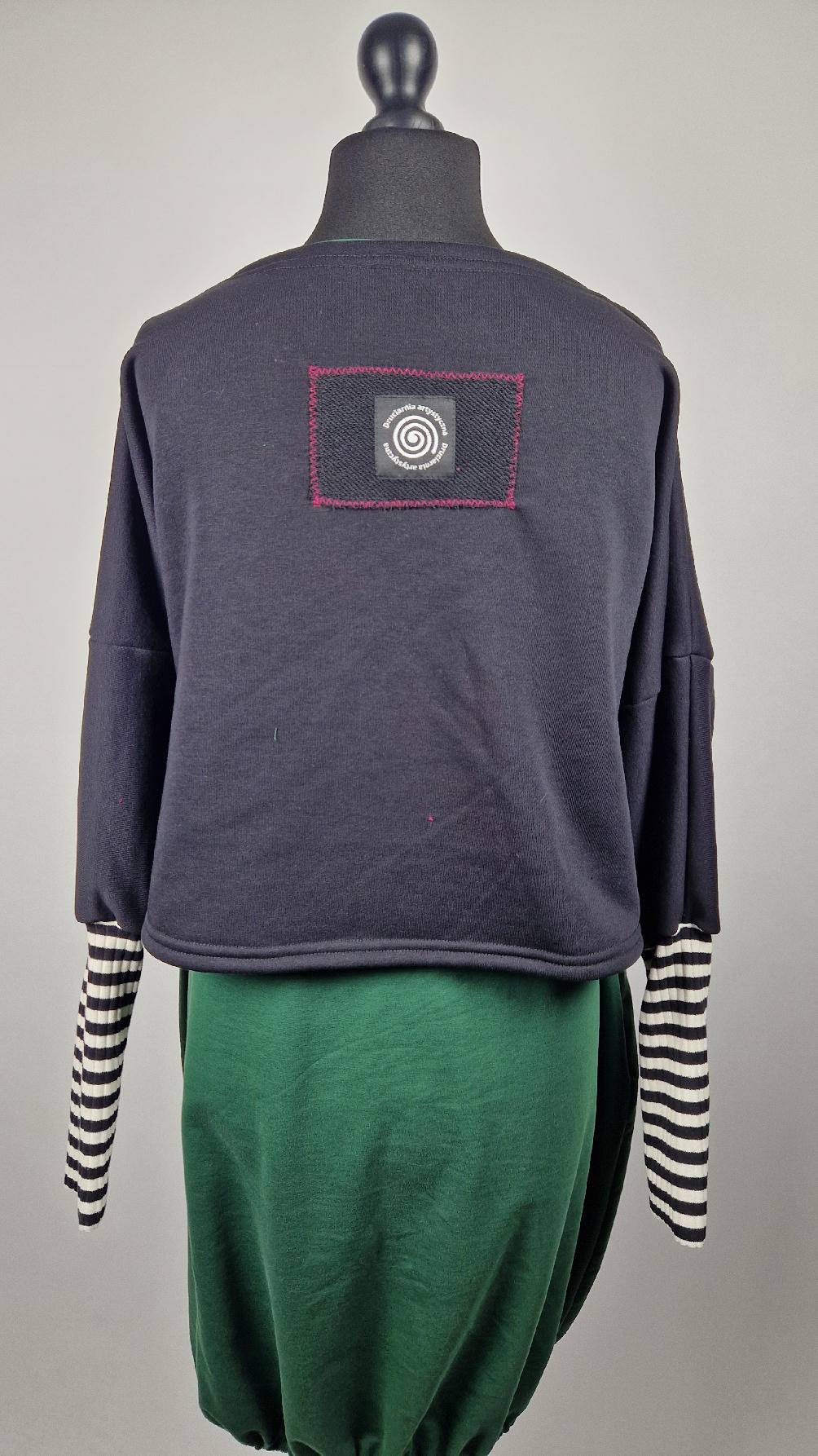 Krótka czarna, ale przecież kolorowa bluzka z inspirująca aplikacją z madżentą i zielenią … z kontrastowymi biało- czarnymi mankietami., na prawdę ładnie to wyszło:) Luźna w biuście bluzka typu NIETOPERZ, ale taki niewielki….bluzka uszyta z wysokiej jakości bawełny z pętelką, z długalaśnymi elastycznymi mankietami … , lekko zebrana na dole, żeby układała się bardziej… prosta, bez kieszeni – tak specjalnie, żeby nic nie odstawało ale z dużym dekoltem typu ,,łódka”, który możesz opuścić na jedno ramię, lub nosić symetrycznie…