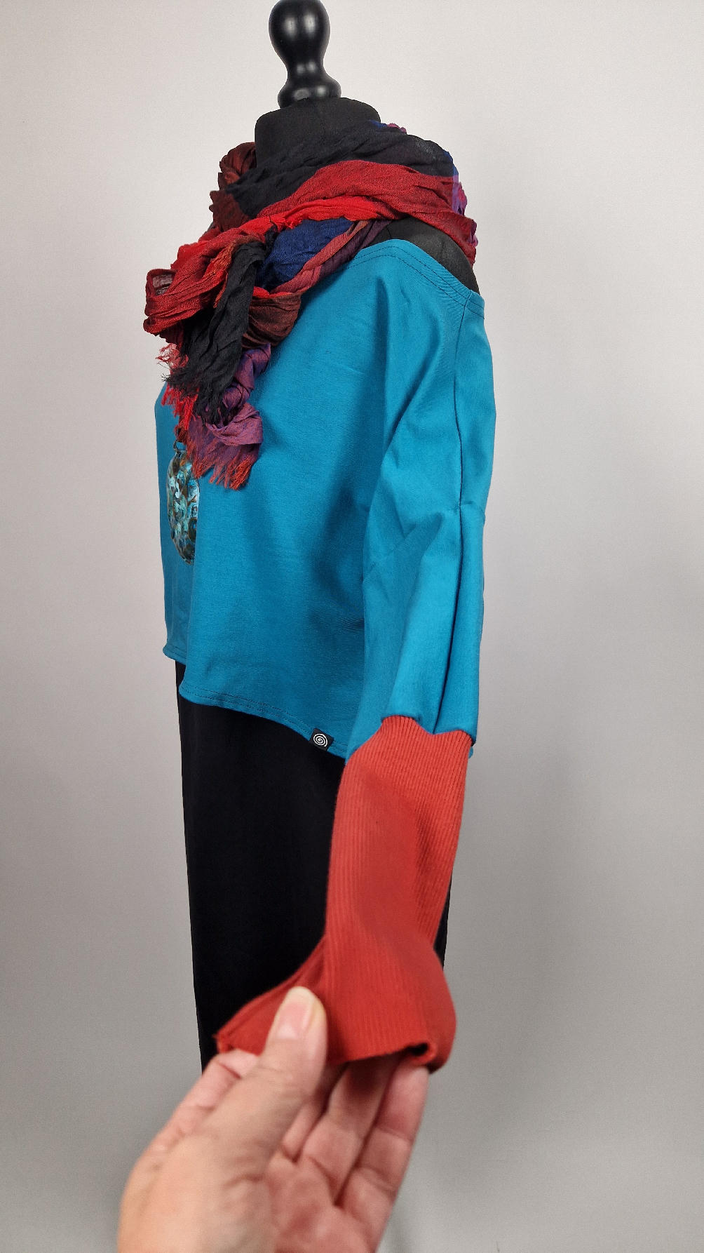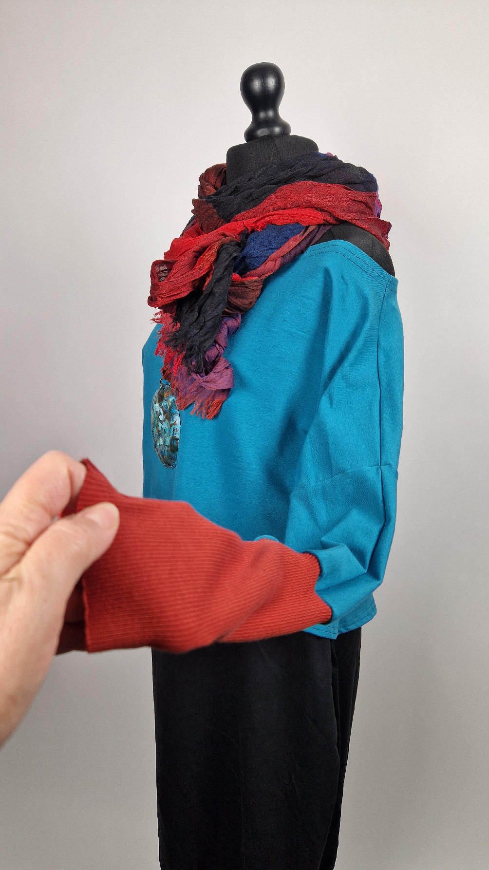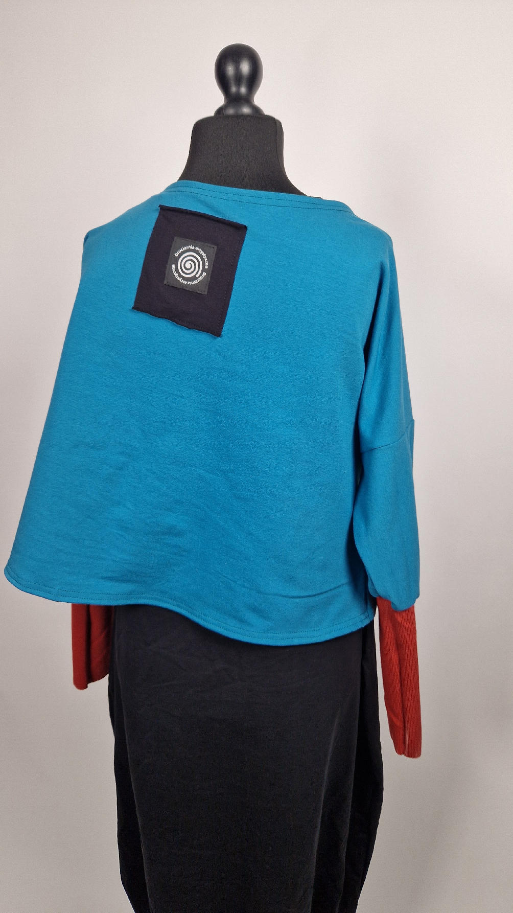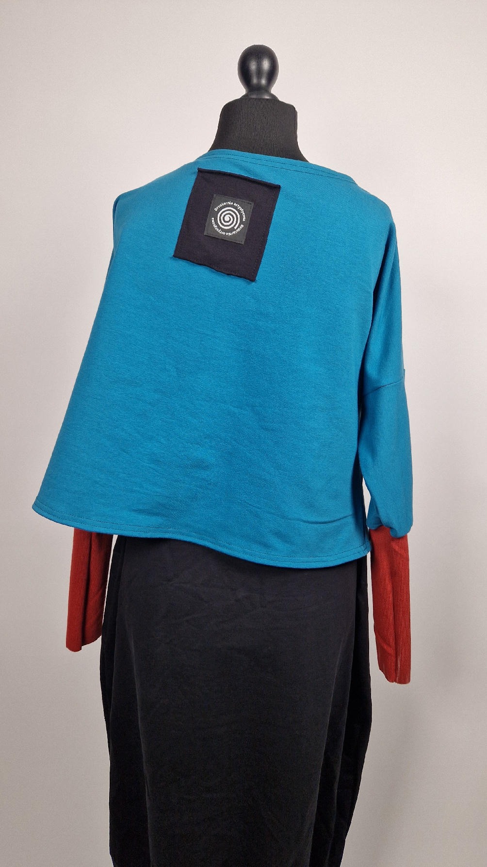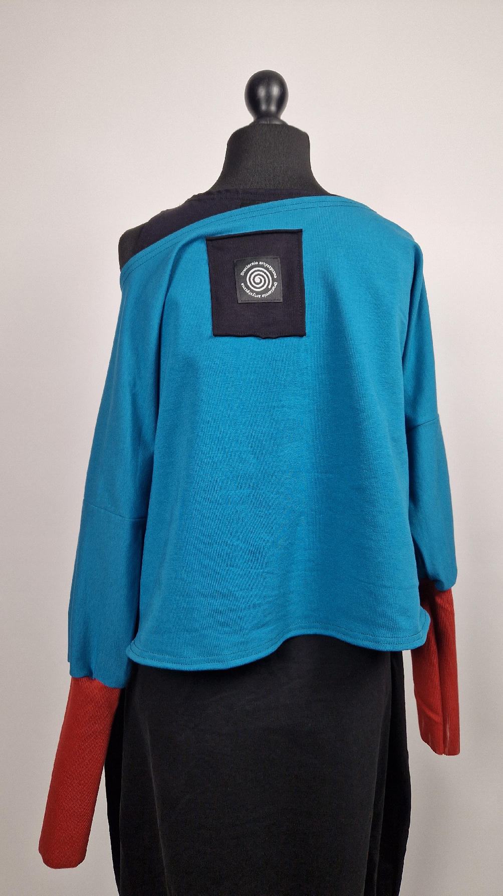 Krótka, turkusowa, luźna w biuście bluzka typu NIETOPERZ, ale taki niewielki….bluzka uszyta z wysokiej jakości bawełny z pętelką, z długalaśnymi , elastycznymi , rudymi mankietami … prosta, bez kieszeni – tak specjalnie, żeby nic nie odstawało ale z dużym dekoltem typu ,,łódka”, który możesz opuścić na jedno ramię, lub nosić symetrycznie…