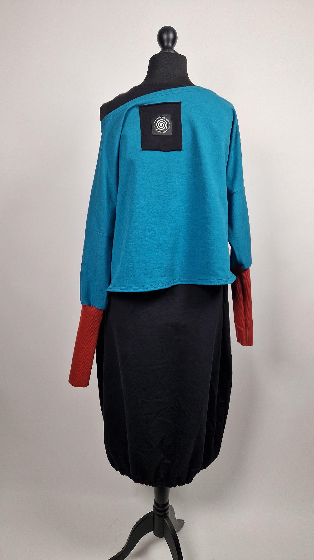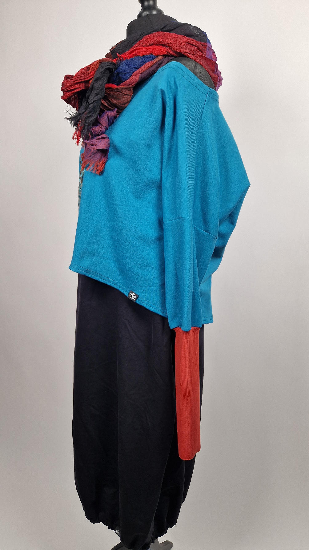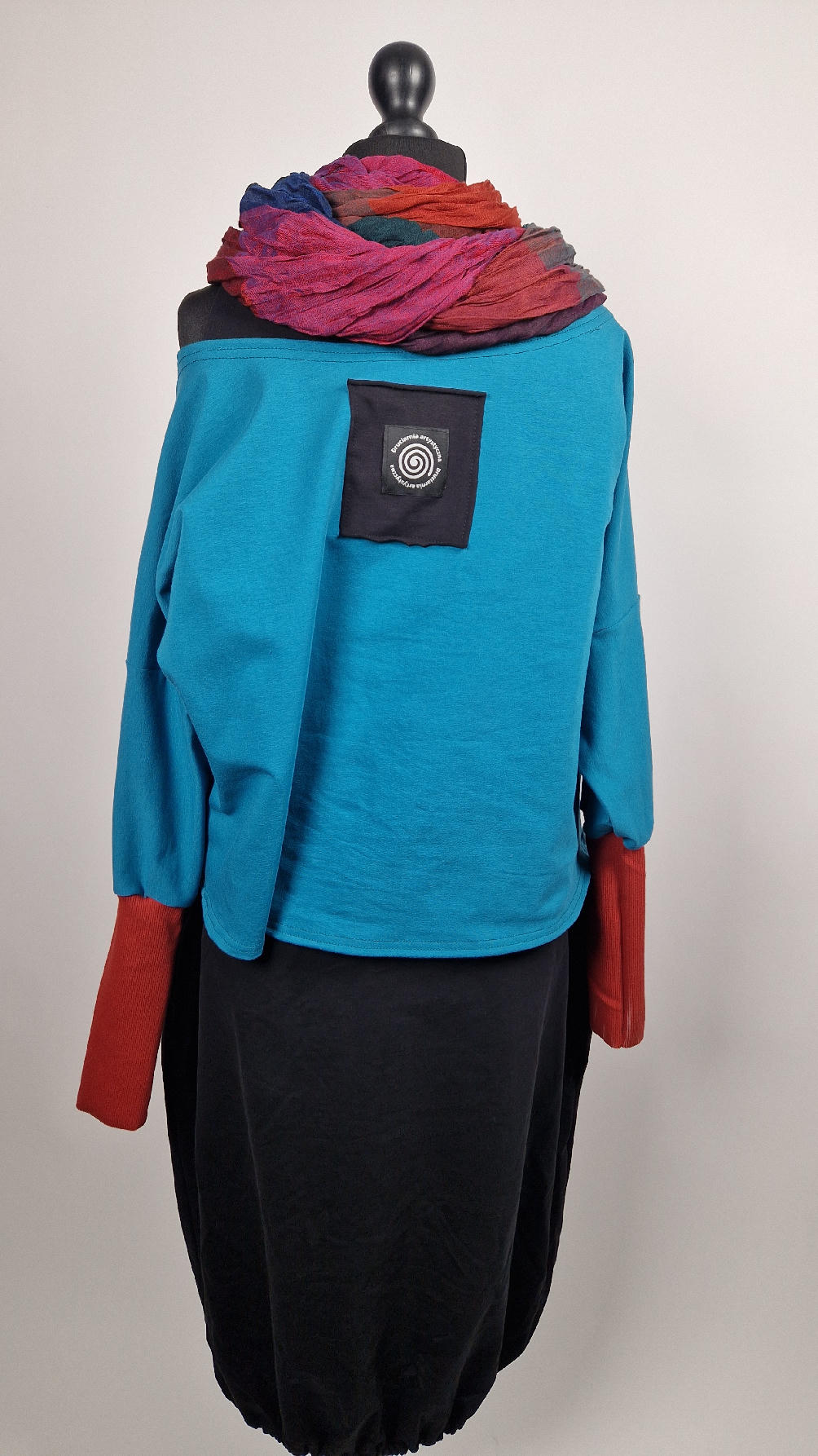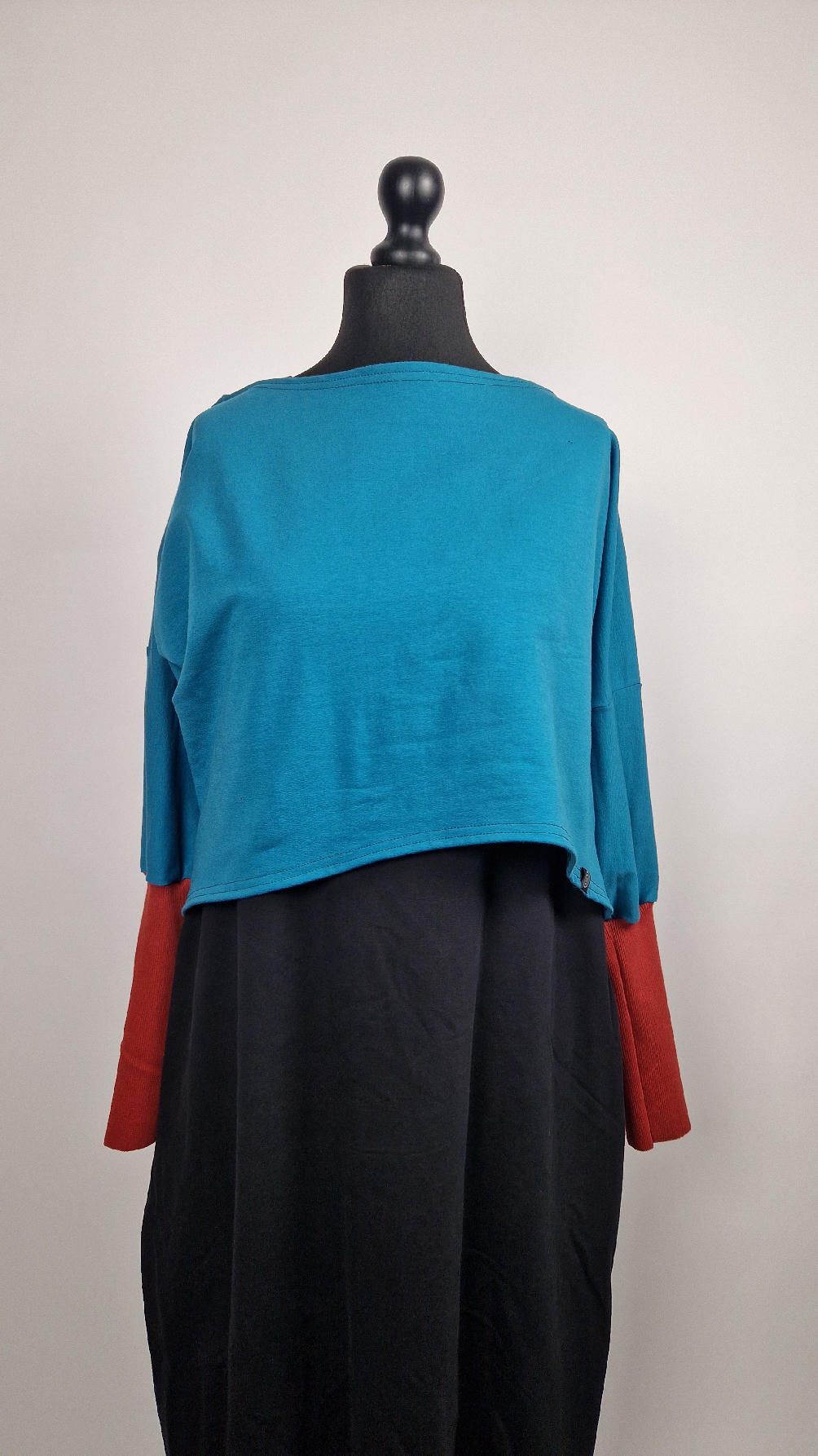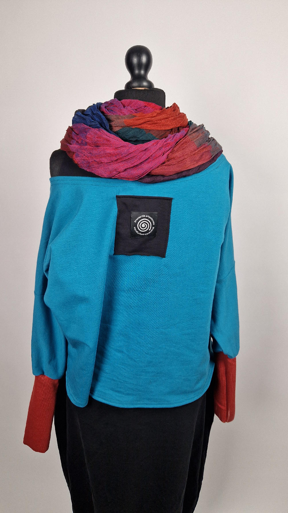 Krótka, turkusowa, luźna w biuście bluzka typu NIETOPERZ, ale taki niewielki….bluzka uszyta z wysokiej jakości bawełny z pętelką, z długalaśnymi , elastycznymi , rudymi mankietami … prosta, bez kieszeni – tak specjalnie, żeby nic nie odstawało ale z dużym dekoltem typu ,,łódka”, który możesz opuścić na jedno ramię, lub nosić symetrycznie…