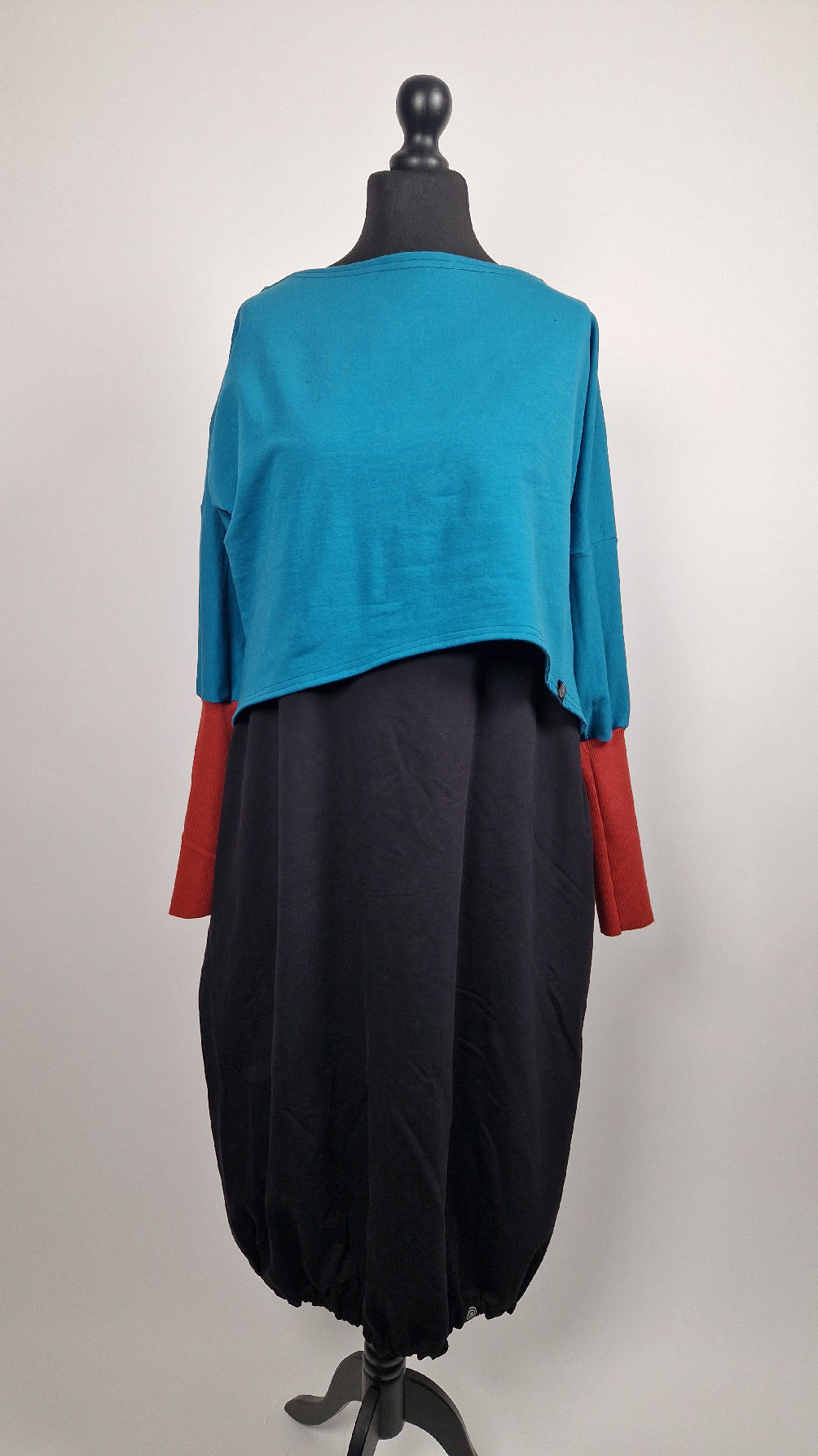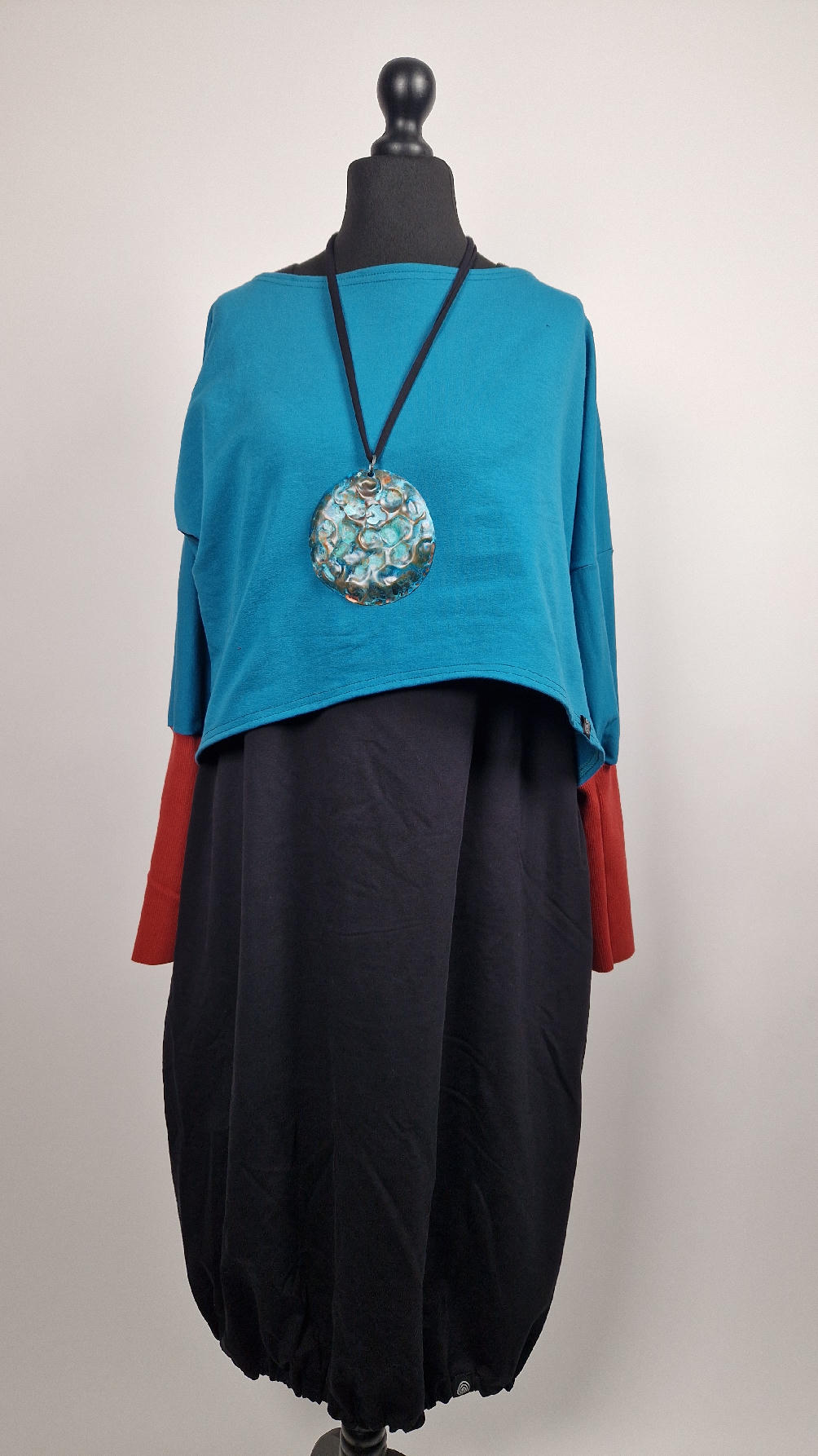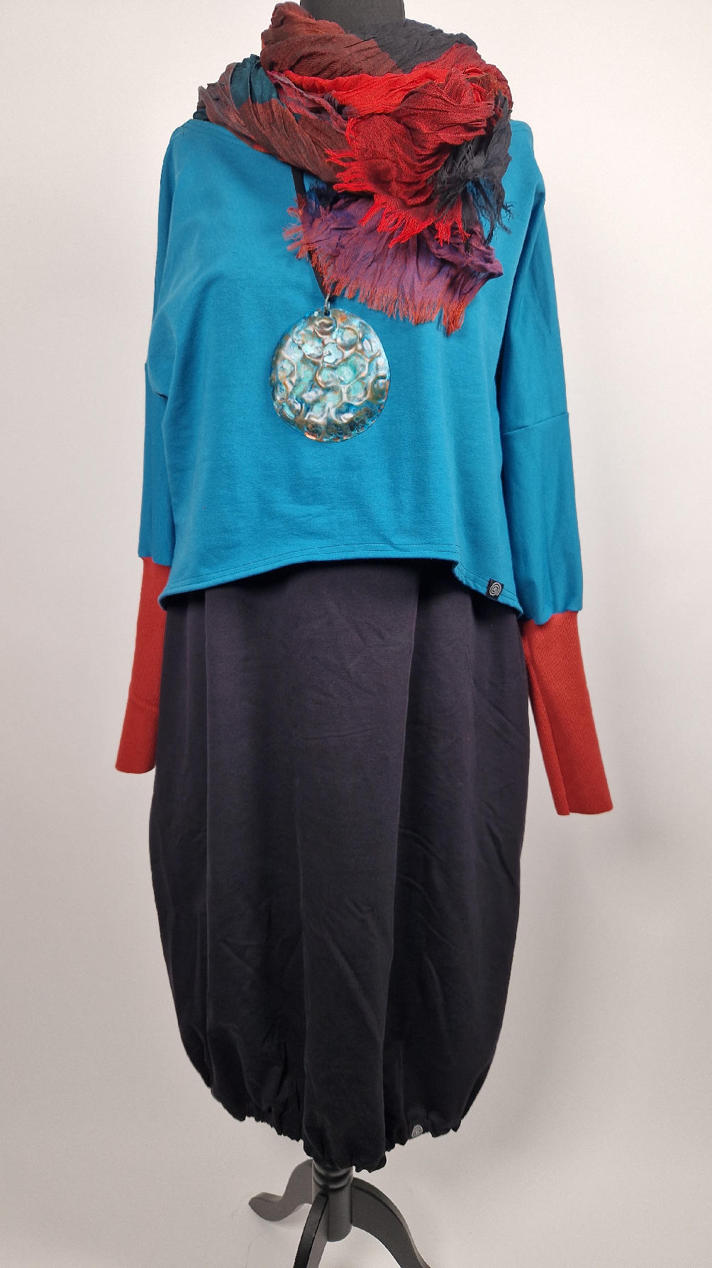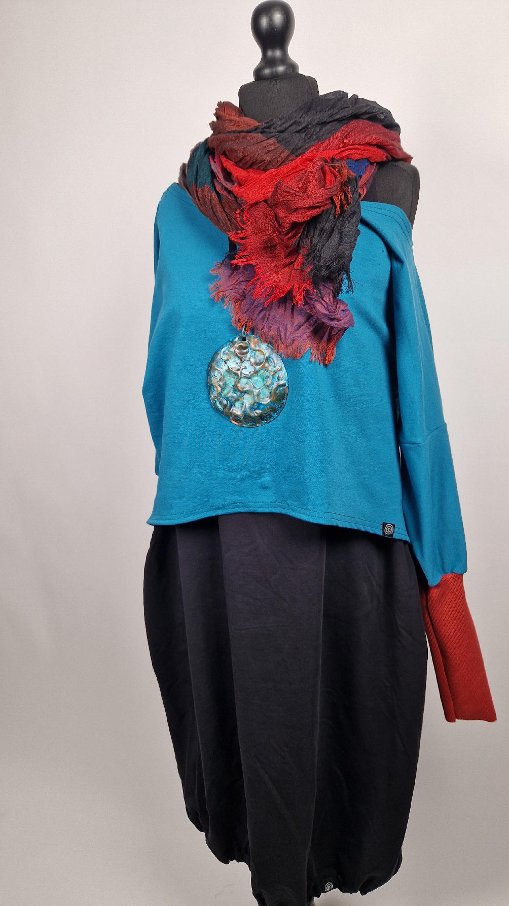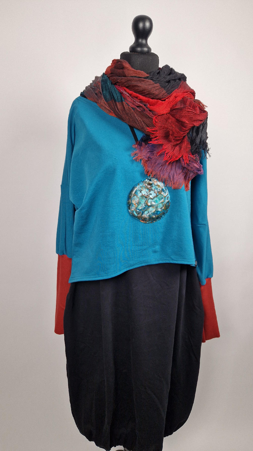 Krótka, turkusowa, luźna w biuście bluzka typu NIETOPERZ, ale taki niewielki….bluzka uszyta z wysokiej jakości bawełny z pętelką, z długalaśnymi , elastycznymi , rudymi mankietami … prosta, bez kieszeni – tak specjalnie, żeby nic nie odstawało ale z dużym dekoltem typu ,,łódka”, który możesz opuścić na jedno ramię, lub nosić symetrycznie…