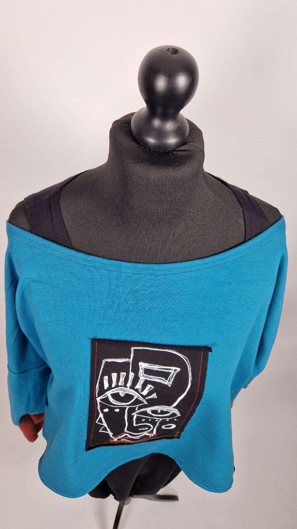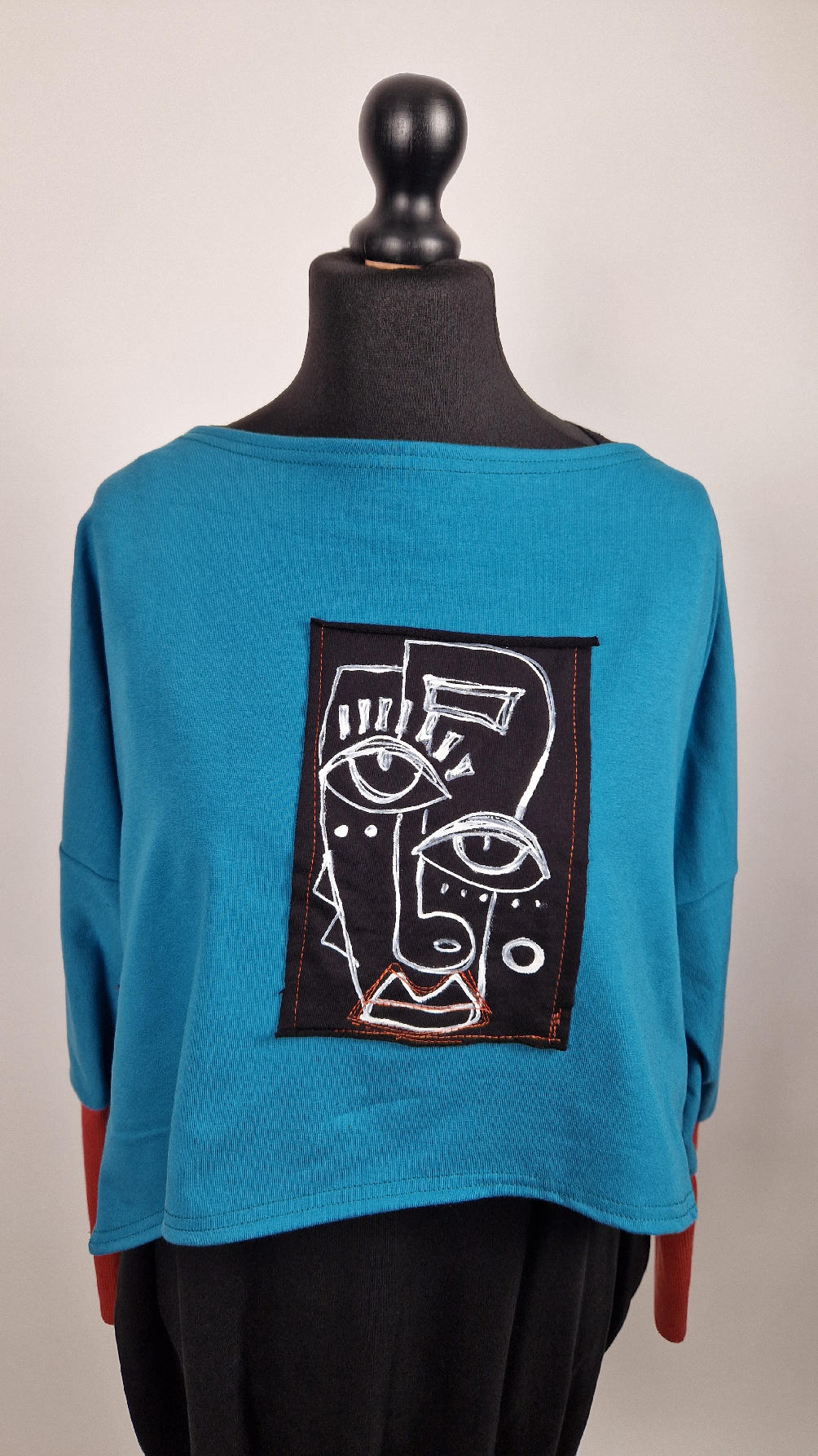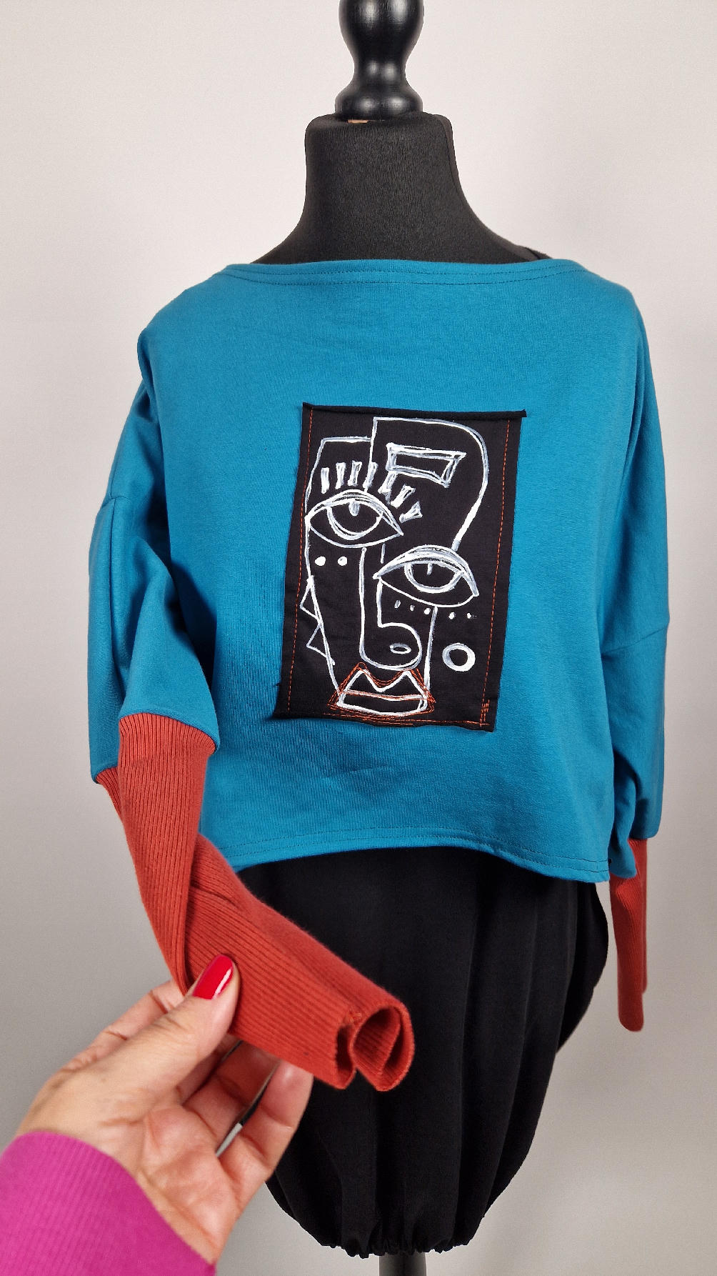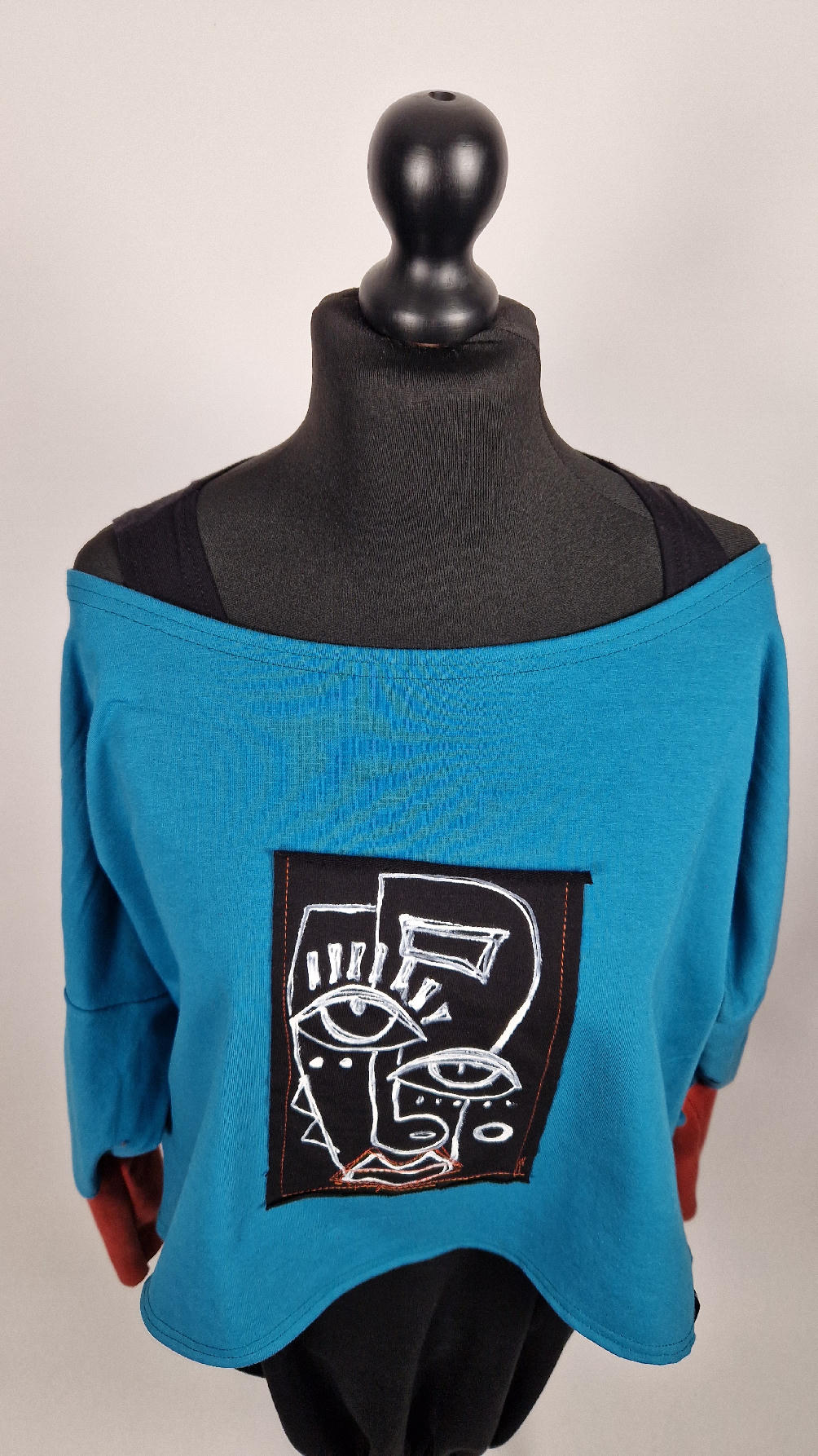 Krótka, ręcznie malowana i poprzeszywana kontrastową nitką, turkusowa, luźna w biuście bluzka typu NIETOPERZ, ale taki niewielki….bluzka uszyta z wysokiej jakości bawełny z pętelką, z długalaśnymi , elastycznymi , rudymi mankietami … prosta, bez kieszeni – tak specjalnie, żeby nic nie odstawało ale z dużym dekoltem typu ,,łódka”, który możesz opuścić na jedno ramię, lub nosić symetrycznie…Każdy,,portret” jest namalowany ręcznie przeze mnie, na czarnej bawełnie , następnie przyszyty do bluzki