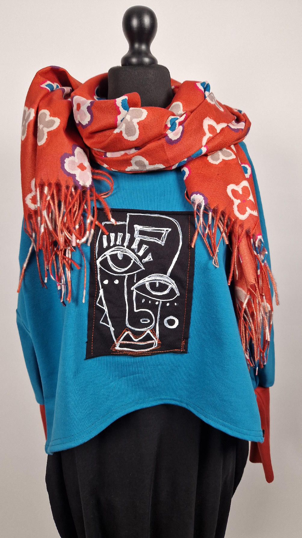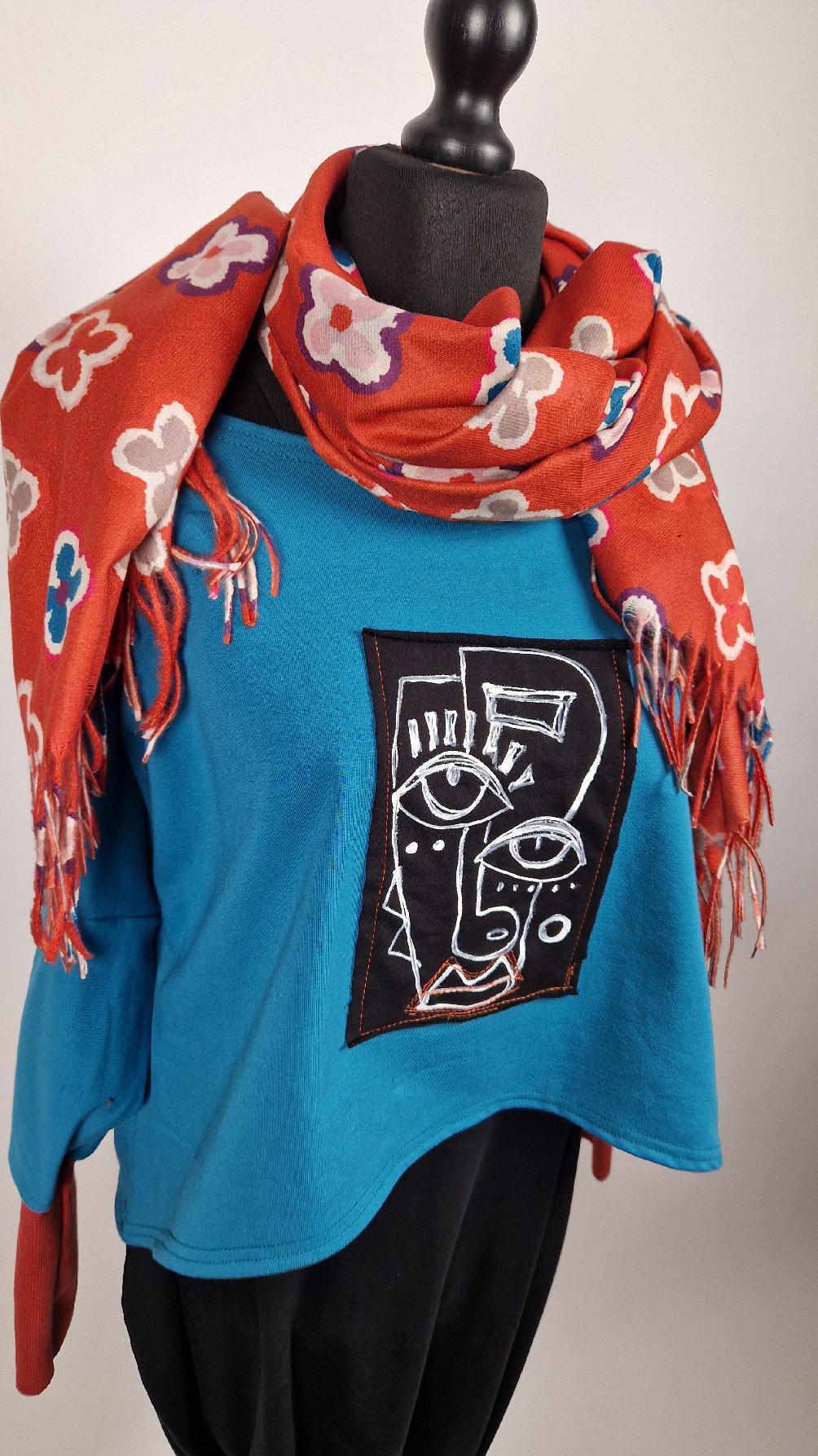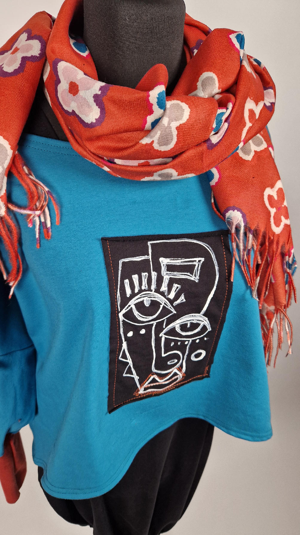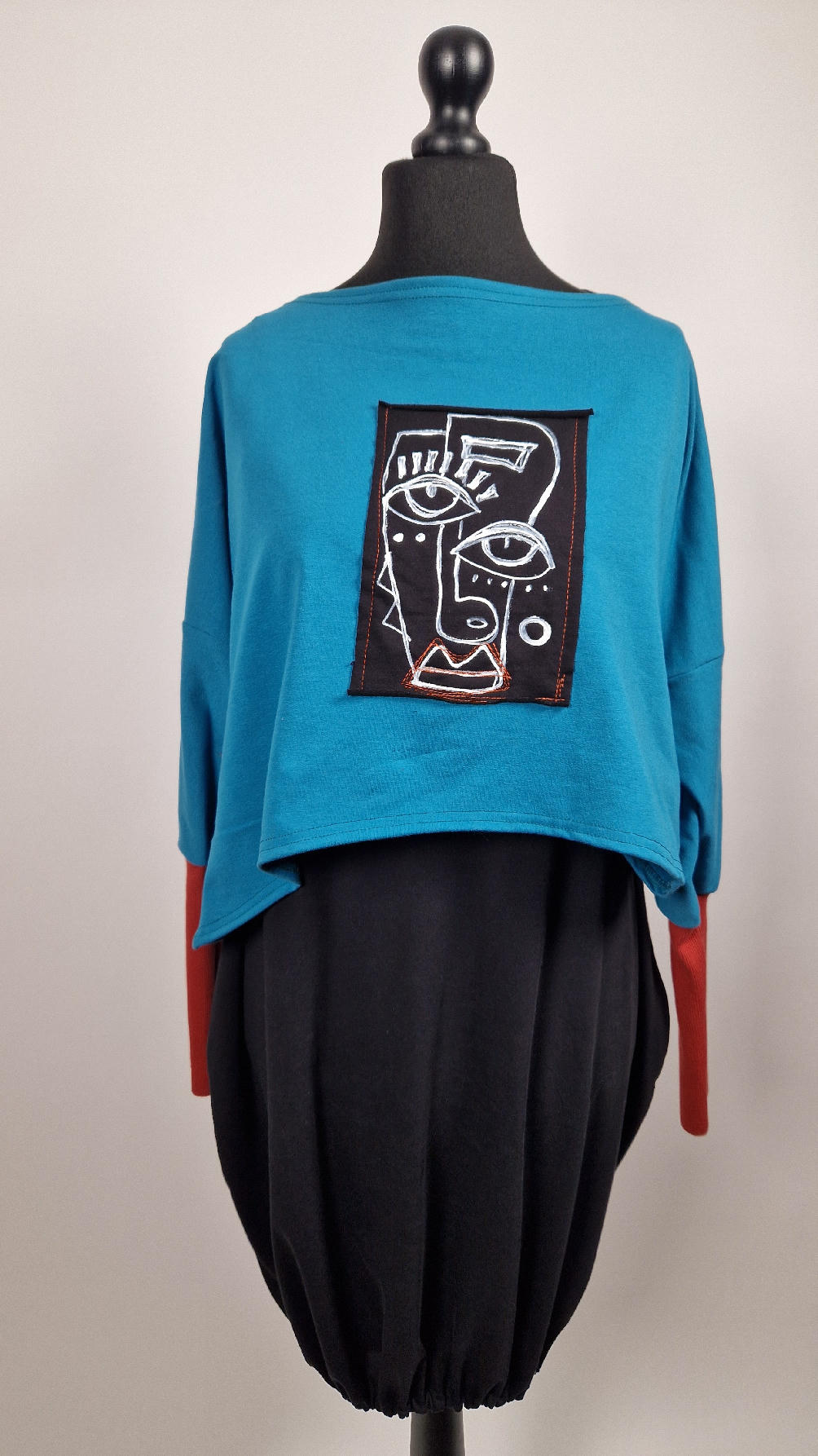 Krótka, ręcznie malowana i poprzeszywana kontrastową nitką, turkusowa, luźna w biuście bluzka typu NIETOPERZ, ale taki niewielki….bluzka uszyta z wysokiej jakości bawełny z pętelką, z długalaśnymi , elastycznymi , rudymi mankietami … prosta, bez kieszeni – tak specjalnie, żeby nic nie odstawało ale z dużym dekoltem typu ,,łódka”, który możesz opuścić na jedno ramię, lub nosić symetrycznie…Każdy,,portret” jest namalowany ręcznie przeze mnie, na czarnej bawełnie , następnie przyszyty do bluzki