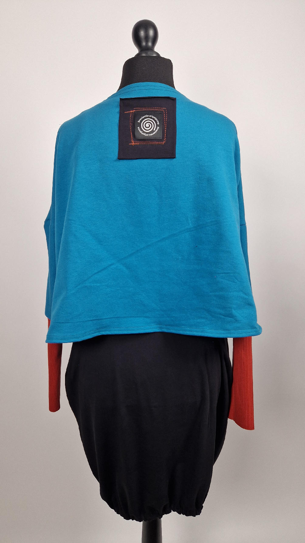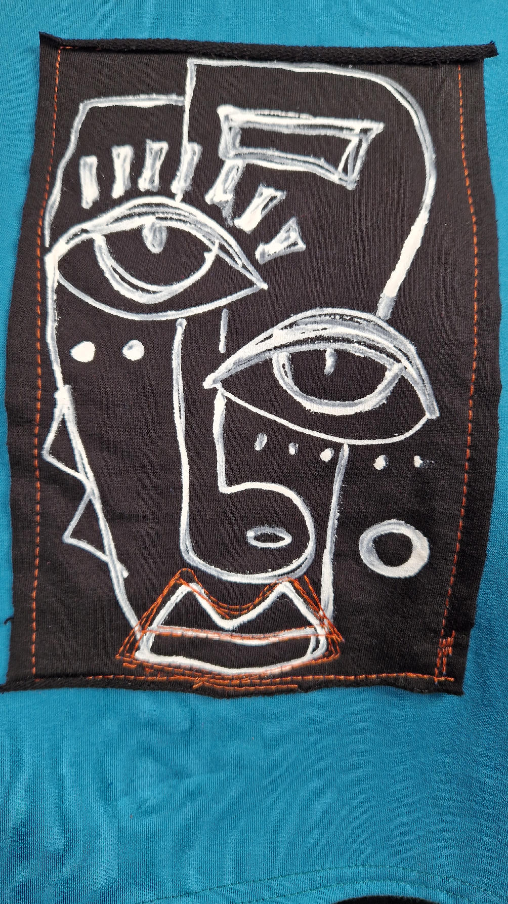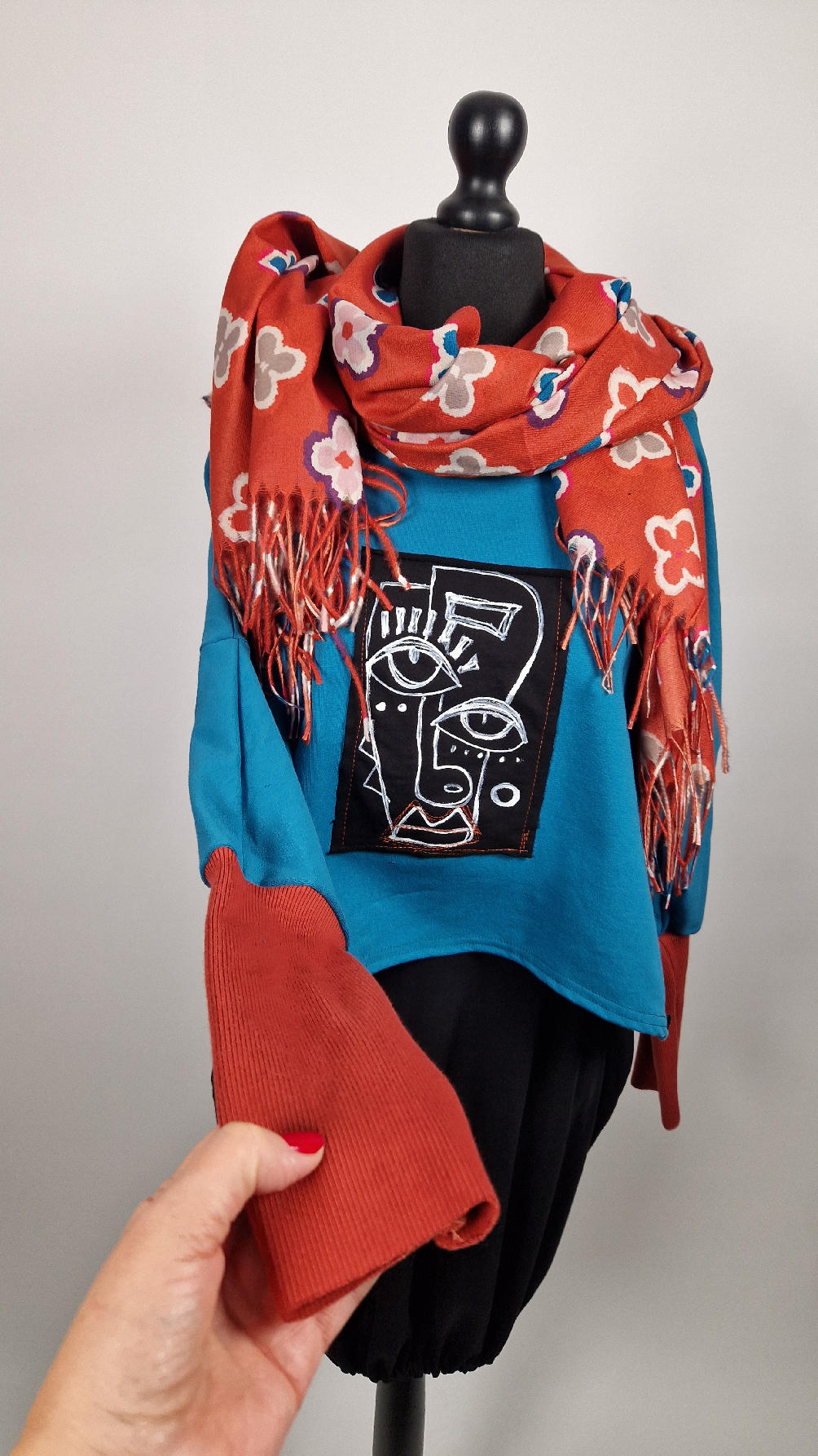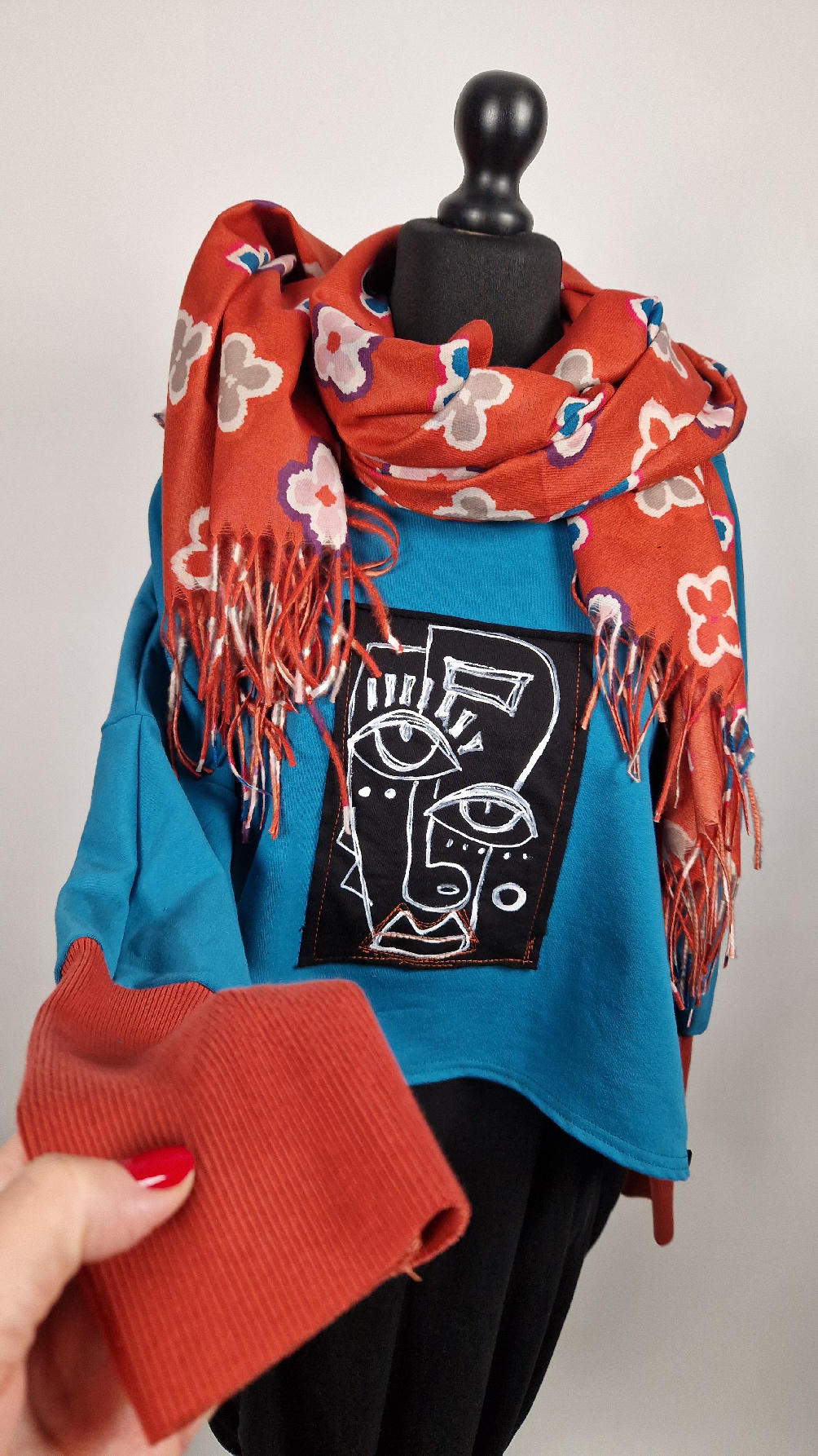 Krótka, ręcznie malowana i poprzeszywana kontrastową nitką, turkusowa, luźna w biuście bluzka typu NIETOPERZ, ale taki niewielki….bluzka uszyta z wysokiej jakości bawełny z pętelką, z długalaśnymi , elastycznymi , rudymi mankietami … prosta, bez kieszeni – tak specjalnie, żeby nic nie odstawało ale z dużym dekoltem typu ,,łódka”, który możesz opuścić na jedno ramię, lub nosić symetrycznie…Każdy,,portret” jest namalowany ręcznie przeze mnie, na czarnej bawełnie , następnie przyszyty do bluzki