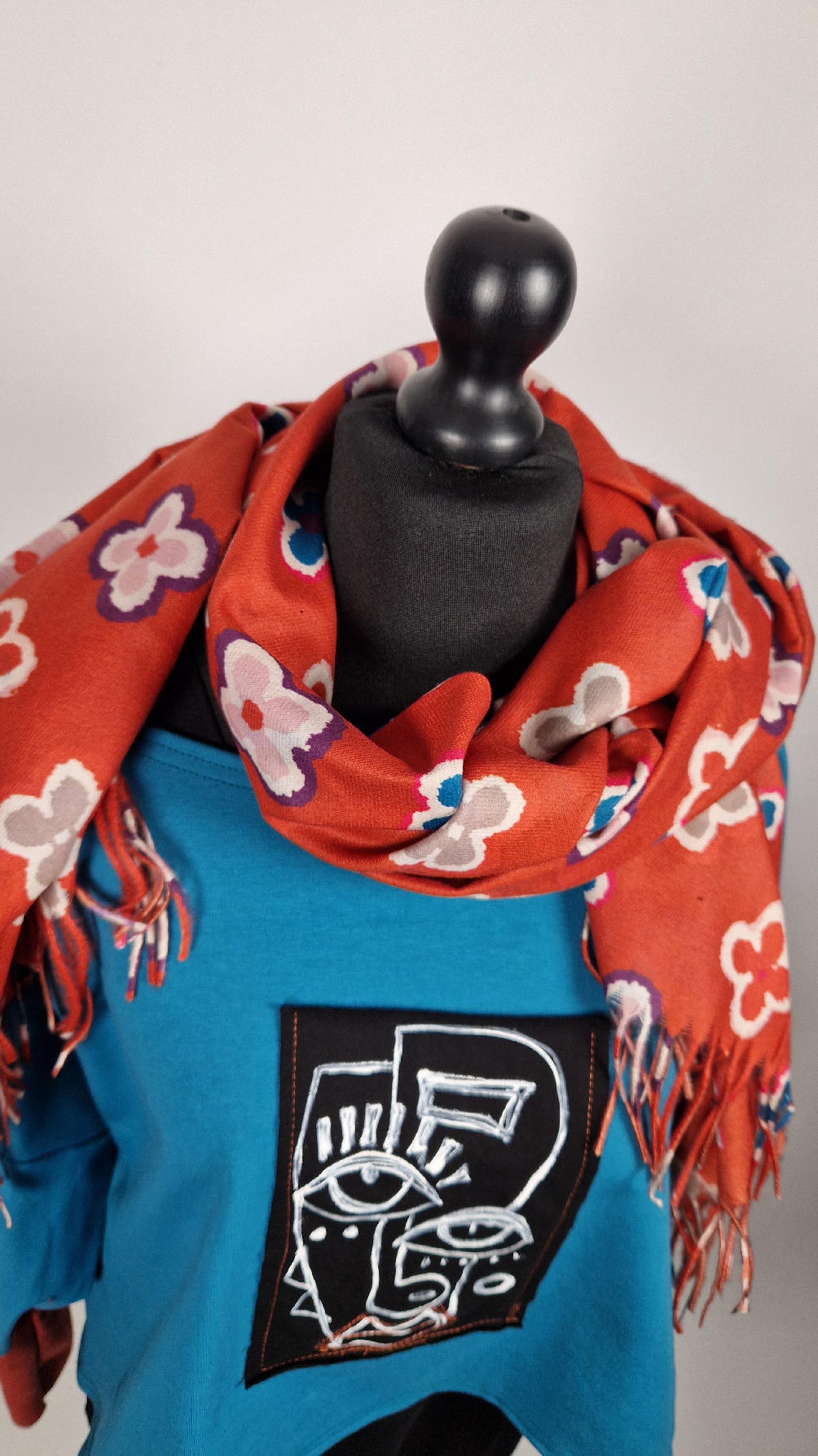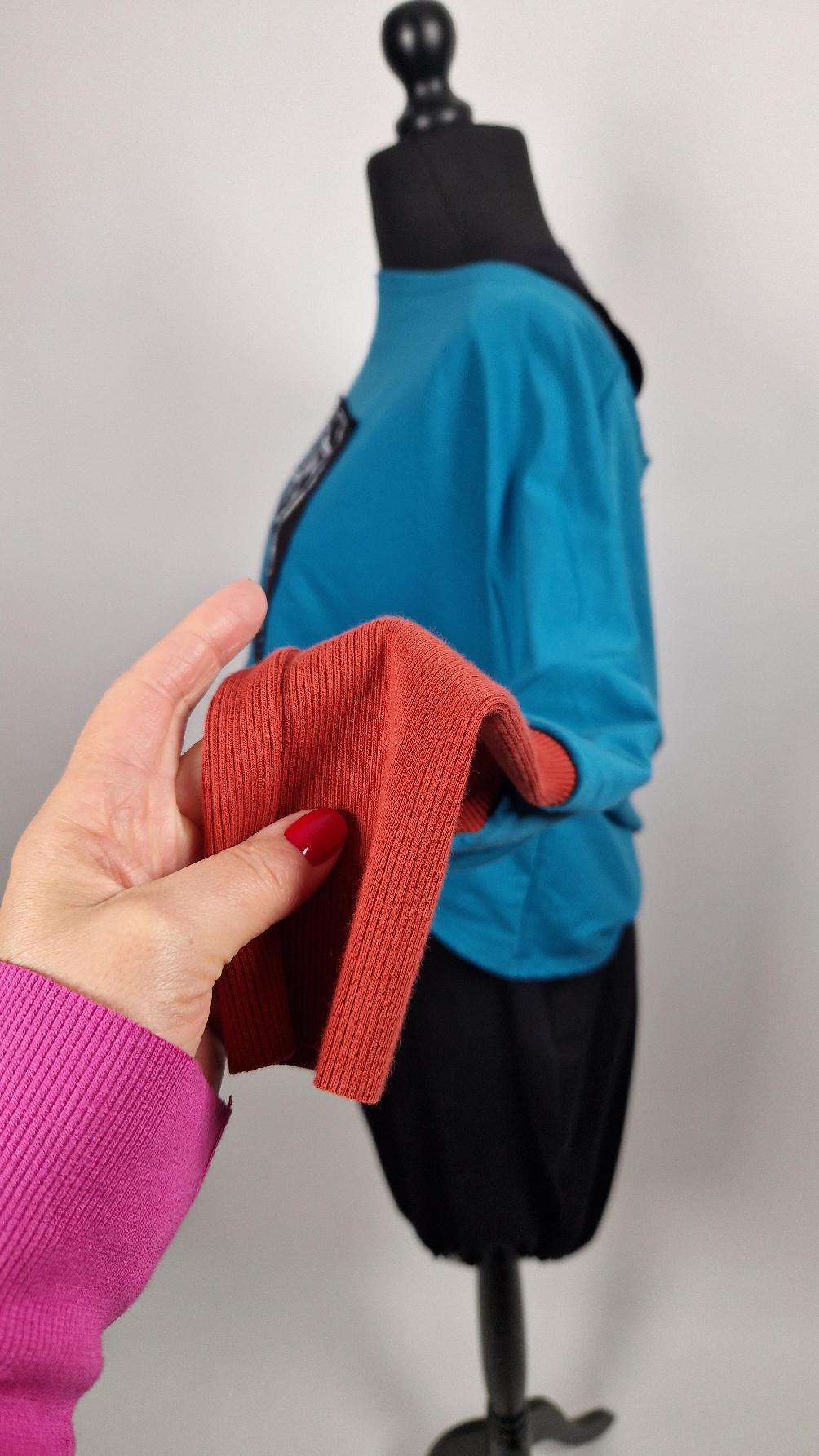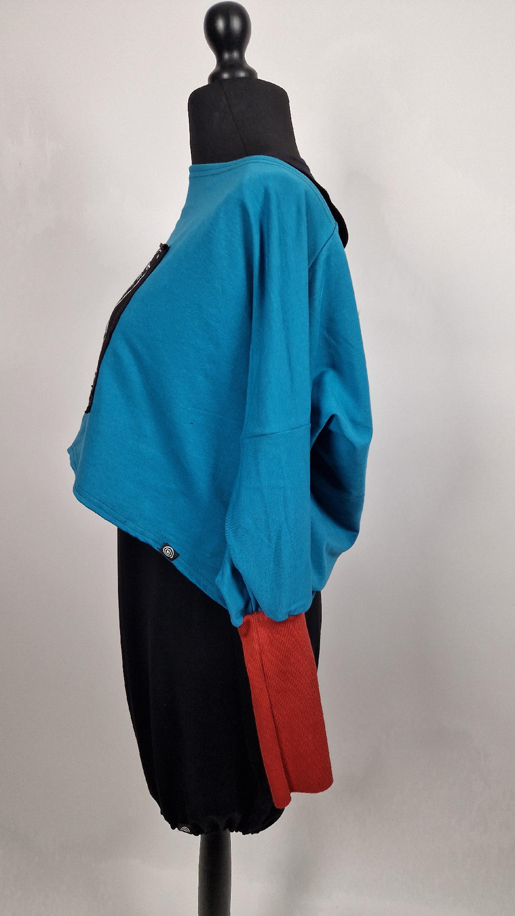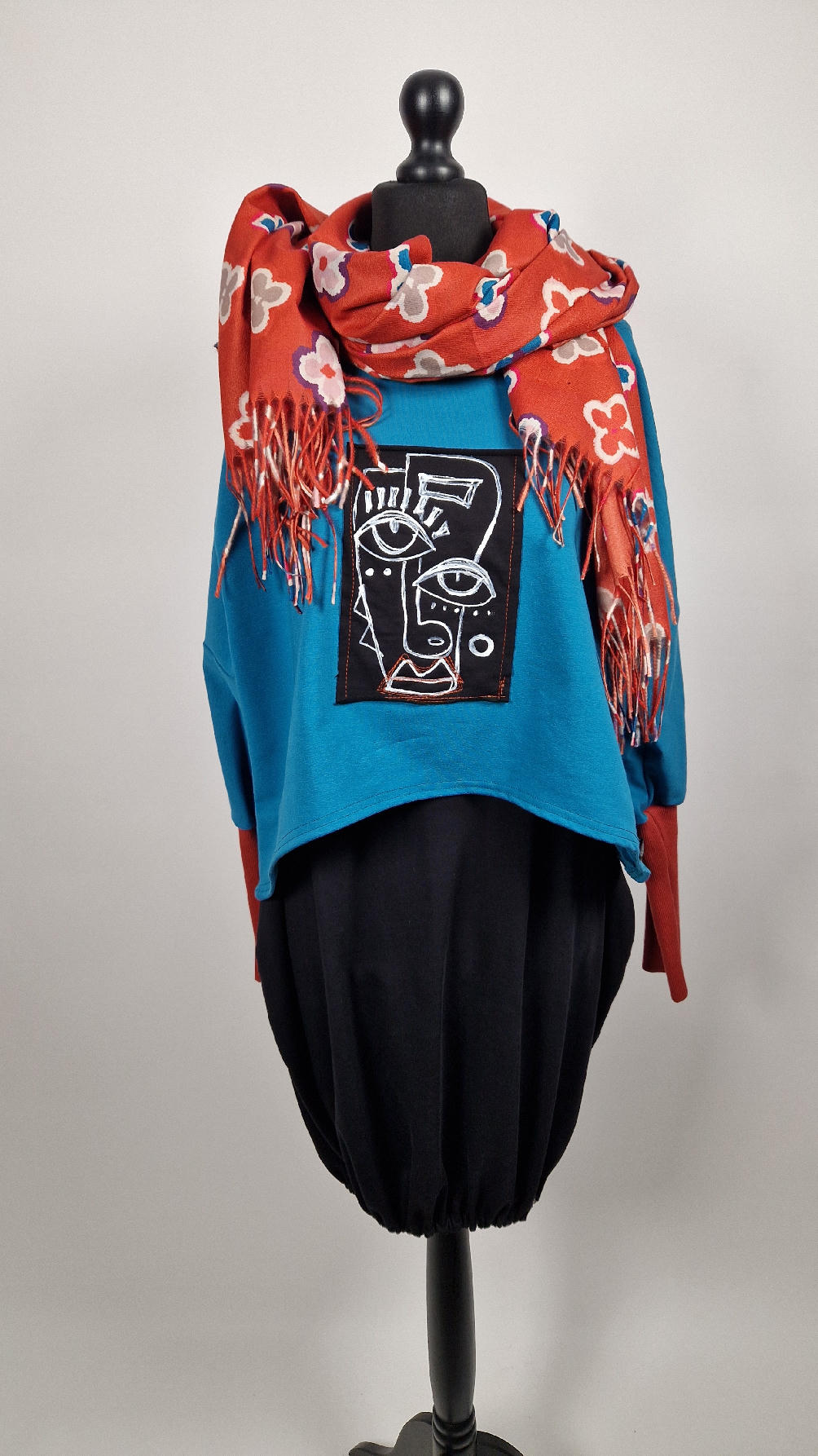 Krótka, ręcznie malowana i poprzeszywana kontrastową nitką, turkusowa, luźna w biuście bluzka typu NIETOPERZ, ale taki niewielki….bluzka uszyta z wysokiej jakości bawełny z pętelką, z długalaśnymi , elastycznymi , rudymi mankietami … prosta, bez kieszeni – tak specjalnie, żeby nic nie odstawało ale z dużym dekoltem typu ,,łódka”, który możesz opuścić na jedno ramię, lub nosić symetrycznie…Każdy,,portret” jest namalowany ręcznie przeze mnie, na czarnej bawełnie , następnie przyszyty do bluzki