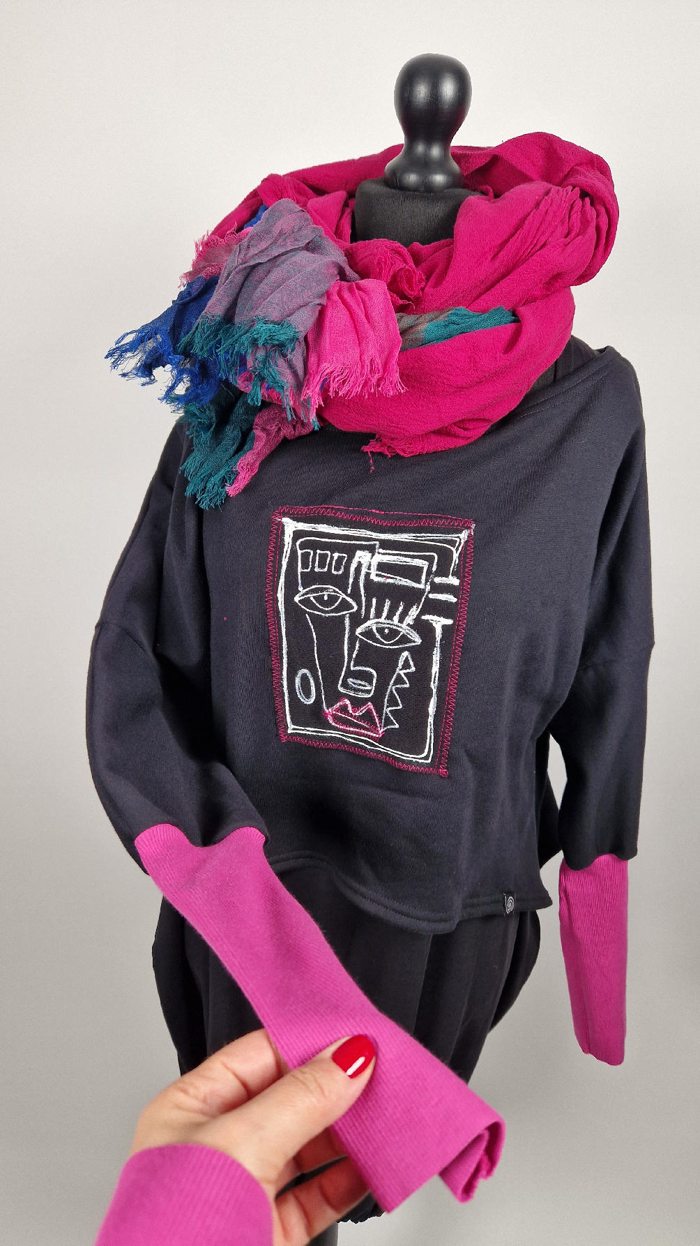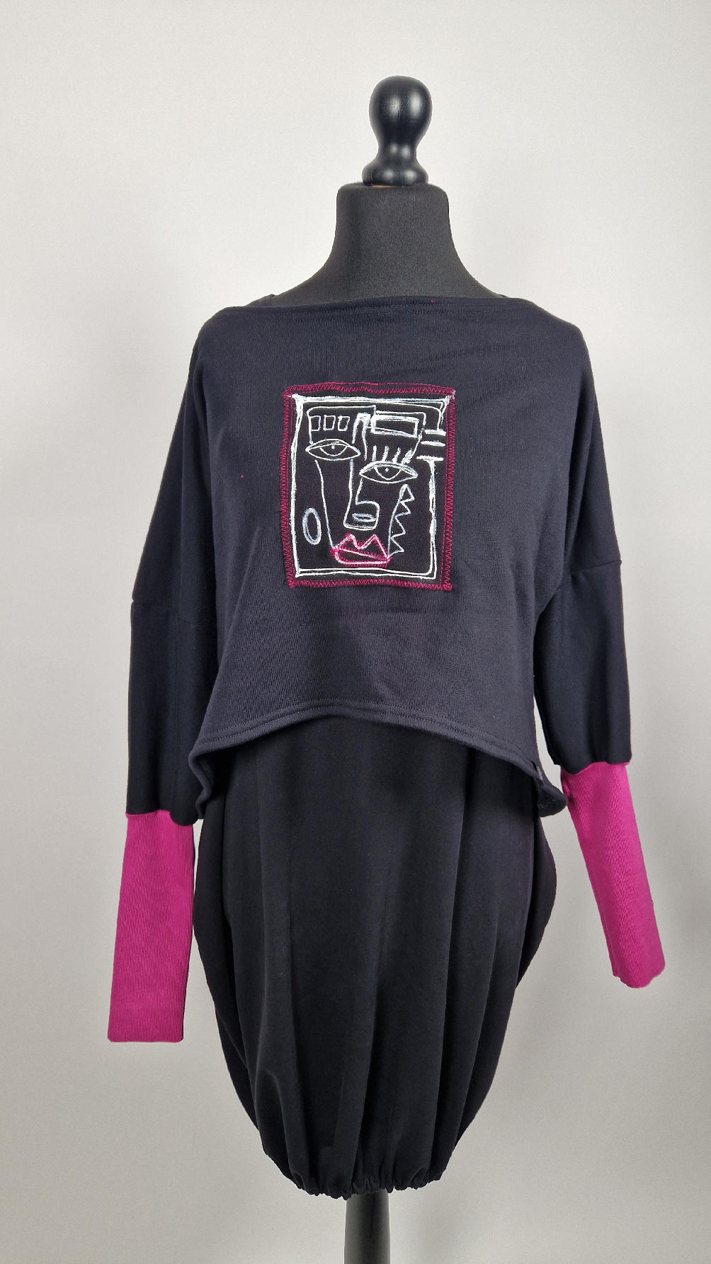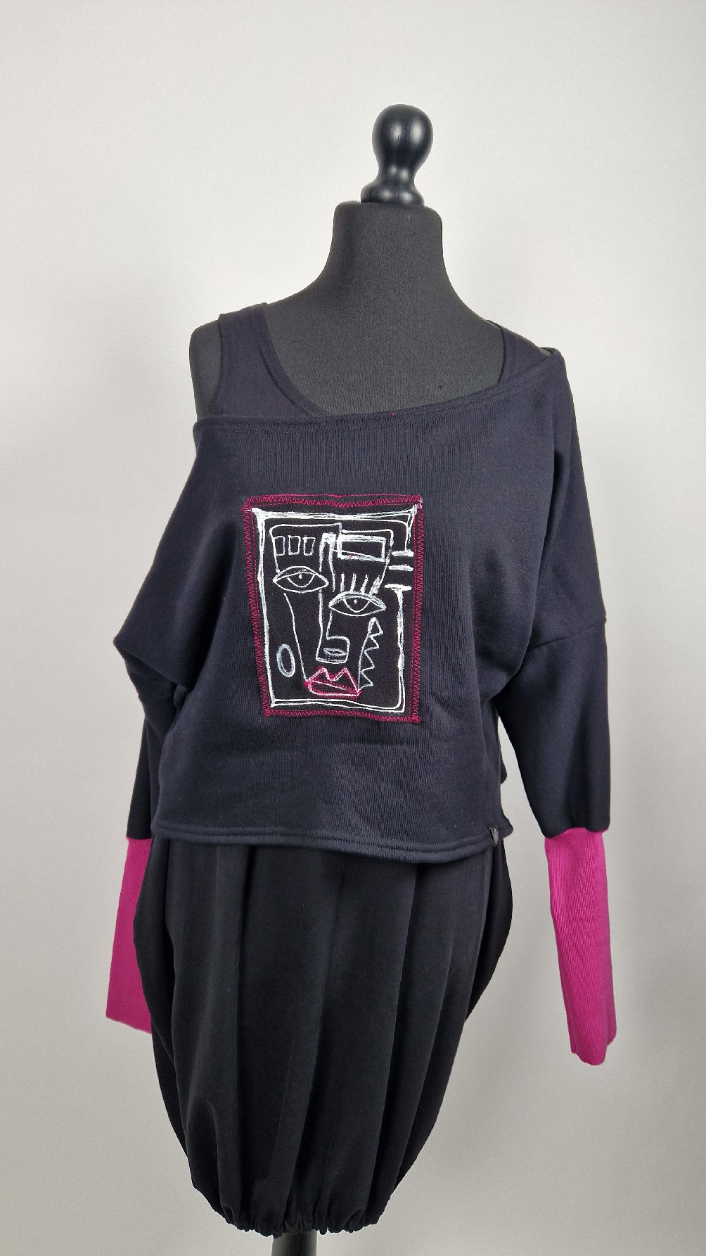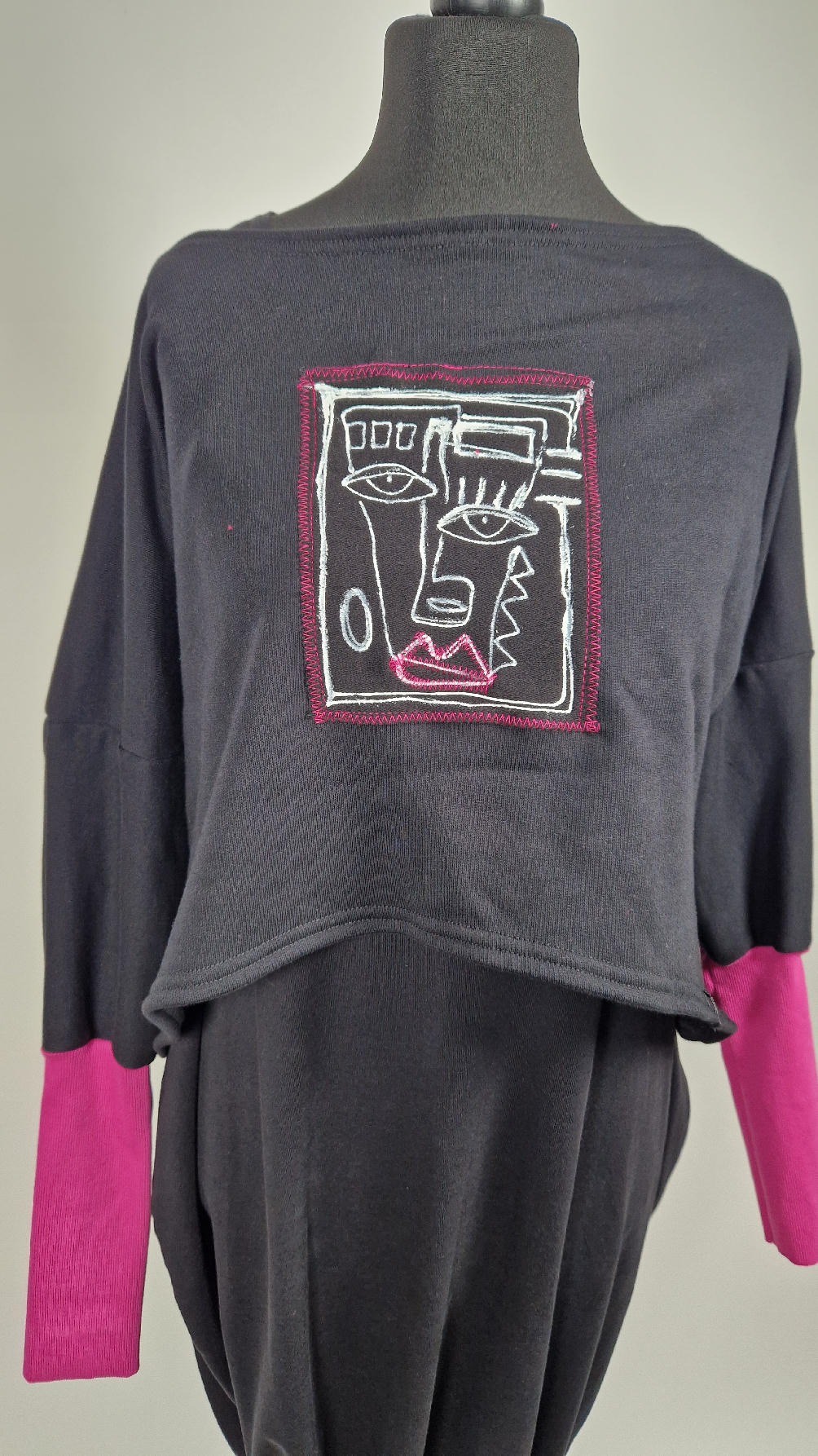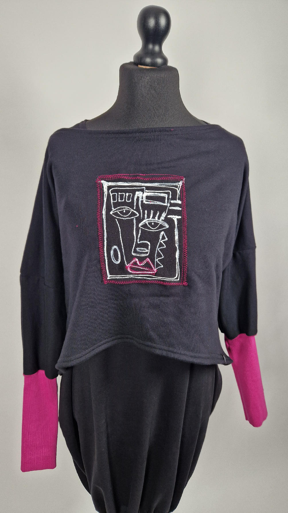 Krótka, ręcznie malowana i poprzeszywana kontrastową nitką, czarna, luźna w biuście bluzka typu NIETOPERZ, ale taki niewielki….bluzka uszyta z wysokiej jakości bawełny z pętelką, z długalaśnymi , elastycznymi , różowymi mankietami … prosta, bez kieszeni – tak specjalnie, żeby nic nie odstawało ale z dużym dekoltem typu ,,łódka”, który możesz opuścić na jedno ramię, lub nosić symetrycznie…Każdy,,portret” jest namalowany ręcznie przeze mnie, na czarnej bawełnie , następnie przyszyty do bluzki