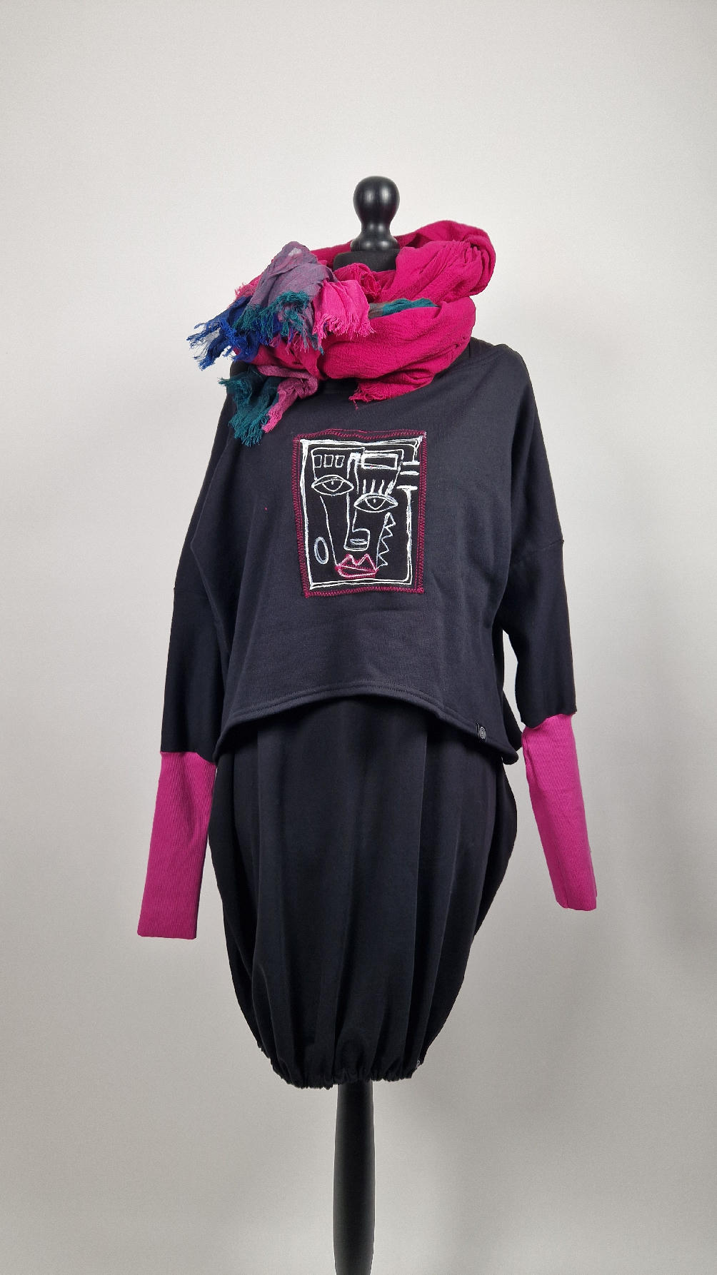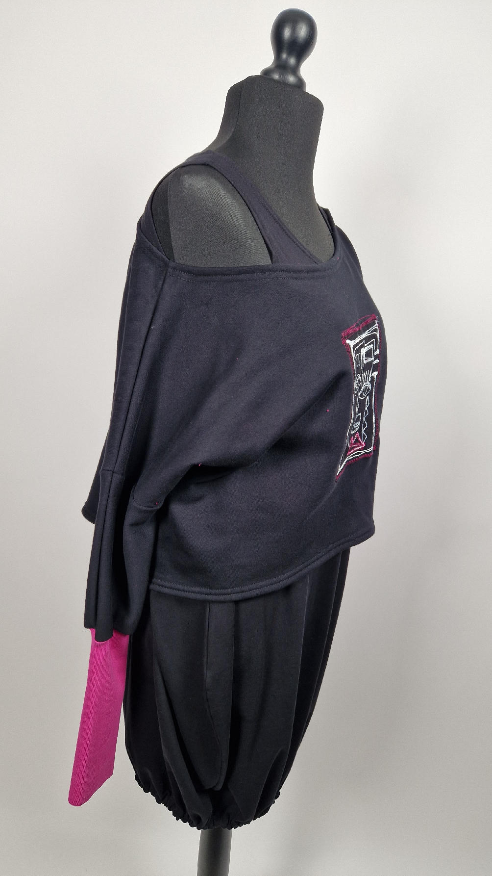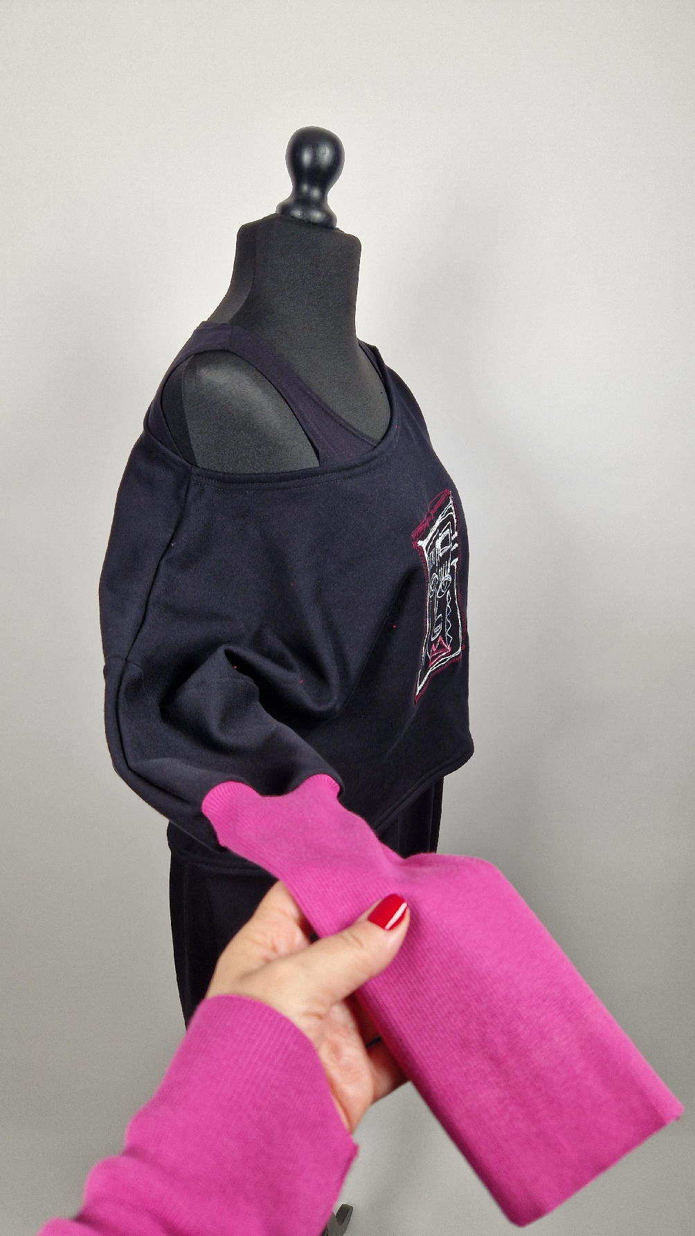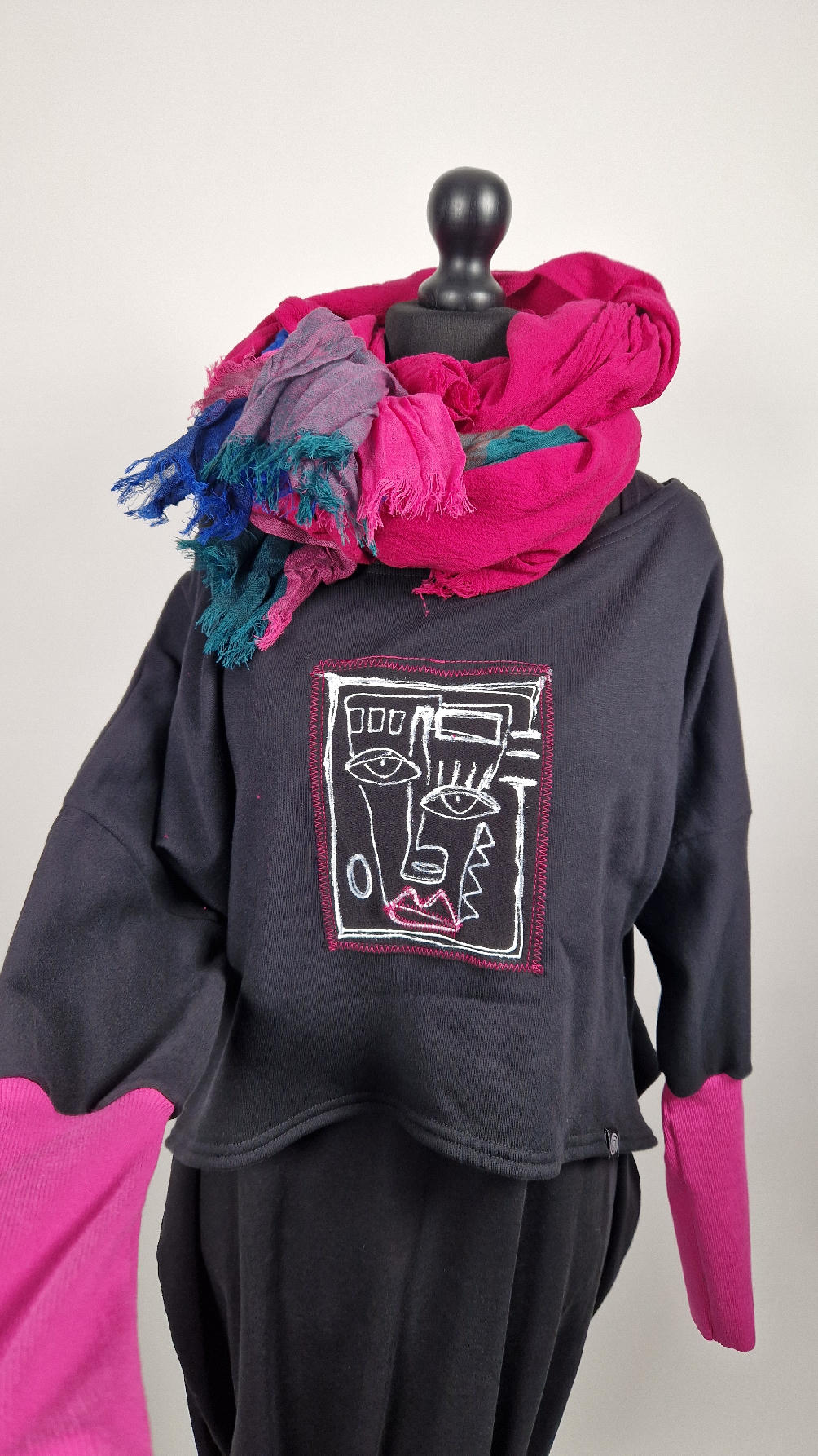 Krótka, ręcznie malowana i poprzeszywana kontrastową nitką, czarna, luźna w biuście bluzka typu NIETOPERZ, ale taki niewielki….bluzka uszyta z wysokiej jakości bawełny z pętelką, z długalaśnymi , elastycznymi , różowymi mankietami … prosta, bez kieszeni – tak specjalnie, żeby nic nie odstawało ale z dużym dekoltem typu ,,łódka”, który możesz opuścić na jedno ramię, lub nosić symetrycznie…Każdy,,portret” jest namalowany ręcznie przeze mnie, na czarnej bawełnie , następnie przyszyty do bluzki
