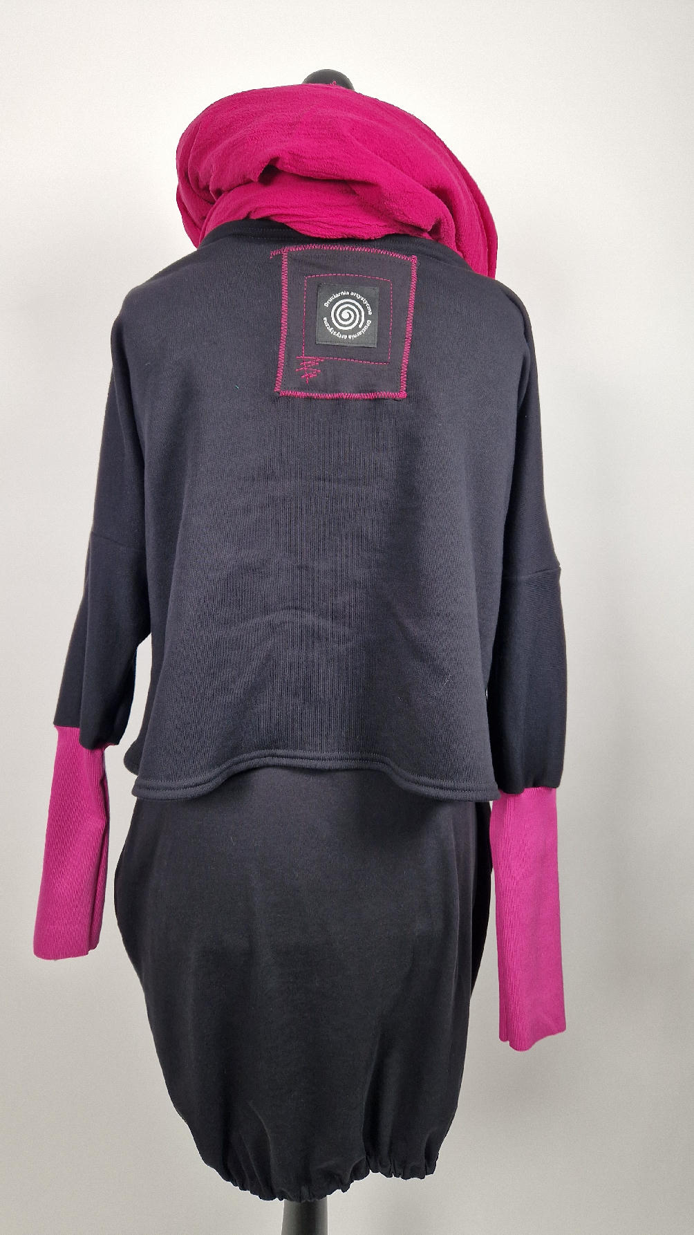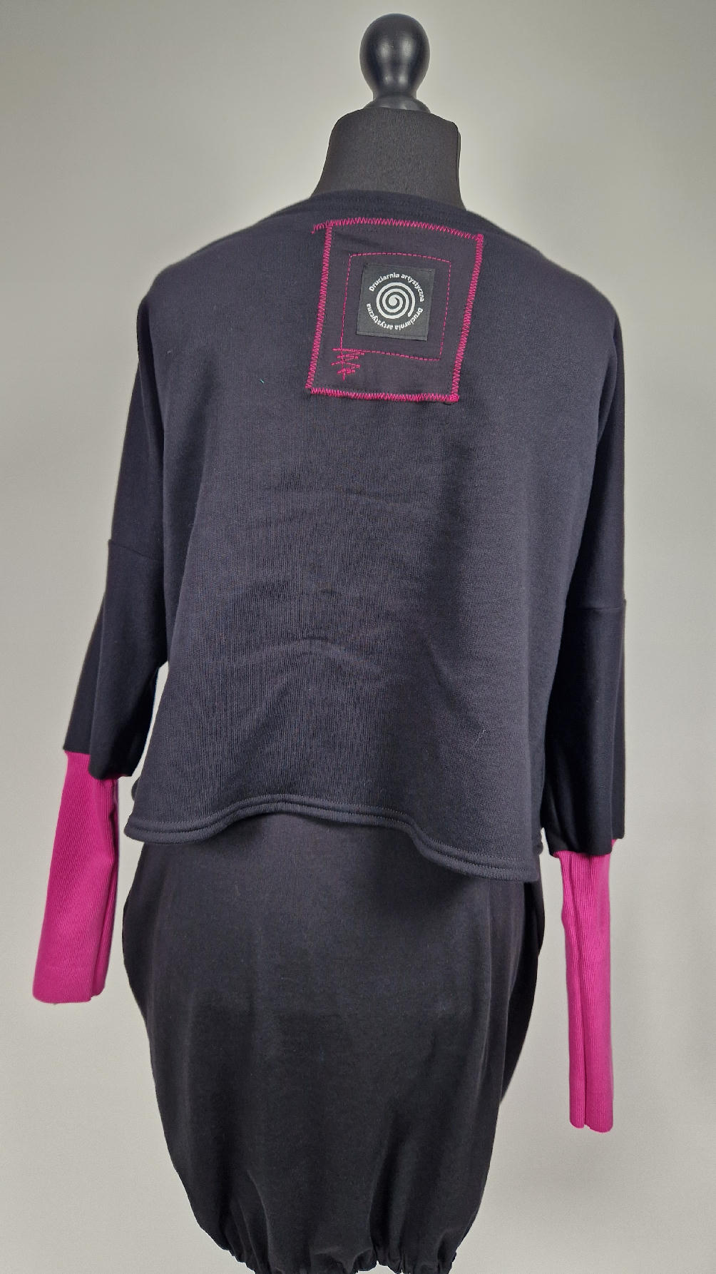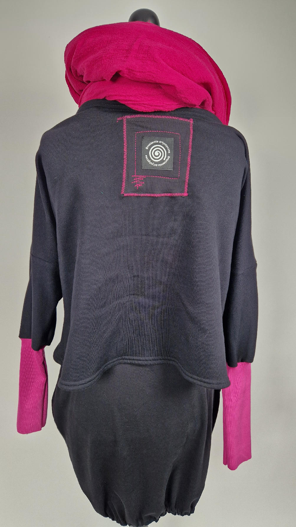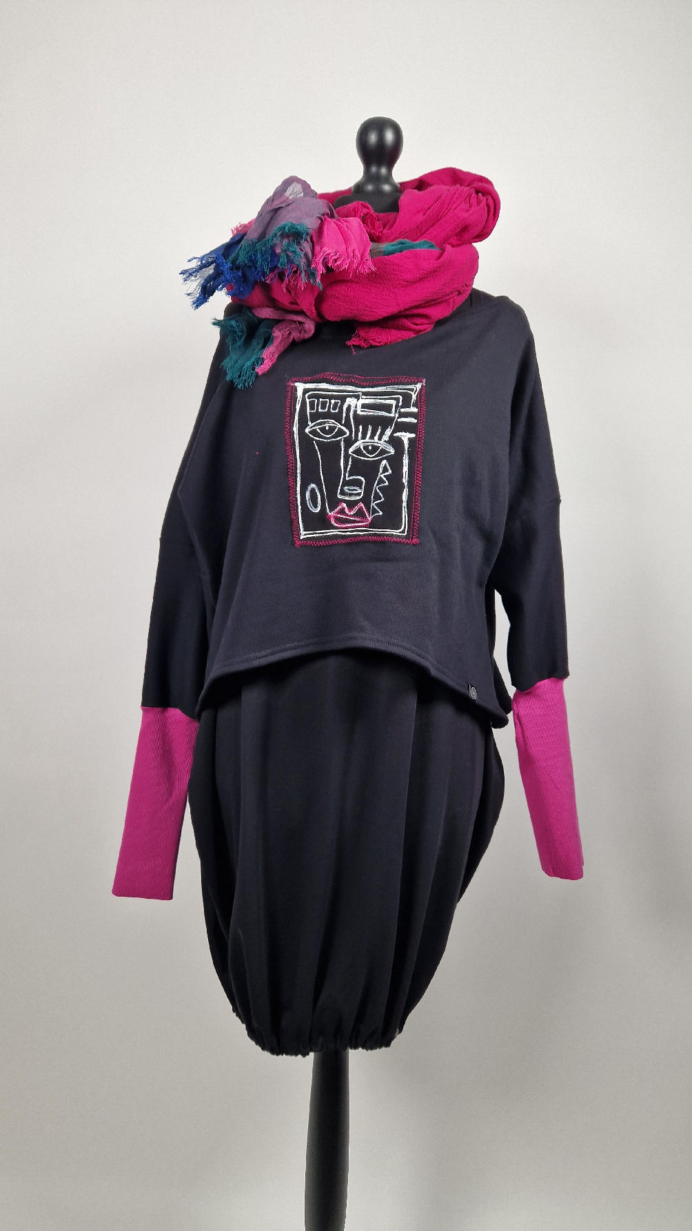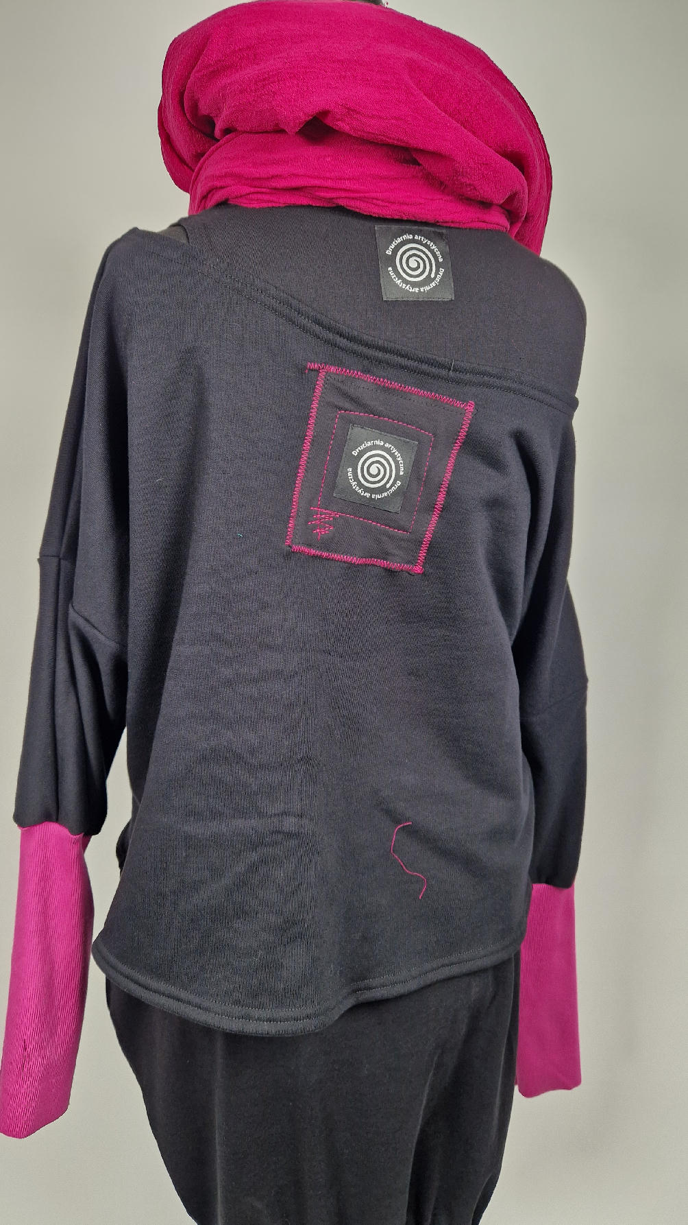Krótka, ręcznie malowana i poprzeszywana kontrastową nitką, czarna, luźna w biuście bluzka typu NIETOPERZ, ale taki niewielki….bluzka uszyta z wysokiej jakości bawełny z pętelką, z długalaśnymi , elastycznymi , różowymi mankietami … prosta, bez kieszeni – tak specjalnie, żeby nic nie odstawało ale z dużym dekoltem typu ,,łódka”, który możesz opuścić na jedno ramię, lub nosić symetrycznie…Każdy,,portret” jest namalowany ręcznie przeze mnie, na czarnej bawełnie , następnie przyszyty do bluzki