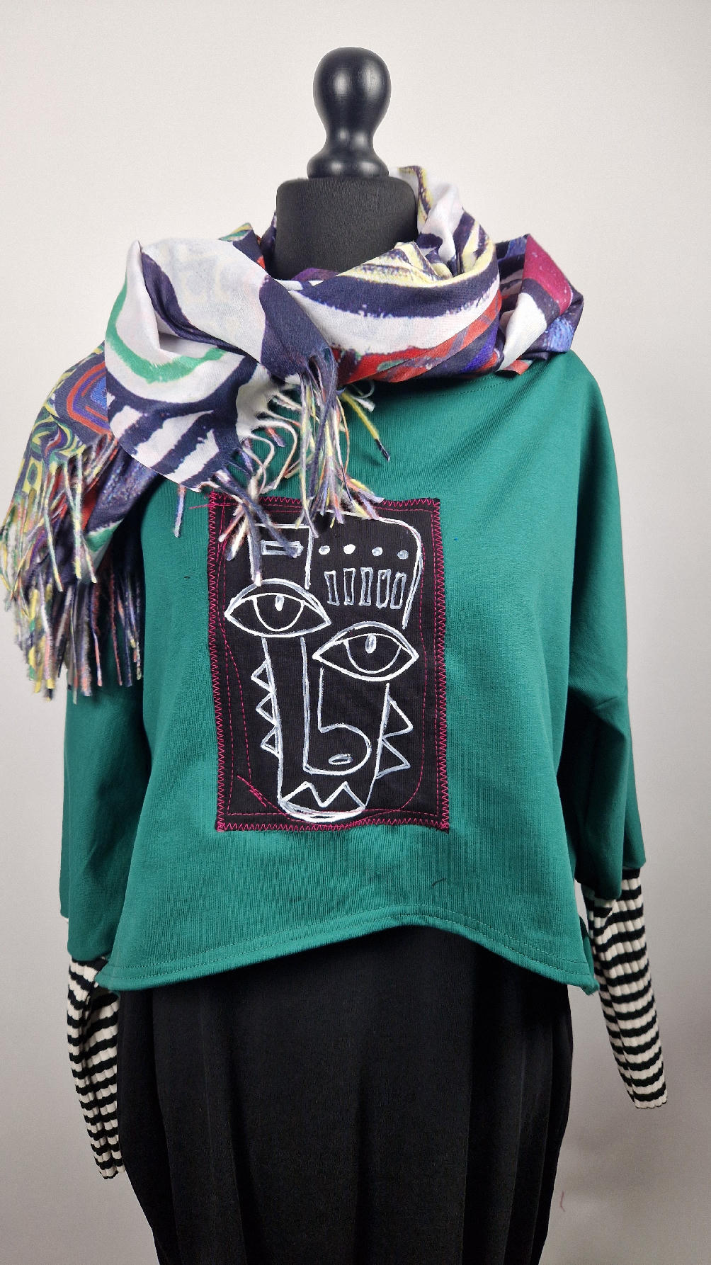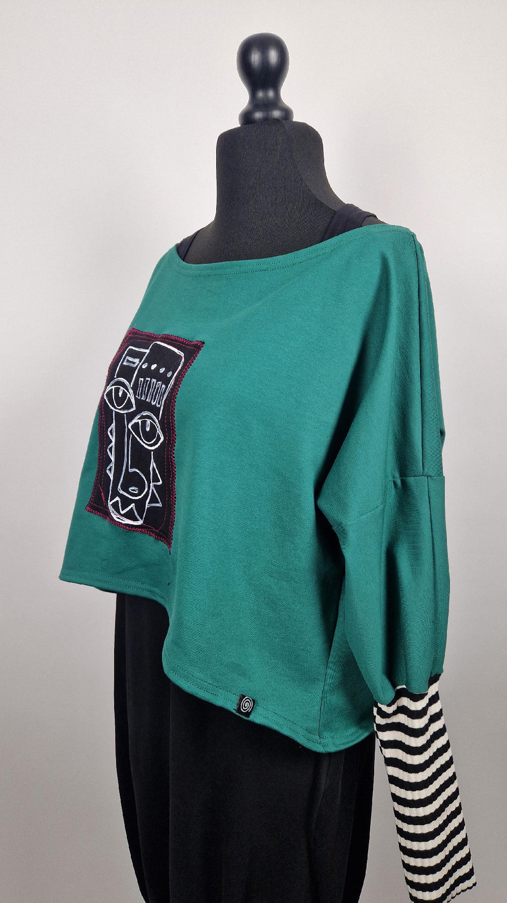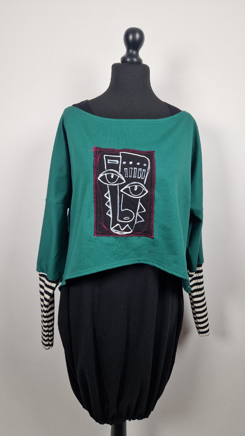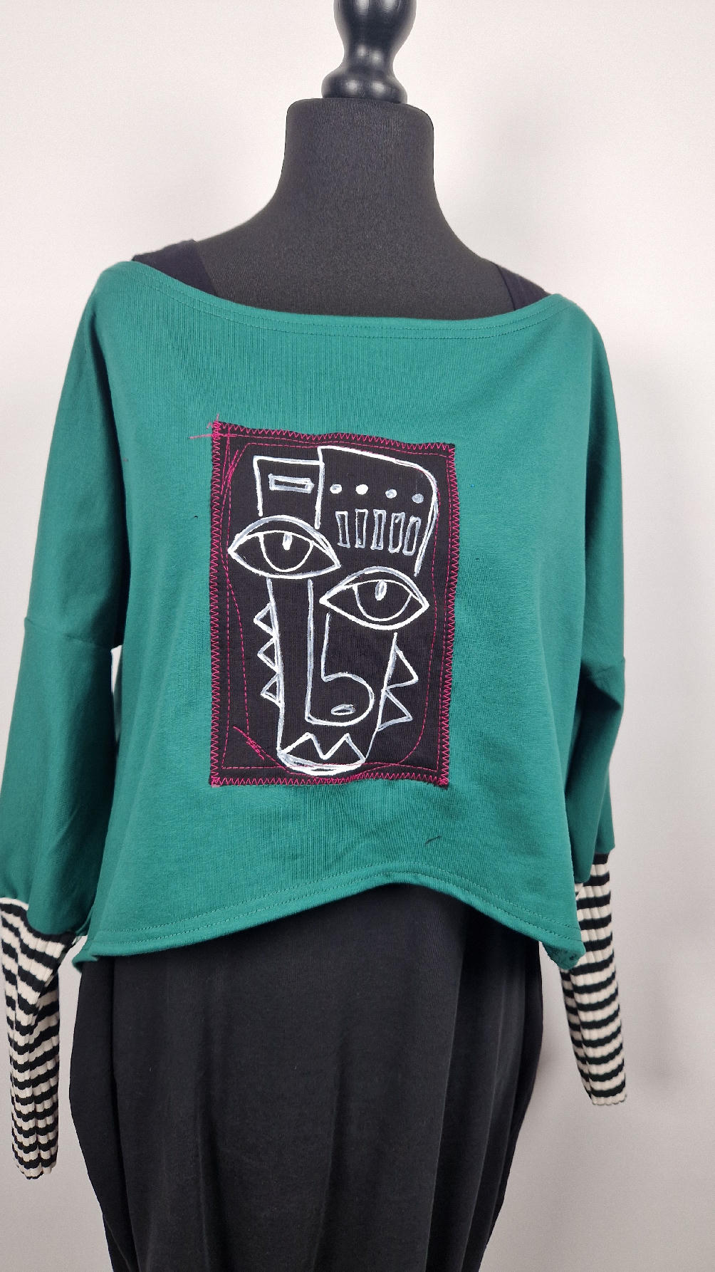 Krótka, ręcznie malowana i poprzeszywana kontrastową nitką, ciemno-zielona luźna w biuście bluzka typu NIETOPERZ, ale taki niewielki….bluzka uszyta z wysokiej jakości bawełny z pętelką, z długalaśnymi , elastycznymi , mankietami w paski… prosta, bez kieszeni – tak specjalnie, żeby nic nie odstawało ale z dużym dekoltem typu ,,łódka”, który możesz opuścić na jedno ramię, lub nosić symetrycznie…Każdy,,portret” jest namalowany ręcznie przeze mnie, na czarnej bawełnie , następnie przyszyty do bluzki